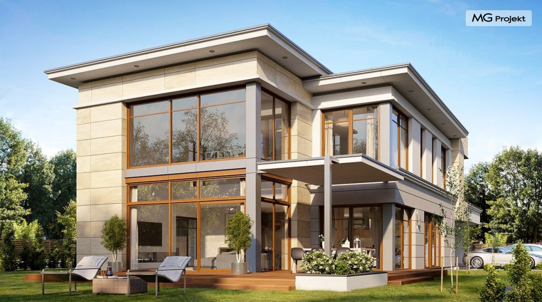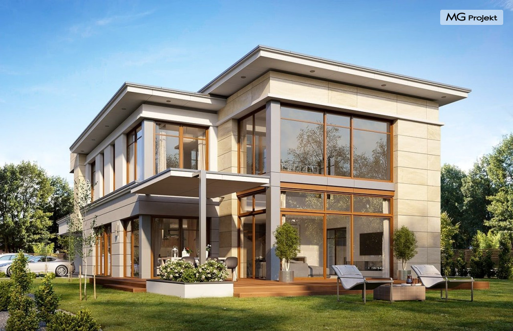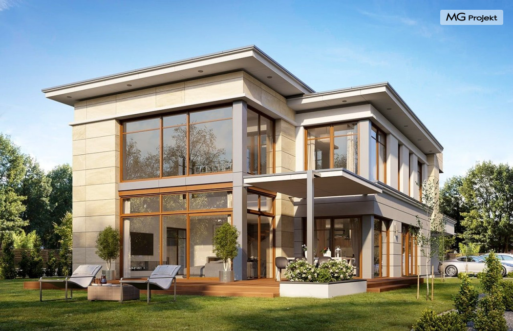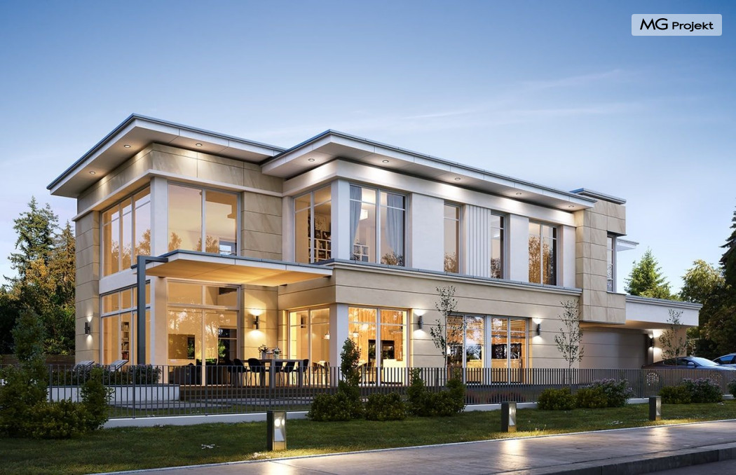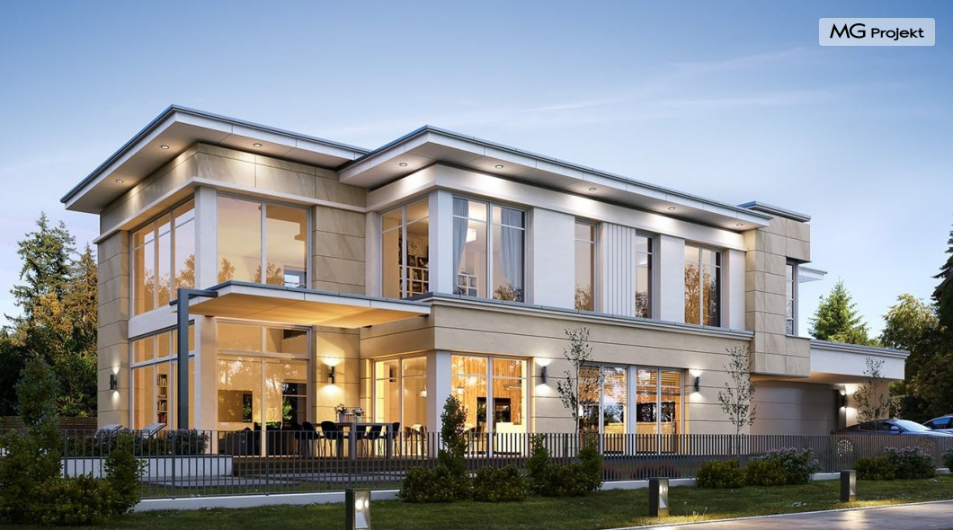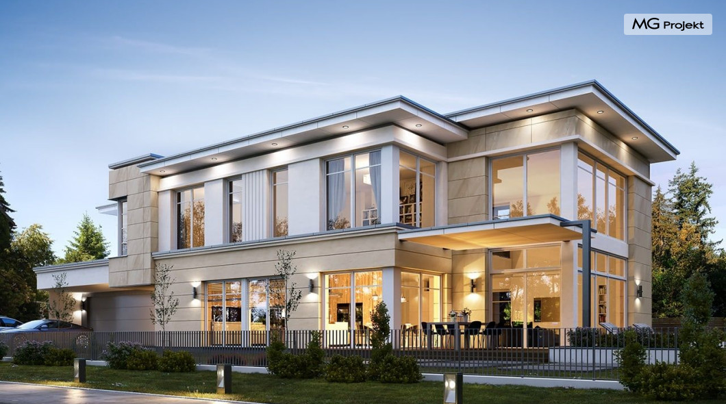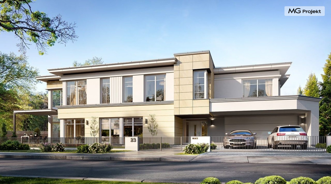 Projekt domu Willa Moderna 2 to propozycja dla Klientów, dysponujących środkami, gustem i wizją posiadania prawdziwej miejskiej willi. Projekt Willa Moderna 2 jest budynkiem dla osób planujących budowę dużego, wygodnego domu, mających już doświadczenia z mniejszymi wnętrzami i stawiających tym razem, przy kolejnej budowie na prawdziwy komfort i wygodę, gotowych zainwestować w komfortową oprawę swojego domostwa do codziennego życia. W projekcie Willa Moderna 2 zastosowano nowoczesne rozwiązania materiałowe i technologicznie, czyniące budynek energooszczędnym i łatwym w przyszłej eksploatacji. Projekt Willa Moderna 2 można zamówić również w wersji odbicia lustrzanego z garażem po lewej stronie. Zapraszamy także do zapoznania się z projektem Willa Moderna 1.