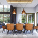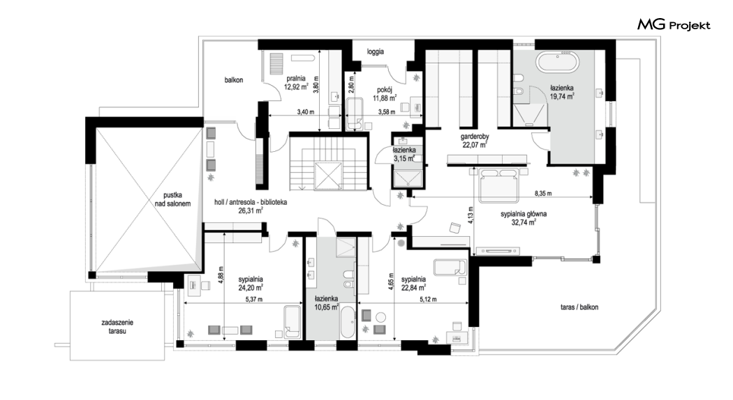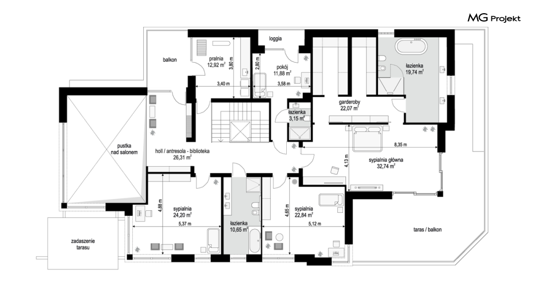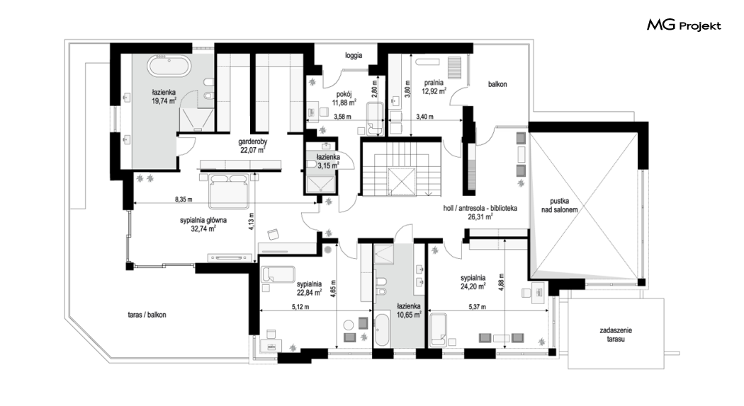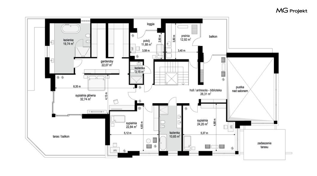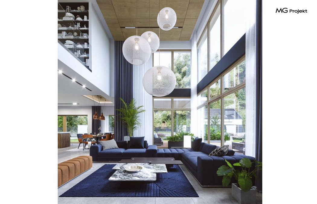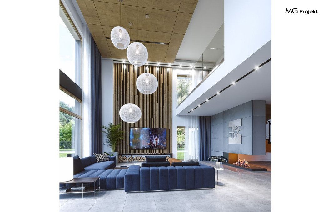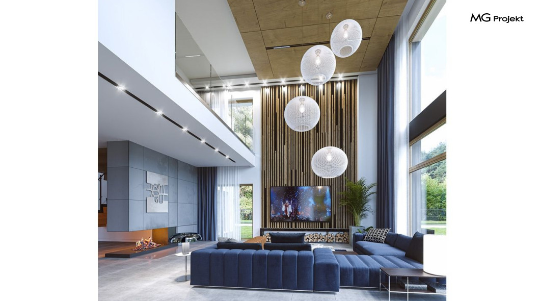 Wnętrze rezydencji Willa Moderna 2 zaprojektowano z podziałem jednoprzestrzenną część dzienną na parterze i sypialnie na piętrze. Do Willi Moderna 2 wchodzimy przez okazałe drzwi z szerokimi bocznymi naświetlami do bardzo obszernego 10-metrowego przedsionka. Obok do dyspozycji domowników jest duża szatnia i przejście do części garażowo-gospodarczej. Z przedsionka projektu Willa Moderna 2 szerokim przejściem przechodzimy do holu domostwa, w którym centralne miejsce zajmują komfortowe, efektowne schody z szeroką pustką w środku zabiegu schodów. Z holu projektu Willa Moderna 2 przenosimy się do jeszcze ciekawszego wnętrza salonu, którego duży fragment ma wysokość dwóch kondygnacji i piękne przeszklenie otwierające wnętrze na otaczający dom Willa Moderna 2 ogród. W projekcie domu Willa Moderna 2 od frontu zaprojektowano wygodną kuchnię z wyspą, ładną spiżarnię, oraz jadalnię. W pokoju dziennym znajdziemy ścianę rozrywkowo – telewizyjną, w której bez problemu zainstalujemy dowolnej wielkości telewizor lub ekran. Od strony holu wkomponowano we wnętrze budynku minimalistyczny trójstronny kominek, widoczny z wielu miejsc domu. Za schodami projektu Willa Moderna 2 przewidziano dodatkowy przestronny gabinet - biuro domowe. Na piętrze budynku Willa Moderna 2 zaprojektowano pokoje sypialne z łazienkami, oraz oddzieloną akustycznie antresolę – bibliotekę nad pustką salonu, stanowiąca jego przedłużenie i dopełnienie. Od frontu mamy dwie duże sypialnie dziecięce z łazienką, za schodami zaprojektowano sypialnię gościnną z własną łazienką, oraz pralnię-suszarnię z własnym balkonem -na tyle dużą aby pełnić też rolę pomieszczenia gospodarczo-pomocniczego. Nad częścią garażową projektu Willa Moderna 2 mieści się oddzielny luksusowy apartament Państwa domu, z dużą sypialnią, podwójną garderobą - Pana i Pani domu, oraz piękną łazienką. Apartament łączy się z dużym tarasem na dachu.