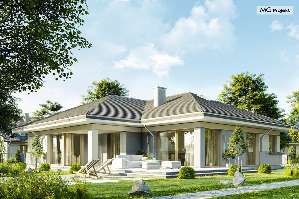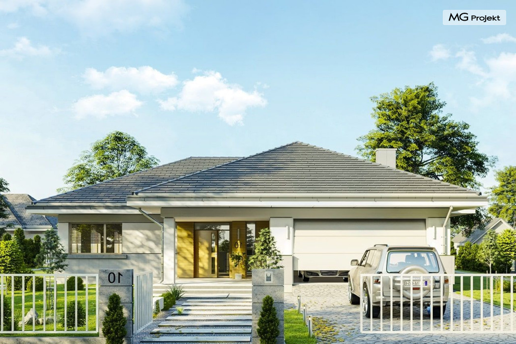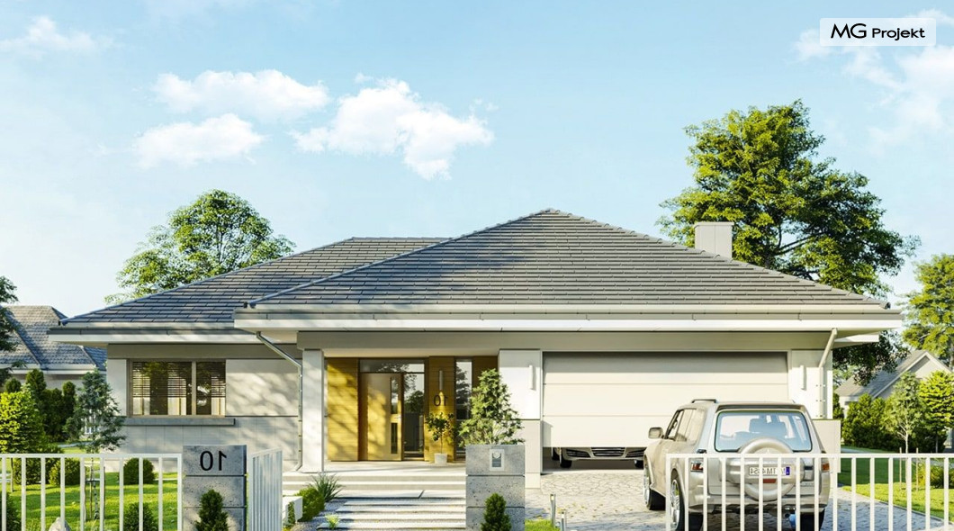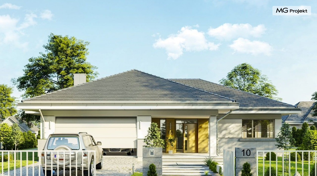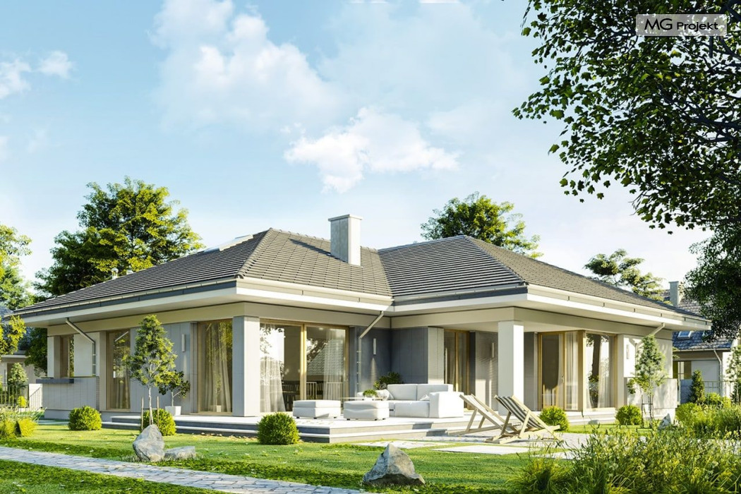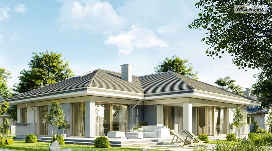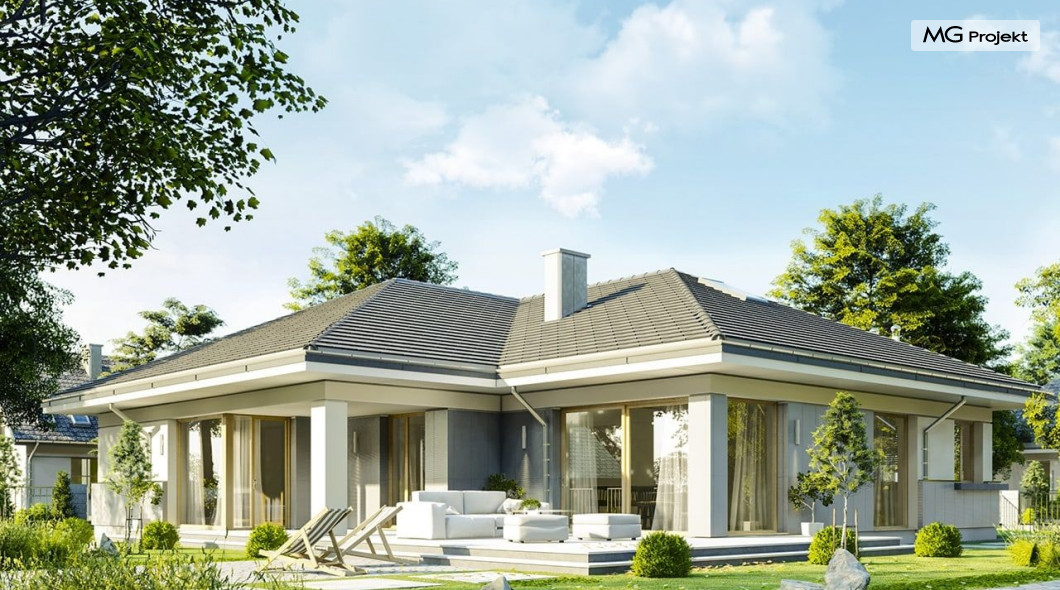 Projekt domu Doskonały 2 C jest kolejną wersją wariantową z popularnej serii domów „Doskonałych”. Jest to projektu parterowego domu, przykrytego wielospadowym dachem, ze strychem do dowolnego wykorzystania. Dom zbudowano na planie krzyża z główną bryłą o kalenicy ustawionej równolegle do elewacji frontowej. Dom przeznaczony jest dla 4-5 osobowej rodziny. Doskonały 2 C różni się od bazowego modelu domu z tej serii projektów większą powierzchnią użytkową, dzięki czemu udało się zaprojektować większe pokoje sypialne dzieci, oraz przewidziano więcej przydatnej powierzchni techniczno–gospodarczej. Domek zaprojektowano jako rozłożystą parterową bryłę, z garażem i podcieniem wejściowym od frontu, oraz podcieniem ogrodowym przykrywającym częściowo taras od tyłu domu. Szerokie przeszklenia okien, kontrastowe okładziny ścian, i fragmenty elewacji wykończone drewnem nadają bryle dodatkowej atrakcyjności. Szerokie okapy z białą podbitką z płyt z gzymsem i krytą rynną wyróżniają dom oryginalnym detalem. Front domu ujmuje swoją bezpretensjonalną elegancją. Reprezentacyjne drzwi wejściowe z naświetlami zapraszają do wnętrza. Z kolei elewacja od strony ogrodu narożne przeszklenia salonu i sypialni głównej otwierają wnętrze na taras i ogród. Cały program użytkowy domu został przewidziany na parterze domu - wszystkie pomieszczenia części dziennej, sypialnie, oraz pomieszczenia gospodarcze i garaż. Strych do adaptacji na dodatkowe poddasze stanowi możliwą opcję - dodatek do i tak pięknego wnętrza na parterze. Z wygodnego przedsionka dostajemy się do holu i dalej do salonu. Z garażu możliwe jest przejście przez szatnię i spiżarnię wprost do kuchni. Takie połączenie ułatwia codzienny transport zakupów domowych. Z holu przechodzimy do otwartej części dziennej połączonych pomieszczeń salonu z jadalnią i kuchni. Duże przeszklenia narożne pokoju dziennego otwierają wnętrze dzienne na otaczający dom ogród, a piękne również narożne okno kuchenne pozwala obserwować front działki. W salonie zaprojektowano szeroką ścianę telewizyjno–kominkową na którą skierowane są meble wypoczynkowe. W strefie prywatnej domowników mamy sypialnię rodziców z garderobą i niewielką łazienką z prysznicem, dodatkowy pokój - np. gabinet, dwie duże sypialnie dzieci z wbudowanymi w ściany szafami, oraz dużą łazienkę i wc dostępne z holu. „Doskonały 2 C” to dom o stosunkowo prostej konstrukcji - niedrogi w budowie i późniejszym utrzymaniu. Do świetna propozycja dla osób marzących o parterowym wygodnym domu. Zapraszamy do zapoznania się z pełną ofertą pracowni MG Projekt: Doskonały i Doskonały 2.