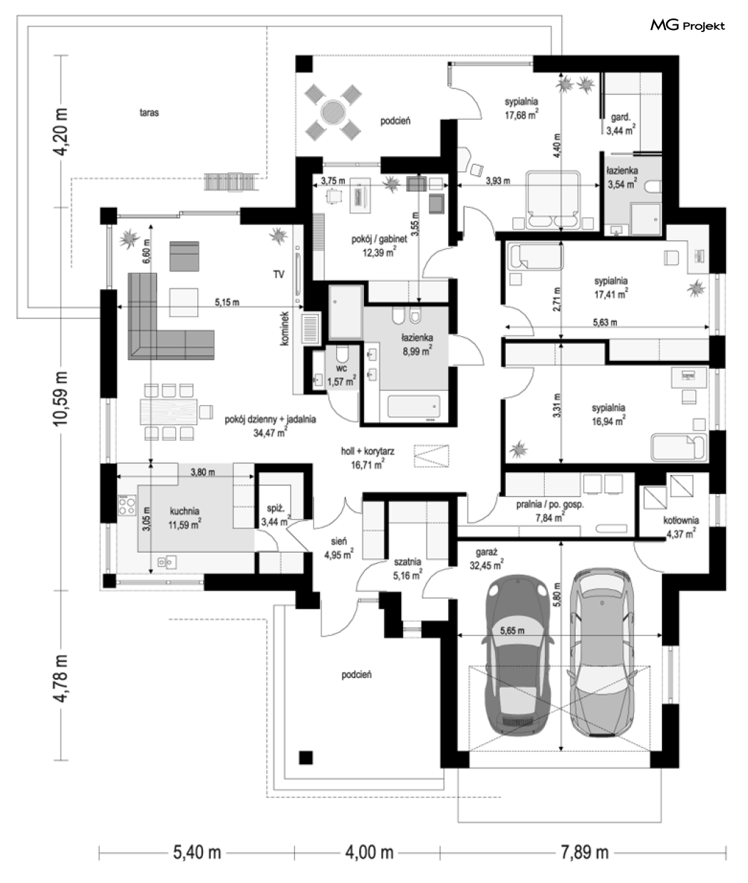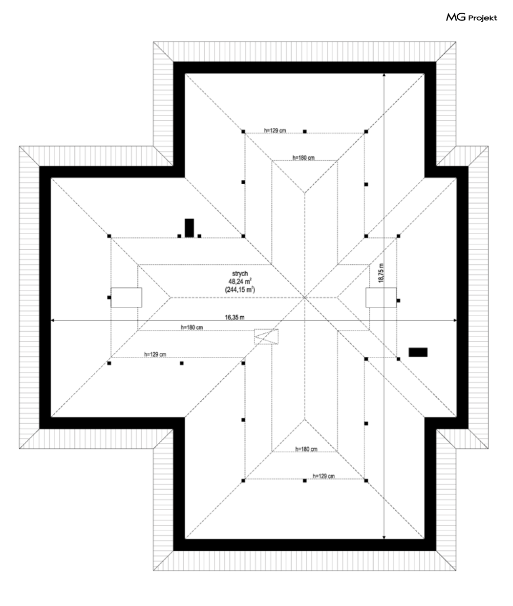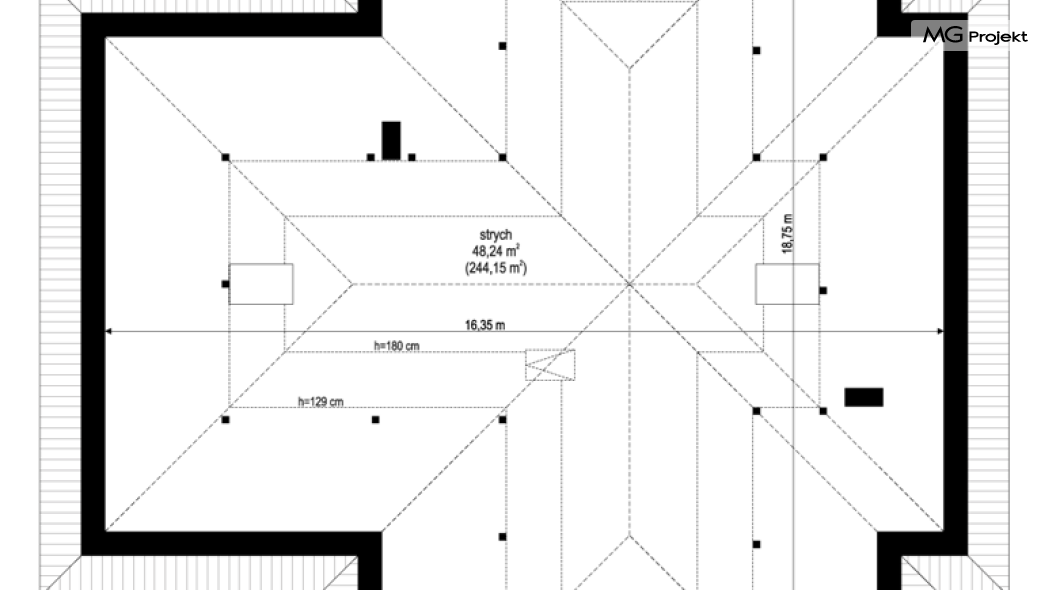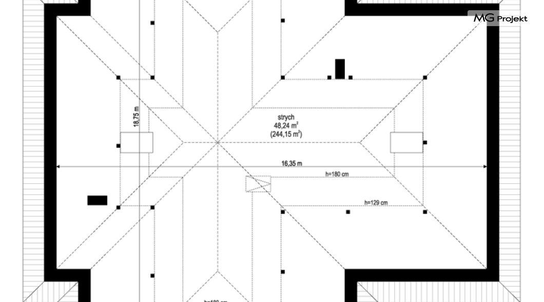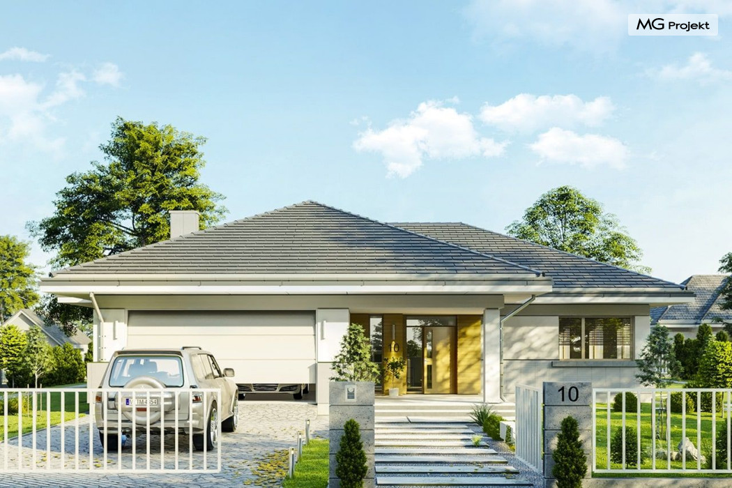 Projekt domu Doskonały 2 C jest kolejną wersją wariantową z popularnej serii domów „Doskonałych”. Jest to projektu parterowego domu, przykrytego wielospadowym dachem, ze strychem do dowolnego wykorzystania. Dom zbudowano na planie krzyża z główną bryłą o kalenicy ustawionej równolegle do elewacji frontowej. Dom przeznaczony jest dla 4-5 osobowej rodziny. Doskonały 2 C różni się od bazowego modelu domu z tej serii projektów większą powierzchnią użytkową, dzięki czemu udało się zaprojektować większe pokoje sypialne dzieci, oraz przewidziano więcej przydatnej powierzchni techniczno–gospodarczej. Domek zaprojektowano jako rozłożystą parterową bryłę, z garażem i podcieniem wejściowym od frontu, oraz podcieniem ogrodowym przykrywającym częściowo taras od tyłu domu. Szerokie przeszklenia okien, kontrastowe okładziny ścian, i fragmenty elewacji wykończone drewnem nadają bryle dodatkowej atrakcyjności. Szerokie okapy z białą podbitką z płyt z gzymsem i krytą rynną wyróżniają dom oryginalnym detalem. Front domu ujmuje swoją bezpretensjonalną elegancją. Reprezentacyjne drzwi wejściowe z naświetlami zapraszają do wnętrza. Z kolei elewacja od strony ogrodu narożne przeszklenia salonu i sypialni głównej otwierają wnętrze na taras i ogród. Cały program użytkowy domu został przewidziany na parterze domu - wszystkie pomieszczenia części dziennej, sypialnie, oraz pomieszczenia gospodarcze i garaż. Strych do adaptacji na dodatkowe poddasze stanowi możliwą opcję - dodatek do i tak pięknego wnętrza na parterze. Z wygodnego przedsionka dostajemy się do holu i dalej do salonu. Z garażu możliwe jest przejście przez szatnię i spiżarnię wprost do kuchni. Takie połączenie ułatwia codzienny transport zakupów domowych. Z holu przechodzimy do otwartej części dziennej połączonych pomieszczeń salonu z jadalnią i kuchni. Duże przeszklenia narożne pokoju dziennego otwierają wnętrze dzienne na otaczający dom ogród, a piękne również narożne okno kuchenne pozwala obserwować front działki. W salonie zaprojektowano szeroką ścianę telewizyjno–kominkową na którą skierowane są meble wypoczynkowe. W strefie prywatnej domowników mamy sypialnię rodziców z garderobą i niewielką łazienką z prysznicem, dodatkowy pokój - np. gabinet, dwie duże sypialnie dzieci z wbudowanymi w ściany szafami, oraz dużą łazienkę i wc dostępne z holu. „Doskonały 2 C” to dom o stosunkowo prostej konstrukcji - niedrogi w budowie i późniejszym utrzymaniu. Do świetna propozycja dla osób marzących o parterowym wygodnym domu. Zapraszamy do zapoznania się z pełną ofertą pracowni MG Projekt: Doskonały i Doskonały 2.
