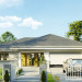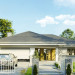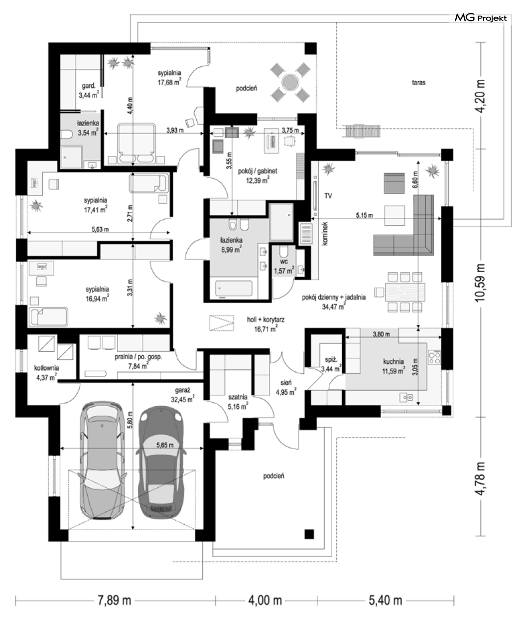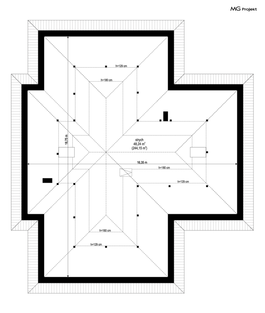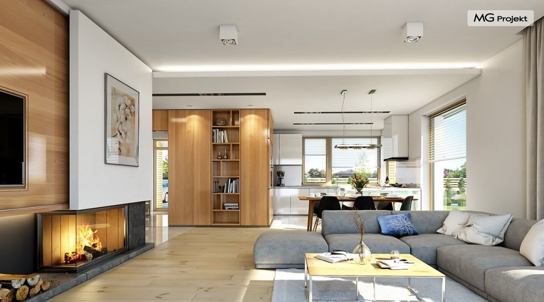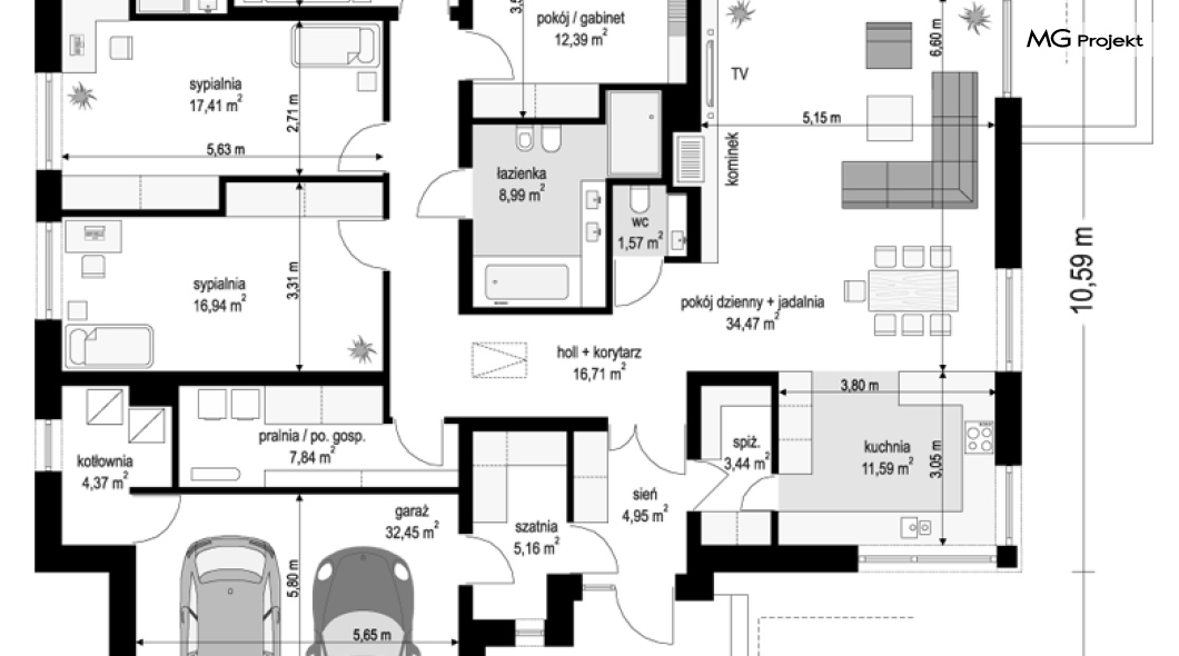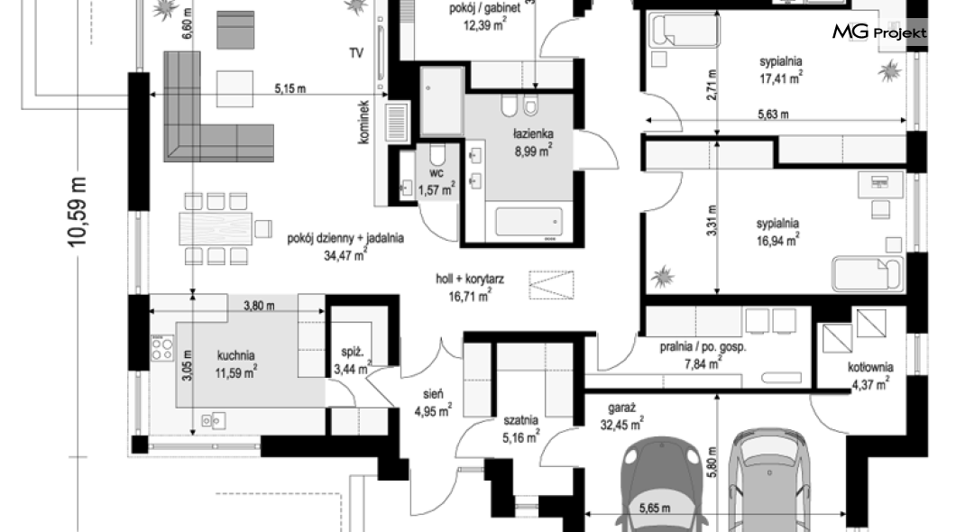 Projekt domu Doskonały 2 C jest kolejną wersją wariantową z popularnej serii domów „Doskonałych”. Jest to projektu parterowego domu, przykrytego wielospadowym dachem, ze strychem do dowolnego wykorzystania. Dom zbudowano na planie krzyża z główną bryłą o kalenicy ustawionej równolegle do elewacji frontowej. Dom przeznaczony jest dla 4-5 osobowej rodziny. Doskonały 2 C różni się od bazowego modelu domu z tej serii projektów większą powierzchnią użytkową, dzięki czemu udało się zaprojektować większe pokoje sypialne dzieci, oraz przewidziano więcej przydatnej powierzchni techniczno–gospodarczej. Domek zaprojektowano jako rozłożystą parterową bryłę, z garażem i podcieniem wejściowym od frontu, oraz podcieniem ogrodowym przykrywającym częściowo taras od tyłu domu. Szerokie przeszklenia okien, kontrastowe okładziny ścian, i fragmenty elewacji wykończone drewnem nadają bryle dodatkowej atrakcyjności. Szerokie okapy z białą podbitką z płyt z gzymsem i krytą rynną wyróżniają dom oryginalnym detalem. Front domu ujmuje swoją bezpretensjonalną elegancją. Reprezentacyjne drzwi wejściowe z naświetlami zapraszają do wnętrza. Z kolei elewacja od strony ogrodu narożne przeszklenia salonu i sypialni głównej otwierają wnętrze na taras i ogród. Cały program użytkowy domu został przewidziany na parterze domu - wszystkie pomieszczenia części dziennej, sypialnie, oraz pomieszczenia gospodarcze i garaż. Strych do adaptacji na dodatkowe poddasze stanowi możliwą opcję - dodatek do i tak pięknego wnętrza na parterze. Z wygodnego przedsionka dostajemy się do holu i dalej do salonu. Z garażu możliwe jest przejście przez szatnię i spiżarnię wprost do kuchni. Takie połączenie ułatwia codzienny transport zakupów domowych. Z holu przechodzimy do otwartej części dziennej połączonych pomieszczeń salonu z jadalnią i kuchni. Duże przeszklenia narożne pokoju dziennego otwierają wnętrze dzienne na otaczający dom ogród, a piękne również narożne okno kuchenne pozwala obserwować front działki. W salonie zaprojektowano szeroką ścianę telewizyjno–kominkową na którą skierowane są meble wypoczynkowe. W strefie prywatnej domowników mamy sypialnię rodziców z garderobą i niewielką łazienką z prysznicem, dodatkowy pokój - np. gabinet, dwie duże sypialnie dzieci z wbudowanymi w ściany szafami, oraz dużą łazienkę i wc dostępne z holu. „Doskonały 2 C” to dom o stosunkowo prostej konstrukcji - niedrogi w budowie i późniejszym utrzymaniu. Do świetna propozycja dla osób marzących o parterowym wygodnym domu. Zapraszamy do zapoznania się z pełną ofertą pracowni MG Projekt: Doskonały i Doskonały 2.