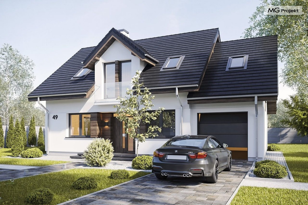 Projekt domku Narcyz 3 to parterowy dom z poddaszem użytkowym, zbudowany na planie prostokąta, przykryty dwuspadowym dachem. Do głównej bryły projektu Narcyz 3 dobudowana jest część garażowa z poddaszem. W projekcie domku Narcyz 3 symetryczna proporcjonalna elewacja frontowa ozdobiona jest podcieniem wejściowymi i szeroką lukarną z balkonem. Urozmaiceniem elewacji tylnej projektu Narcyz 3 jest zadaszenie tarasu, oraz szerokie przesuwne drzwi balkonowe salonu.Wnętrze parteru projektu Narcyz 3 to 40-metrowa połączona przestrzeń salonu, holu i kuchni, reprezentacyjne schody na poddasze, oraz dwa dodatkowe pokoje na parterze (gabinet do pracy, lub np. sypialnia seniora), oraz łazienka, garaż i kotłownia. Lokalizacja kotłowni w projekcie domu Narcyz 3 pozwala na instalację zarówno kotła gazowego lub pompy ciepła, jak i kotła na paliwo stałe. W projekcie domu Narcyz 3 na poddaszu, mimo skosów dachu, zmieściły się wygodne cztery pokoje i dwie łazienki (pokój nad garażem ma własną oddzielną łazienkę z prysznicem). Powierzchnię użytkową na poddaszu w projekcie domu Narcyz 3 można powiększyć podnosząc nieco ściany kolankowe.