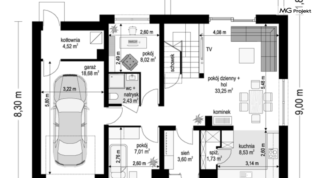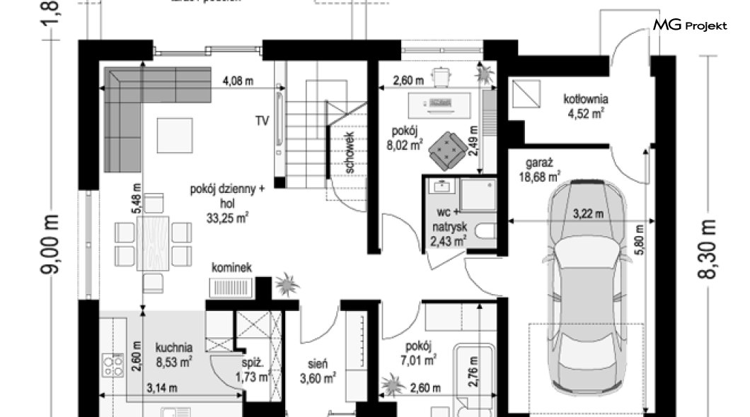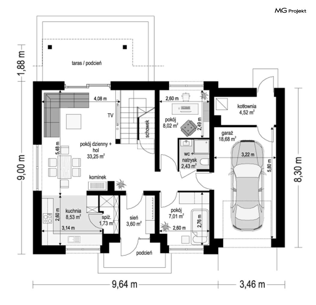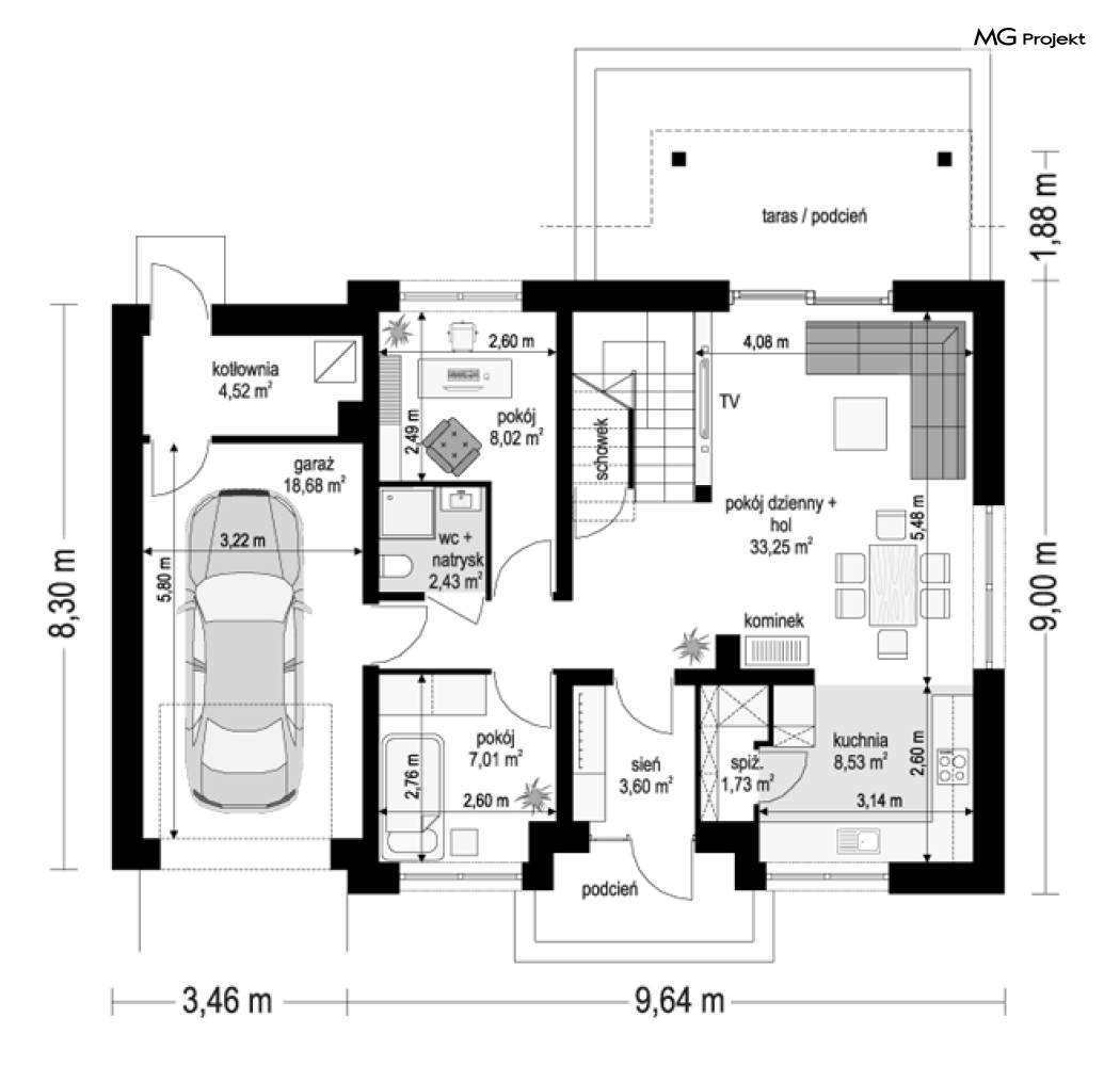 Pracownia architektoniczna MG Projekt dysponuje również projektem domku Narcyz 3 w odbiciu lustrzanym oraz wersjami wariantowymi budynku: projekt domu Narcyz, projekt domu Narcyz 2, projekt domu Narcyz 4.
