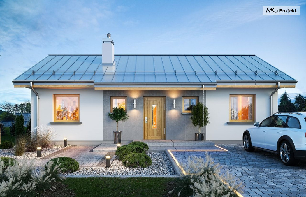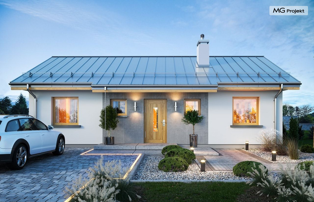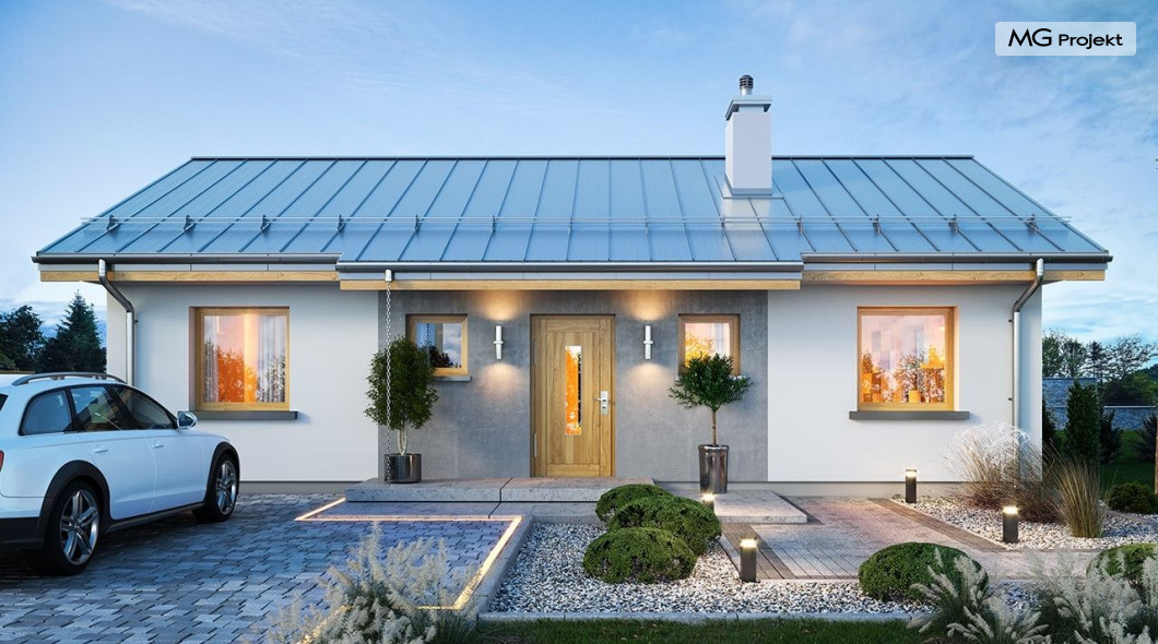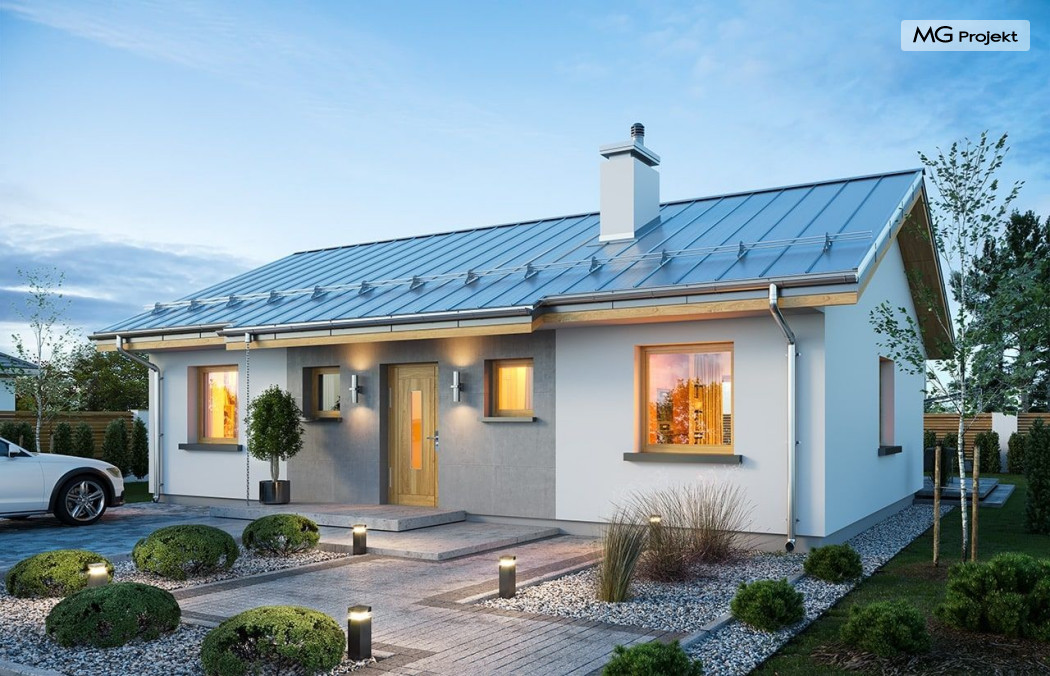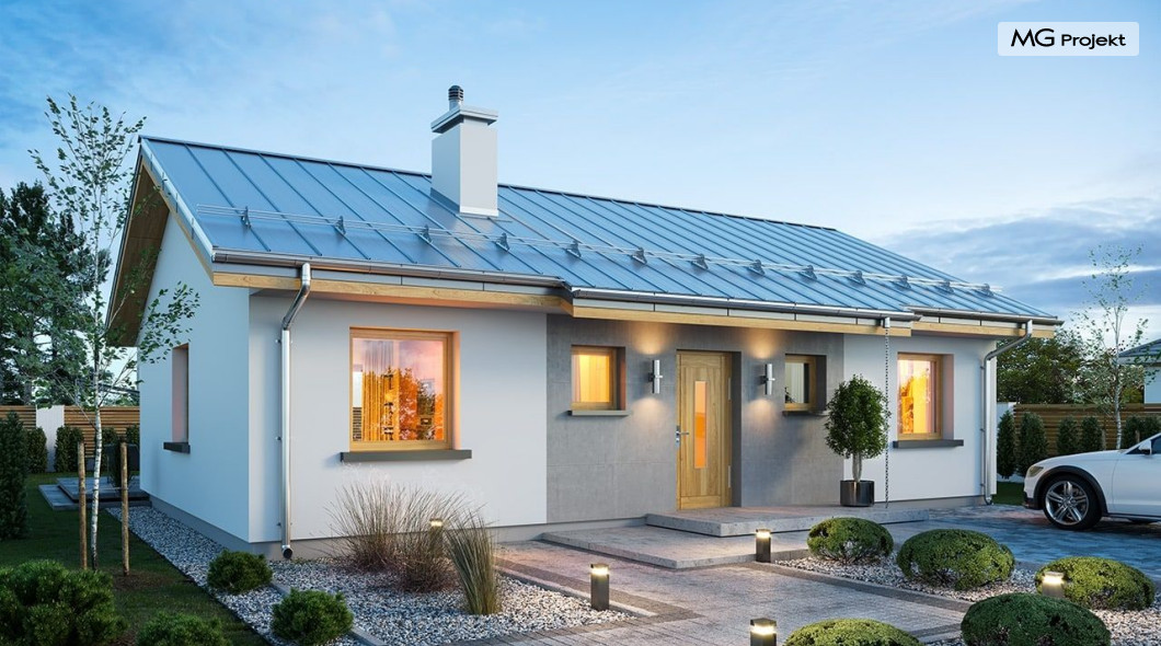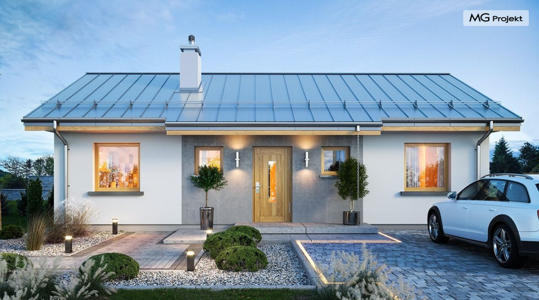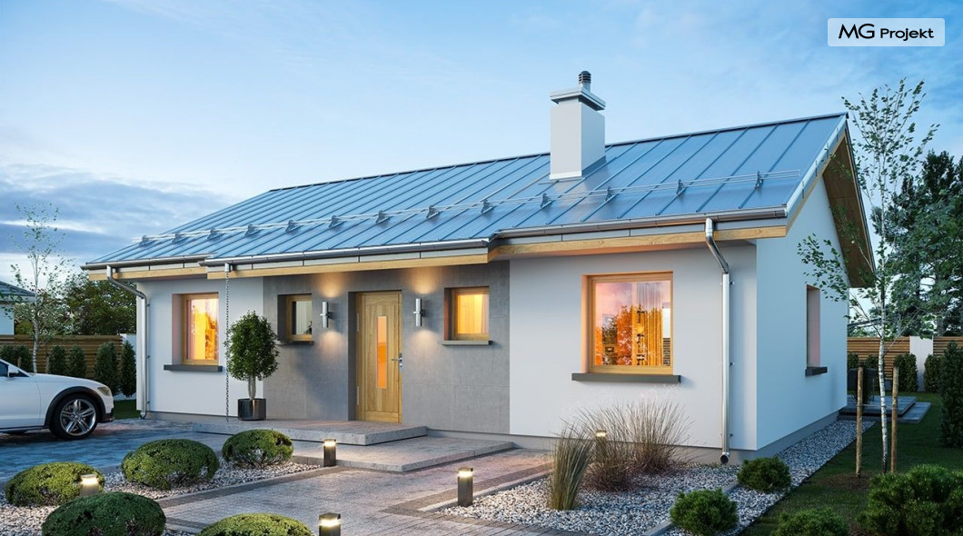 Projekt domu Sensowny to projekt niewielkiego domu jednorodzinnego z serii „Sensownych”. Jest to prosty parterowy budynek przykryty dwuspadowym symetrycznym dachem. Rzut domu o wymiarach 12x 8 m kryje w sobie przestronne i funkcjonalne wnętrze, dające komfortową przestrzeń do mieszkania dla 2-3 lub 4 osobowej rodziny. Domek jest doskonałą propozycją dla rodziny z dziećmi, którzy budują swój pierwszy dom. Ale też może być świetną propozycją dla osób, które żyją we dwójkę i których latorośle już opuściły domowe gniazdo. „Sensowny” jest zatem praktyczną propozycją na wygodne, ale niedrogie mieszkanie na własnej działce z ogrodem. Dom łatwy i tani w budowie, oraz niedrogi w późniejszej eksploatacji. Nie ma żadnych udziwnień architektonicznych, więc nie ma się za bardzo co w nim zepsuć - nie będzie wymagał ciągłej pracy i pielęgnacji. „Sensowny” może także być dobrą propozycją na drugi wakacyjny dom - czemu nie. Architektura budynku utrzymana jest w nowoczesnej stylistyce. Zachowana symetria i właściwe proporcje, oraz konsekwentna kolorystyka materiałów wykończeniowych tworzą bardzo miłą dla oka całość. Wejście do domu podkreślono wysuniętym dachem zakrywającym podest wejściowy. Drzwi wejściowe zaakcentowane są kontrastowym kolorem ściany. Od strony ogrodu pierwsze skrzypce w elewacji grają szerokie drzwi balkonowe, otwierające przestrzeń pokoju dziennego na taras i otaczający dom ogród. Wnętrze podzielone zostało na przestrzeń dzienną – z salonem, kuchnią i holem, oraz na przestrzeń nocną – z trzema sypialniami i łazienką. Z przedsionka dodatkowo wchodzimy do kotłowni, której komin połączony jest z przewodem kominka salonu w jeden zestaw ( mniej dziur w dachu ). Salon ma bardzo ładne ustawienie - ze ścianą telewizyjną i narożnym kominkiem widocznym z każdego miejsca. Mimo niedużej powierzchni, wnętrze domu jest bardzo wygodne, przestronne i funkcjonalne.Konstrukcja budynku jest prosta i tania w budowie. Wszystkie prace murarskie i betoniarskie kończą się na poziomie wieńców nad ścianami parteru. Powyżej zaprojektowaliśmy układ drewnianych wiązarów dachowych, które stanowią konstrukcję zarówno stropu nad parterem jak i więźby dachowej. Takie rozwiązanie znakomicie przyspiesza i upraszcza budowę i - przede wszystkim - obniża koszty. Wiązary dachowe pozwalają oczywiście wykorzystać przestrzeń strychową nad parterem na domowy magazyn. W projekcie zastosowano bardzo dobre izolacje i nowoczesne instalacje, dzięki czemu dom jest energooszczędny i będzie tani w późniejszym utrzymaniu. „Sensowny” to sensowna propozycja dla osób, które planują budowę domu, ale nie zamierzają wydać na niego fortuny i podcinać sobie żył po to żeby zaimponować sąsiadom. To doskonała propozycja dla osób podchodzących do budowy swojego domu w sposób praktyczny i rozsądny. Budowa „Sensownego” pójdzie jak po maśle. Zapraszamy !