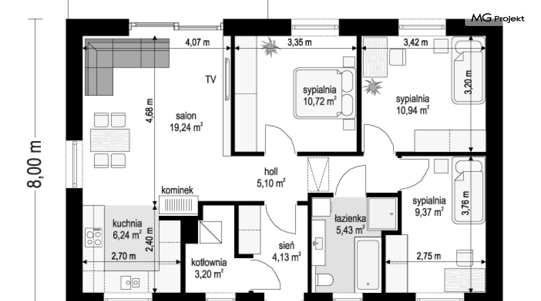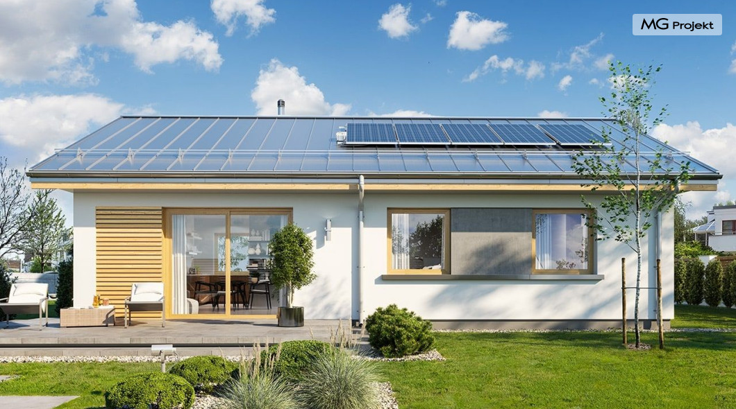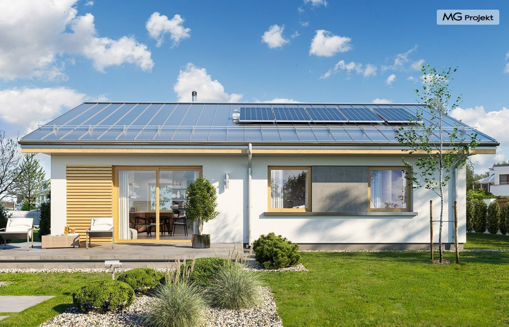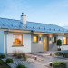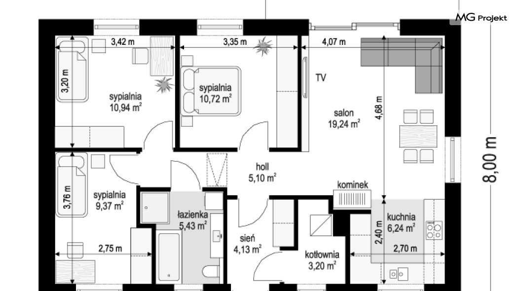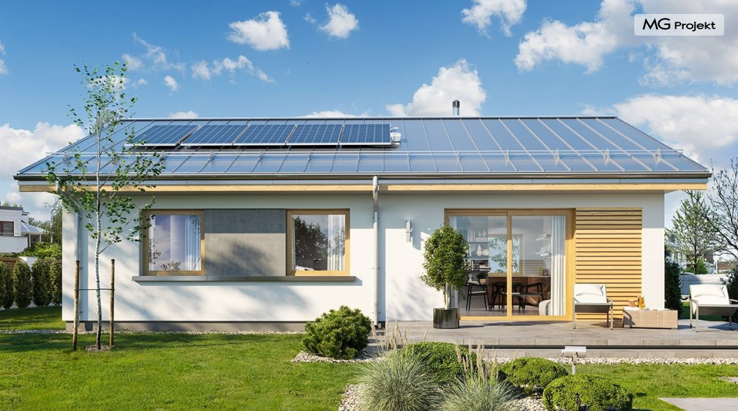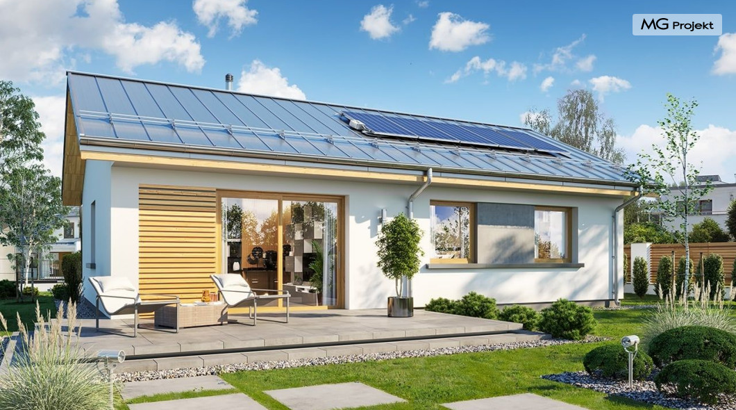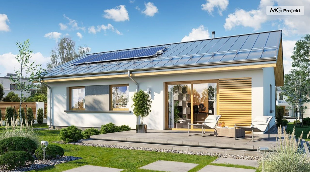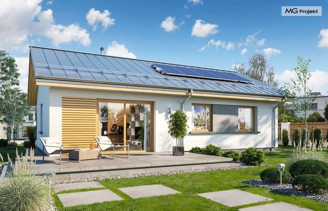 Projekt domu Sensowny to projekt niewielkiego domu jednorodzinnego z serii „Sensownych”. Jest to prosty parterowy budynek przykryty dwuspadowym symetrycznym dachem. Rzut domu o wymiarach 12x 8 m kryje w sobie przestronne i funkcjonalne wnętrze, dające komfortową przestrzeń do mieszkania dla 2-3 lub 4 osobowej rodziny. Domek jest doskonałą propozycją dla rodziny z dziećmi, którzy budują swój pierwszy dom. Ale też może być świetną propozycją dla osób, które żyją we dwójkę i których latorośle już opuściły domowe gniazdo. „Sensowny” jest zatem praktyczną propozycją na wygodne, ale niedrogie mieszkanie na własnej działce z ogrodem. Dom łatwy i tani w budowie, oraz niedrogi w późniejszej eksploatacji. Nie ma żadnych udziwnień architektonicznych, więc nie ma się za bardzo co w nim zepsuć - nie będzie wymagał ciągłej pracy i pielęgnacji. „Sensowny” może także być dobrą propozycją na drugi wakacyjny dom - czemu nie. Architektura budynku utrzymana jest w nowoczesnej stylistyce. Zachowana symetria i właściwe proporcje, oraz konsekwentna kolorystyka materiałów wykończeniowych tworzą bardzo miłą dla oka całość. Wejście do domu podkreślono wysuniętym dachem zakrywającym podest wejściowy. Drzwi wejściowe zaakcentowane są kontrastowym kolorem ściany. Od strony ogrodu pierwsze skrzypce w elewacji grają szerokie drzwi balkonowe, otwierające przestrzeń pokoju dziennego na taras i otaczający dom ogród. Wnętrze podzielone zostało na przestrzeń dzienną – z salonem, kuchnią i holem, oraz na przestrzeń nocną – z trzema sypialniami i łazienką. Z przedsionka dodatkowo wchodzimy do kotłowni, której komin połączony jest z przewodem kominka salonu w jeden zestaw ( mniej dziur w dachu ). Salon ma bardzo ładne ustawienie - ze ścianą telewizyjną i narożnym kominkiem widocznym z każdego miejsca. Mimo niedużej powierzchni, wnętrze domu jest bardzo wygodne, przestronne i funkcjonalne.Konstrukcja budynku jest prosta i tania w budowie. Wszystkie prace murarskie i betoniarskie kończą się na poziomie wieńców nad ścianami parteru. Powyżej zaprojektowaliśmy układ drewnianych wiązarów dachowych, które stanowią konstrukcję zarówno stropu nad parterem jak i więźby dachowej. Takie rozwiązanie znakomicie przyspiesza i upraszcza budowę i - przede wszystkim - obniża koszty. Wiązary dachowe pozwalają oczywiście wykorzystać przestrzeń strychową nad parterem na domowy magazyn. W projekcie zastosowano bardzo dobre izolacje i nowoczesne instalacje, dzięki czemu dom jest energooszczędny i będzie tani w późniejszym utrzymaniu. „Sensowny” to sensowna propozycja dla osób, które planują budowę domu, ale nie zamierzają wydać na niego fortuny i podcinać sobie żył po to żeby zaimponować sąsiadom. To doskonała propozycja dla osób podchodzących do budowy swojego domu w sposób praktyczny i rozsądny. Budowa „Sensownego” pójdzie jak po maśle. Zapraszamy !