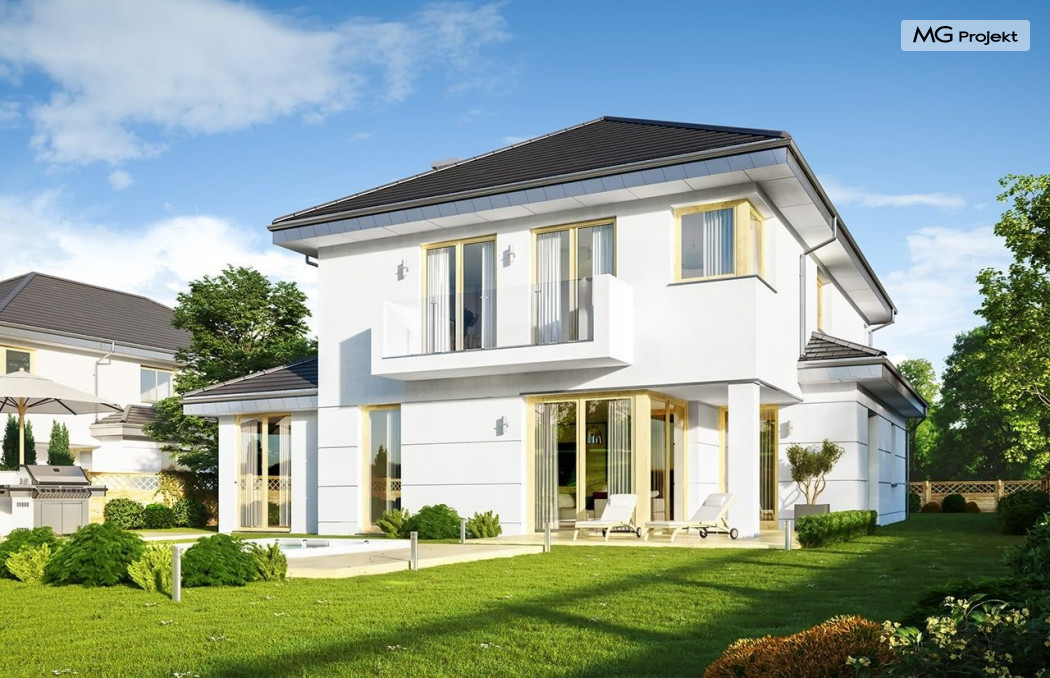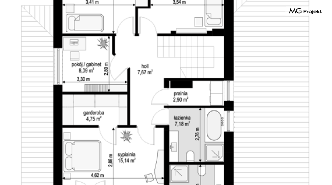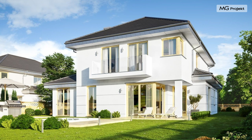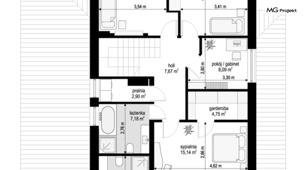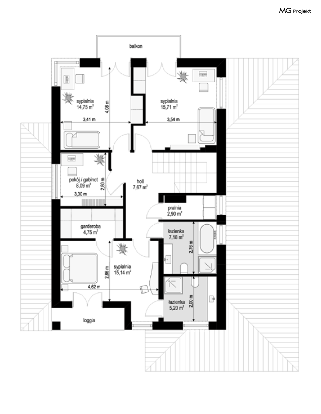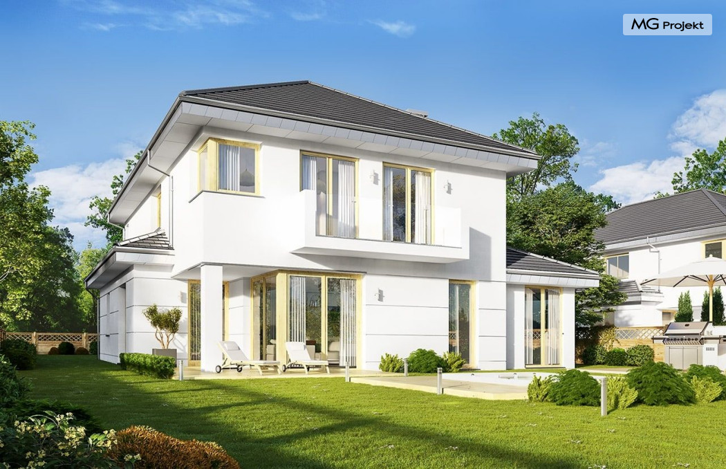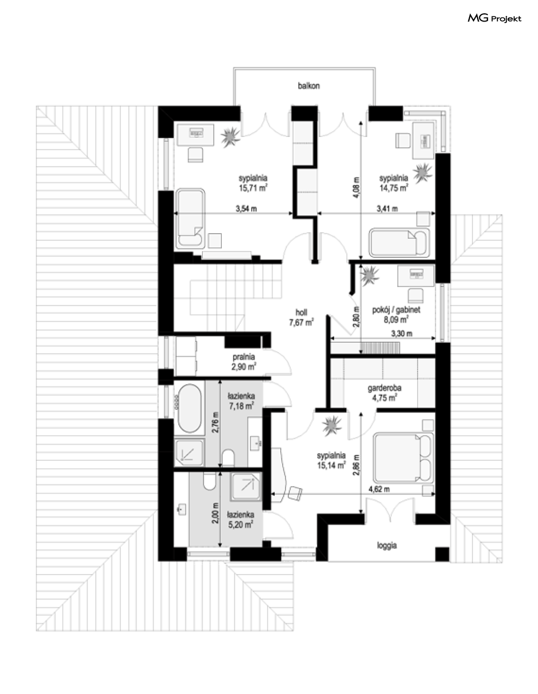 Projekt domu Kasjopea 7 B jest wersją wariantową popularnego projektu Kasjopea 7 z wyższym kątem nachylenia dachu, co może być ułatwieniem dla Inwestorów, na których działkach warunki urbanistyczne nakazują budowę domu z wyższym dachem. Projekt domu Kasjopea 7 BProjekt domu Kasjopea 7 B jest energooszczędny, zastosowano w nim najnowsze materiały i instalacje. Budynek ma dość prostą konstrukcję - będzie łatwy i szybki w budowie. Dzięki zwartej bryle i dobrym izolacjom będzie też tani w późniejszej eksploatacji. Projekt dostępny jest w odbiciu lustrzanym oraz kilku wersjach: podstawowa ( to projekt domu jednorodzinnego, piętrowego. Jego prostokątna piętrowa bryła przykryta jest czterospadowym dachem. Do głównej bryły dobudowana jest parterowa część nad garażem i dodatkowym pokojem przekryta trzyspadowym dachem. Elewacje domu podzielono na poziome pasy. Ściany parteru są boniowane - ściany piętra tynkowane na gładko. Duże przeszklenia, loggia, podcienie , balkon - stanowią elementy ozdobne urozmaicające zewnętrzną sylwetkę budynku. Zastosowane nowoczesne materiały w stonowanych kolorach tworzą elegancki, powściągliwy efekt. Dom, jako podmiejska willa, doskonale wpasuje się w otoczenie innych zabudowań. Wnętrze budynku podzielono na następujące części: przestrzeń dzienną i gospodarczo garażową na parterze, oraz sypialnie na piętrze. Do domu wchodzimy przez przedsionek połączony z garażem i przechodzimy na wprost do połączonej otwartej powierzchni holu, salonu z jadalnią i kuchni. Salon i jadalnia otwierają się dużymi przeszkleniami na częściowo zadaszony taras, oraz ogród. Wygodna kuchnia z kącikiem na szybkie posiłki jest częściowo wizualne oddzielona od reszty wnętrza. Reprezentacyjne schody stanowią ozdobę wnętrza domu. Za schodami niewielkim korytarzem przechodzimy do dodatkowego pokoju (gabinet, lub sypialnia gościnna) i łazienki. Z kolei z dwustanowiskowego garażu przechodzimy do kotłowni. Na piętrze do dyspozycji mamy cztery pokoje, w tym: apartament rodziców, z własną łazienką, garderobą i tarasem, oraz trzy sypialnie dzieci (jedna mniejsza) z łazienką i pralnią dostępną z holu. Nad piętrem mamy jeszcze do dyspozycji spory strych - dodatkową przestrzeń magazynową domu.projekt domu Kasjopea) i jej wersja odświeżona (projekt domu Kasjopea 8), bliźniak (projekt domu Kasjopea 2), ze zmienionym układem pomieszczeń (projekt domu Kasjopea 3), pomniejszona (projekt domu Kasjopea 4), komfortowa (projekt domu Kasjopea 5), największa (projekt domu Kasjopea 6) i z nowocześniejszą architekturą (projekt domu Kasjopea 7).