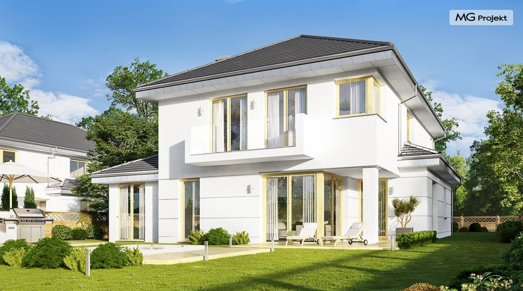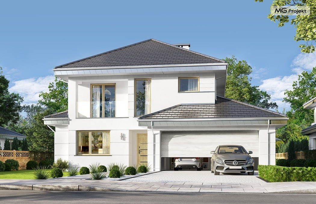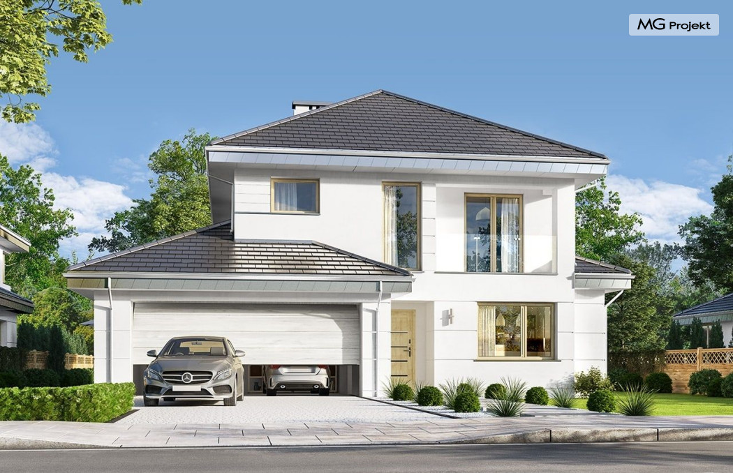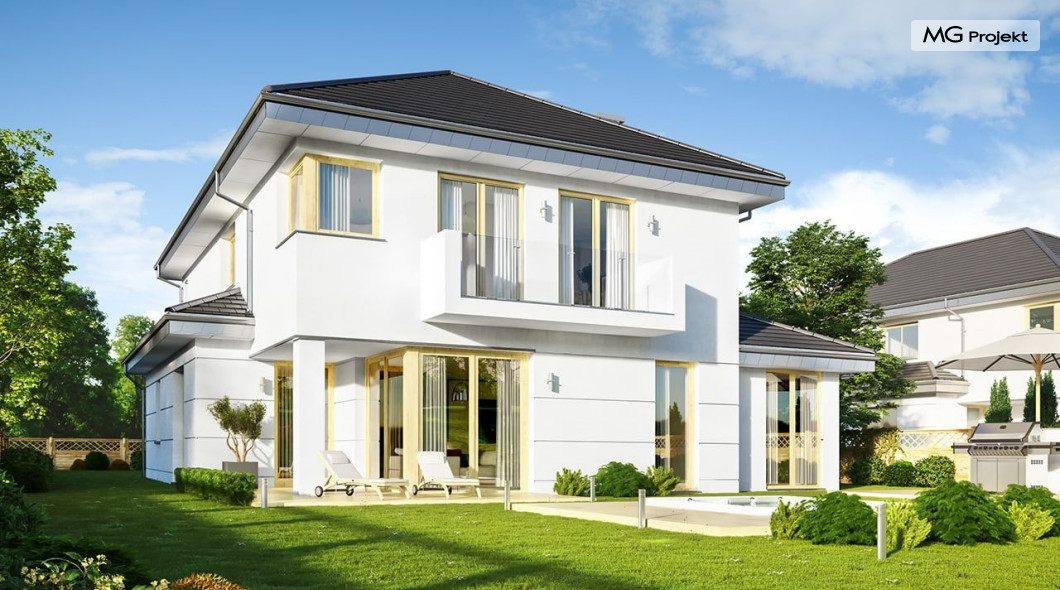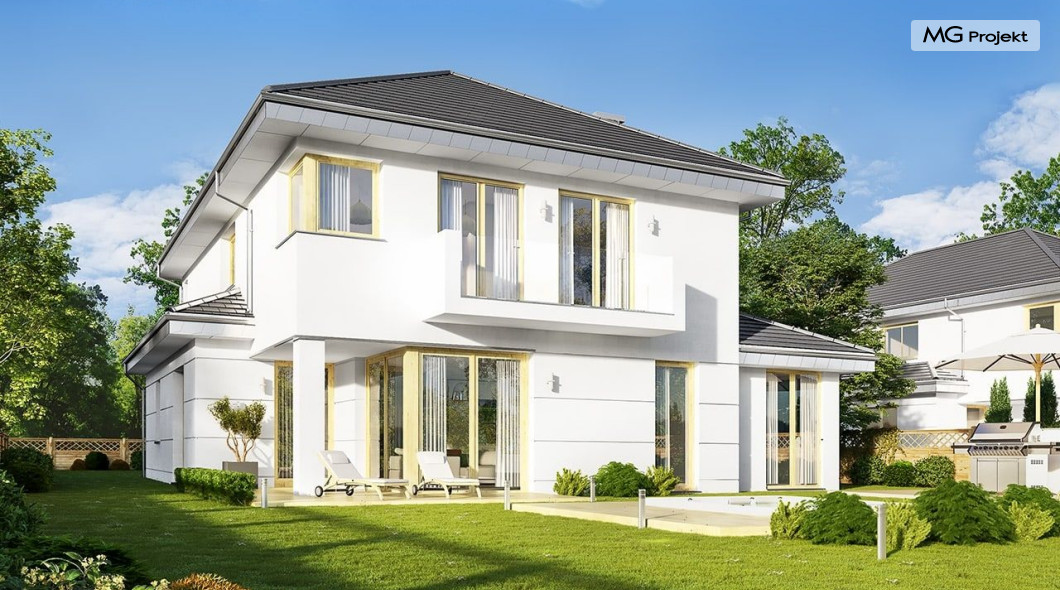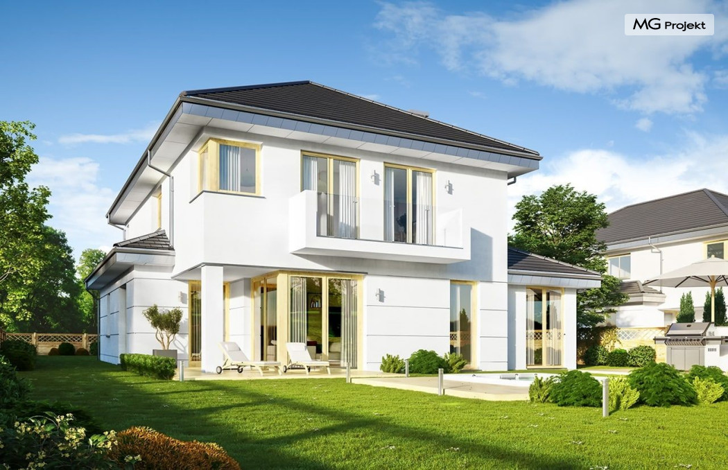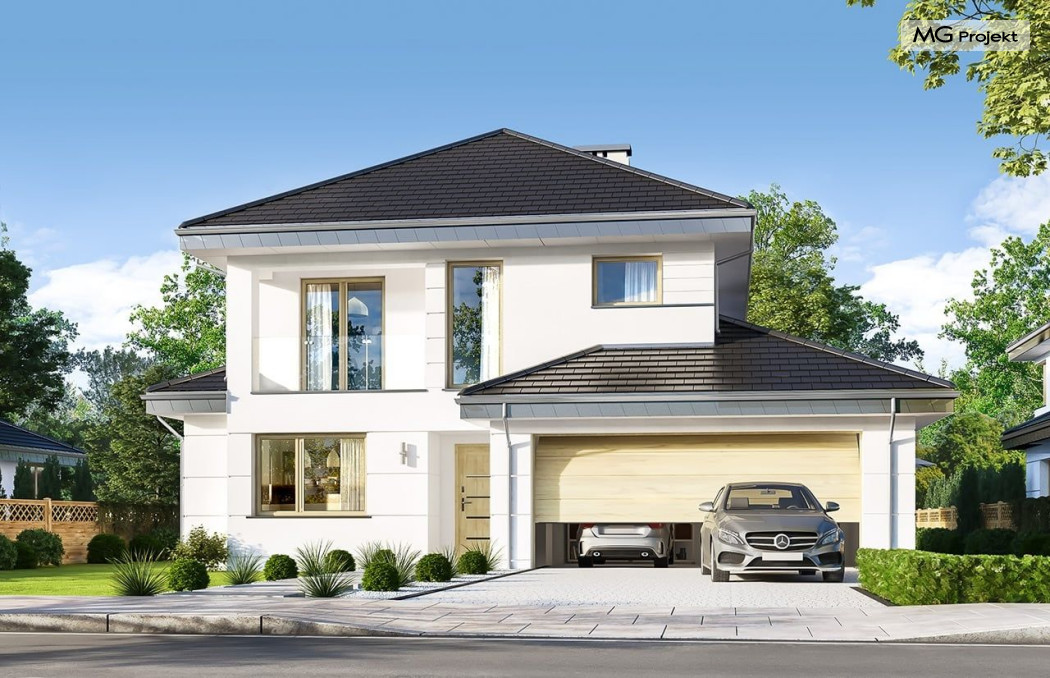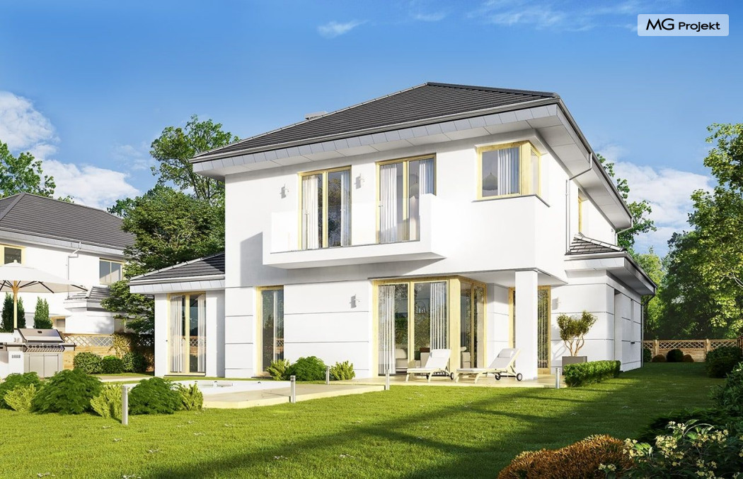 Projekt domu Kasjopea 7 B jest wersją wariantową popularnego projektu Kasjopea 7 z wyższym kątem nachylenia dachu, co może być ułatwieniem dla Inwestorów, na których działkach warunki urbanistyczne nakazują budowę domu z wyższym dachem. Projekt domu Kasjopea 7 BProjekt domu Kasjopea 7 B jest energooszczędny, zastosowano w nim najnowsze materiały i instalacje. Budynek ma dość prostą konstrukcję - będzie łatwy i szybki w budowie. Dzięki zwartej bryle i dobrym izolacjom będzie też tani w późniejszej eksploatacji. Projekt dostępny jest w odbiciu lustrzanym oraz kilku wersjach: podstawowa ( to projekt domu jednorodzinnego, piętrowego. Jego prostokątna piętrowa bryła przykryta jest czterospadowym dachem. Do głównej bryły dobudowana jest parterowa część nad garażem i dodatkowym pokojem przekryta trzyspadowym dachem. Elewacje domu podzielono na poziome pasy. Ściany parteru są boniowane - ściany piętra tynkowane na gładko. Duże przeszklenia, loggia, podcienie , balkon - stanowią elementy ozdobne urozmaicające zewnętrzną sylwetkę budynku. Zastosowane nowoczesne materiały w stonowanych kolorach tworzą elegancki, powściągliwy efekt. Dom, jako podmiejska willa, doskonale wpasuje się w otoczenie innych zabudowań. Wnętrze budynku podzielono na następujące części: przestrzeń dzienną i gospodarczo garażową na parterze, oraz sypialnie na piętrze. Do domu wchodzimy przez przedsionek połączony z garażem i przechodzimy na wprost do połączonej otwartej powierzchni holu, salonu z jadalnią i kuchni. Salon i jadalnia otwierają się dużymi przeszkleniami na częściowo zadaszony taras, oraz ogród. Wygodna kuchnia z kącikiem na szybkie posiłki jest częściowo wizualne oddzielona od reszty wnętrza. Reprezentacyjne schody stanowią ozdobę wnętrza domu. Za schodami niewielkim korytarzem przechodzimy do dodatkowego pokoju (gabinet, lub sypialnia gościnna) i łazienki. Z kolei z dwustanowiskowego garażu przechodzimy do kotłowni. Na piętrze do dyspozycji mamy cztery pokoje, w tym: apartament rodziców, z własną łazienką, garderobą i tarasem, oraz trzy sypialnie dzieci (jedna mniejsza) z łazienką i pralnią dostępną z holu. Nad piętrem mamy jeszcze do dyspozycji spory strych - dodatkową przestrzeń magazynową domu.projekt domu Kasjopea) i jej wersja odświeżona (projekt domu Kasjopea 8), bliźniak (projekt domu Kasjopea 2), ze zmienionym układem pomieszczeń (projekt domu Kasjopea 3), pomniejszona (projekt domu Kasjopea 4), komfortowa (projekt domu Kasjopea 5), największa (projekt domu Kasjopea 6) i z nowocześniejszą architekturą (projekt domu Kasjopea 7).