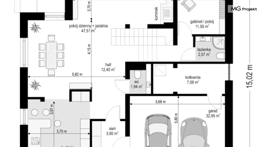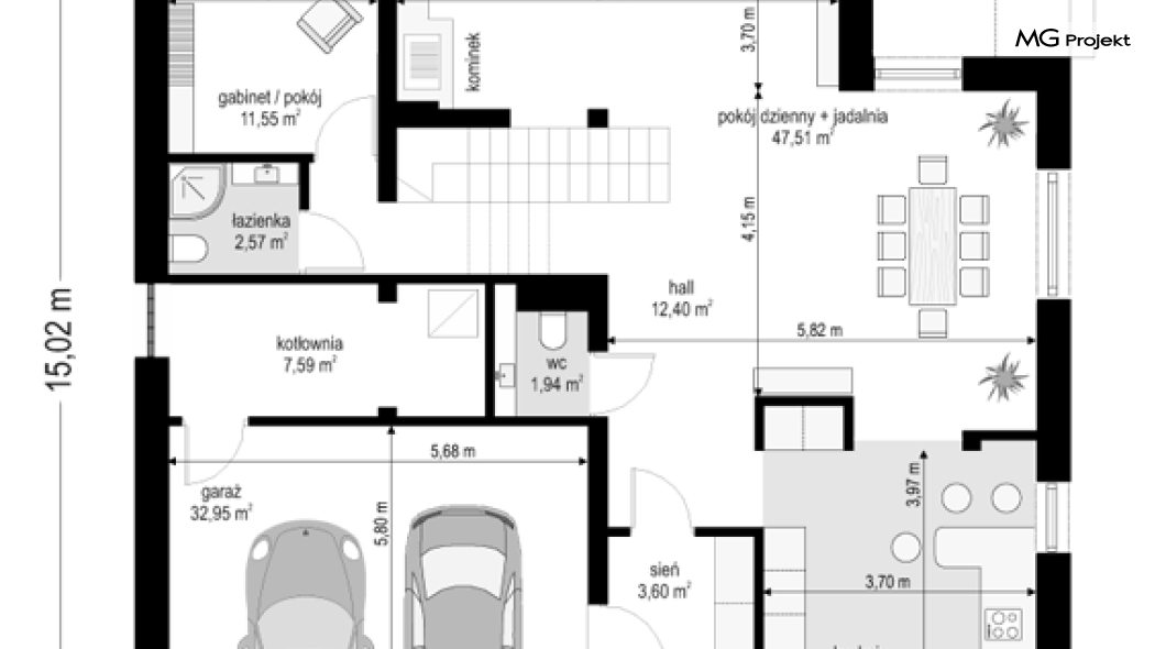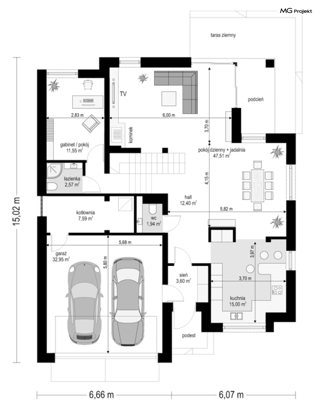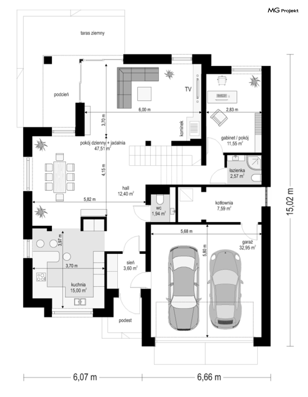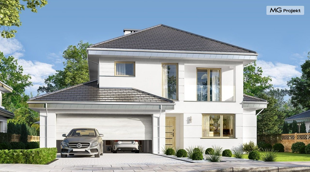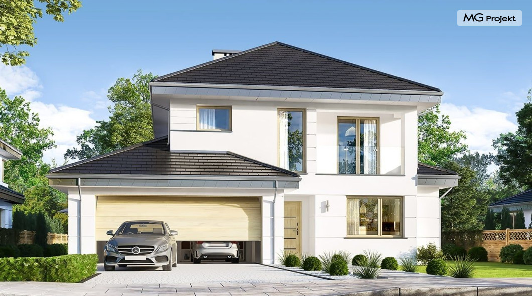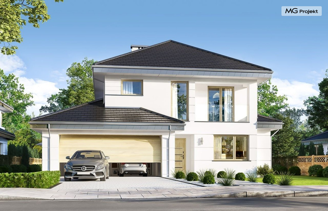 Projekt domu Kasjopea 7 B jest wersją wariantową popularnego projektu Kasjopea 7 z wyższym kątem nachylenia dachu, co może być ułatwieniem dla Inwestorów, na których działkach warunki urbanistyczne nakazują budowę domu z wyższym dachem. Projekt domu Kasjopea 7 BProjekt domu Kasjopea 7 B jest energooszczędny, zastosowano w nim najnowsze materiały i instalacje. Budynek ma dość prostą konstrukcję - będzie łatwy i szybki w budowie. Dzięki zwartej bryle i dobrym izolacjom będzie też tani w późniejszej eksploatacji. Projekt dostępny jest w odbiciu lustrzanym oraz kilku wersjach: podstawowa ( to projekt domu jednorodzinnego, piętrowego. Jego prostokątna piętrowa bryła przykryta jest czterospadowym dachem. Do głównej bryły dobudowana jest parterowa część nad garażem i dodatkowym pokojem przekryta trzyspadowym dachem. Elewacje domu podzielono na poziome pasy. Ściany parteru są boniowane - ściany piętra tynkowane na gładko. Duże przeszklenia, loggia, podcienie , balkon - stanowią elementy ozdobne urozmaicające zewnętrzną sylwetkę budynku. Zastosowane nowoczesne materiały w stonowanych kolorach tworzą elegancki, powściągliwy efekt. Dom, jako podmiejska willa, doskonale wpasuje się w otoczenie innych zabudowań. Wnętrze budynku podzielono na następujące części: przestrzeń dzienną i gospodarczo garażową na parterze, oraz sypialnie na piętrze. Do domu wchodzimy przez przedsionek połączony z garażem i przechodzimy na wprost do połączonej otwartej powierzchni holu, salonu z jadalnią i kuchni. Salon i jadalnia otwierają się dużymi przeszkleniami na częściowo zadaszony taras, oraz ogród. Wygodna kuchnia z kącikiem na szybkie posiłki jest częściowo wizualne oddzielona od reszty wnętrza. Reprezentacyjne schody stanowią ozdobę wnętrza domu. Za schodami niewielkim korytarzem przechodzimy do dodatkowego pokoju (gabinet, lub sypialnia gościnna) i łazienki. Z kolei z dwustanowiskowego garażu przechodzimy do kotłowni. Na piętrze do dyspozycji mamy cztery pokoje, w tym: apartament rodziców, z własną łazienką, garderobą i tarasem, oraz trzy sypialnie dzieci (jedna mniejsza) z łazienką i pralnią dostępną z holu. Nad piętrem mamy jeszcze do dyspozycji spory strych - dodatkową przestrzeń magazynową domu.projekt domu Kasjopea) i jej wersja odświeżona (projekt domu Kasjopea 8), bliźniak (projekt domu Kasjopea 2), ze zmienionym układem pomieszczeń (projekt domu Kasjopea 3), pomniejszona (projekt domu Kasjopea 4), komfortowa (projekt domu Kasjopea 5), największa (projekt domu Kasjopea 6) i z nowocześniejszą architekturą (projekt domu Kasjopea 7).