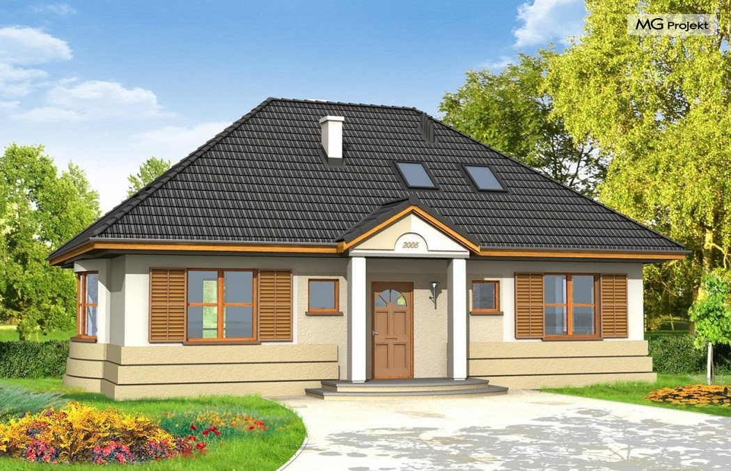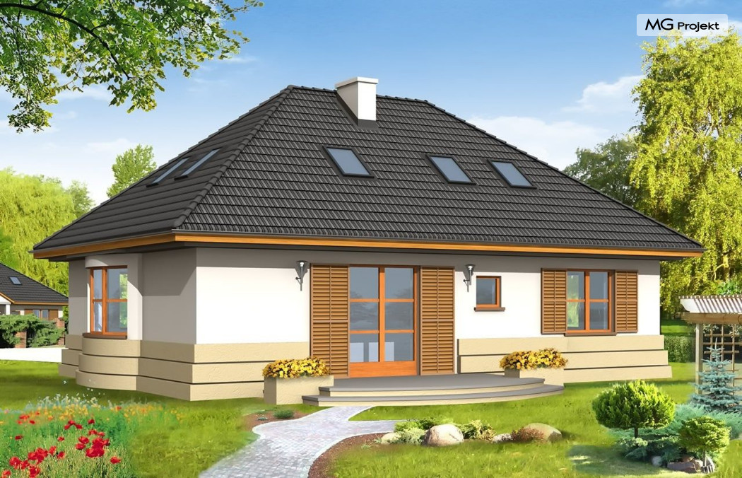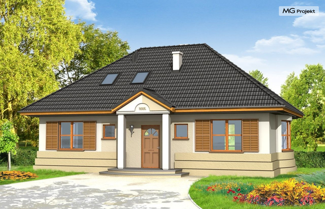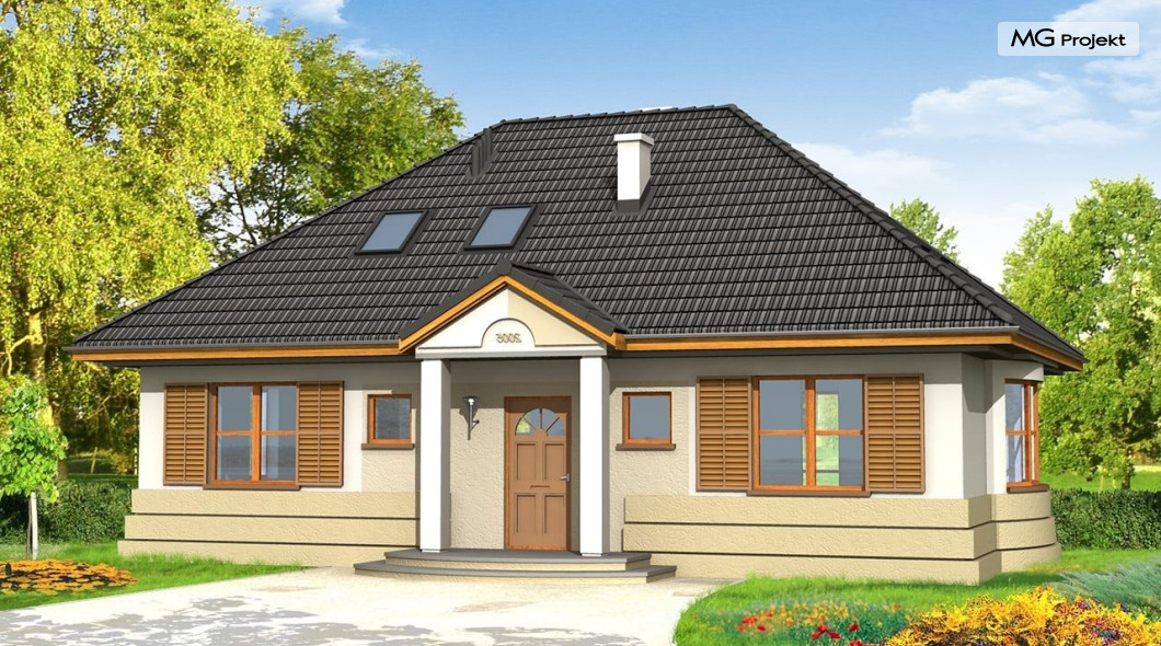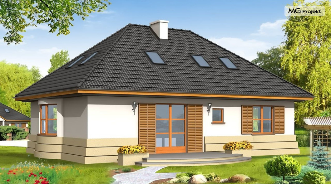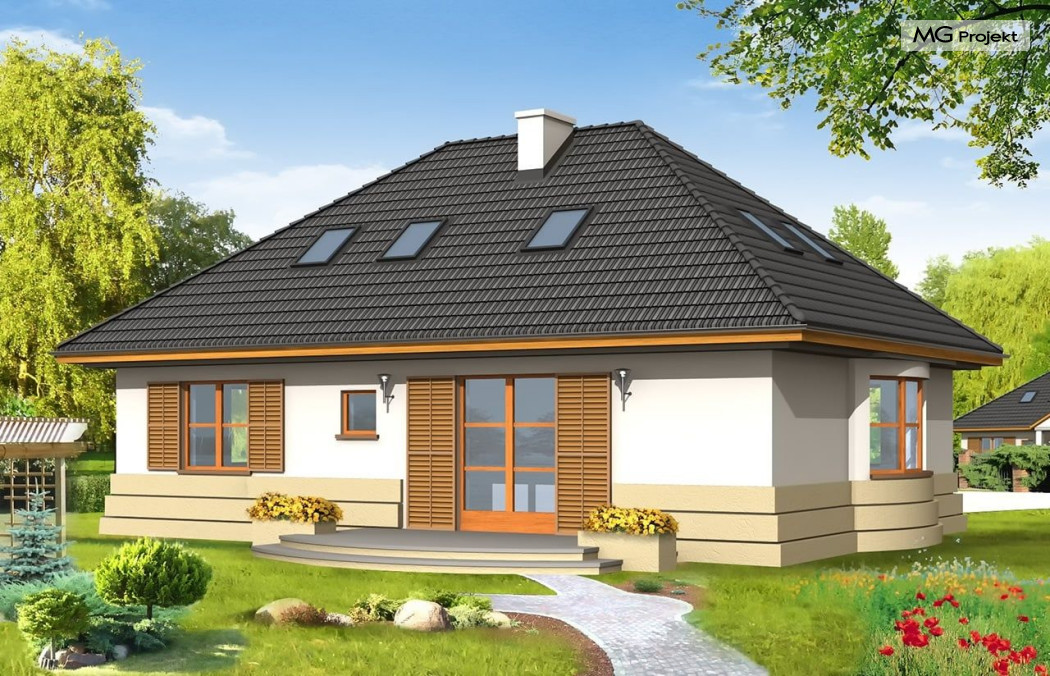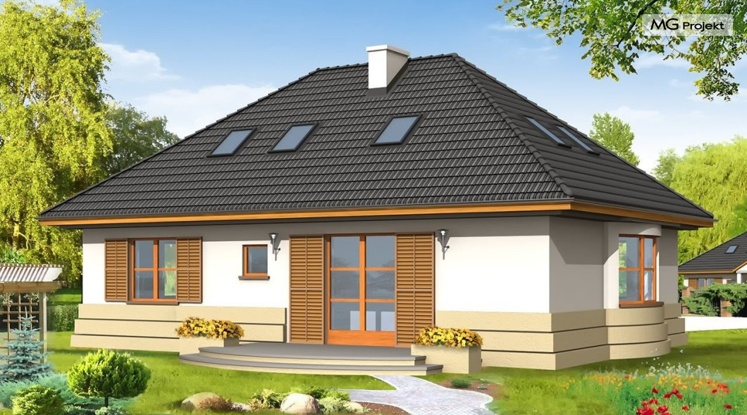 Projekt domu Gargamel to dom jednorodzinny nawiązujący do formy i stylistyki dworku polskiego. Wewnątrz kryje nowoczesny układ wnętrz dla 4-5cio osobowej rodziny. Budynek posiada czterospadowy dach, front wejściowy z kolumnami czy cokół z boniowaniem rozszerzającym się ku dołowi nadają bryle powagi i solidności. Wnętrze domu Gargamel tworzą wygodny salon z wyjściem na taras, aneks jadalny z pięknym łukowym wykuszem, częściowo otwarta kuchnia z bardzo przydatnym pomieszczeniem gospodarczym, oraz w drugim skrzydle domu dwa pokoje z łazienką i garderobą. Na poddaszu dwie sypialnie z łazienką. Poddasze można wykończyć w drugim etapie budowy. Dom Gargamel dostępny jest w odbiciu lustrzanym.