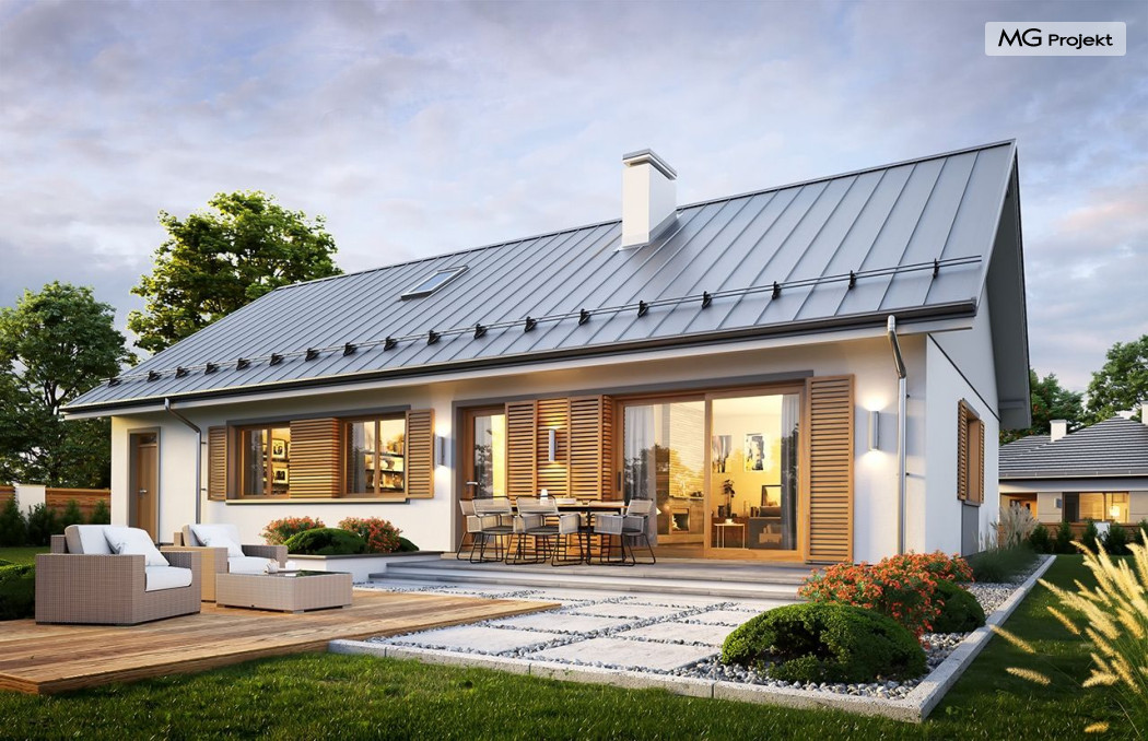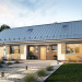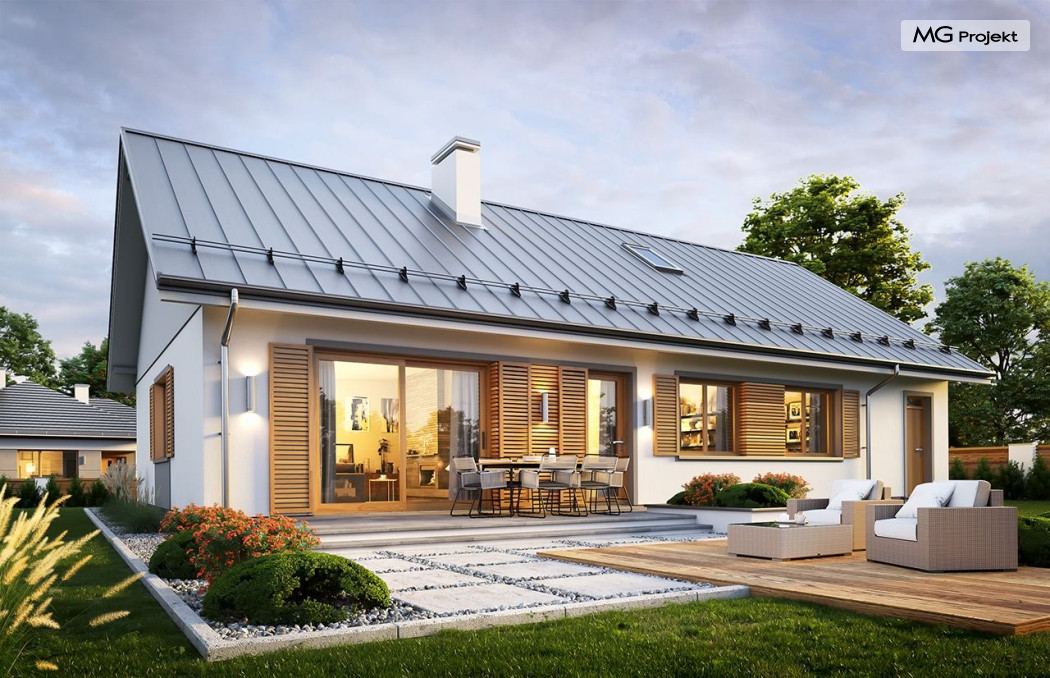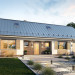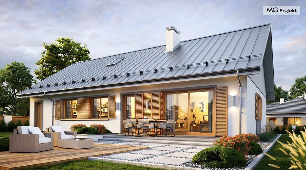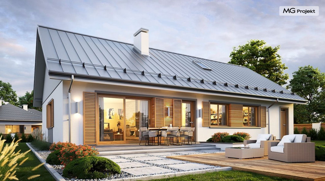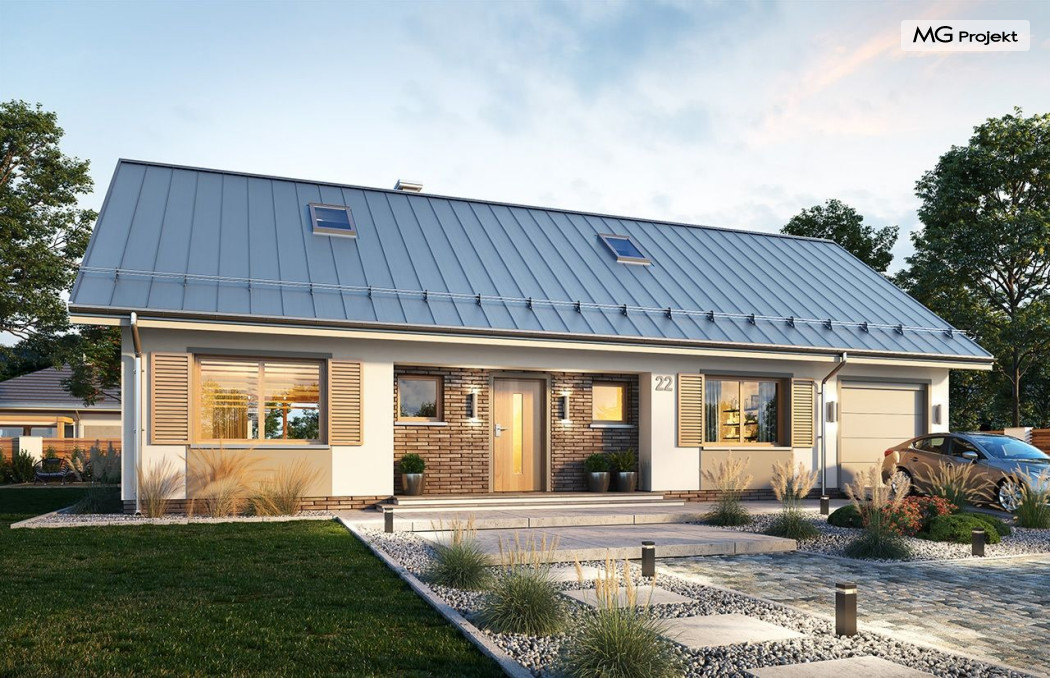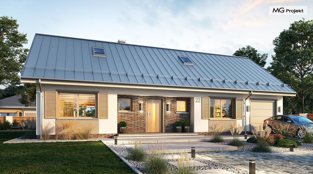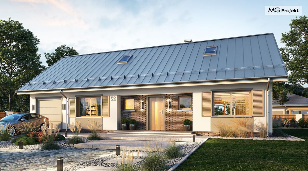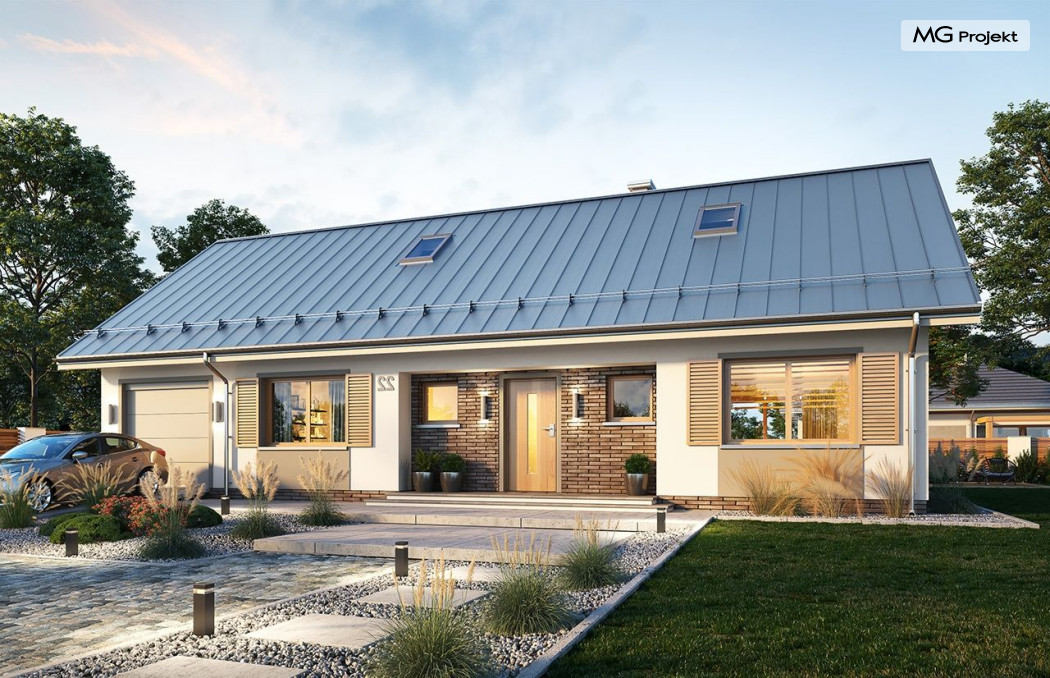 Projekt domu Ekonomiczny 3 jest to projekt niewielkiego parterowego domu jednorodzinnego dla 3-4 osób – jednego z serii domków o tej samej nazwie w ofercie MG Projekt. Ekonomiczny 3 zaprojektowany został na prostokątnym planie i przykryty jest dwuspadowym dachem, kryjącym strych do dowolnego wykorzystania. Jest to wariant z dobudowaną częścią garażową, oraz z podniesionym kątem dachu i większą przestrzenią strychowo – poddaszową w stosunku do pierwotnego projektu z serii. Budynek zawiera w sobie wygodne wnętrze, ze wszystkimi potrzebnymi pomieszczeniami na poziomie parteru, oraz z dodatkową dużą przestrzenią strychu, który w łatwy sposób można adaptować na regularne poddasze użytkowe. Na parterze przewidziano cześć dzienną salonu i kuchni - z półwyspem i spiżarnią, a po drugiej stronie trzy sypialnie, w tym sypialnię master z osobną garderobą, oraz wygodną łazienkę. Dwie części domu rozdzielone są pomieszczeniem kotłowni z wyjściem na zewnątrz, ze wspólnym zespołem kominowym z kominkiem salonu. Dodatkowo do głównej bryły domu dodany jest garaż z przestrzenią gospodarczą, do którego dostajemy się z wnętrza przez śluzę / garderobę. Wejście do domu bardzo urokliwie podkreślono niszą z zadaszonym podcieniem, oraz reprezentacyjnym szerokim podestem. Elewacja frontowa jest symetryczna, a dodany garaż nie zaburza bardzo tego poczucia. Front domu przywołuje swoją symetrią dawną architekturę dworkową, lecz sam styl budynku jest absolutnie współczesny - to mieszanka nowoczesności z ukłonem dla ponadczasowej tradycji. Patrząc na dom, mamy wrażenie porządku, harmonii i solidności. Taka idea przyświecała projektantom : architektura miała być prosta, ale miała mieć w sobie „coś” przyciągającego uwagę. Od strony ogrodowej najważniejszymi elementami są : duże okno przesuwne z salonu, otwierające wnętrze na ogród, oraz taras będący przedłużeniem pokoju dziennego. Staraliśmy się zaprojektować dom maksymalnie logicznie i praktycznie, a zarazem umieścić w nim trochę piękna - takiego, które nie skomplikuje budowy i nie będzie twardym orzechem do zgryzienia dla wykonawców.Konstrukcja budynku jest prosta i niedroga w budowie. Wszystkie prace murarskie i betonowe kończą się na wysokości wieńców nad ścianami parteru. Wyżej mamy układ drewnianych wiązarów dachowych, które są jednocześnie konstrukcją stropu nad parterem jak i więźby dachowej. Taki sposób budowania znacznie upraszcza inwestycję, przyspiesza ją i - co najważniejsze - obniża koszty. W projekcie zastosowano bardzo dobre izolacje i nowoczesne instalacje, dzięki czemu budynek jest energooszczędny i będzie tani w późniejszej eksploatacji. Ekonomiczny 3 to propozycja projektu dla osób podchodzących do budowy pragmatycznie, planujących szybką i bezbolesną budowę, która nie zabierze Inwestorowi połowy życia. Z „Ekonomicznym 3 ” z pewnością się to uda. Zapraszamy !