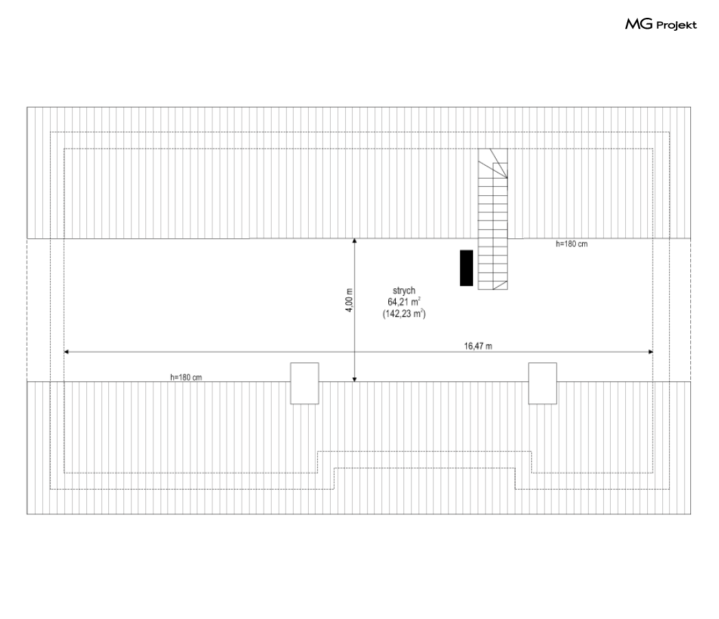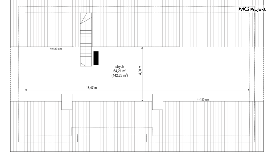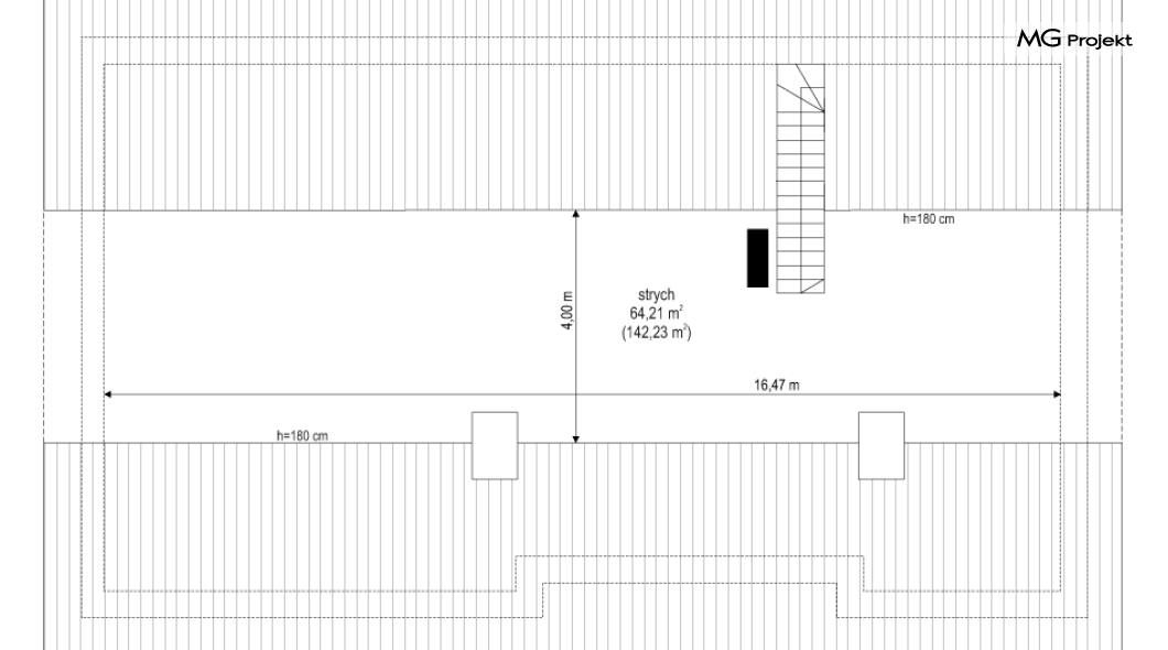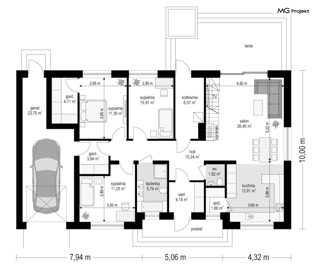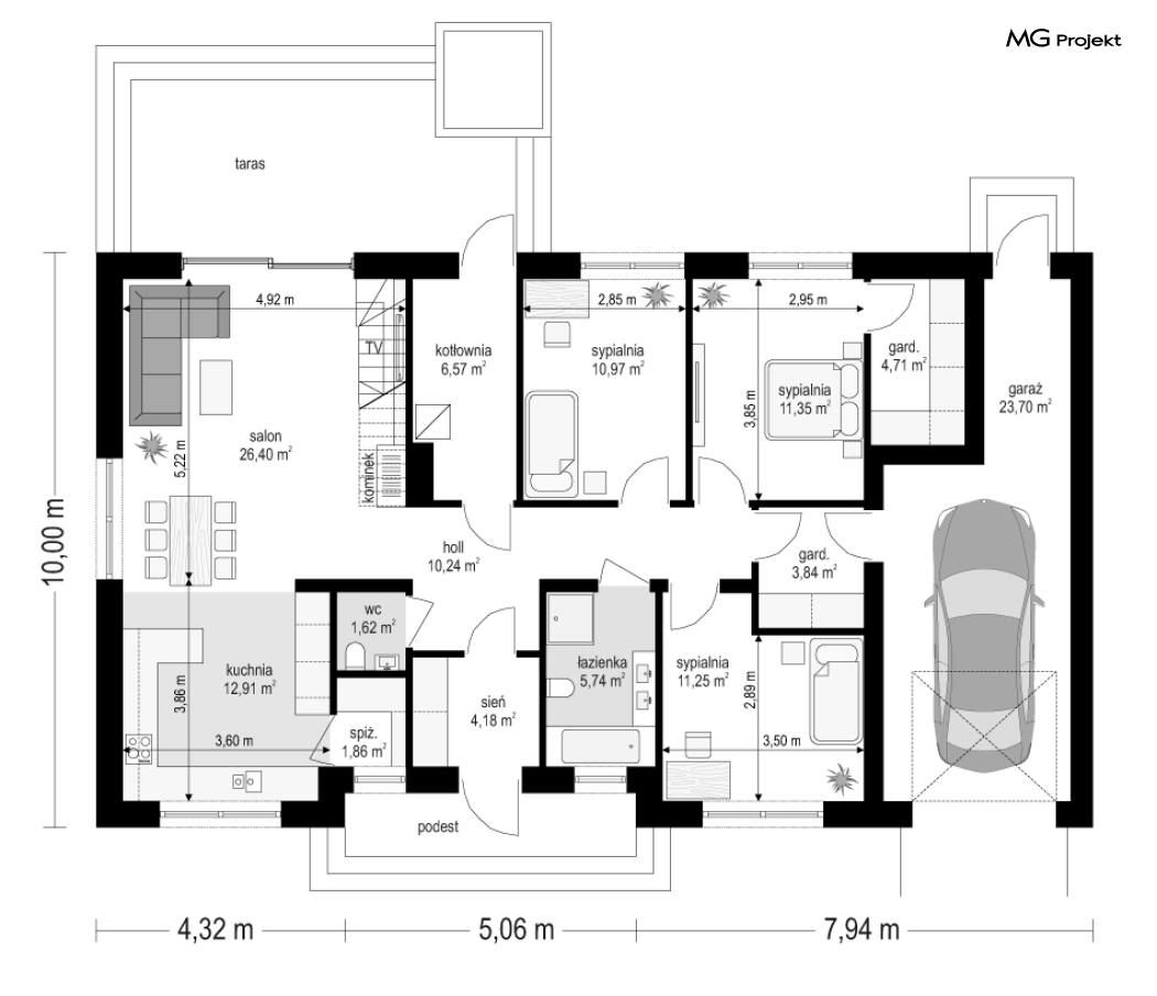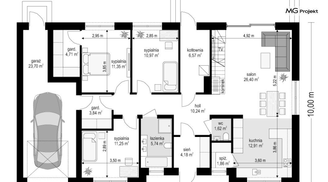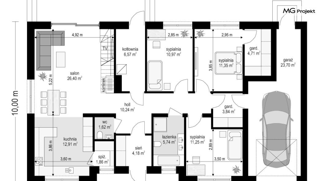 Projekt domu Ekonomiczny 3 jest to projekt niewielkiego parterowego domu jednorodzinnego dla 3-4 osób – jednego z serii domków o tej samej nazwie w ofercie MG Projekt. Ekonomiczny 3 zaprojektowany został na prostokątnym planie i przykryty jest dwuspadowym dachem, kryjącym strych do dowolnego wykorzystania. Jest to wariant z dobudowaną częścią garażową, oraz z podniesionym kątem dachu i większą przestrzenią strychowo – poddaszową w stosunku do pierwotnego projektu z serii. Budynek zawiera w sobie wygodne wnętrze, ze wszystkimi potrzebnymi pomieszczeniami na poziomie parteru, oraz z dodatkową dużą przestrzenią strychu, który w łatwy sposób można adaptować na regularne poddasze użytkowe. Na parterze przewidziano cześć dzienną salonu i kuchni - z półwyspem i spiżarnią, a po drugiej stronie trzy sypialnie, w tym sypialnię master z osobną garderobą, oraz wygodną łazienkę. Dwie części domu rozdzielone są pomieszczeniem kotłowni z wyjściem na zewnątrz, ze wspólnym zespołem kominowym z kominkiem salonu. Dodatkowo do głównej bryły domu dodany jest garaż z przestrzenią gospodarczą, do którego dostajemy się z wnętrza przez śluzę / garderobę. Wejście do domu bardzo urokliwie podkreślono niszą z zadaszonym podcieniem, oraz reprezentacyjnym szerokim podestem. Elewacja frontowa jest symetryczna, a dodany garaż nie zaburza bardzo tego poczucia. Front domu przywołuje swoją symetrią dawną architekturę dworkową, lecz sam styl budynku jest absolutnie współczesny - to mieszanka nowoczesności z ukłonem dla ponadczasowej tradycji. Patrząc na dom, mamy wrażenie porządku, harmonii i solidności. Taka idea przyświecała projektantom : architektura miała być prosta, ale miała mieć w sobie „coś” przyciągającego uwagę. Od strony ogrodowej najważniejszymi elementami są : duże okno przesuwne z salonu, otwierające wnętrze na ogród, oraz taras będący przedłużeniem pokoju dziennego. Staraliśmy się zaprojektować dom maksymalnie logicznie i praktycznie, a zarazem umieścić w nim trochę piękna - takiego, które nie skomplikuje budowy i nie będzie twardym orzechem do zgryzienia dla wykonawców.Konstrukcja budynku jest prosta i niedroga w budowie. Wszystkie prace murarskie i betonowe kończą się na wysokości wieńców nad ścianami parteru. Wyżej mamy układ drewnianych wiązarów dachowych, które są jednocześnie konstrukcją stropu nad parterem jak i więźby dachowej. Taki sposób budowania znacznie upraszcza inwestycję, przyspiesza ją i - co najważniejsze - obniża koszty. W projekcie zastosowano bardzo dobre izolacje i nowoczesne instalacje, dzięki czemu budynek jest energooszczędny i będzie tani w późniejszej eksploatacji. Ekonomiczny 3 to propozycja projektu dla osób podchodzących do budowy pragmatycznie, planujących szybką i bezbolesną budowę, która nie zabierze Inwestorowi połowy życia. Z „Ekonomicznym 3 ” z pewnością się to uda. Zapraszamy !