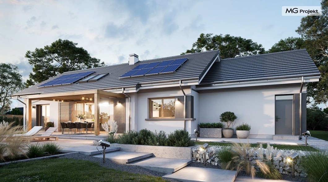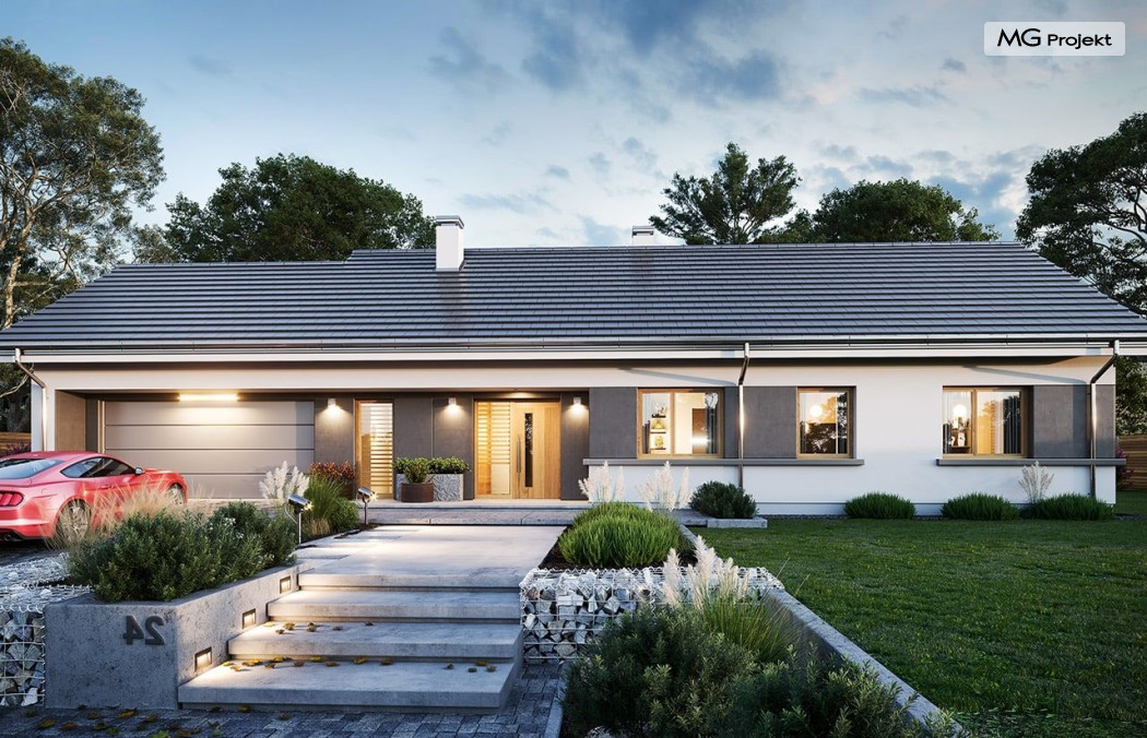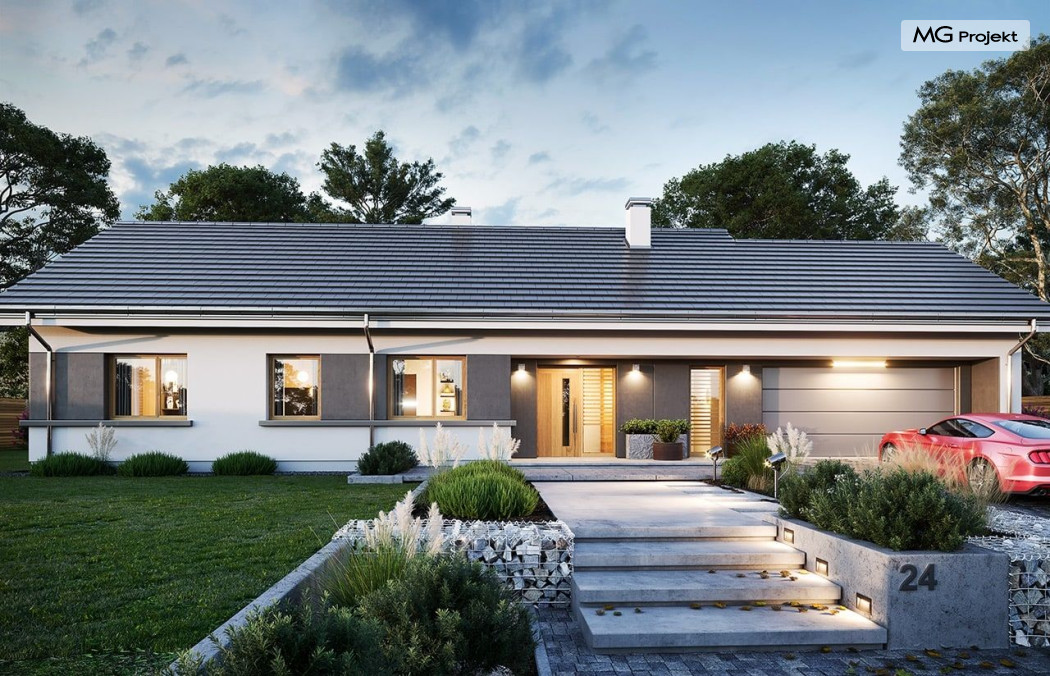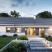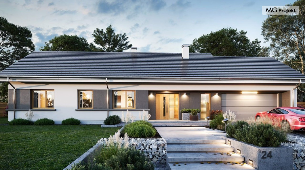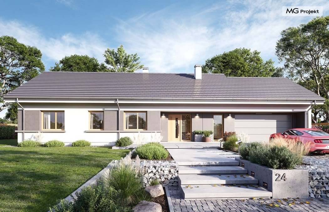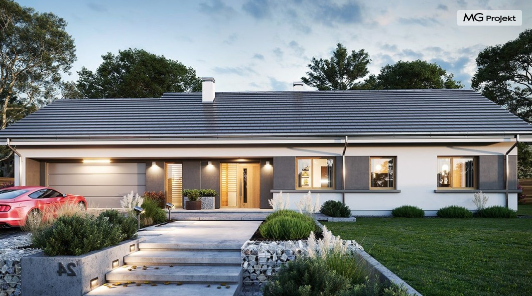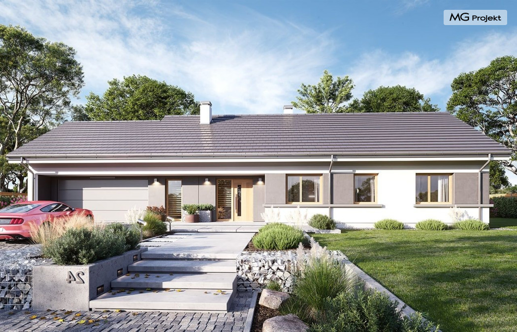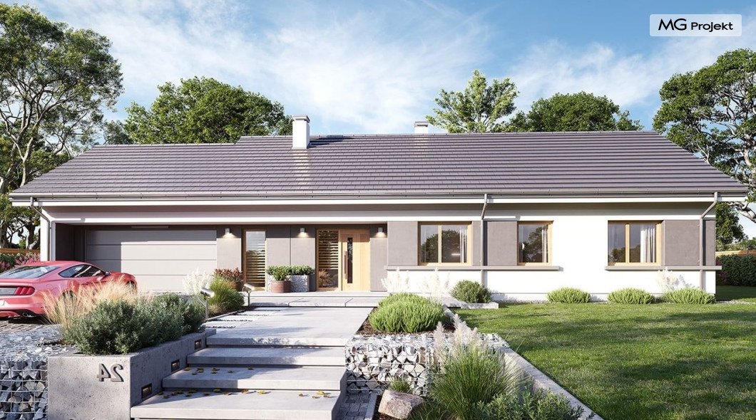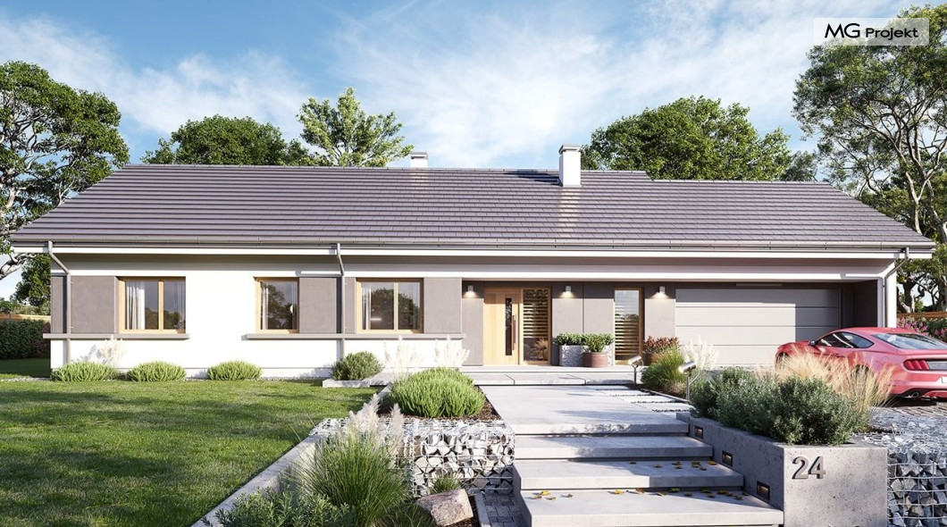 Projekt domu Dom na szerokiej 2 jest to projektu domu jednorodzinnego z serii „Dom na Szerokiej”. Budynek ma parterową bryłę, zbudowaną na planie prostokąta, przykrytą dwuspadowym symetrycznym dachem, o szerokiej – zgodnie z nazwą – elewacji frontowej. Dom przeznaczony jest na płytką działkę, z małą głębokością między drogą a tyłem parceli, lub na działkę z ogrodem z boku domu ( wówczas sytuowany jest bokiem do drogi dojazdowej ). Dom zaprojektowano dla Inwestorów planujących budowę domu parterowego, o maksymalnie szerokim otwarciu części dziennej na taras i ogród, budynku o prostej bryle i rzucie. To typowy parterowy dom w stylu bungalow. Architektura budynku jest powściągliwa i stonowana - łączy w sobie nowoczesne detale i materiały, z tradycyjną sylwetką. Szerokie reprezentacyjne wejście do domu z pięknymi drzwiami wejściowymi z naświetlem, elewacja podzielona ma poziome pasy okien z kontrastującymi wypełnieniami ścian,oraz duży podcień nad wejściem i wjazdem do garażu współtworzą atrakcyjny front domu. Od strony ogrodu zaprojektowano duże przesuwne drzwi z salonu na taras – ogromne przeszklenie powiększające pokój dzienny o ogród, oraz wygodną pergolę nad tarasem, która może być wykończona panelami ze szkła kanalikowego. Detale wykończeniowe domu, materiały i kolory dobrano tak, aby stanowiły harmonijną całość. Wnętrze zaprojektowano dzieląc je na trzy części : część dzienną – z salonem, nocną z sypialniami i gospodarczą – z garażem i kotłownią. Do domu wchodzimy szerokimi drzwiami do obszernego przedsionka z szafami, albo z garażu - do przedsionka lub - przez spiżarnię – bezpośrednio do kuchni. Pokój dzienny połączony z jadalnią, kuchnią i holem stanowią komfortową przestrzeń dla domowników. Otwarcie przestrzenne nad częścią salonu podnoszące wysokość salonu aż do dachu daje dodatkowo wrażenie większej przestrzeni. Cały salon tonie w świetle - dzięki wielkim przesuwnym drzwiom na taras, oraz dodatkowym oknom połaciowymi w suficie. Kuchnia z wyspą, jadalnia i salon zorganizowane są wokół centralnej ściany kominkowo – telewizyjnej oddzielającej salon od korytarza prowadzącego do sypialni. W części nocnej mamy cztery pokoje – trzy sypialnie oraz dodatkowy pokój ( gabinet lub zapasową sypialnię ). Z sypialni rodziców zaprojektowano urokliwe wyjście na taras. Całość domu zamykają bardzo wygodny dwustanowiskowy garaż, oraz strych nad parterem, który można wykorzystać na domowy magazyn - graciarnię, dostępny z parteru za pomocą schodków drabinkowych. Konstrukcja domu jest bardzo prosta : ściany parteru do wysokości wieńca + konstrukcja stropu nad parterem i więźby dachowej w postaci układu prefabrykowanych wiązarów drewnianych. Takie rozwiązanie znacznie przyspiesza budowę, upraszcza ją i obniża koszt realizacji domu. W projekcie zastosowano bardzo dobre izolacje, nowoczesne materiały i instalacje, dzięki czemu budynek będzie tani w późniejszej eksploatacji. Dom na Szerokiej 2 to doskonała propozycja dla Inwestorów chcących budować solidny, komfortowy parterowy dom swoich marzeń. Zapraszamy !