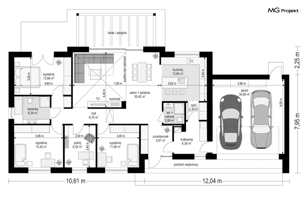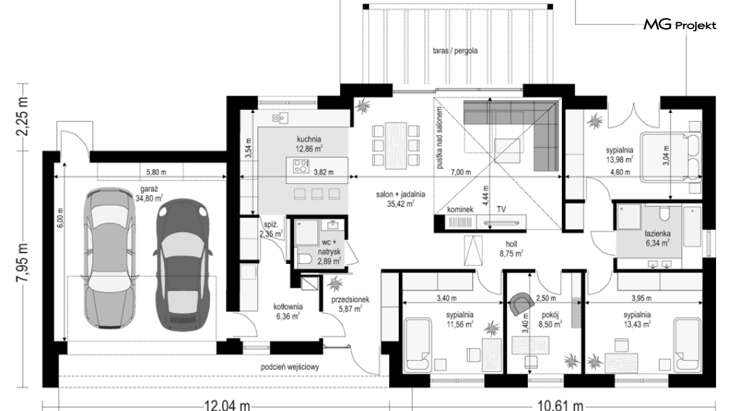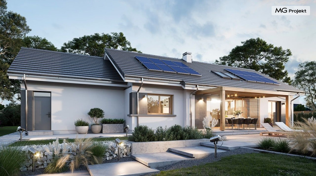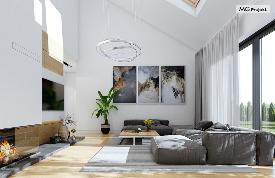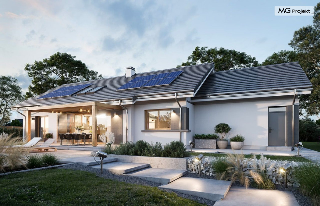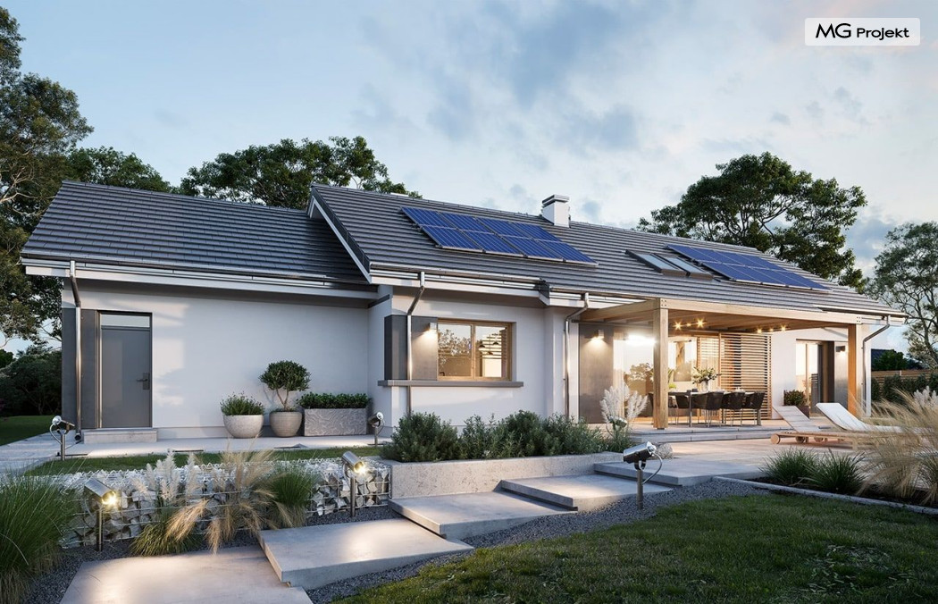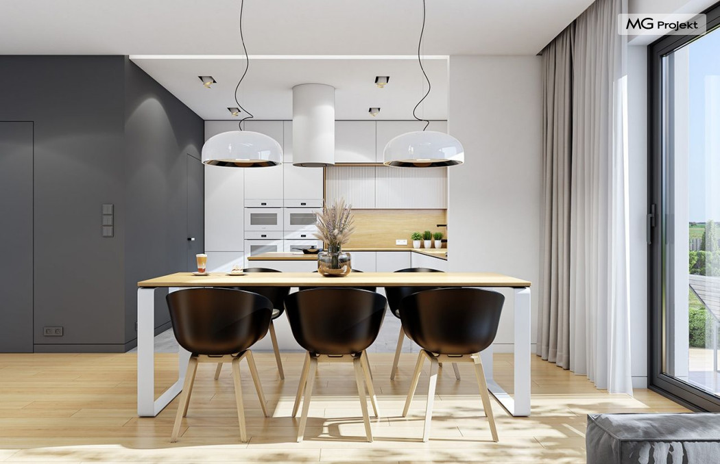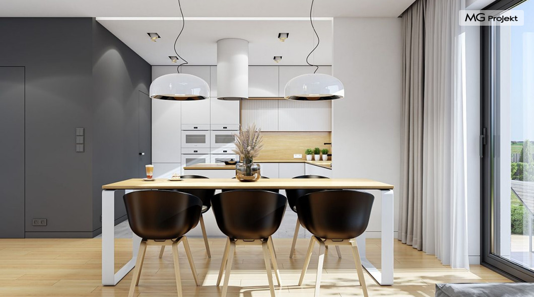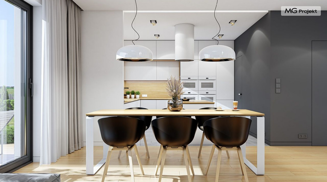 Projekt domu Dom na szerokiej 2 jest to projektu domu jednorodzinnego z serii „Dom na Szerokiej”. Budynek ma parterową bryłę, zbudowaną na planie prostokąta, przykrytą dwuspadowym symetrycznym dachem, o szerokiej – zgodnie z nazwą – elewacji frontowej. Dom przeznaczony jest na płytką działkę, z małą głębokością między drogą a tyłem parceli, lub na działkę z ogrodem z boku domu ( wówczas sytuowany jest bokiem do drogi dojazdowej ). Dom zaprojektowano dla Inwestorów planujących budowę domu parterowego, o maksymalnie szerokim otwarciu części dziennej na taras i ogród, budynku o prostej bryle i rzucie. To typowy parterowy dom w stylu bungalow. Architektura budynku jest powściągliwa i stonowana - łączy w sobie nowoczesne detale i materiały, z tradycyjną sylwetką. Szerokie reprezentacyjne wejście do domu z pięknymi drzwiami wejściowymi z naświetlem, elewacja podzielona ma poziome pasy okien z kontrastującymi wypełnieniami ścian,oraz duży podcień nad wejściem i wjazdem do garażu współtworzą atrakcyjny front domu. Od strony ogrodu zaprojektowano duże przesuwne drzwi z salonu na taras – ogromne przeszklenie powiększające pokój dzienny o ogród, oraz wygodną pergolę nad tarasem, która może być wykończona panelami ze szkła kanalikowego. Detale wykończeniowe domu, materiały i kolory dobrano tak, aby stanowiły harmonijną całość. Wnętrze zaprojektowano dzieląc je na trzy części : część dzienną – z salonem, nocną z sypialniami i gospodarczą – z garażem i kotłownią. Do domu wchodzimy szerokimi drzwiami do obszernego przedsionka z szafami, albo z garażu - do przedsionka lub - przez spiżarnię – bezpośrednio do kuchni. Pokój dzienny połączony z jadalnią, kuchnią i holem stanowią komfortową przestrzeń dla domowników. Otwarcie przestrzenne nad częścią salonu podnoszące wysokość salonu aż do dachu daje dodatkowo wrażenie większej przestrzeni. Cały salon tonie w świetle - dzięki wielkim przesuwnym drzwiom na taras, oraz dodatkowym oknom połaciowymi w suficie. Kuchnia z wyspą, jadalnia i salon zorganizowane są wokół centralnej ściany kominkowo – telewizyjnej oddzielającej salon od korytarza prowadzącego do sypialni. W części nocnej mamy cztery pokoje – trzy sypialnie oraz dodatkowy pokój ( gabinet lub zapasową sypialnię ). Z sypialni rodziców zaprojektowano urokliwe wyjście na taras. Całość domu zamykają bardzo wygodny dwustanowiskowy garaż, oraz strych nad parterem, który można wykorzystać na domowy magazyn - graciarnię, dostępny z parteru za pomocą schodków drabinkowych. Konstrukcja domu jest bardzo prosta : ściany parteru do wysokości wieńca + konstrukcja stropu nad parterem i więźby dachowej w postaci układu prefabrykowanych wiązarów drewnianych. Takie rozwiązanie znacznie przyspiesza budowę, upraszcza ją i obniża koszt realizacji domu. W projekcie zastosowano bardzo dobre izolacje, nowoczesne materiały i instalacje, dzięki czemu budynek będzie tani w późniejszej eksploatacji. Dom na Szerokiej 2 to doskonała propozycja dla Inwestorów chcących budować solidny, komfortowy parterowy dom swoich marzeń. Zapraszamy !