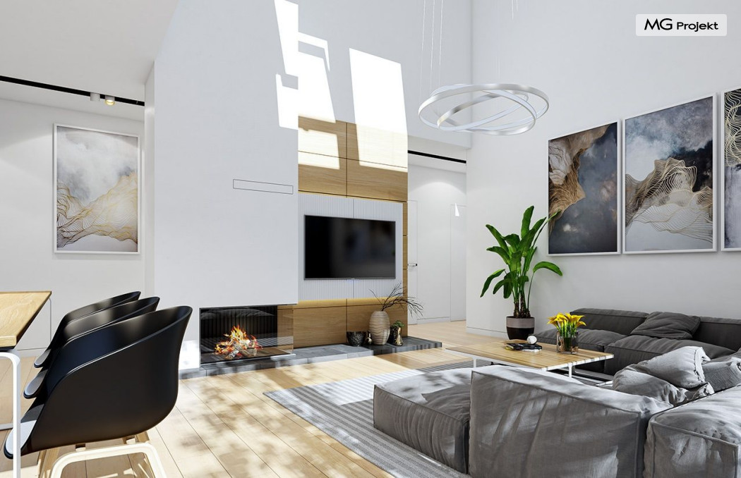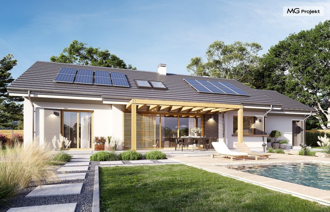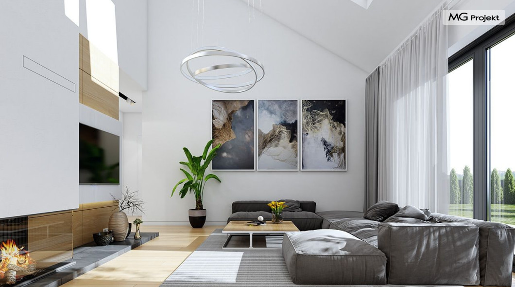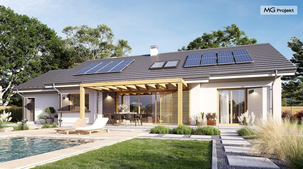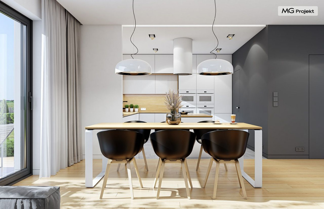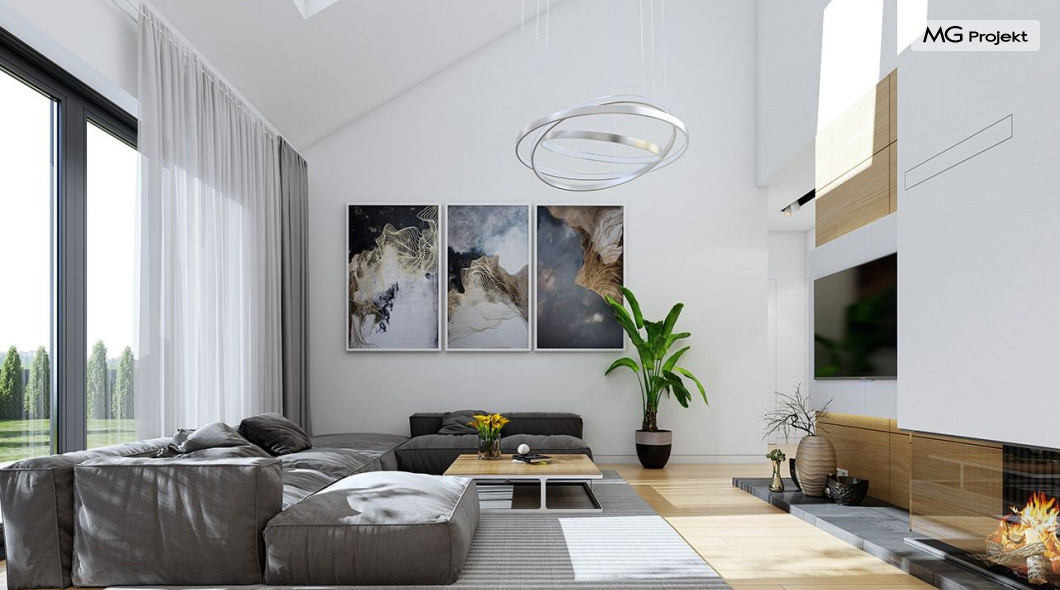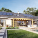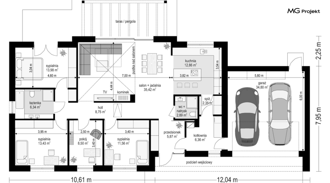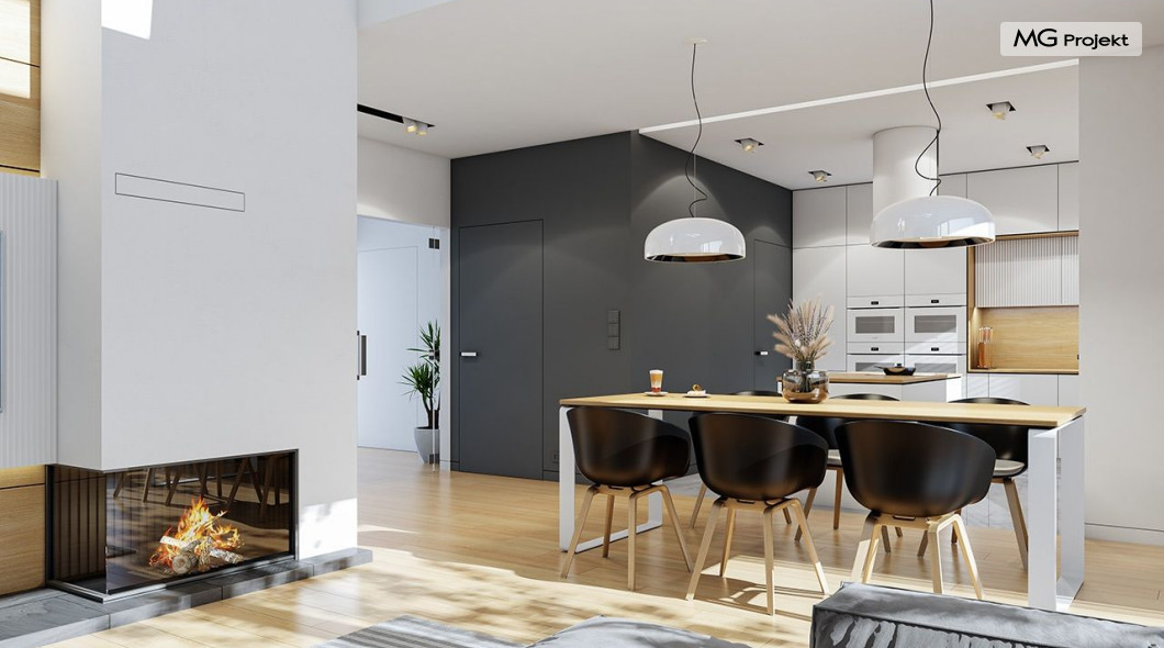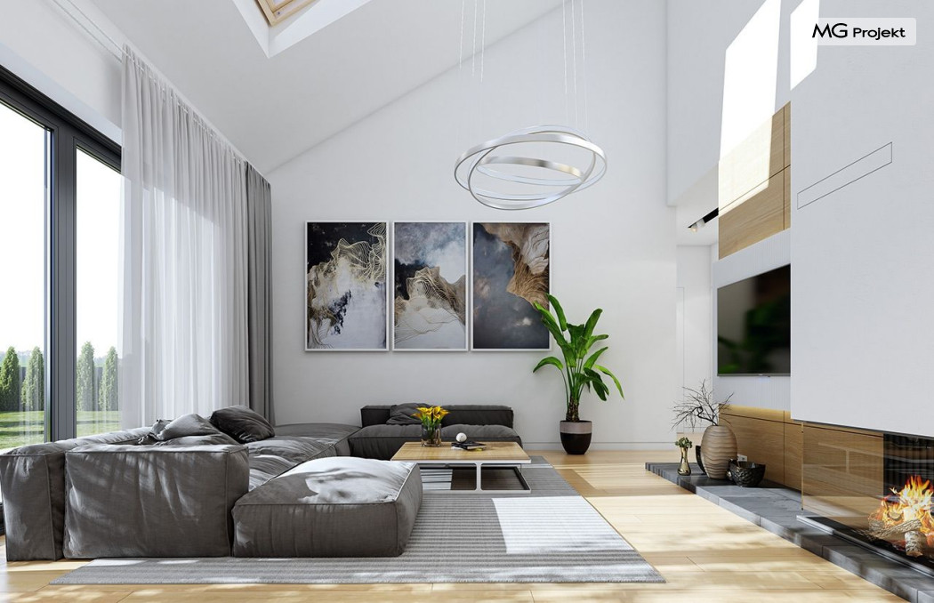Projekt domu Dom na szerokiej 2 jest to projektu domu jednorodzinnego z serii „Dom na Szerokiej”. Budynek ma parterową bryłę, zbudowaną na planie prostokąta, przykrytą dwuspadowym symetrycznym dachem, o szerokiej – zgodnie z nazwą – elewacji frontowej. Dom przeznaczony jest na płytką działkę, z małą głębokością między drogą a tyłem parceli, lub na działkę z ogrodem z boku domu ( wówczas sytuowany jest bokiem do drogi dojazdowej ). Dom zaprojektowano dla Inwestorów planujących budowę domu parterowego, o maksymalnie szerokim otwarciu części dziennej na taras i ogród, budynku o prostej bryle i rzucie. To typowy parterowy dom w stylu bungalow. Architektura budynku jest powściągliwa i stonowana - łączy w sobie nowoczesne detale i materiały, z tradycyjną sylwetką. Szerokie reprezentacyjne wejście do domu z pięknymi drzwiami wejściowymi z naświetlem, elewacja podzielona ma poziome pasy okien z kontrastującymi wypełnieniami ścian,oraz duży podcień nad wejściem i wjazdem do garażu współtworzą atrakcyjny front domu. Od strony ogrodu zaprojektowano duże przesuwne drzwi z salonu na taras – ogromne przeszklenie powiększające pokój dzienny o ogród, oraz wygodną pergolę nad tarasem, która może być wykończona panelami ze szkła kanalikowego. Detale wykończeniowe domu, materiały i kolory dobrano tak, aby stanowiły harmonijną całość. Wnętrze zaprojektowano dzieląc je na trzy części : część dzienną – z salonem, nocną z sypialniami i gospodarczą – z garażem i kotłownią. Do domu wchodzimy szerokimi drzwiami do obszernego przedsionka z szafami, albo z garażu - do przedsionka lub - przez spiżarnię – bezpośrednio do kuchni. Pokój dzienny połączony z jadalnią, kuchnią i holem stanowią komfortową przestrzeń dla domowników. Otwarcie przestrzenne nad częścią salonu podnoszące wysokość salonu aż do dachu daje dodatkowo wrażenie większej przestrzeni. Cały salon tonie w świetle - dzięki wielkim przesuwnym drzwiom na taras, oraz dodatkowym oknom połaciowymi w suficie. Kuchnia z wyspą, jadalnia i salon zorganizowane są wokół centralnej ściany kominkowo – telewizyjnej oddzielającej salon od korytarza prowadzącego do sypialni. W części nocnej mamy cztery pokoje – trzy sypialnie oraz dodatkowy pokój ( gabinet lub zapasową sypialnię ). Z sypialni rodziców zaprojektowano urokliwe wyjście na taras. Całość domu zamykają bardzo wygodny dwustanowiskowy garaż, oraz strych nad parterem, który można wykorzystać na domowy magazyn - graciarnię, dostępny z parteru za pomocą schodków drabinkowych. Konstrukcja domu jest bardzo prosta : ściany parteru do wysokości wieńca + konstrukcja stropu nad parterem i więźby dachowej w postaci układu prefabrykowanych wiązarów drewnianych. Takie rozwiązanie znacznie przyspiesza budowę, upraszcza ją i obniża koszt realizacji domu. W projekcie zastosowano bardzo dobre izolacje, nowoczesne materiały i instalacje, dzięki czemu budynek będzie tani w późniejszej eksploatacji. Dom na Szerokiej 2 to doskonała propozycja dla Inwestorów chcących budować solidny, komfortowy parterowy dom swoich marzeń. Zapraszamy !