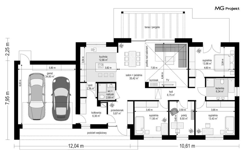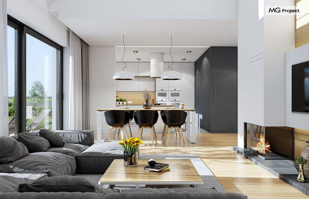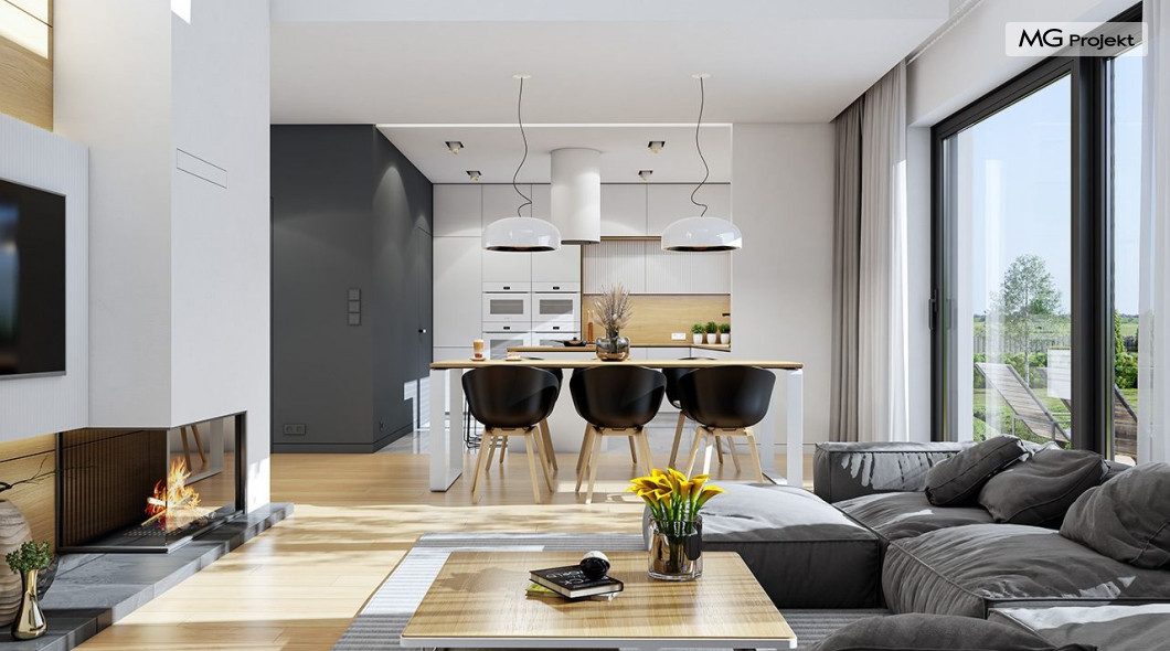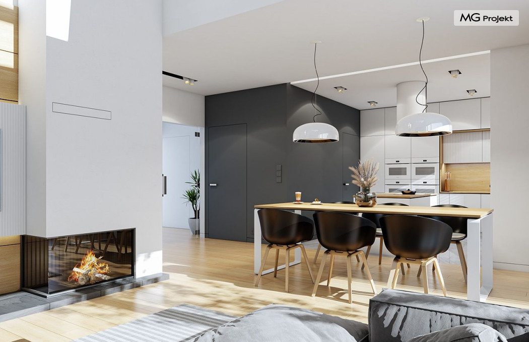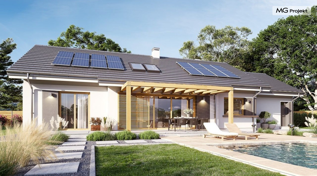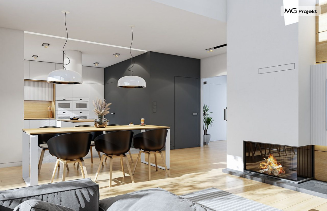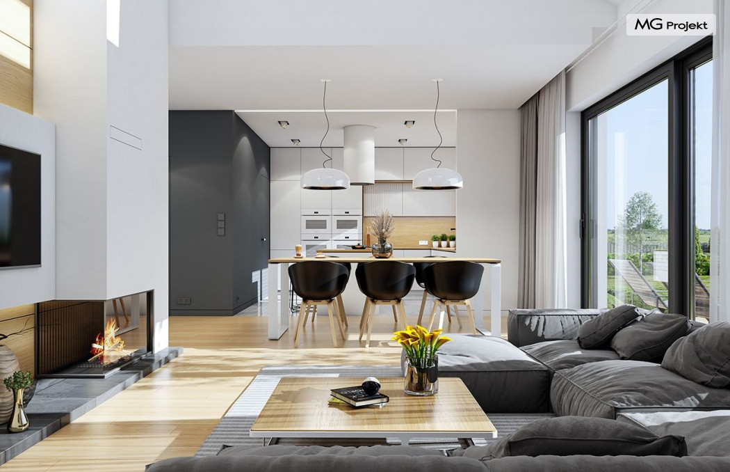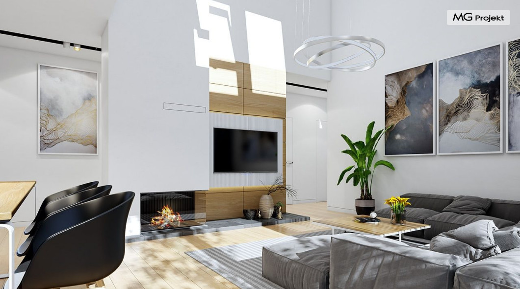Projekt domu Dom na szerokiej 2 jest to projektu domu jednorodzinnego z serii „Dom na Szerokiej”. Budynek ma parterową bryłę, zbudowaną na planie prostokąta, przykrytą dwuspadowym symetrycznym dachem, o szerokiej – zgodnie z nazwą – elewacji frontowej. Dom przeznaczony jest na płytką działkę, z małą głębokością między drogą a tyłem parceli, lub na działkę z ogrodem z boku domu ( wówczas sytuowany jest bokiem do drogi dojazdowej ). Dom zaprojektowano dla Inwestorów planujących budowę domu parterowego, o maksymalnie szerokim otwarciu części dziennej na taras i ogród, budynku o prostej bryle i rzucie. To typowy parterowy dom w stylu bungalow. Architektura budynku jest powściągliwa i stonowana - łączy w sobie nowoczesne detale i materiały, z tradycyjną sylwetką. Szerokie reprezentacyjne wejście do domu z pięknymi drzwiami wejściowymi z naświetlem, elewacja podzielona ma poziome pasy okien z kontrastującymi wypełnieniami ścian,oraz duży podcień nad wejściem i wjazdem do garażu współtworzą atrakcyjny front domu. Od strony ogrodu zaprojektowano duże przesuwne drzwi z salonu na taras – ogromne przeszklenie powiększające pokój dzienny o ogród, oraz wygodną pergolę nad tarasem, która może być wykończona panelami ze szkła kanalikowego. Detale wykończeniowe domu, materiały i kolory dobrano tak, aby stanowiły harmonijną całość. Wnętrze zaprojektowano dzieląc je na trzy części : część dzienną – z salonem, nocną z sypialniami i gospodarczą – z garażem i kotłownią. Do domu wchodzimy szerokimi drzwiami do obszernego przedsionka z szafami, albo z garażu - do przedsionka lub - przez spiżarnię – bezpośrednio do kuchni. Pokój dzienny połączony z jadalnią, kuchnią i holem stanowią komfortową przestrzeń dla domowników. Otwarcie przestrzenne nad częścią salonu podnoszące wysokość salonu aż do dachu daje dodatkowo wrażenie większej przestrzeni. Cały salon tonie w świetle - dzięki wielkim przesuwnym drzwiom na taras, oraz dodatkowym oknom połaciowymi w suficie. Kuchnia z wyspą, jadalnia i salon zorganizowane są wokół centralnej ściany kominkowo – telewizyjnej oddzielającej salon od korytarza prowadzącego do sypialni. W części nocnej mamy cztery pokoje – trzy sypialnie oraz dodatkowy pokój ( gabinet lub zapasową sypialnię ). Z sypialni rodziców zaprojektowano urokliwe wyjście na taras. Całość domu zamykają bardzo wygodny dwustanowiskowy garaż, oraz strych nad parterem, który można wykorzystać na domowy magazyn - graciarnię, dostępny z parteru za pomocą schodków drabinkowych. Konstrukcja domu jest bardzo prosta : ściany parteru do wysokości wieńca + konstrukcja stropu nad parterem i więźby dachowej w postaci układu prefabrykowanych wiązarów drewnianych. Takie rozwiązanie znacznie przyspiesza budowę, upraszcza ją i obniża koszt realizacji domu. W projekcie zastosowano bardzo dobre izolacje, nowoczesne materiały i instalacje, dzięki czemu budynek będzie tani w późniejszej eksploatacji. Dom na Szerokiej 2 to doskonała propozycja dla Inwestorów chcących budować solidny, komfortowy parterowy dom swoich marzeń. Zapraszamy !