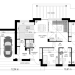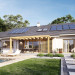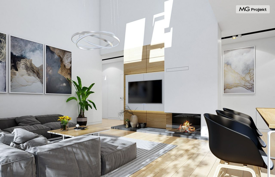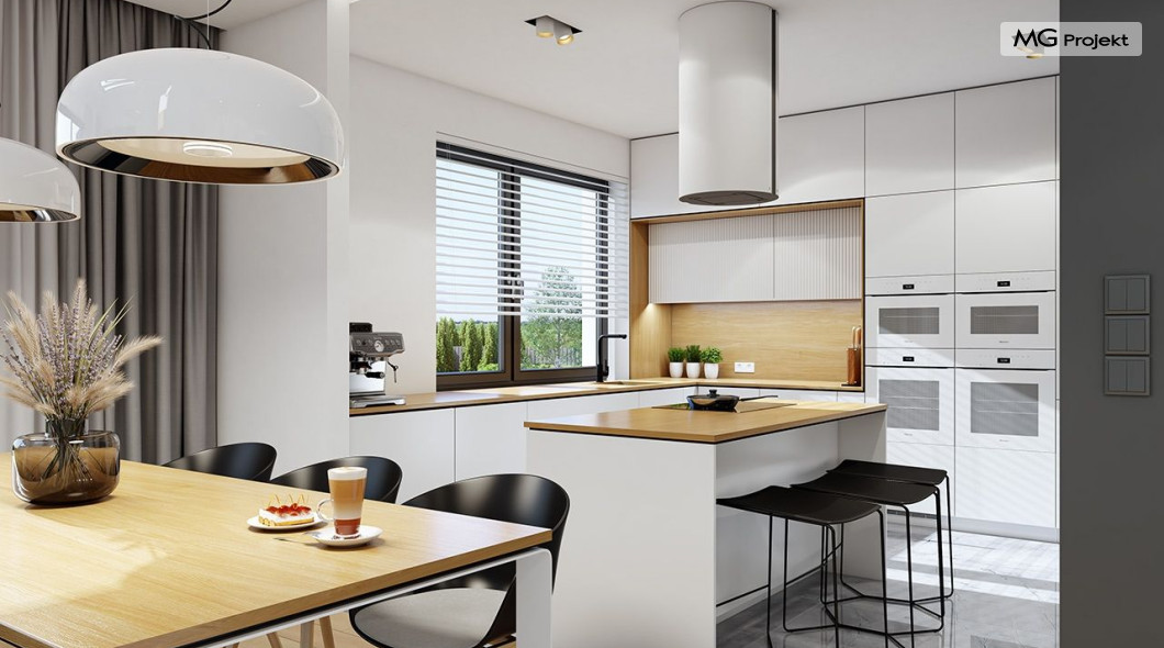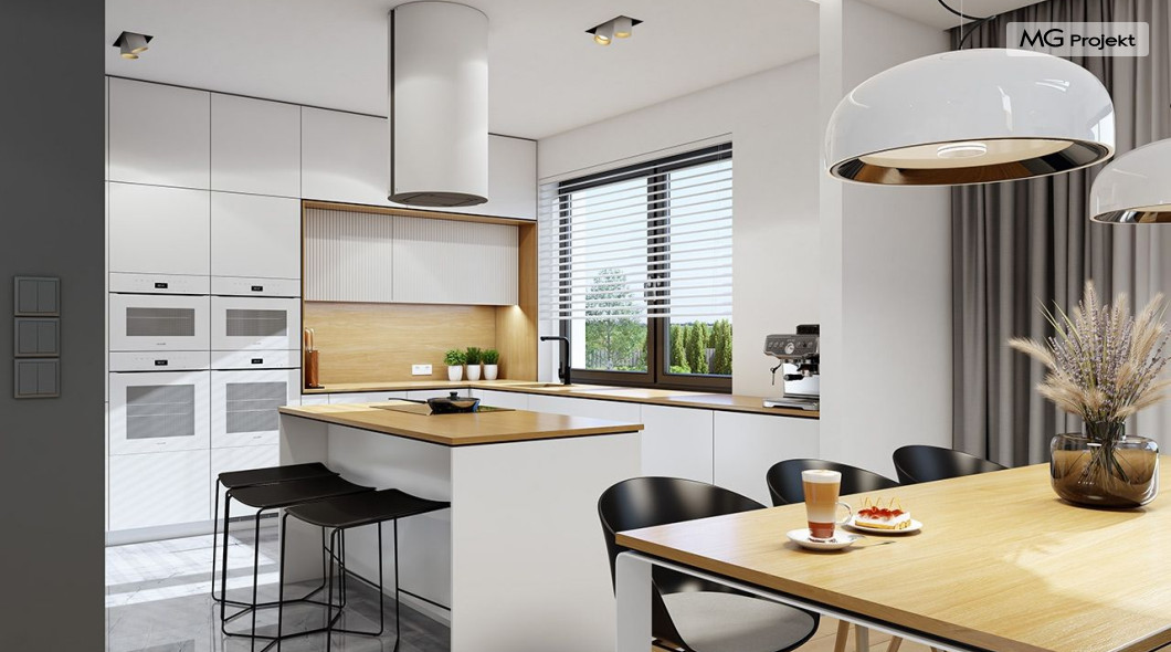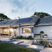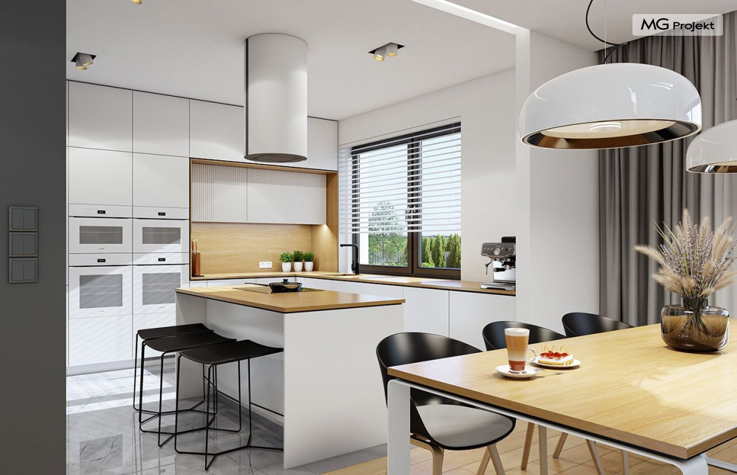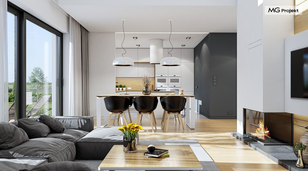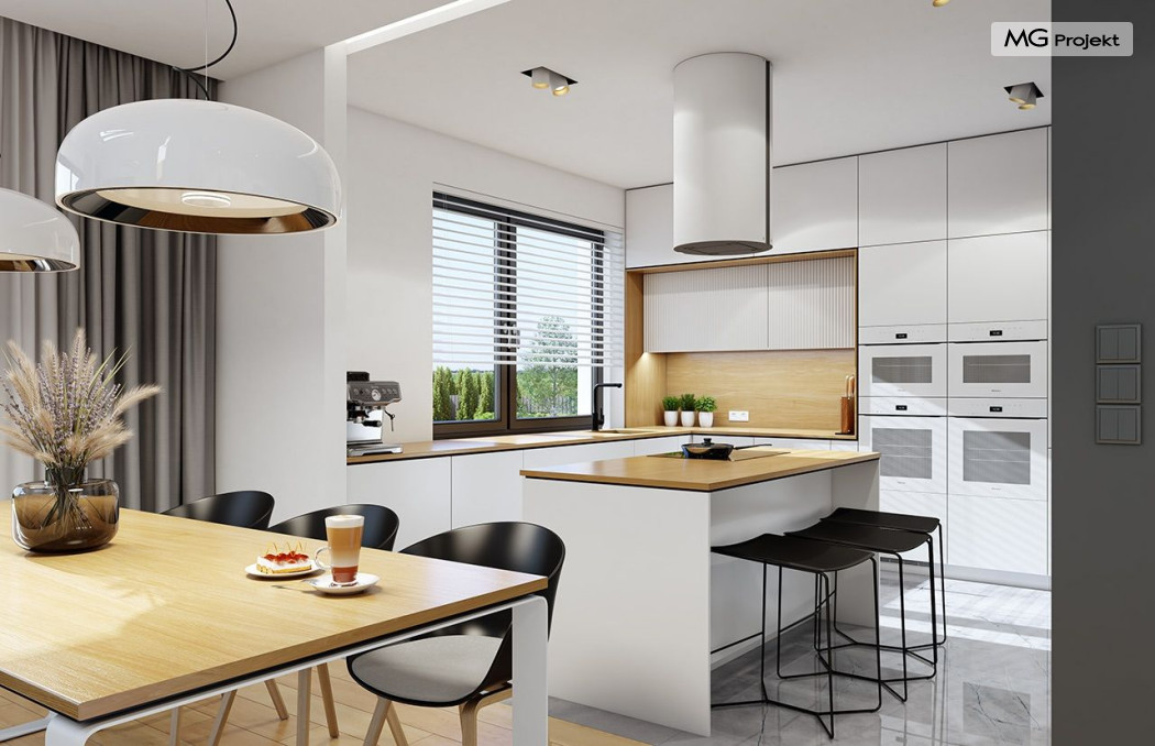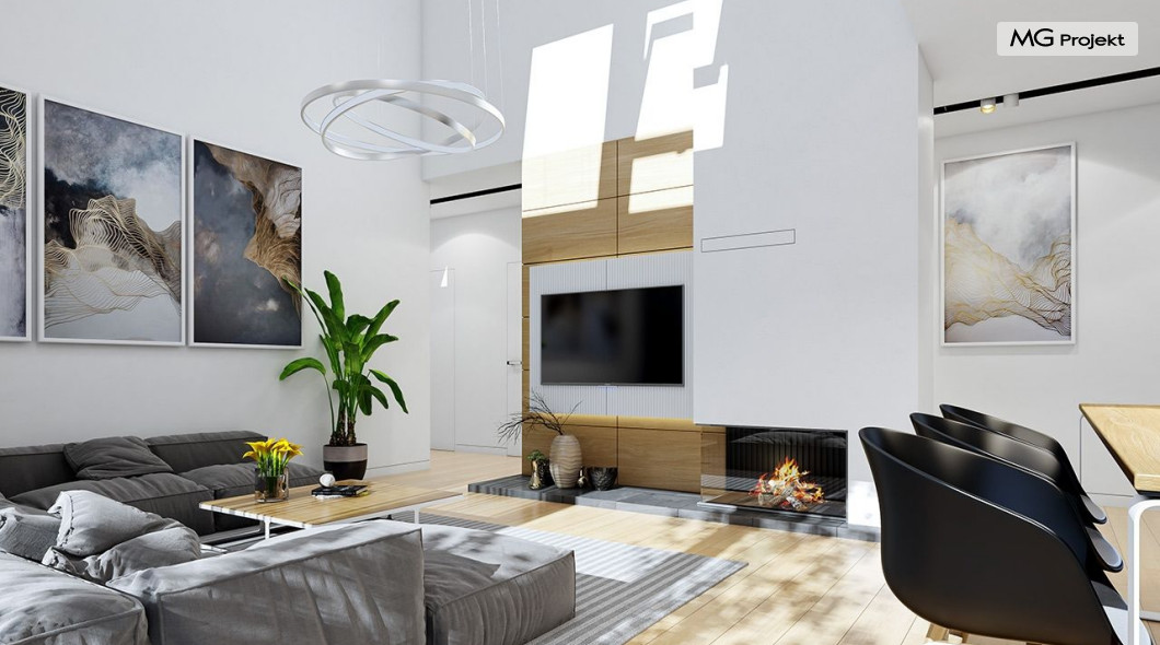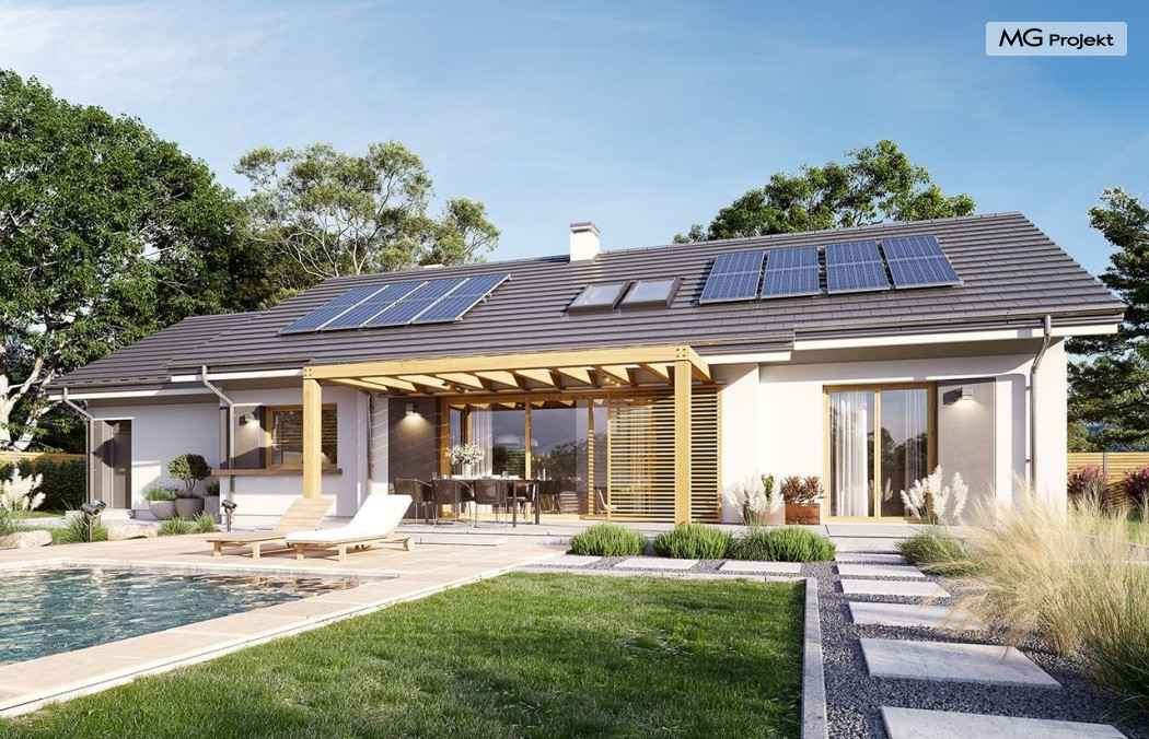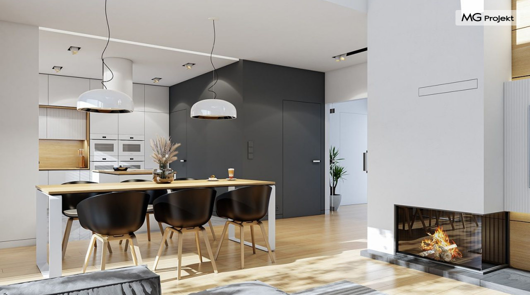 Projekt domu Dom na szerokiej 2 jest to projektu domu jednorodzinnego z serii „Dom na Szerokiej”. Budynek ma parterową bryłę, zbudowaną na planie prostokąta, przykrytą dwuspadowym symetrycznym dachem, o szerokiej – zgodnie z nazwą – elewacji frontowej. Dom przeznaczony jest na płytką działkę, z małą głębokością między drogą a tyłem parceli, lub na działkę z ogrodem z boku domu ( wówczas sytuowany jest bokiem do drogi dojazdowej ). Dom zaprojektowano dla Inwestorów planujących budowę domu parterowego, o maksymalnie szerokim otwarciu części dziennej na taras i ogród, budynku o prostej bryle i rzucie. To typowy parterowy dom w stylu bungalow. Architektura budynku jest powściągliwa i stonowana - łączy w sobie nowoczesne detale i materiały, z tradycyjną sylwetką. Szerokie reprezentacyjne wejście do domu z pięknymi drzwiami wejściowymi z naświetlem, elewacja podzielona ma poziome pasy okien z kontrastującymi wypełnieniami ścian,oraz duży podcień nad wejściem i wjazdem do garażu współtworzą atrakcyjny front domu. Od strony ogrodu zaprojektowano duże przesuwne drzwi z salonu na taras – ogromne przeszklenie powiększające pokój dzienny o ogród, oraz wygodną pergolę nad tarasem, która może być wykończona panelami ze szkła kanalikowego. Detale wykończeniowe domu, materiały i kolory dobrano tak, aby stanowiły harmonijną całość. Wnętrze zaprojektowano dzieląc je na trzy części : część dzienną – z salonem, nocną z sypialniami i gospodarczą – z garażem i kotłownią. Do domu wchodzimy szerokimi drzwiami do obszernego przedsionka z szafami, albo z garażu - do przedsionka lub - przez spiżarnię – bezpośrednio do kuchni. Pokój dzienny połączony z jadalnią, kuchnią i holem stanowią komfortową przestrzeń dla domowników. Otwarcie przestrzenne nad częścią salonu podnoszące wysokość salonu aż do dachu daje dodatkowo wrażenie większej przestrzeni. Cały salon tonie w świetle - dzięki wielkim przesuwnym drzwiom na taras, oraz dodatkowym oknom połaciowymi w suficie. Kuchnia z wyspą, jadalnia i salon zorganizowane są wokół centralnej ściany kominkowo – telewizyjnej oddzielającej salon od korytarza prowadzącego do sypialni. W części nocnej mamy cztery pokoje – trzy sypialnie oraz dodatkowy pokój ( gabinet lub zapasową sypialnię ). Z sypialni rodziców zaprojektowano urokliwe wyjście na taras. Całość domu zamykają bardzo wygodny dwustanowiskowy garaż, oraz strych nad parterem, który można wykorzystać na domowy magazyn - graciarnię, dostępny z parteru za pomocą schodków drabinkowych. Konstrukcja domu jest bardzo prosta : ściany parteru do wysokości wieńca + konstrukcja stropu nad parterem i więźby dachowej w postaci układu prefabrykowanych wiązarów drewnianych. Takie rozwiązanie znacznie przyspiesza budowę, upraszcza ją i obniża koszt realizacji domu. W projekcie zastosowano bardzo dobre izolacje, nowoczesne materiały i instalacje, dzięki czemu budynek będzie tani w późniejszej eksploatacji. Dom na Szerokiej 2 to doskonała propozycja dla Inwestorów chcących budować solidny, komfortowy parterowy dom swoich marzeń. Zapraszamy !