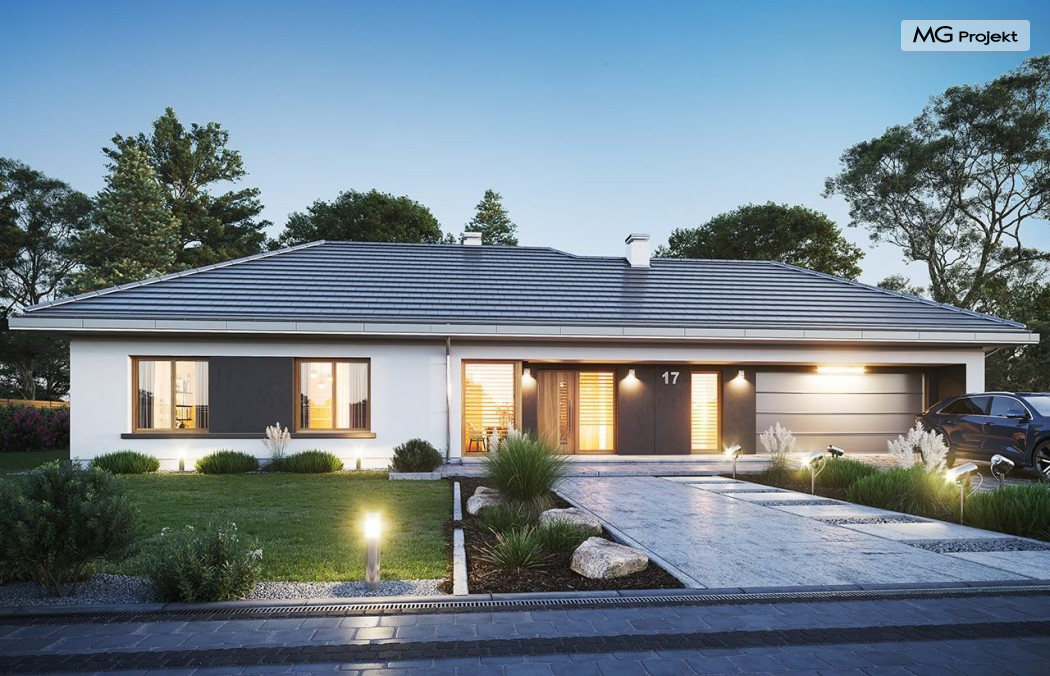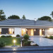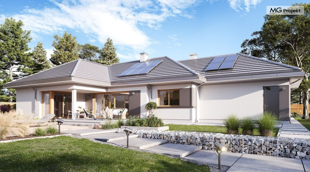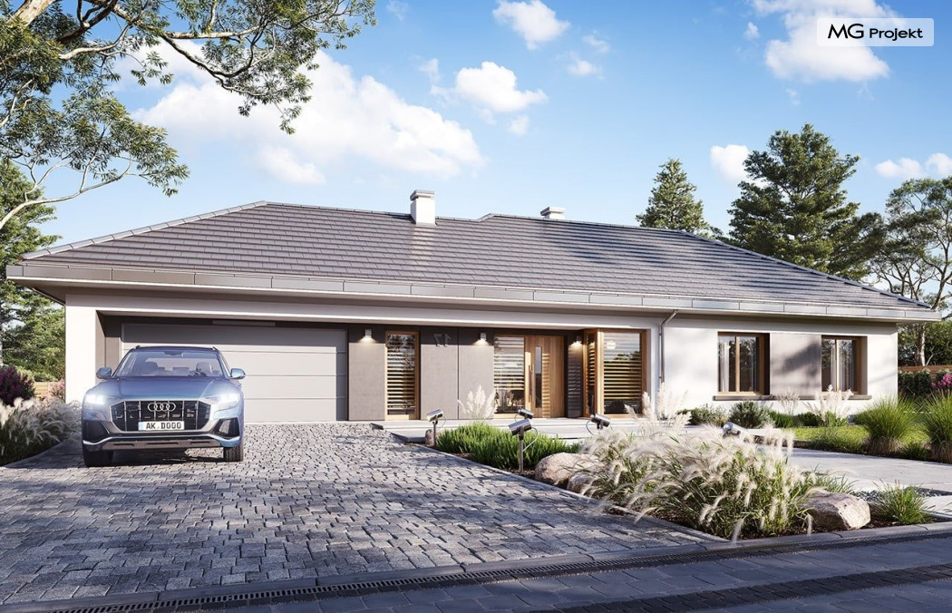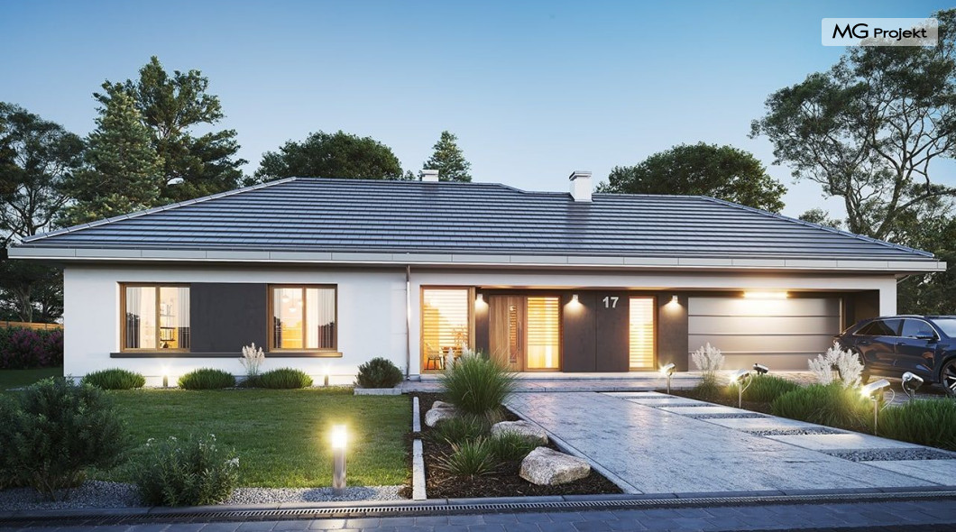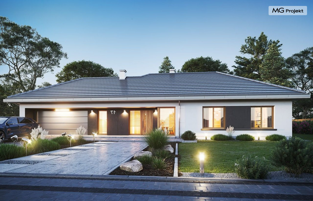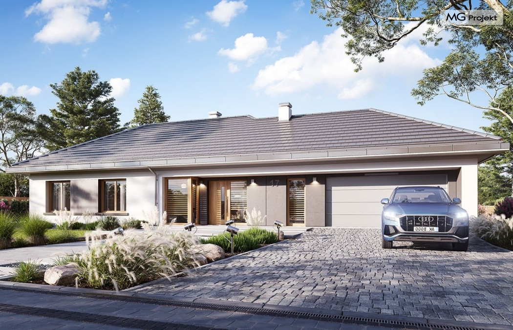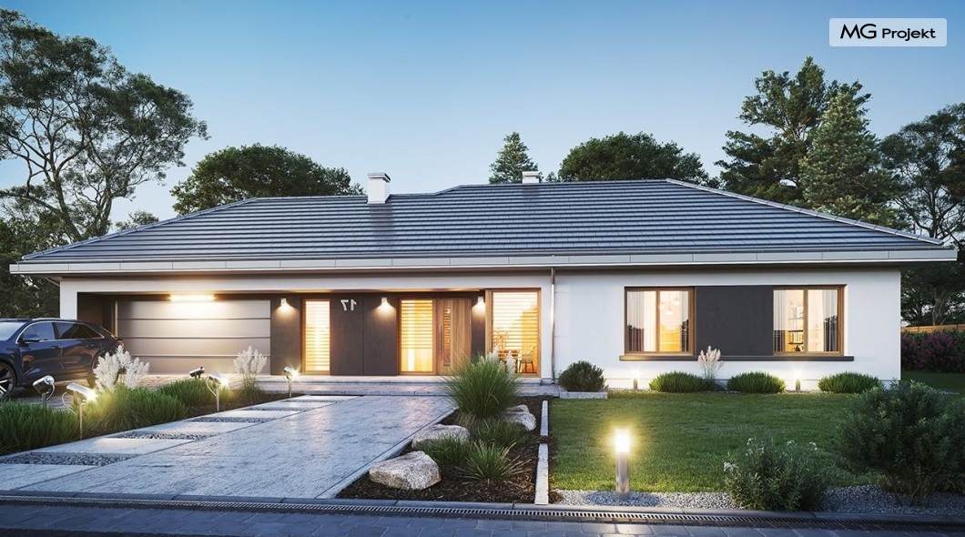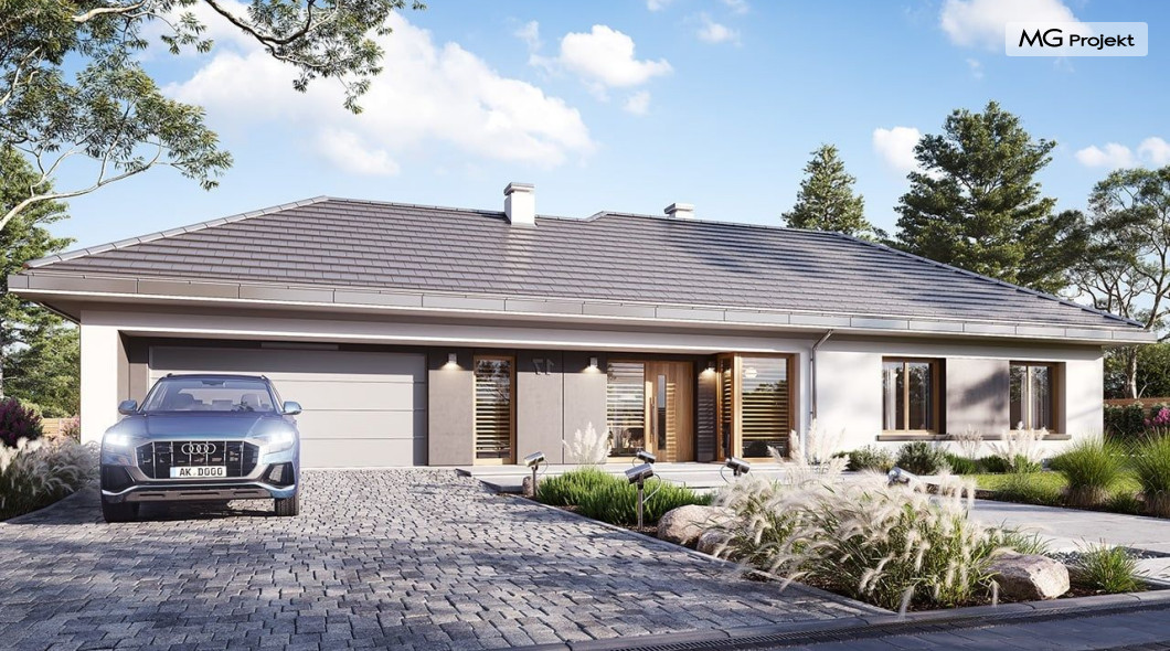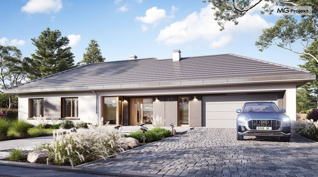 Projekt domu Dom na szerokiej 3 jest to projektu domu jednorodzinnego z serii „Dom na Szerokiej”. Budynek zaprojektowano jako urozmaiconą wersję wariantową projektów z tej serii, z tylną fasadą ogrodową w układzie litery L dającej poczucie przytulności i intymności na tarasie. Dom ma prostokątną podłużną bryłę, przykrytą czterospadowym dachem z dobudówkami. Bryła domu zbudowana jest na planie L, z szerszym ramieniem w elewacji frontowej.Budynek przeznaczony jest na płytką działkę, z niewielką głębokością między drogą a tyłem parceli, lub na działkę z ogrodem z boku domu ( wówczas sytuowany jest bokiem do drogi dojazdowej ). To typowy parterowy dom w stylu bungalow. Architektura budynku jest ciekawa, ale też stonowana - łączy w sobie nowoczesne detale i materiały, z tradycyjną sylwetką parterówki przykrytej wielospadowym dachem pokrytym dachówką. Szerokie reprezentacyjne wejście do domu z pięknymi drzwiami wejściowymi z naświetlem, Piękne narożne szklane okno pokoju- gabinetu, oraz duży podcień nad wejściem i wjazdem do garażu współtworzą atrakcyjny front domu. Od strony elewacji ogrodowej zaprojektowano duże przeszklenia z salonu i sypialni rodziców na taras i wygodny podcień. Detale wykończeniowe, materiały i kolory dobrano tak, aby stanowiły harmonijną całość. Wnętrze zaprojektowano dzieląc je na trzy części : część dzienną – z salonem, nocną z sypialniami i gospodarczą – z garażem i kotłownią. Do domu wchodzimy szerokimi drzwiami do obszernego przedsionka z szafami, albo z garażu - do przedsionka lub - przez spiżarnię – bezpośrednio do kuchni. Pokój dzienny połączony z jadalnią, kuchnią i holem stanowią komfortową przestrzeń dla domowników. Otwarcie przestrzenne nad częścią salonu podnoszące wysokość salonu aż do dachu powiększa dodatkowo wnętrze. Kuchnia z wyspą, jadalnia i salon zorganizowane są wokół centralnej ściany kominkowo – telewizyjnej oddzielającej salon od korytarza prowadzącego do sypialni. W części nocnej mamy cztery pokoje – trzy sypialnie oraz dodatkowy pokój ( gabinet lub zapasową sypialnię ). Do dyspozycji domowników są dwie łazienki. Sypialnia rodziców ma dwie duże ściany w zabudowie szafowej, oraz garderobę. Z sypialni master zaprojektowano wyjście na taras narożnym oknem balkonowym. Całość domu zamykają wygodny dwustanowiskowy garaż, oraz strych nad parterem, do wykorzystania na domowy magazyn - graciarnię, dostępny z parteru za pomocą schodków drabinkowych. Konstrukcja domu jest bardzo prosta : ściany parteru do wysokości wieńca + konstrukcja stropu nad parterem i więźby dachowej w postaci układu prefabrykowanych wiązarów drewnianych. Takie rozwiązanie znacznie przyspiesza budowę, upraszcza ją i obniża koszt realizacji domu. W projekcie zastosowano bardzo dobre izolacje, nowoczesne materiały i instalacje, dzięki czemu budynek będzie tani w późniejszej eksploatacji. Dom na Szerokiej 3 to świetna propozycja dla Inwestorów pragnących nowoczesnego, komfortowego parterowego domu o ciekawej urozmaiconej architekturze. Zapraszamy !