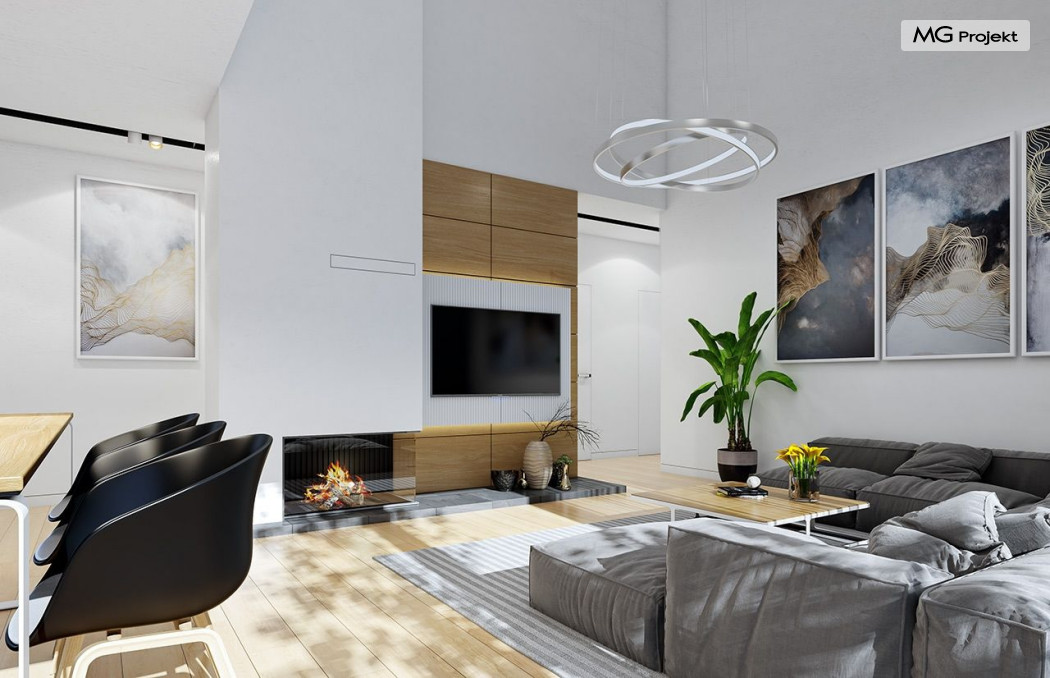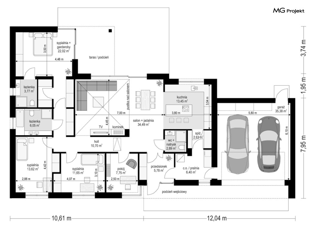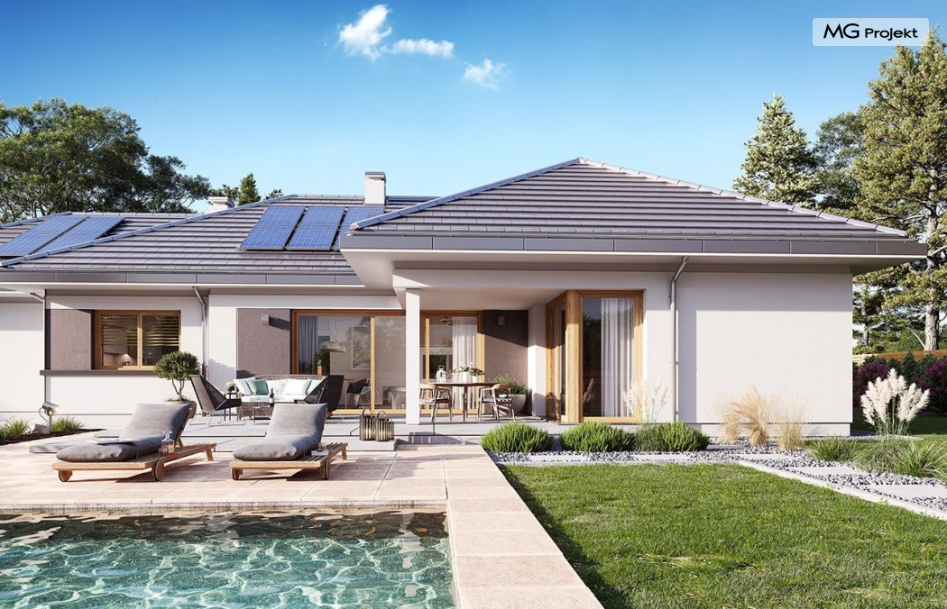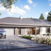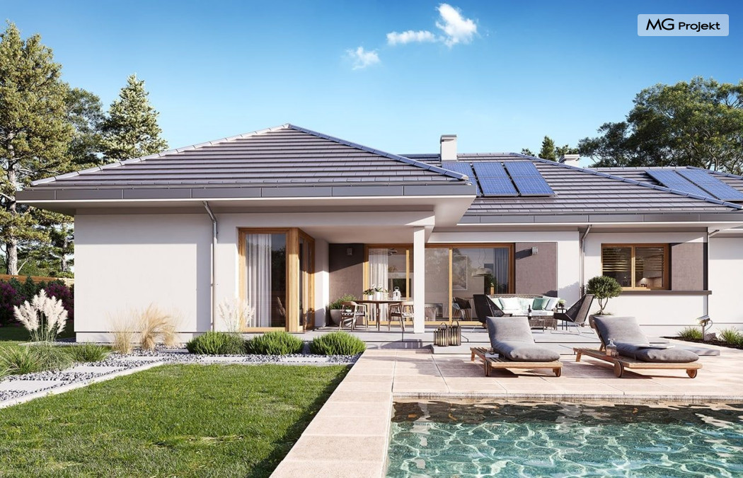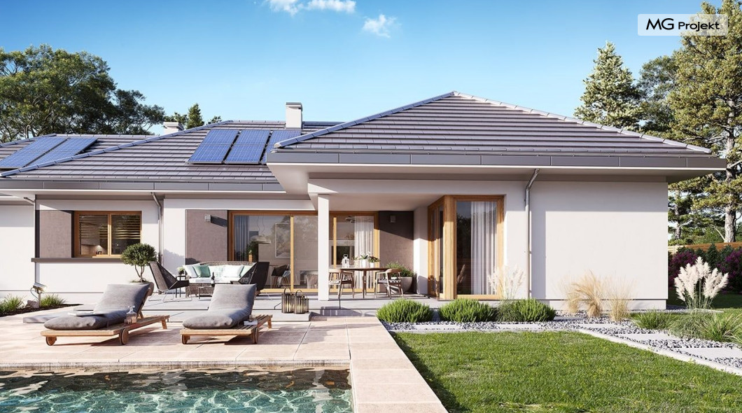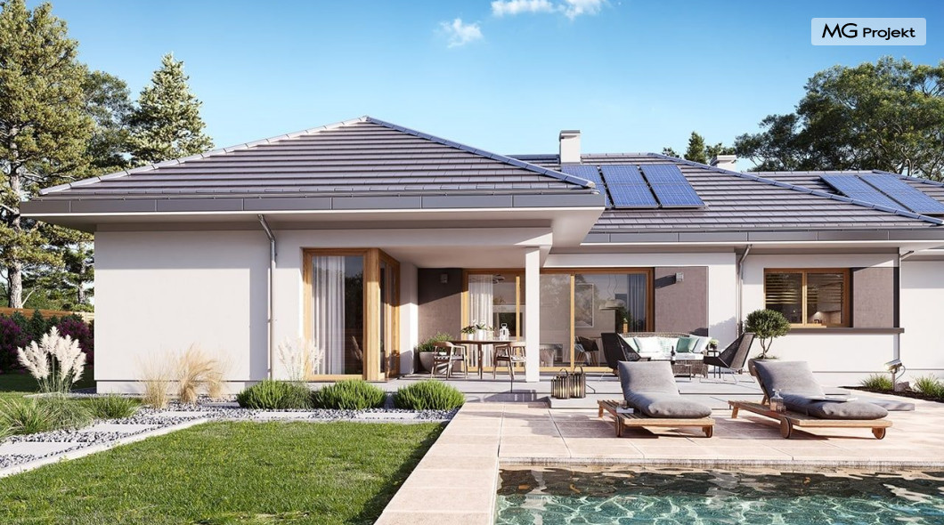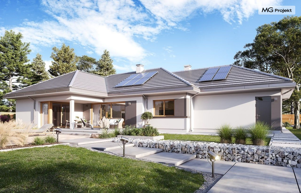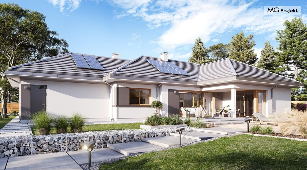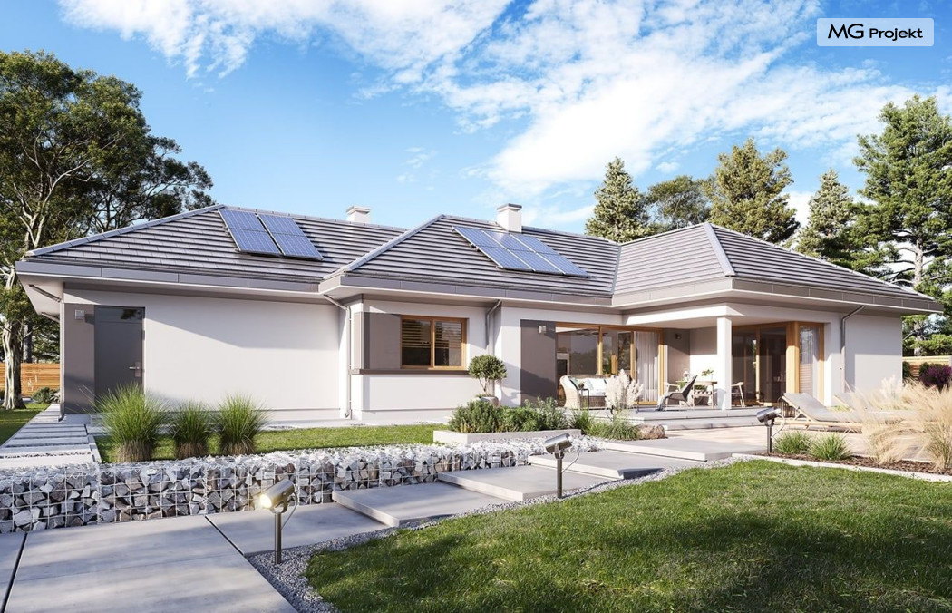 Projekt domu Dom na szerokiej 3 jest to projektu domu jednorodzinnego z serii „Dom na Szerokiej”. Budynek zaprojektowano jako urozmaiconą wersję wariantową projektów z tej serii, z tylną fasadą ogrodową w układzie litery L dającej poczucie przytulności i intymności na tarasie. Dom ma prostokątną podłużną bryłę, przykrytą czterospadowym dachem z dobudówkami. Bryła domu zbudowana jest na planie L, z szerszym ramieniem w elewacji frontowej.Budynek przeznaczony jest na płytką działkę, z niewielką głębokością między drogą a tyłem parceli, lub na działkę z ogrodem z boku domu ( wówczas sytuowany jest bokiem do drogi dojazdowej ). To typowy parterowy dom w stylu bungalow. Architektura budynku jest ciekawa, ale też stonowana - łączy w sobie nowoczesne detale i materiały, z tradycyjną sylwetką parterówki przykrytej wielospadowym dachem pokrytym dachówką. Szerokie reprezentacyjne wejście do domu z pięknymi drzwiami wejściowymi z naświetlem, Piękne narożne szklane okno pokoju- gabinetu, oraz duży podcień nad wejściem i wjazdem do garażu współtworzą atrakcyjny front domu. Od strony elewacji ogrodowej zaprojektowano duże przeszklenia z salonu i sypialni rodziców na taras i wygodny podcień. Detale wykończeniowe, materiały i kolory dobrano tak, aby stanowiły harmonijną całość. Wnętrze zaprojektowano dzieląc je na trzy części : część dzienną – z salonem, nocną z sypialniami i gospodarczą – z garażem i kotłownią. Do domu wchodzimy szerokimi drzwiami do obszernego przedsionka z szafami, albo z garażu - do przedsionka lub - przez spiżarnię – bezpośrednio do kuchni. Pokój dzienny połączony z jadalnią, kuchnią i holem stanowią komfortową przestrzeń dla domowników. Otwarcie przestrzenne nad częścią salonu podnoszące wysokość salonu aż do dachu powiększa dodatkowo wnętrze. Kuchnia z wyspą, jadalnia i salon zorganizowane są wokół centralnej ściany kominkowo – telewizyjnej oddzielającej salon od korytarza prowadzącego do sypialni. W części nocnej mamy cztery pokoje – trzy sypialnie oraz dodatkowy pokój ( gabinet lub zapasową sypialnię ). Do dyspozycji domowników są dwie łazienki. Sypialnia rodziców ma dwie duże ściany w zabudowie szafowej, oraz garderobę. Z sypialni master zaprojektowano wyjście na taras narożnym oknem balkonowym. Całość domu zamykają wygodny dwustanowiskowy garaż, oraz strych nad parterem, do wykorzystania na domowy magazyn - graciarnię, dostępny z parteru za pomocą schodków drabinkowych. Konstrukcja domu jest bardzo prosta : ściany parteru do wysokości wieńca + konstrukcja stropu nad parterem i więźby dachowej w postaci układu prefabrykowanych wiązarów drewnianych. Takie rozwiązanie znacznie przyspiesza budowę, upraszcza ją i obniża koszt realizacji domu. W projekcie zastosowano bardzo dobre izolacje, nowoczesne materiały i instalacje, dzięki czemu budynek będzie tani w późniejszej eksploatacji. Dom na Szerokiej 3 to świetna propozycja dla Inwestorów pragnących nowoczesnego, komfortowego parterowego domu o ciekawej urozmaiconej architekturze. Zapraszamy !