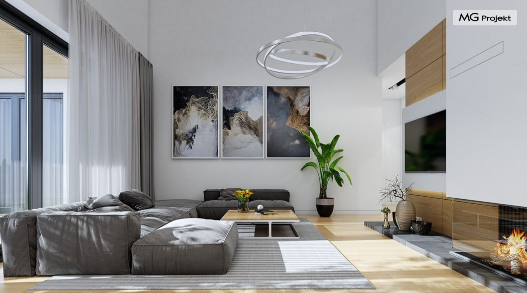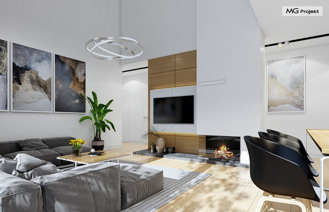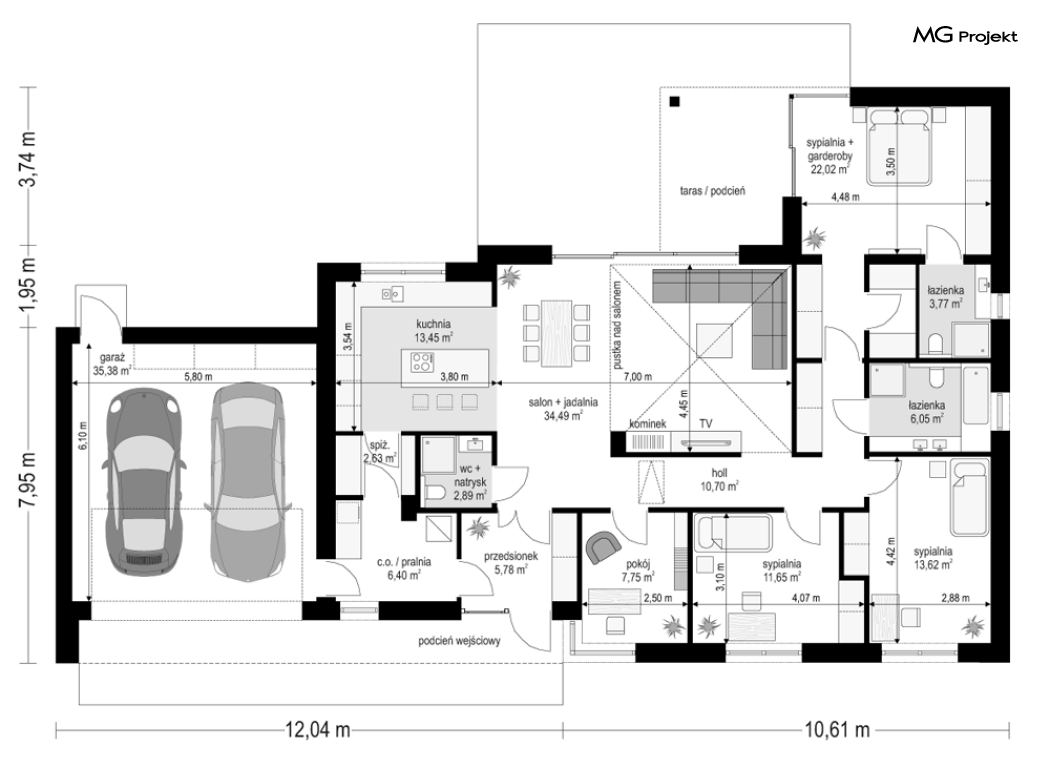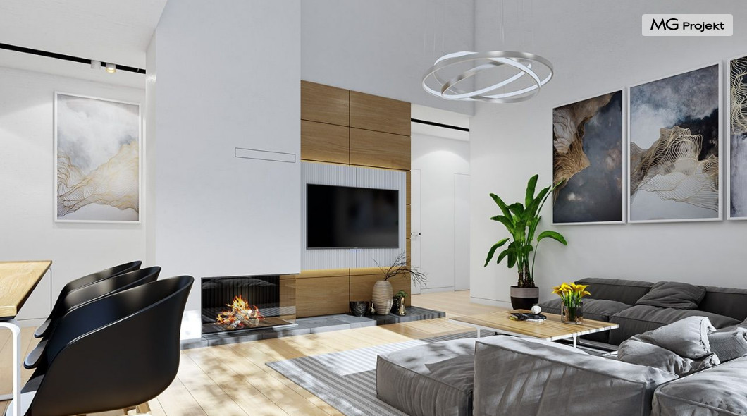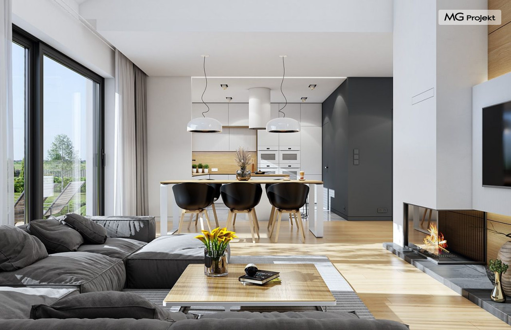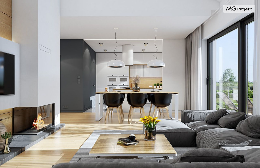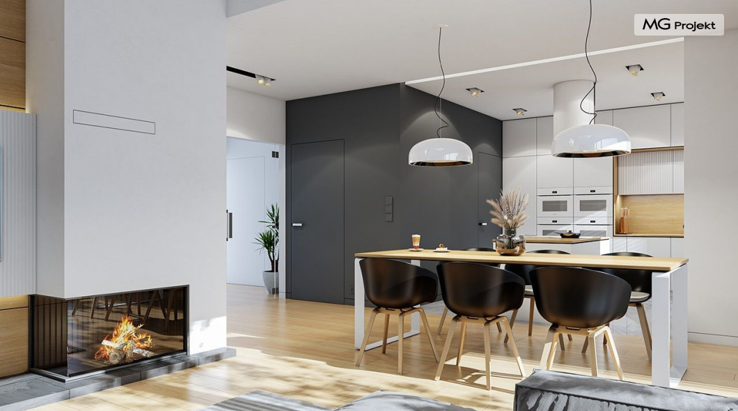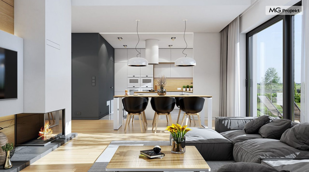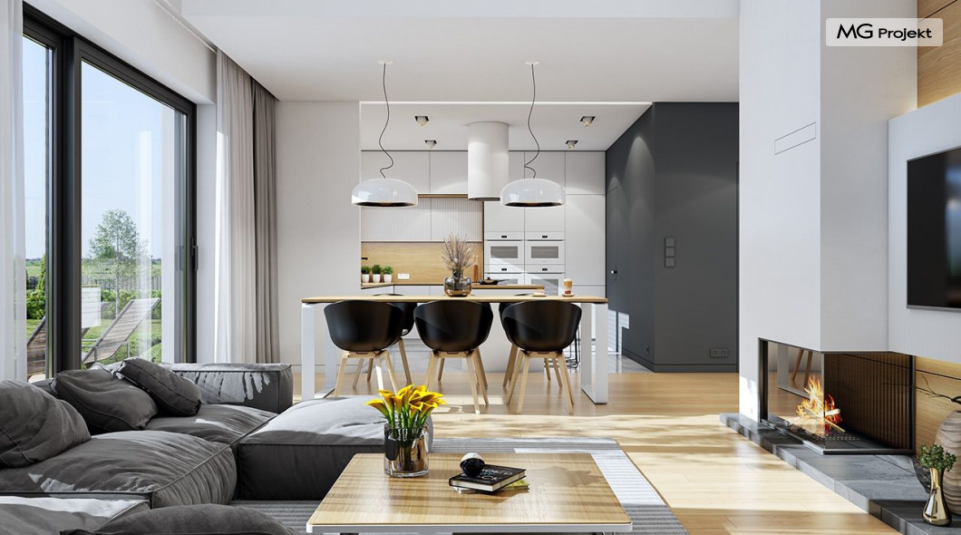Projekt domu Dom na szerokiej 3 jest to projektu domu jednorodzinnego z serii „Dom na Szerokiej”. Budynek zaprojektowano jako urozmaiconą wersję wariantową projektów z tej serii, z tylną fasadą ogrodową w układzie litery L dającej poczucie przytulności i intymności na tarasie. Dom ma prostokątną podłużną bryłę, przykrytą czterospadowym dachem z dobudówkami. Bryła domu zbudowana jest na planie L, z szerszym ramieniem w elewacji frontowej.Budynek przeznaczony jest na płytką działkę, z niewielką głębokością między drogą a tyłem parceli, lub na działkę z ogrodem z boku domu ( wówczas sytuowany jest bokiem do drogi dojazdowej ). To typowy parterowy dom w stylu bungalow. Architektura budynku jest ciekawa, ale też stonowana - łączy w sobie nowoczesne detale i materiały, z tradycyjną sylwetką parterówki przykrytej wielospadowym dachem pokrytym dachówką. Szerokie reprezentacyjne wejście do domu z pięknymi drzwiami wejściowymi z naświetlem, Piękne narożne szklane okno pokoju- gabinetu, oraz duży podcień nad wejściem i wjazdem do garażu współtworzą atrakcyjny front domu. Od strony elewacji ogrodowej zaprojektowano duże przeszklenia z salonu i sypialni rodziców na taras i wygodny podcień. Detale wykończeniowe, materiały i kolory dobrano tak, aby stanowiły harmonijną całość. Wnętrze zaprojektowano dzieląc je na trzy części : część dzienną – z salonem, nocną z sypialniami i gospodarczą – z garażem i kotłownią. Do domu wchodzimy szerokimi drzwiami do obszernego przedsionka z szafami, albo z garażu - do przedsionka lub - przez spiżarnię – bezpośrednio do kuchni. Pokój dzienny połączony z jadalnią, kuchnią i holem stanowią komfortową przestrzeń dla domowników. Otwarcie przestrzenne nad częścią salonu podnoszące wysokość salonu aż do dachu powiększa dodatkowo wnętrze. Kuchnia z wyspą, jadalnia i salon zorganizowane są wokół centralnej ściany kominkowo – telewizyjnej oddzielającej salon od korytarza prowadzącego do sypialni. W części nocnej mamy cztery pokoje – trzy sypialnie oraz dodatkowy pokój ( gabinet lub zapasową sypialnię ). Do dyspozycji domowników są dwie łazienki. Sypialnia rodziców ma dwie duże ściany w zabudowie szafowej, oraz garderobę. Z sypialni master zaprojektowano wyjście na taras narożnym oknem balkonowym. Całość domu zamykają wygodny dwustanowiskowy garaż, oraz strych nad parterem, do wykorzystania na domowy magazyn - graciarnię, dostępny z parteru za pomocą schodków drabinkowych. Konstrukcja domu jest bardzo prosta : ściany parteru do wysokości wieńca + konstrukcja stropu nad parterem i więźby dachowej w postaci układu prefabrykowanych wiązarów drewnianych. Takie rozwiązanie znacznie przyspiesza budowę, upraszcza ją i obniża koszt realizacji domu. W projekcie zastosowano bardzo dobre izolacje, nowoczesne materiały i instalacje, dzięki czemu budynek będzie tani w późniejszej eksploatacji. Dom na Szerokiej 3 to świetna propozycja dla Inwestorów pragnących nowoczesnego, komfortowego parterowego domu o ciekawej urozmaiconej architekturze. Zapraszamy !