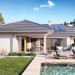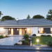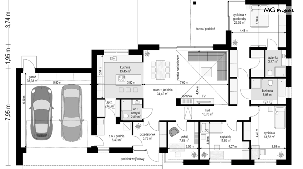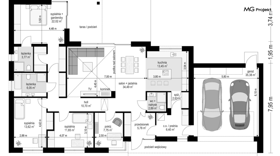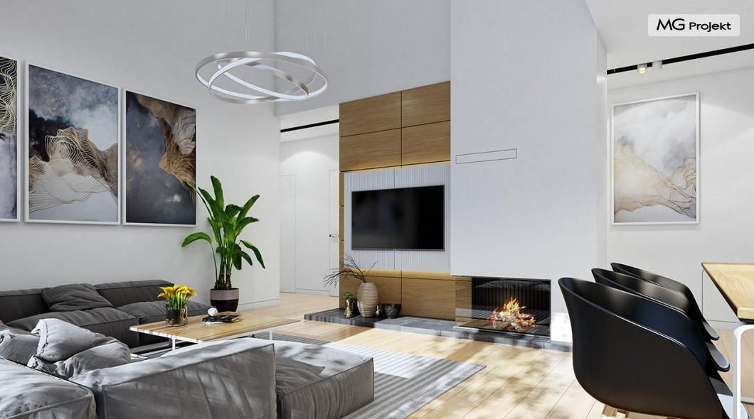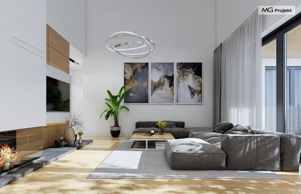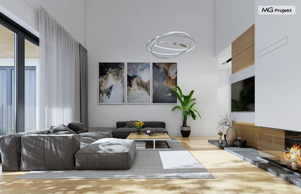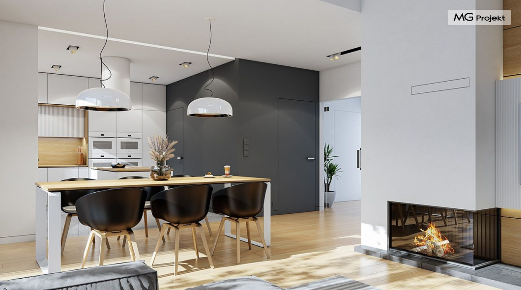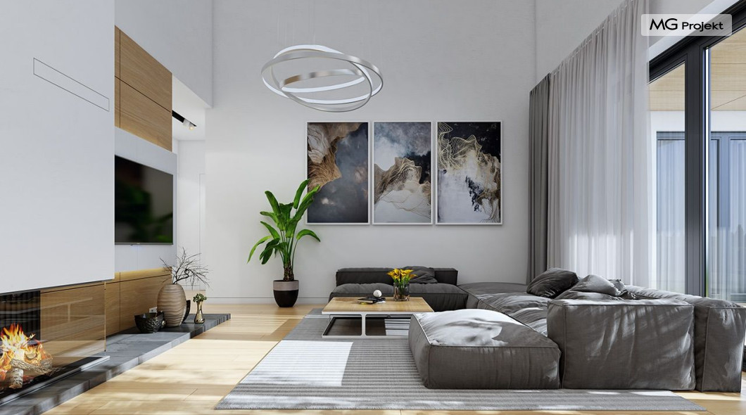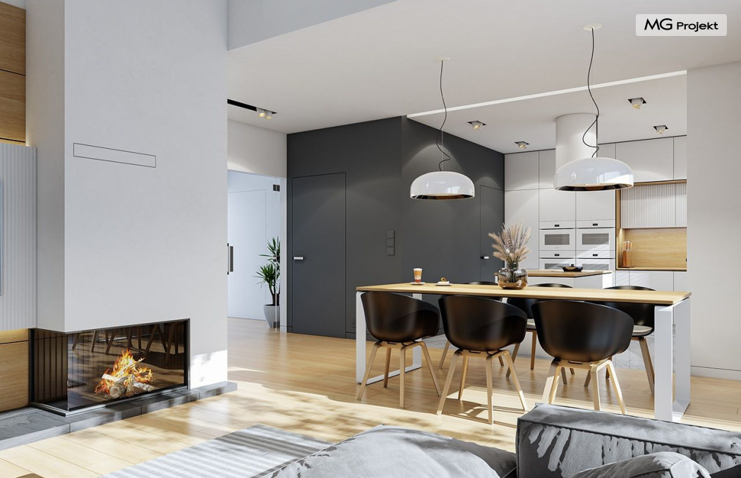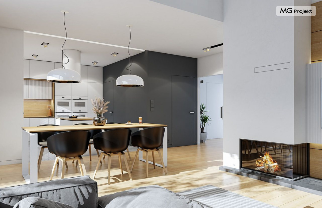 Projekt domu Dom na szerokiej 3 jest to projektu domu jednorodzinnego z serii „Dom na Szerokiej”. Budynek zaprojektowano jako urozmaiconą wersję wariantową projektów z tej serii, z tylną fasadą ogrodową w układzie litery L dającej poczucie przytulności i intymności na tarasie. Dom ma prostokątną podłużną bryłę, przykrytą czterospadowym dachem z dobudówkami. Bryła domu zbudowana jest na planie L, z szerszym ramieniem w elewacji frontowej.Budynek przeznaczony jest na płytką działkę, z niewielką głębokością między drogą a tyłem parceli, lub na działkę z ogrodem z boku domu ( wówczas sytuowany jest bokiem do drogi dojazdowej ). To typowy parterowy dom w stylu bungalow. Architektura budynku jest ciekawa, ale też stonowana - łączy w sobie nowoczesne detale i materiały, z tradycyjną sylwetką parterówki przykrytej wielospadowym dachem pokrytym dachówką. Szerokie reprezentacyjne wejście do domu z pięknymi drzwiami wejściowymi z naświetlem, Piękne narożne szklane okno pokoju- gabinetu, oraz duży podcień nad wejściem i wjazdem do garażu współtworzą atrakcyjny front domu. Od strony elewacji ogrodowej zaprojektowano duże przeszklenia z salonu i sypialni rodziców na taras i wygodny podcień. Detale wykończeniowe, materiały i kolory dobrano tak, aby stanowiły harmonijną całość. Wnętrze zaprojektowano dzieląc je na trzy części : część dzienną – z salonem, nocną z sypialniami i gospodarczą – z garażem i kotłownią. Do domu wchodzimy szerokimi drzwiami do obszernego przedsionka z szafami, albo z garażu - do przedsionka lub - przez spiżarnię – bezpośrednio do kuchni. Pokój dzienny połączony z jadalnią, kuchnią i holem stanowią komfortową przestrzeń dla domowników. Otwarcie przestrzenne nad częścią salonu podnoszące wysokość salonu aż do dachu powiększa dodatkowo wnętrze. Kuchnia z wyspą, jadalnia i salon zorganizowane są wokół centralnej ściany kominkowo – telewizyjnej oddzielającej salon od korytarza prowadzącego do sypialni. W części nocnej mamy cztery pokoje – trzy sypialnie oraz dodatkowy pokój ( gabinet lub zapasową sypialnię ). Do dyspozycji domowników są dwie łazienki. Sypialnia rodziców ma dwie duże ściany w zabudowie szafowej, oraz garderobę. Z sypialni master zaprojektowano wyjście na taras narożnym oknem balkonowym. Całość domu zamykają wygodny dwustanowiskowy garaż, oraz strych nad parterem, do wykorzystania na domowy magazyn - graciarnię, dostępny z parteru za pomocą schodków drabinkowych. Konstrukcja domu jest bardzo prosta : ściany parteru do wysokości wieńca + konstrukcja stropu nad parterem i więźby dachowej w postaci układu prefabrykowanych wiązarów drewnianych. Takie rozwiązanie znacznie przyspiesza budowę, upraszcza ją i obniża koszt realizacji domu. W projekcie zastosowano bardzo dobre izolacje, nowoczesne materiały i instalacje, dzięki czemu budynek będzie tani w późniejszej eksploatacji. Dom na Szerokiej 3 to świetna propozycja dla Inwestorów pragnących nowoczesnego, komfortowego parterowego domu o ciekawej urozmaiconej architekturze. Zapraszamy !