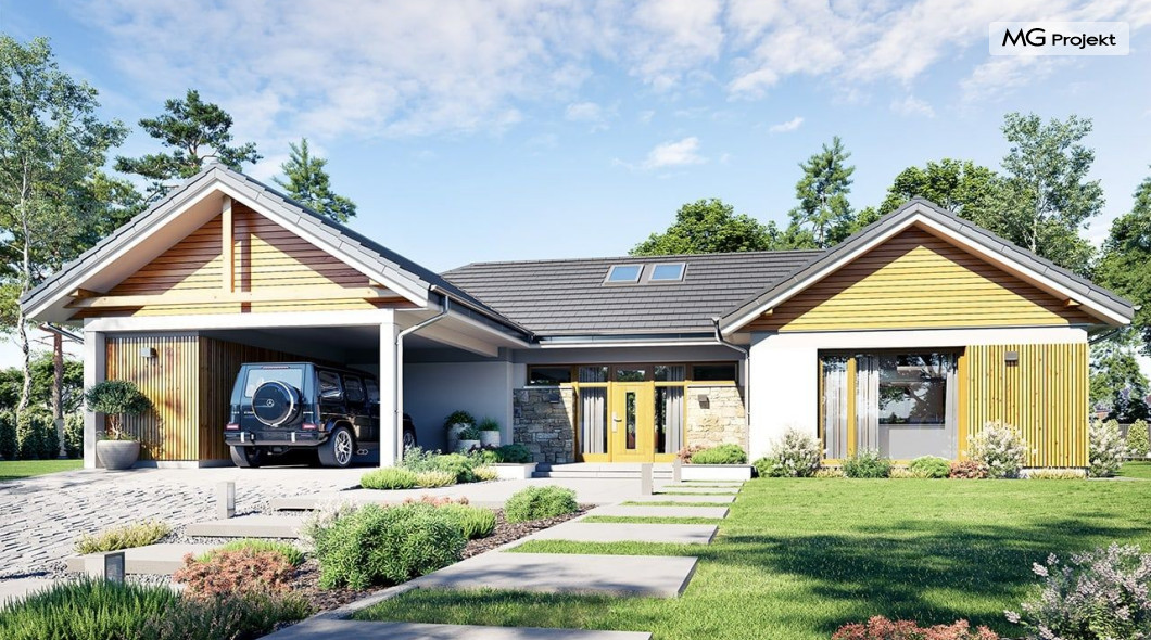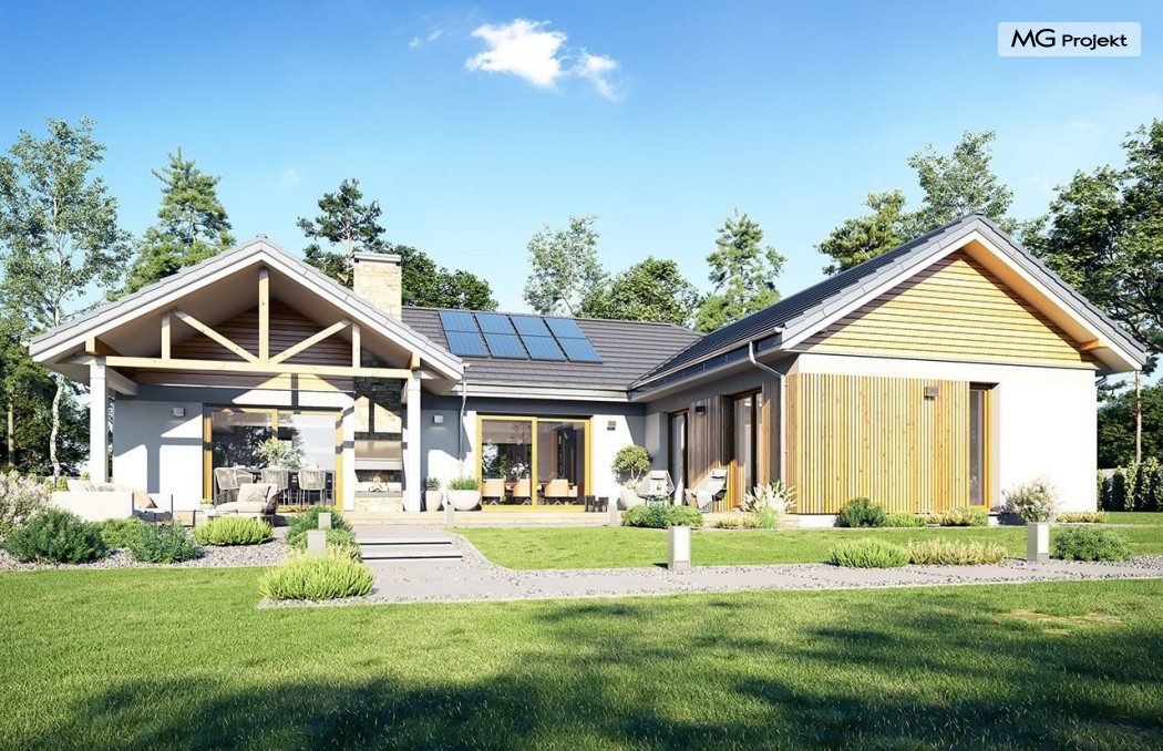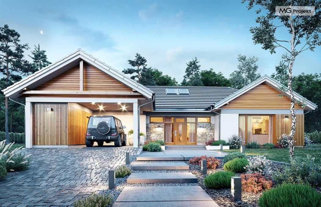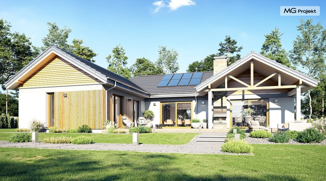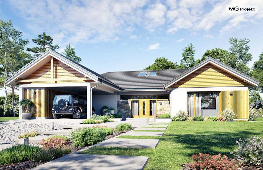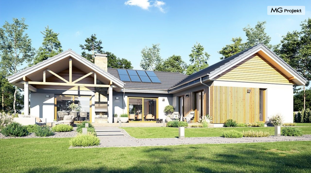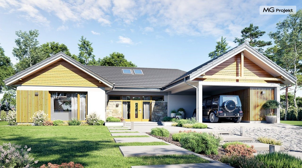 Projekt domu Hanka 2 jest to projekt interesującego parterowego domu jednorodzinnego z serii o nazwie ”Hanka”. Dom zaprojektowany został na planie litery „H”, jest przekryty trzema przenikającymi się dachami dwuspadowymi, z programem użytkowym znajdującym się na jednej kondygnacji parteru. Wszystkie elementy domu zostały zaprojektowane tak, aby zapewnić właścicielom maksymalny komfort i wygodę mieszkania - zarówno forma budynku, układ funkcjonalny, jak i rozmieszczenie pomieszczeń. Charakter architektury domu łączy w sobie związki z przyrodą, poszanowanie dla natury z nowoczesną formą i detalami. Dom zaprojektowano blisko ziemi, blisko ogrodu. Wnętrza ściśle połączono z otaczającymi budynek tarasami, podcieniami, wiatami, podestami, rozszerzając wnętrze na działkę Inwestorów. Do domu wchodzimy przez reprezentacyjne drzwi wejściowe z naświetlami bocznymi. Po bokach elewacji frontowej zaprojektowano ogromne okno kuchenne, oraz po przeciwnej stronie wygodną wiatę garażową. Od strony ogrodu głównym elementem kształtującym sylwetkę jest duże zadaszenie tarasu wsparte na słupach, z szerokimi przeszkleniami salonu. Elewacje zdobią kamienne oraz drewniane okładzinę ściany i duże okna.Dachy uformowane w kształt litery „H” urozmaicają bryłę domu i dodają jej uroku. Odpowiednio dobrane detale i materiały wykończeniowe pozwoliły stworzyć w efekcie przyjemną architekturę podmiejskiej komfortowej willi. Wnętrze podzielono na dwie części : jednoprzestrzenną część dzienną, z salonem, jadalnią i kuchnią, oraz cześć z pokojami sypialnymi. Do domu wchodzimy przez obszerny przedsionek wprost do wielkiego holu, który pełni również funkcję pokoju stołowego - jadalni i otwiera się szerokim oknem na taras i otaczający dom ogród. Pomieszczenie ma otwarty do dachu sufit, z dodatkowym doświetleniem oknami połaciowymi. Dalej na lewo przechodzimy do salonu ze ścianą telewizyjną i ścianą z kominkiem, z otwarciem przestrzennym sufitu, oraz szerokim przeszklonym wyjściem na na zadaszony taras. Dopełnieniem wnętrza jest luksusowa piękna kuchnia z aż dwiema wyspami, z dużą ilością blatów roboczych i pełnej zabudowy. Do kuchni możemy dostać się też przez spiżarnię do przedsionka i wygodnego car-portu - wiaty garażowej. Wiata może być pojedyncza z dodatkowym pomieszczeniem gospodarczym, lub podwójna - wedle decyzji Klienta. W części nocnej domu mamy różny układ pokoi w różnych wersjach wariantowych projektu „Hanka”. W Hance 2 mamy : dwie sypialnie dziecięce z wygodną łazienką, dodatkowy pokój - sypialnię lub gabinet, oraz apartament rodziców z garderobą, oraz łazienką. Wnętrze jest bardzo komfortowe i zapewni optymalne warunki mieszkania nawet najbardziej wymagającemu Inwestorowi. Dom mimo rozbudowanej bryły ma bardzo prostą konstrukcję, będzie dość łatwy w budowie, a dzięki zastosowanym świetnym izolacjom i nowoczesnym instalacjom budynek będzie energooszczędny i tani w eksploatacji. „Hanka 2” to dom z charakterem, dla Inwestorów szukających oryginalnych nietuzinkowych rozwiązań - marzących o mieszkaniu na parterze blisko ogrodu. Zapraszamy !