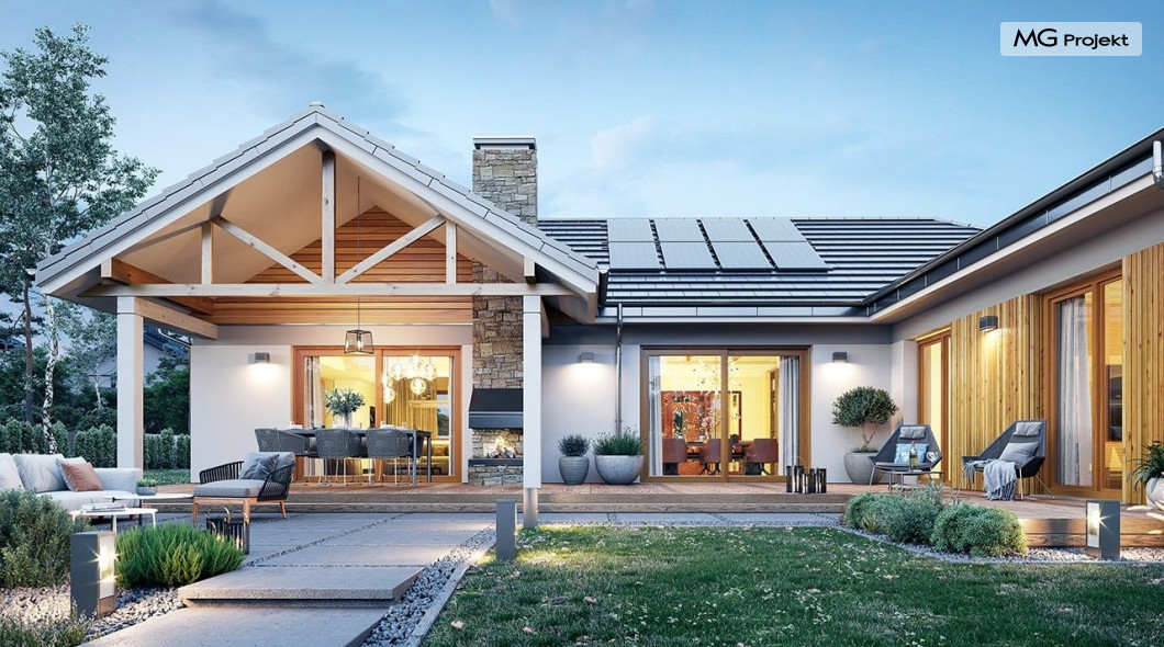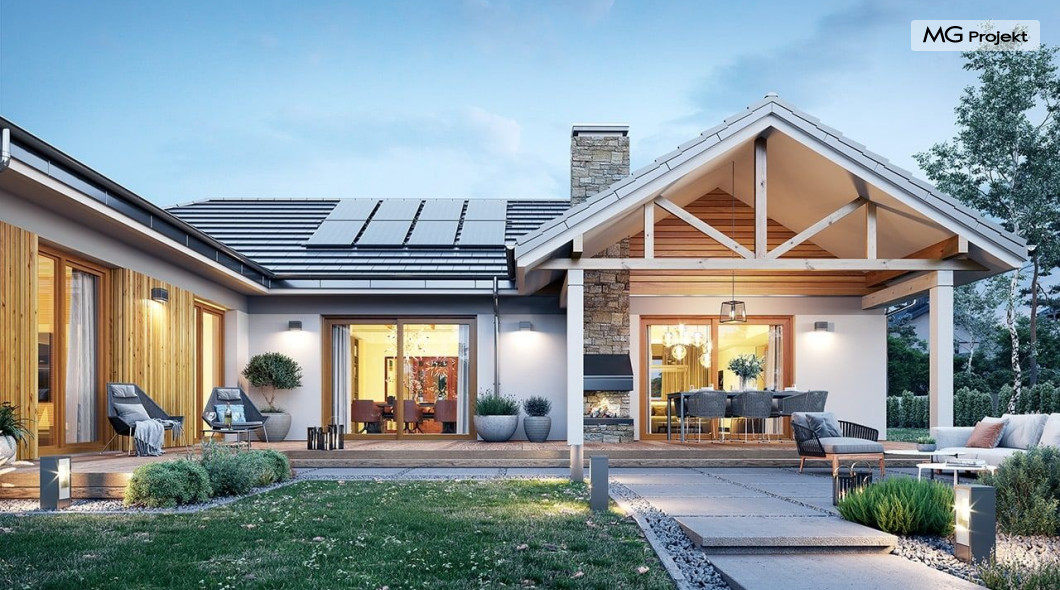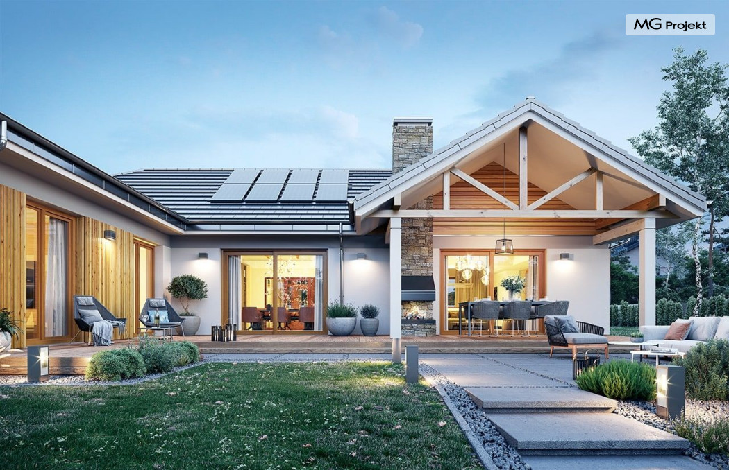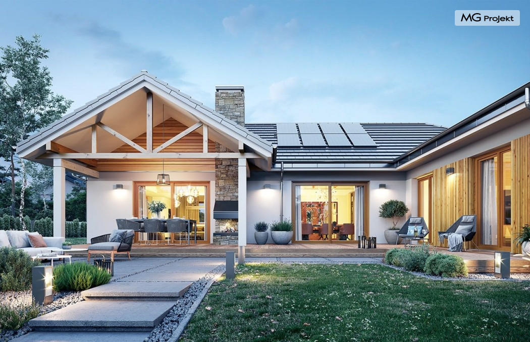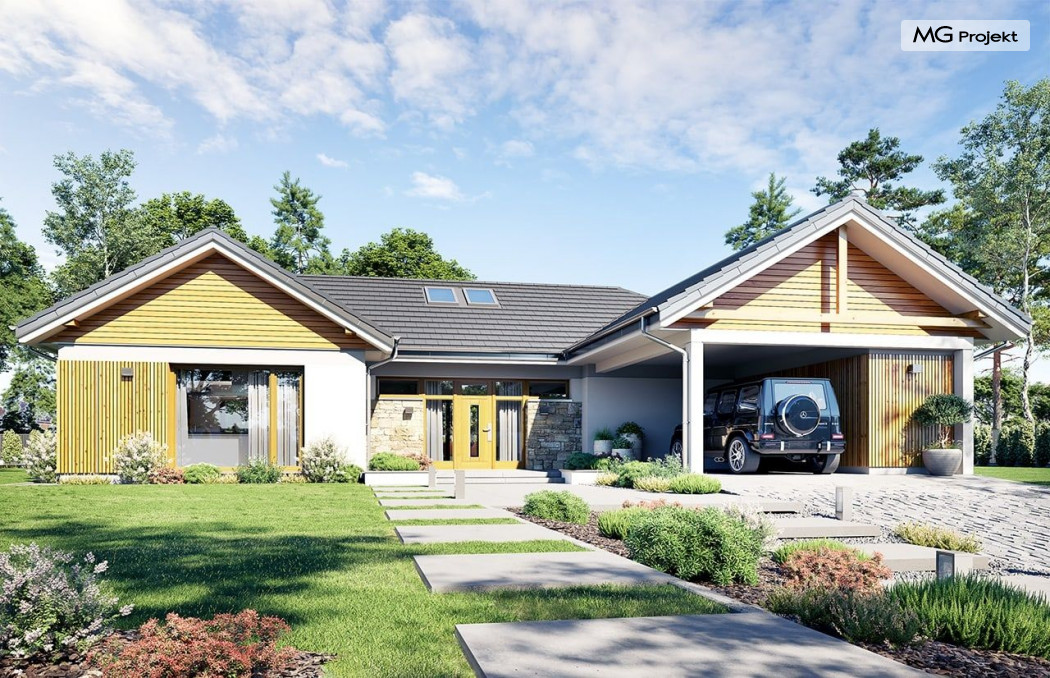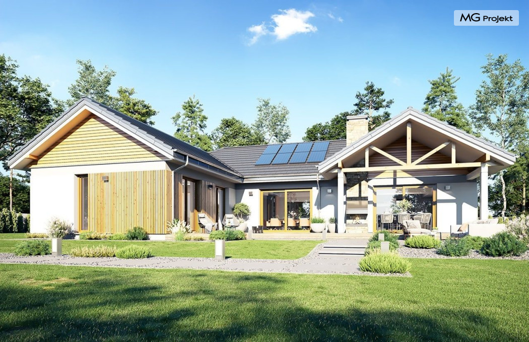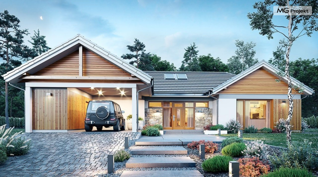 Projekt domu Hanka 2 jest to projekt interesującego parterowego domu jednorodzinnego z serii o nazwie ”Hanka”. Dom zaprojektowany został na planie litery „H”, jest przekryty trzema przenikającymi się dachami dwuspadowymi, z programem użytkowym znajdującym się na jednej kondygnacji parteru. Wszystkie elementy domu zostały zaprojektowane tak, aby zapewnić właścicielom maksymalny komfort i wygodę mieszkania - zarówno forma budynku, układ funkcjonalny, jak i rozmieszczenie pomieszczeń. Charakter architektury domu łączy w sobie związki z przyrodą, poszanowanie dla natury z nowoczesną formą i detalami. Dom zaprojektowano blisko ziemi, blisko ogrodu. Wnętrza ściśle połączono z otaczającymi budynek tarasami, podcieniami, wiatami, podestami, rozszerzając wnętrze na działkę Inwestorów. Do domu wchodzimy przez reprezentacyjne drzwi wejściowe z naświetlami bocznymi. Po bokach elewacji frontowej zaprojektowano ogromne okno kuchenne, oraz po przeciwnej stronie wygodną wiatę garażową. Od strony ogrodu głównym elementem kształtującym sylwetkę jest duże zadaszenie tarasu wsparte na słupach, z szerokimi przeszkleniami salonu. Elewacje zdobią kamienne oraz drewniane okładzinę ściany i duże okna.Dachy uformowane w kształt litery „H” urozmaicają bryłę domu i dodają jej uroku. Odpowiednio dobrane detale i materiały wykończeniowe pozwoliły stworzyć w efekcie przyjemną architekturę podmiejskiej komfortowej willi. Wnętrze podzielono na dwie części : jednoprzestrzenną część dzienną, z salonem, jadalnią i kuchnią, oraz cześć z pokojami sypialnymi. Do domu wchodzimy przez obszerny przedsionek wprost do wielkiego holu, który pełni również funkcję pokoju stołowego - jadalni i otwiera się szerokim oknem na taras i otaczający dom ogród. Pomieszczenie ma otwarty do dachu sufit, z dodatkowym doświetleniem oknami połaciowymi. Dalej na lewo przechodzimy do salonu ze ścianą telewizyjną i ścianą z kominkiem, z otwarciem przestrzennym sufitu, oraz szerokim przeszklonym wyjściem na na zadaszony taras. Dopełnieniem wnętrza jest luksusowa piękna kuchnia z aż dwiema wyspami, z dużą ilością blatów roboczych i pełnej zabudowy. Do kuchni możemy dostać się też przez spiżarnię do przedsionka i wygodnego car-portu - wiaty garażowej. Wiata może być pojedyncza z dodatkowym pomieszczeniem gospodarczym, lub podwójna - wedle decyzji Klienta. W części nocnej domu mamy różny układ pokoi w różnych wersjach wariantowych projektu „Hanka”. W Hance 2 mamy : dwie sypialnie dziecięce z wygodną łazienką, dodatkowy pokój - sypialnię lub gabinet, oraz apartament rodziców z garderobą, oraz łazienką. Wnętrze jest bardzo komfortowe i zapewni optymalne warunki mieszkania nawet najbardziej wymagającemu Inwestorowi. Dom mimo rozbudowanej bryły ma bardzo prostą konstrukcję, będzie dość łatwy w budowie, a dzięki zastosowanym świetnym izolacjom i nowoczesnym instalacjom budynek będzie energooszczędny i tani w eksploatacji. „Hanka 2” to dom z charakterem, dla Inwestorów szukających oryginalnych nietuzinkowych rozwiązań - marzących o mieszkaniu na parterze blisko ogrodu. Zapraszamy !