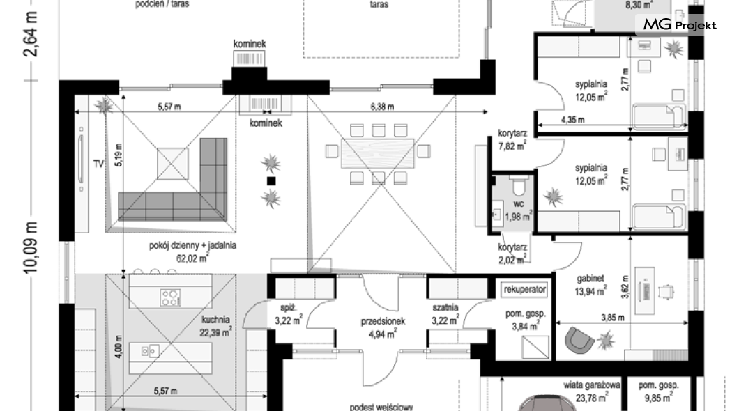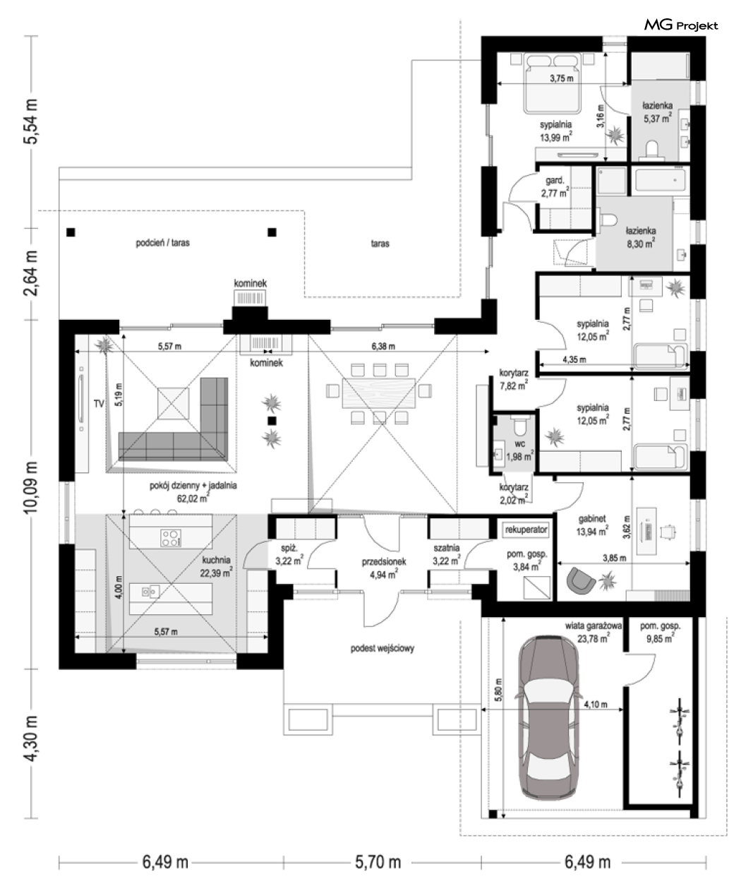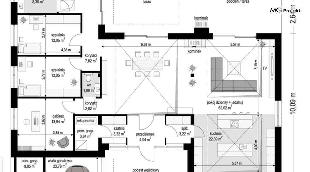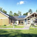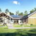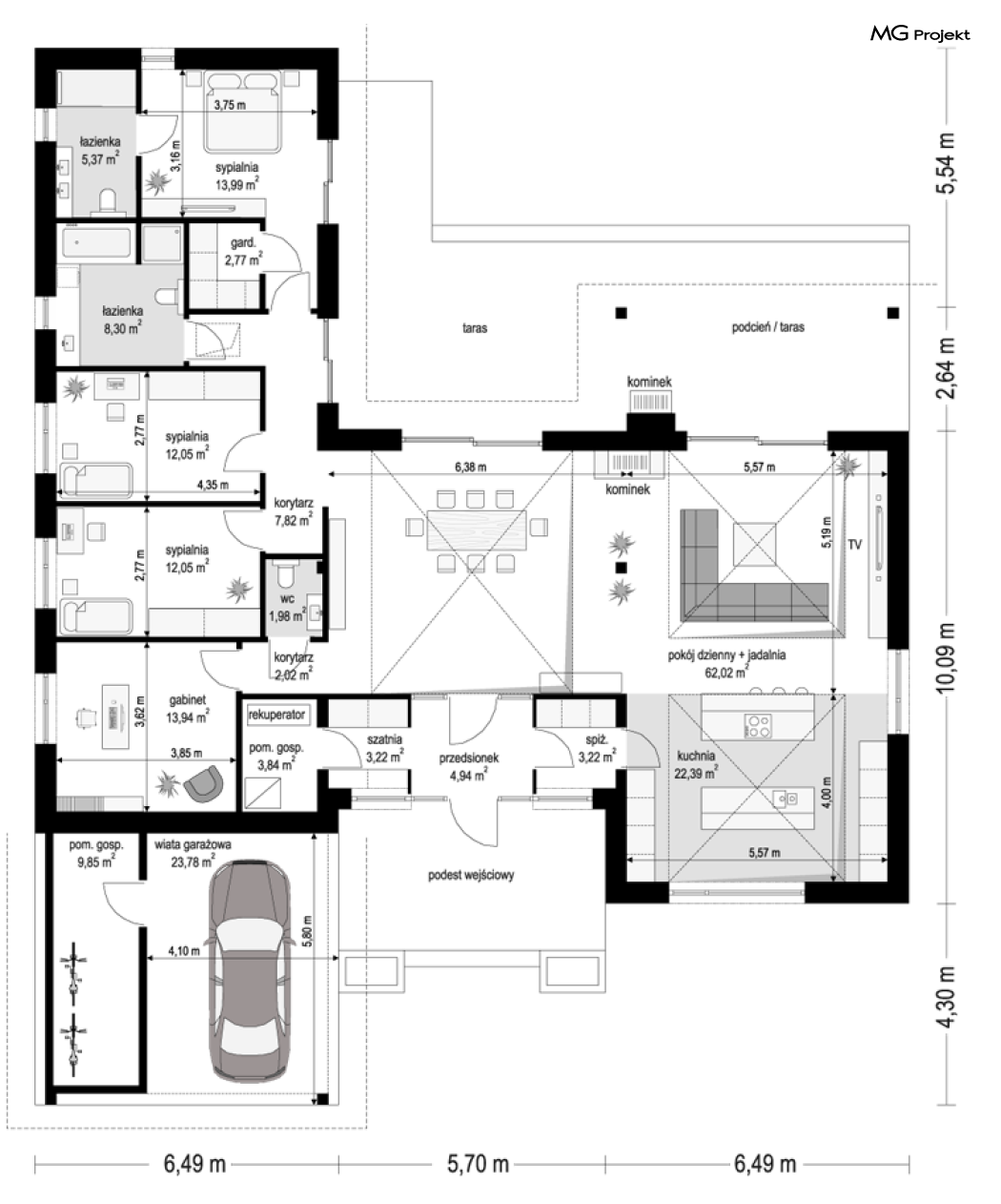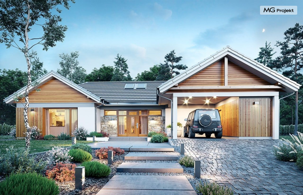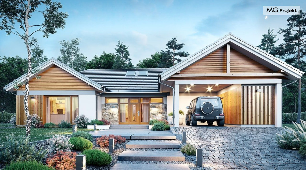 Projekt domu Hanka 2 jest to projekt interesującego parterowego domu jednorodzinnego z serii o nazwie ”Hanka”. Dom zaprojektowany został na planie litery „H”, jest przekryty trzema przenikającymi się dachami dwuspadowymi, z programem użytkowym znajdującym się na jednej kondygnacji parteru. Wszystkie elementy domu zostały zaprojektowane tak, aby zapewnić właścicielom maksymalny komfort i wygodę mieszkania - zarówno forma budynku, układ funkcjonalny, jak i rozmieszczenie pomieszczeń. Charakter architektury domu łączy w sobie związki z przyrodą, poszanowanie dla natury z nowoczesną formą i detalami. Dom zaprojektowano blisko ziemi, blisko ogrodu. Wnętrza ściśle połączono z otaczającymi budynek tarasami, podcieniami, wiatami, podestami, rozszerzając wnętrze na działkę Inwestorów. Do domu wchodzimy przez reprezentacyjne drzwi wejściowe z naświetlami bocznymi. Po bokach elewacji frontowej zaprojektowano ogromne okno kuchenne, oraz po przeciwnej stronie wygodną wiatę garażową. Od strony ogrodu głównym elementem kształtującym sylwetkę jest duże zadaszenie tarasu wsparte na słupach, z szerokimi przeszkleniami salonu. Elewacje zdobią kamienne oraz drewniane okładzinę ściany i duże okna.Dachy uformowane w kształt litery „H” urozmaicają bryłę domu i dodają jej uroku. Odpowiednio dobrane detale i materiały wykończeniowe pozwoliły stworzyć w efekcie przyjemną architekturę podmiejskiej komfortowej willi. Wnętrze podzielono na dwie części : jednoprzestrzenną część dzienną, z salonem, jadalnią i kuchnią, oraz cześć z pokojami sypialnymi. Do domu wchodzimy przez obszerny przedsionek wprost do wielkiego holu, który pełni również funkcję pokoju stołowego - jadalni i otwiera się szerokim oknem na taras i otaczający dom ogród. Pomieszczenie ma otwarty do dachu sufit, z dodatkowym doświetleniem oknami połaciowymi. Dalej na lewo przechodzimy do salonu ze ścianą telewizyjną i ścianą z kominkiem, z otwarciem przestrzennym sufitu, oraz szerokim przeszklonym wyjściem na na zadaszony taras. Dopełnieniem wnętrza jest luksusowa piękna kuchnia z aż dwiema wyspami, z dużą ilością blatów roboczych i pełnej zabudowy. Do kuchni możemy dostać się też przez spiżarnię do przedsionka i wygodnego car-portu - wiaty garażowej. Wiata może być pojedyncza z dodatkowym pomieszczeniem gospodarczym, lub podwójna - wedle decyzji Klienta. W części nocnej domu mamy różny układ pokoi w różnych wersjach wariantowych projektu „Hanka”. W Hance 2 mamy : dwie sypialnie dziecięce z wygodną łazienką, dodatkowy pokój - sypialnię lub gabinet, oraz apartament rodziców z garderobą, oraz łazienką. Wnętrze jest bardzo komfortowe i zapewni optymalne warunki mieszkania nawet najbardziej wymagającemu Inwestorowi. Dom mimo rozbudowanej bryły ma bardzo prostą konstrukcję, będzie dość łatwy w budowie, a dzięki zastosowanym świetnym izolacjom i nowoczesnym instalacjom budynek będzie energooszczędny i tani w eksploatacji. „Hanka 2” to dom z charakterem, dla Inwestorów szukających oryginalnych nietuzinkowych rozwiązań - marzących o mieszkaniu na parterze blisko ogrodu. Zapraszamy !