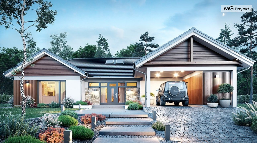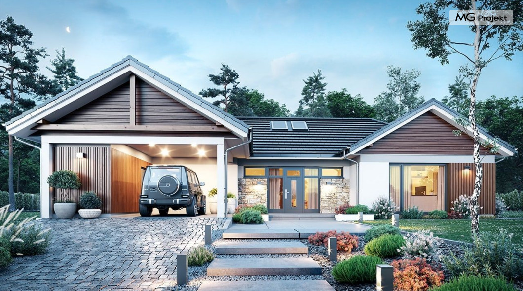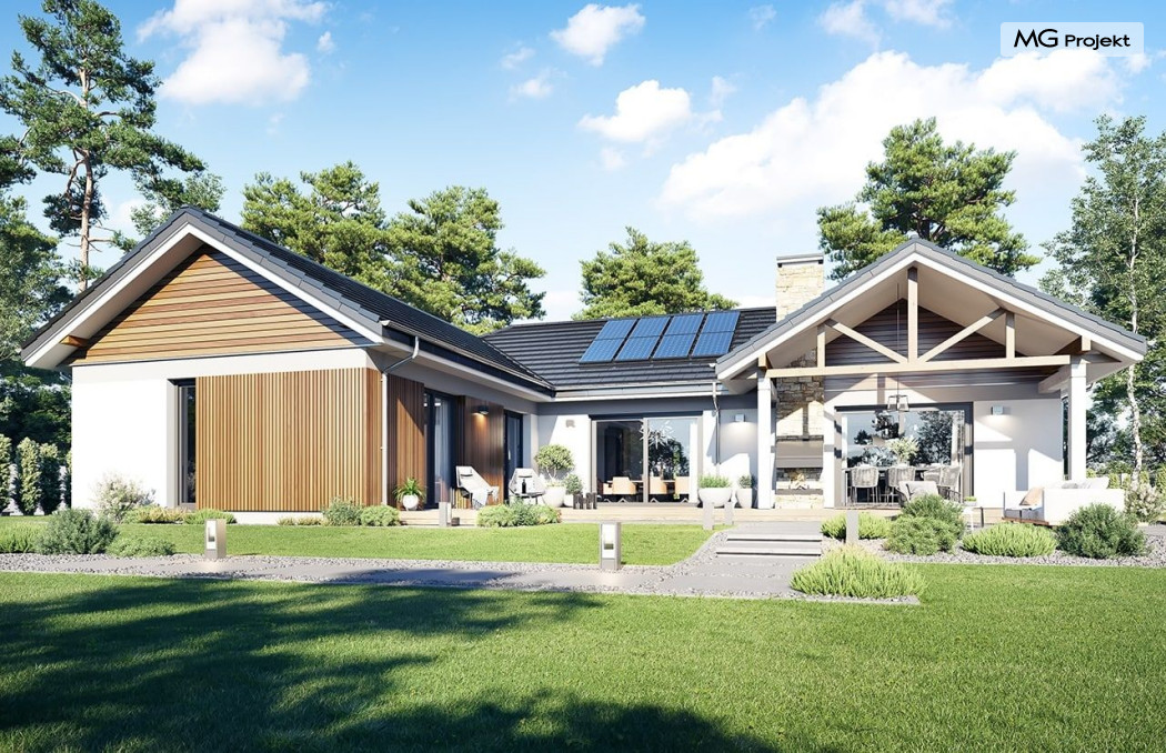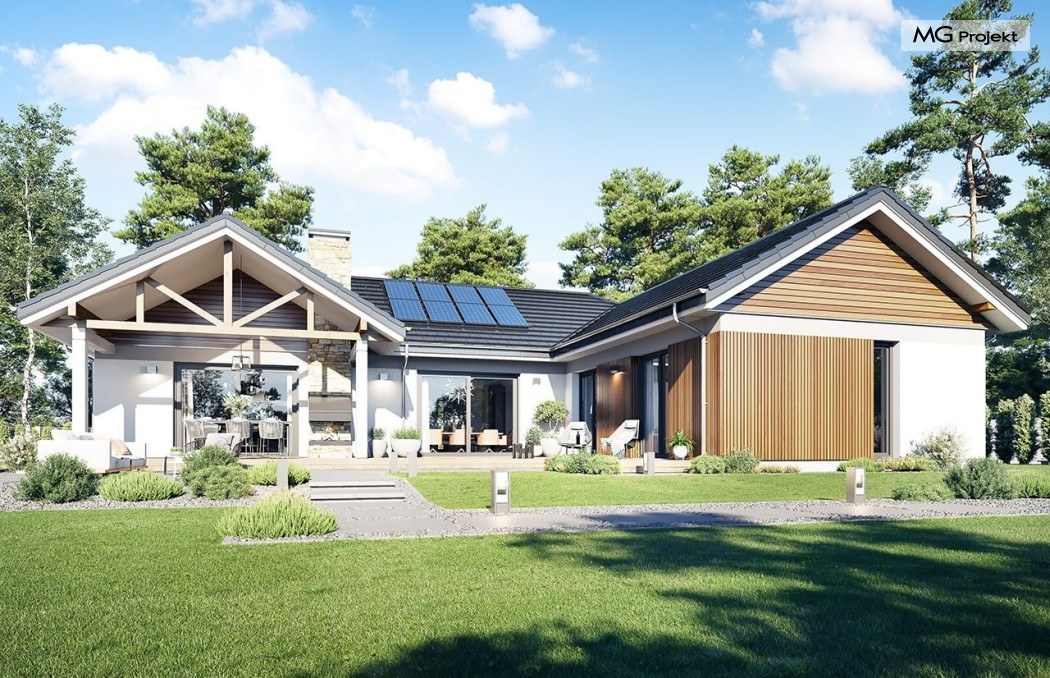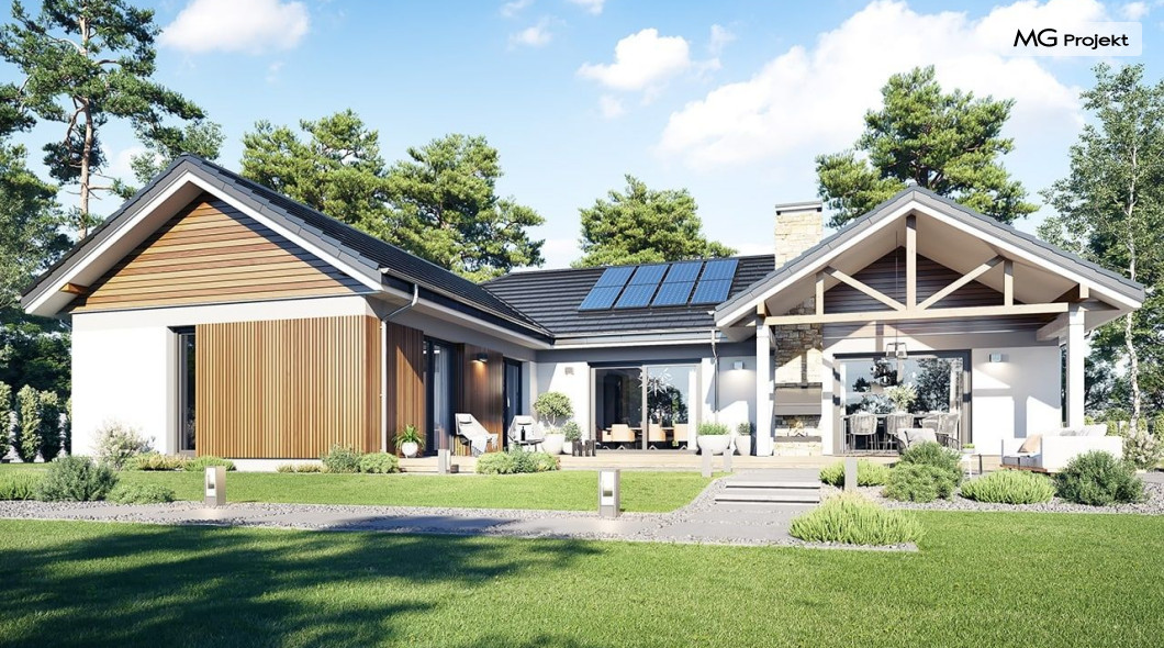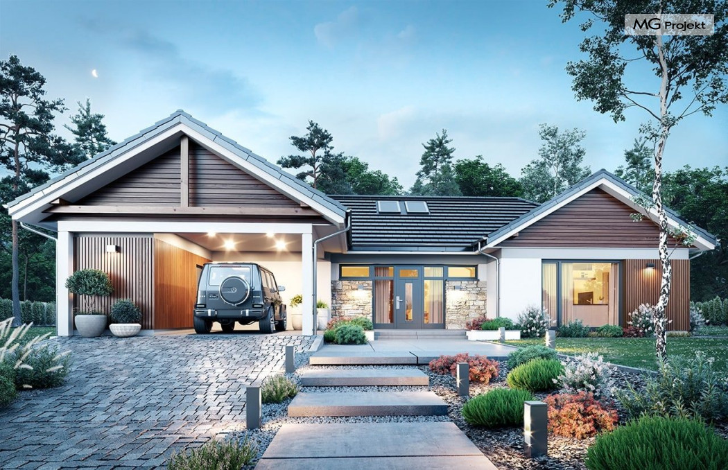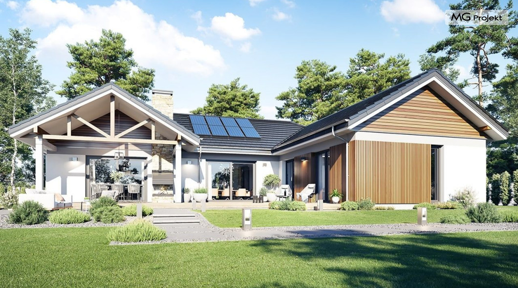 Projekt domu Hanka 3 jest to projekt bardzo ciekawego parterowego domu jednorodzinnego z serii o nazwie ”Hanka”. Dom zaprojektowany został na planie litery „H”, jest przekryty trzema przenikającymi się dachami dwuspadowymi, z programem użytkowym znajdującym się na jednej kondygnacji parteru. Wszystkie elementy domu zostały zaprojektowane tak, aby zapewnić właścicielom maksymalny komfort i wygodę mieszkania - zarówno forma budynku, układ funkcjonalny, jak i rozmieszczenie pomieszczeń. Charakter architektury domu łączy w sobie związki z przyrodą, poszanowanie dla natury z nowoczesną formą i detalami. Dom zaprojektowano blisko ziemi, blisko ogrodu. Wnętrza ściśle połączono z otaczającymi budynek tarasami, podcieniami, wiatami, podestami, rozszerzając wnętrze na działkę Inwestorów. Do domu wchodzimy przez reprezentacyjne drzwi wejściowe z naświetlami bocznymi. Po bokach elewacji frontowej zaprojektowano ogromne okno kuchenne, oraz po przeciwnej stronie wygodną wiatę garażową. Od strony ogrodu głównym elementem kształtującym sylwetkę jest duże zadaszenie tarasu wsparte na słupach, z szerokimi przeszkleniami salonu. Elewacje zdobią kamienne oraz drewniane okładzinę ściany i duże okna.Dachy uformowane w kształt litery „H” urozmaicają bryłę domu i dodają jej uroku. Odpowiednio dobrane detale i materiały wykończeniowe pozwoliły stworzyć w efekcie przyjemną architekturę podmiejskiej komfortowej willi. Wnętrze podzielono na dwie części : jednoprzestrzenną część dzienną, z salonem, jadalnią i kuchnią, oraz cześć z pokojami sypialnymi. Do domu wchodzimy przez obszerny przedsionek wprost do wielkiego holu, który pełni również funkcję pokoju stołowego - jadalni i otwiera się szerokim oknem na taras i otaczający dom ogród. Pomieszczenie ma otwarty do dachu sufit, z dodatkowym doświetleniem oknami połaciowymi. Dalej na lewo przechodzimy do salonu ze ścianą telewizyjną i ścianą z kominkiem, z otwarciem przestrzennym sufitu, oraz szerokim przeszklonym wyjściem na na zadaszony taras. Dopełnieniem wnętrza jest luksusowa piękna kuchnia z aż dwiema wyspami, z dużą ilością blatów roboczych i pełnej zabudowy. Do kuchni możemy dostać się też przez spiżarnię do przedsionka i wygodnego car-portu - wiaty garażowej. Wiata może być pojedyncza z dodatkowym pomieszczeniem gospodarczym, lub podwójna - wedle decyzji Klienta. W części nocnej domu mamy różny układ pokoi w różnych wersjach wariantowych projektu „Hanka”. W Hance 3 mamy : trzy sypialnie dziecięce z wygodną łazienką, oraz apartament rodziców z dużą garderobą, oraz łazienką. Wnętrze jest bardzo komfortowe i zapewni optymalne warunki mieszkania nawet najbardziej wymagającemu Inwestorowi. Dom mimo rozbudowanej bryły ma bardzo prostą konstrukcję, będzie dość łatwy w budowie, a dzięki zastosowanym świetnym izolacjom i nowoczesnym instalacjom budynek będzie energooszczędny i tani w eksploatacji. „Hanka 3” to dom z charakterem, dla Inwestorów szukających oryginalnych nietuzinkowych rozwiązań - marzących o mieszkaniu na parterze blisko ogrodu. Zapraszamy !