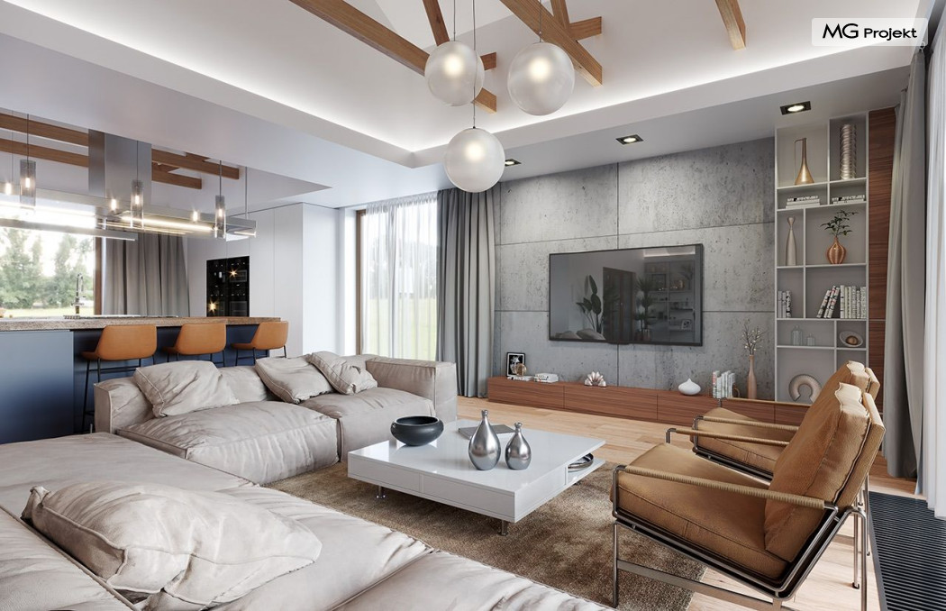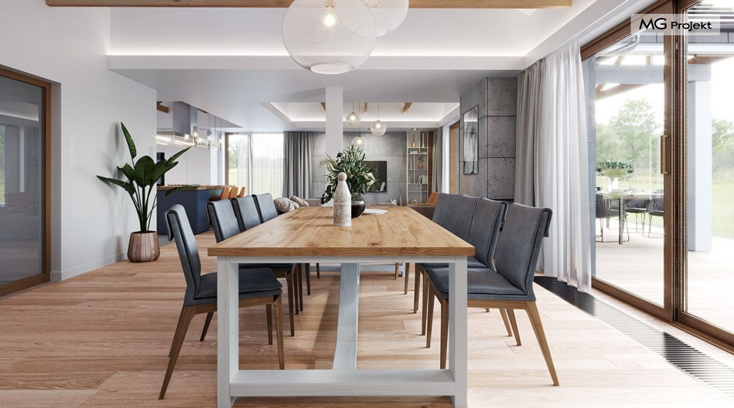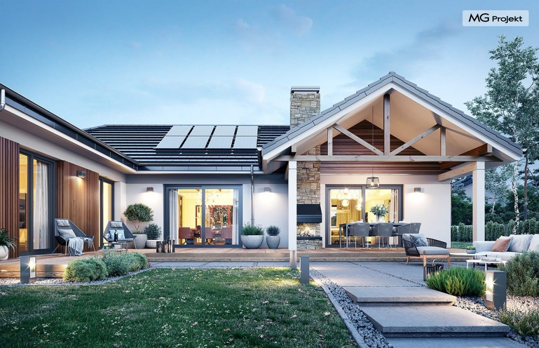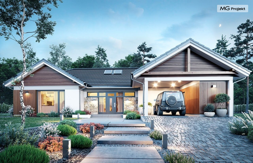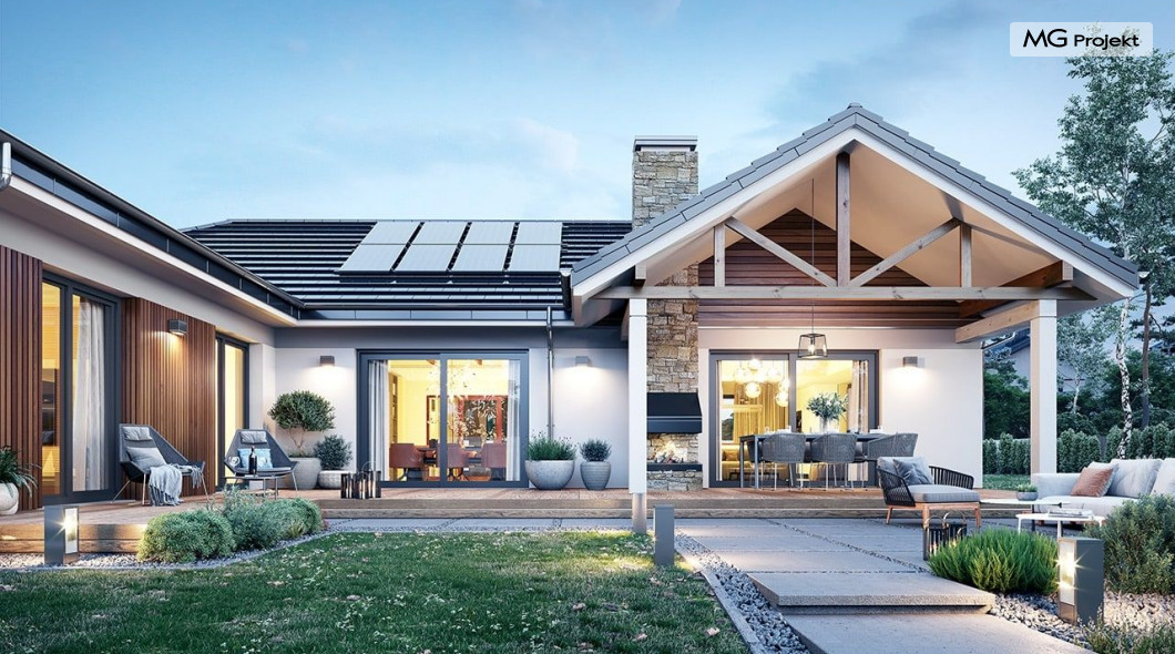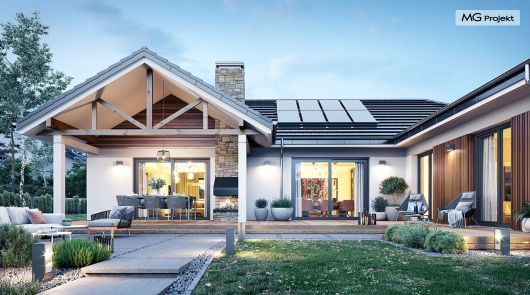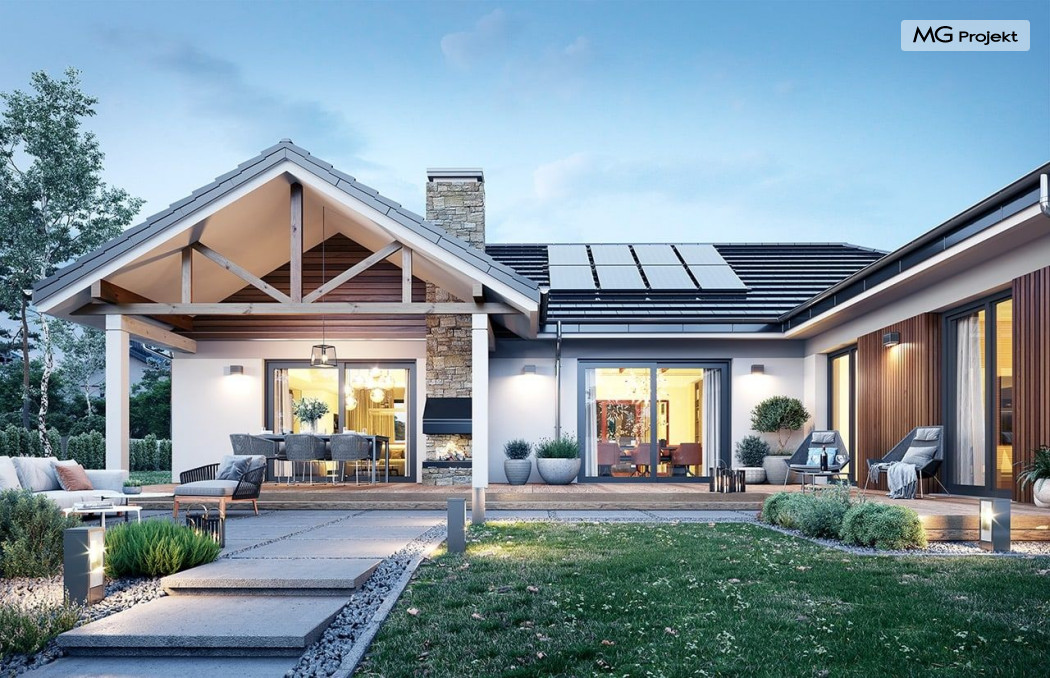 Projekt domu Hanka 3 jest to projekt bardzo ciekawego parterowego domu jednorodzinnego z serii o nazwie ”Hanka”. Dom zaprojektowany został na planie litery „H”, jest przekryty trzema przenikającymi się dachami dwuspadowymi, z programem użytkowym znajdującym się na jednej kondygnacji parteru. Wszystkie elementy domu zostały zaprojektowane tak, aby zapewnić właścicielom maksymalny komfort i wygodę mieszkania - zarówno forma budynku, układ funkcjonalny, jak i rozmieszczenie pomieszczeń. Charakter architektury domu łączy w sobie związki z przyrodą, poszanowanie dla natury z nowoczesną formą i detalami. Dom zaprojektowano blisko ziemi, blisko ogrodu. Wnętrza ściśle połączono z otaczającymi budynek tarasami, podcieniami, wiatami, podestami, rozszerzając wnętrze na działkę Inwestorów. Do domu wchodzimy przez reprezentacyjne drzwi wejściowe z naświetlami bocznymi. Po bokach elewacji frontowej zaprojektowano ogromne okno kuchenne, oraz po przeciwnej stronie wygodną wiatę garażową. Od strony ogrodu głównym elementem kształtującym sylwetkę jest duże zadaszenie tarasu wsparte na słupach, z szerokimi przeszkleniami salonu. Elewacje zdobią kamienne oraz drewniane okładzinę ściany i duże okna.Dachy uformowane w kształt litery „H” urozmaicają bryłę domu i dodają jej uroku. Odpowiednio dobrane detale i materiały wykończeniowe pozwoliły stworzyć w efekcie przyjemną architekturę podmiejskiej komfortowej willi. Wnętrze podzielono na dwie części : jednoprzestrzenną część dzienną, z salonem, jadalnią i kuchnią, oraz cześć z pokojami sypialnymi. Do domu wchodzimy przez obszerny przedsionek wprost do wielkiego holu, który pełni również funkcję pokoju stołowego - jadalni i otwiera się szerokim oknem na taras i otaczający dom ogród. Pomieszczenie ma otwarty do dachu sufit, z dodatkowym doświetleniem oknami połaciowymi. Dalej na lewo przechodzimy do salonu ze ścianą telewizyjną i ścianą z kominkiem, z otwarciem przestrzennym sufitu, oraz szerokim przeszklonym wyjściem na na zadaszony taras. Dopełnieniem wnętrza jest luksusowa piękna kuchnia z aż dwiema wyspami, z dużą ilością blatów roboczych i pełnej zabudowy. Do kuchni możemy dostać się też przez spiżarnię do przedsionka i wygodnego car-portu - wiaty garażowej. Wiata może być pojedyncza z dodatkowym pomieszczeniem gospodarczym, lub podwójna - wedle decyzji Klienta. W części nocnej domu mamy różny układ pokoi w różnych wersjach wariantowych projektu „Hanka”. W Hance 3 mamy : trzy sypialnie dziecięce z wygodną łazienką, oraz apartament rodziców z dużą garderobą, oraz łazienką. Wnętrze jest bardzo komfortowe i zapewni optymalne warunki mieszkania nawet najbardziej wymagającemu Inwestorowi. Dom mimo rozbudowanej bryły ma bardzo prostą konstrukcję, będzie dość łatwy w budowie, a dzięki zastosowanym świetnym izolacjom i nowoczesnym instalacjom budynek będzie energooszczędny i tani w eksploatacji. „Hanka 3” to dom z charakterem, dla Inwestorów szukających oryginalnych nietuzinkowych rozwiązań - marzących o mieszkaniu na parterze blisko ogrodu. Zapraszamy !