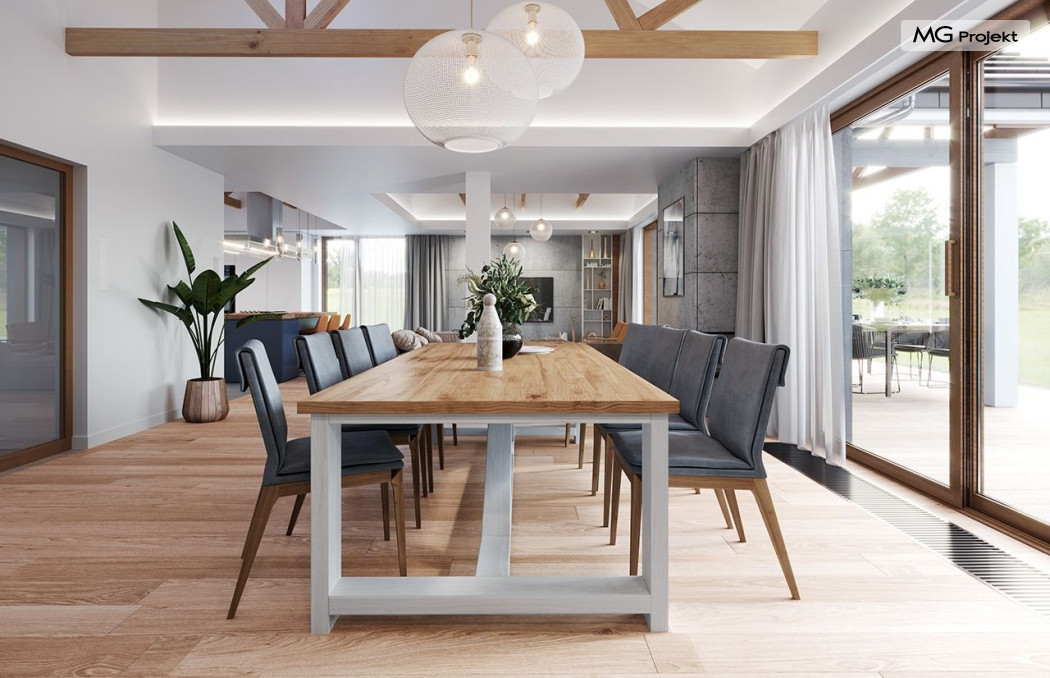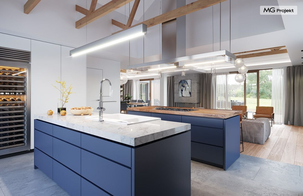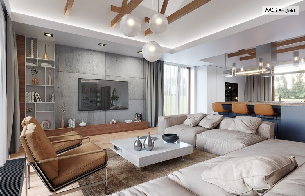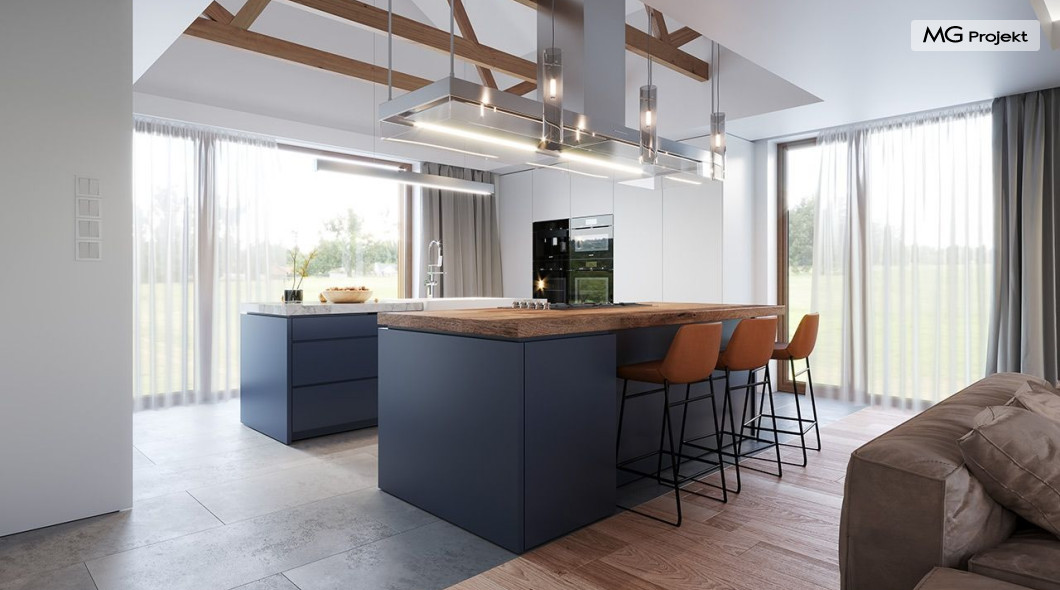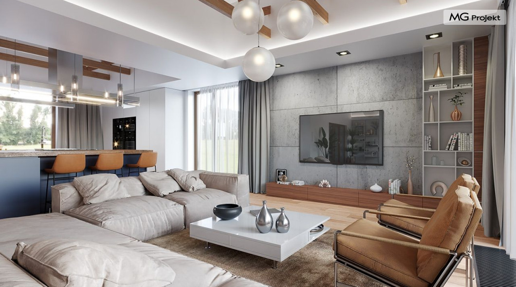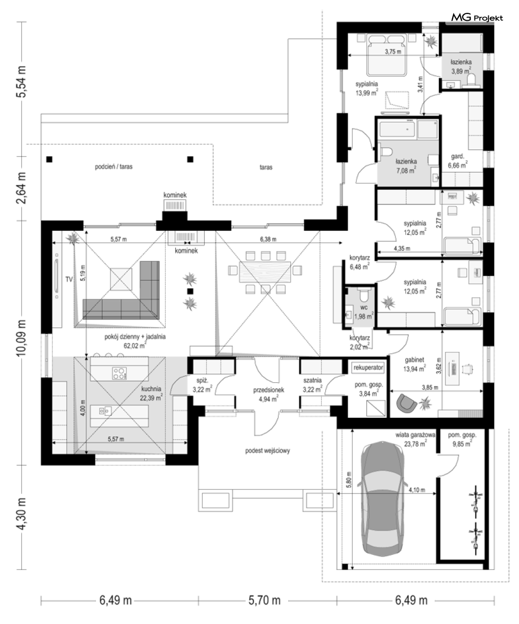 Projekt domu Hanka 3 jest to projekt bardzo ciekawego parterowego domu jednorodzinnego z serii o nazwie ”Hanka”. Dom zaprojektowany został na planie litery „H”, jest przekryty trzema przenikającymi się dachami dwuspadowymi, z programem użytkowym znajdującym się na jednej kondygnacji parteru. Wszystkie elementy domu zostały zaprojektowane tak, aby zapewnić właścicielom maksymalny komfort i wygodę mieszkania - zarówno forma budynku, układ funkcjonalny, jak i rozmieszczenie pomieszczeń. Charakter architektury domu łączy w sobie związki z przyrodą, poszanowanie dla natury z nowoczesną formą i detalami. Dom zaprojektowano blisko ziemi, blisko ogrodu. Wnętrza ściśle połączono z otaczającymi budynek tarasami, podcieniami, wiatami, podestami, rozszerzając wnętrze na działkę Inwestorów. Do domu wchodzimy przez reprezentacyjne drzwi wejściowe z naświetlami bocznymi. Po bokach elewacji frontowej zaprojektowano ogromne okno kuchenne, oraz po przeciwnej stronie wygodną wiatę garażową. Od strony ogrodu głównym elementem kształtującym sylwetkę jest duże zadaszenie tarasu wsparte na słupach, z szerokimi przeszkleniami salonu. Elewacje zdobią kamienne oraz drewniane okładzinę ściany i duże okna.Dachy uformowane w kształt litery „H” urozmaicają bryłę domu i dodają jej uroku. Odpowiednio dobrane detale i materiały wykończeniowe pozwoliły stworzyć w efekcie przyjemną architekturę podmiejskiej komfortowej willi. Wnętrze podzielono na dwie części : jednoprzestrzenną część dzienną, z salonem, jadalnią i kuchnią, oraz cześć z pokojami sypialnymi. Do domu wchodzimy przez obszerny przedsionek wprost do wielkiego holu, który pełni również funkcję pokoju stołowego - jadalni i otwiera się szerokim oknem na taras i otaczający dom ogród. Pomieszczenie ma otwarty do dachu sufit, z dodatkowym doświetleniem oknami połaciowymi. Dalej na lewo przechodzimy do salonu ze ścianą telewizyjną i ścianą z kominkiem, z otwarciem przestrzennym sufitu, oraz szerokim przeszklonym wyjściem na na zadaszony taras. Dopełnieniem wnętrza jest luksusowa piękna kuchnia z aż dwiema wyspami, z dużą ilością blatów roboczych i pełnej zabudowy. Do kuchni możemy dostać się też przez spiżarnię do przedsionka i wygodnego car-portu - wiaty garażowej. Wiata może być pojedyncza z dodatkowym pomieszczeniem gospodarczym, lub podwójna - wedle decyzji Klienta. W części nocnej domu mamy różny układ pokoi w różnych wersjach wariantowych projektu „Hanka”. W Hance 3 mamy : trzy sypialnie dziecięce z wygodną łazienką, oraz apartament rodziców z dużą garderobą, oraz łazienką. Wnętrze jest bardzo komfortowe i zapewni optymalne warunki mieszkania nawet najbardziej wymagającemu Inwestorowi. Dom mimo rozbudowanej bryły ma bardzo prostą konstrukcję, będzie dość łatwy w budowie, a dzięki zastosowanym świetnym izolacjom i nowoczesnym instalacjom budynek będzie energooszczędny i tani w eksploatacji. „Hanka 3” to dom z charakterem, dla Inwestorów szukających oryginalnych nietuzinkowych rozwiązań - marzących o mieszkaniu na parterze blisko ogrodu. Zapraszamy !