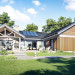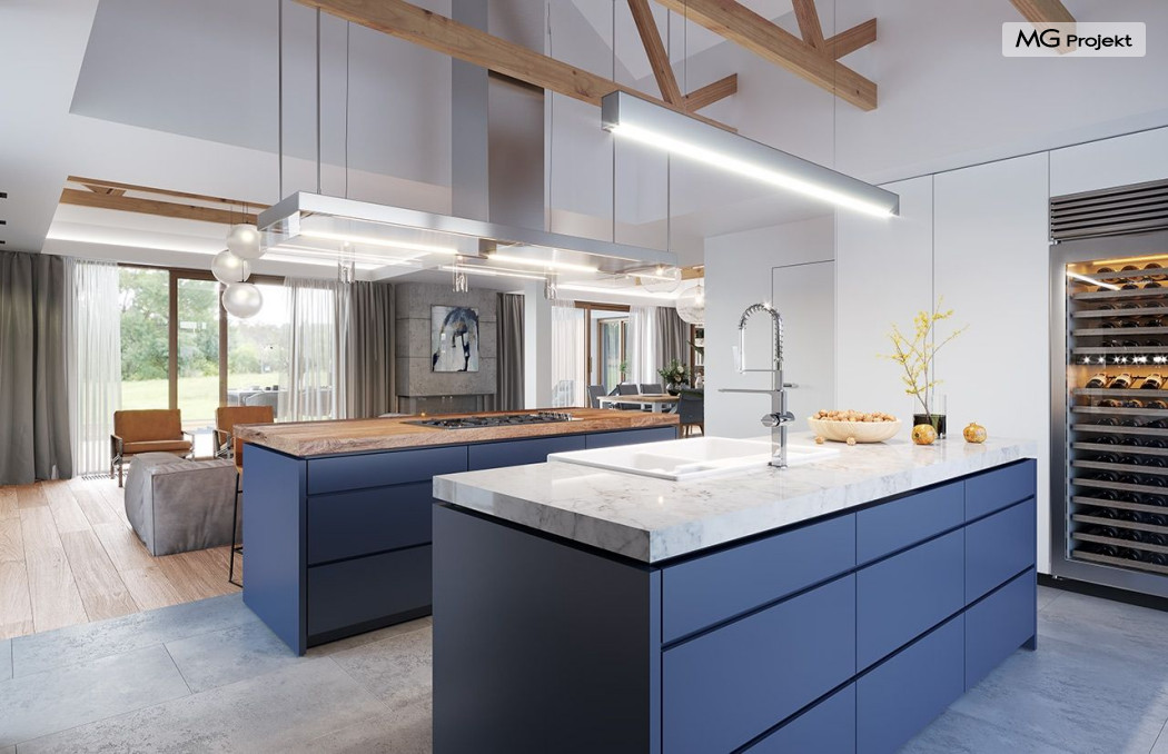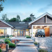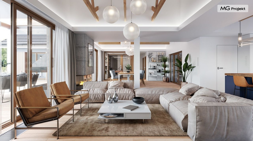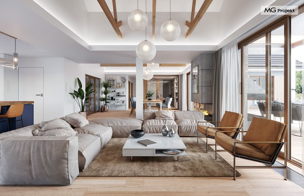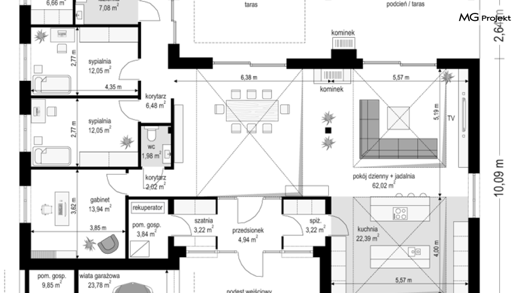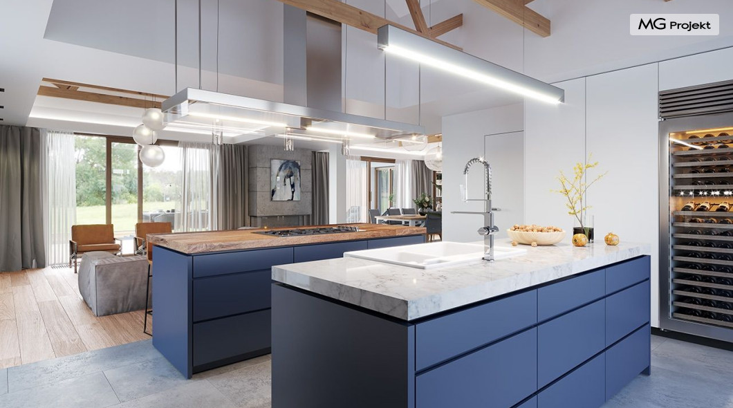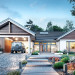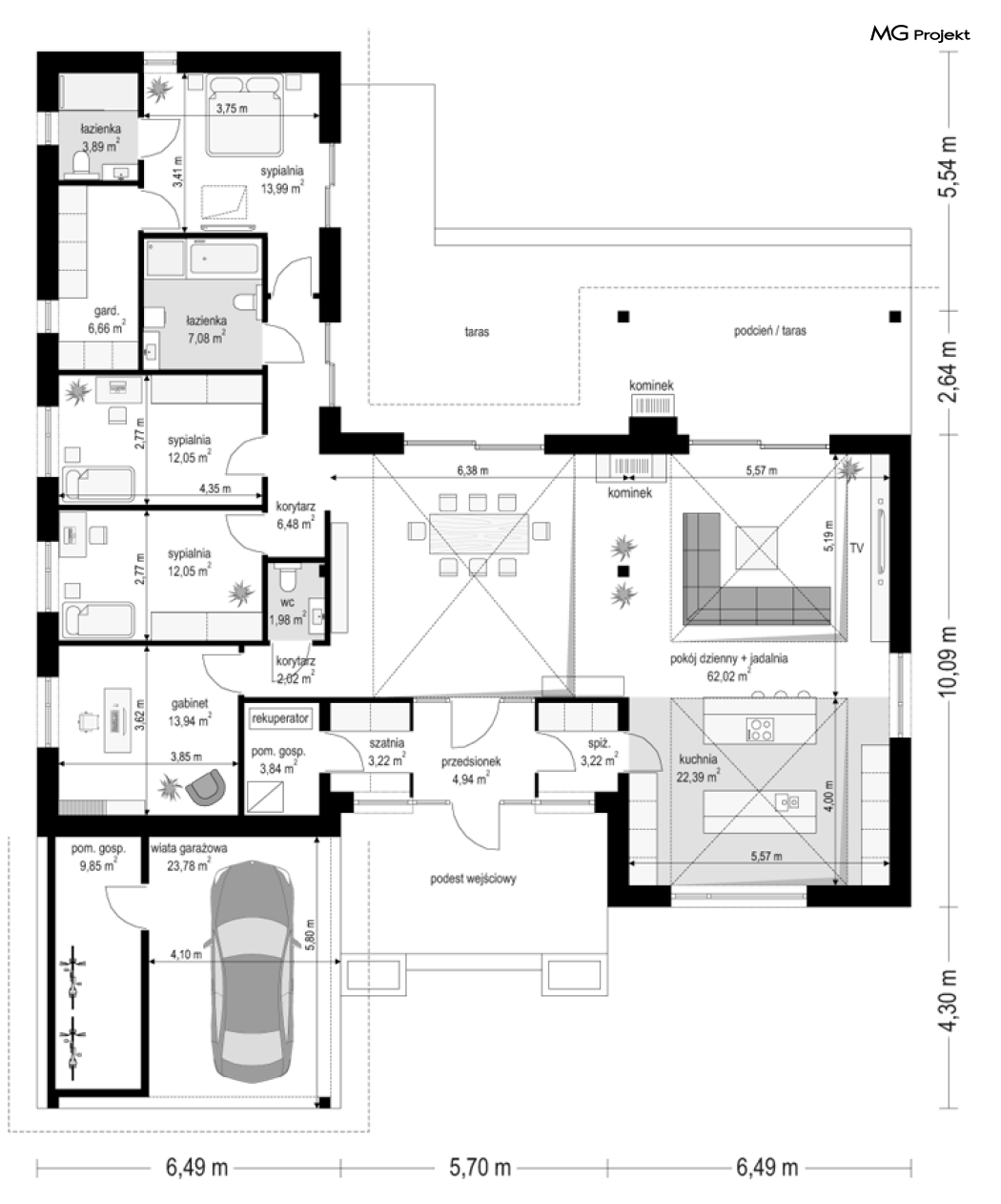 Projekt domu Hanka 3 jest to projekt bardzo ciekawego parterowego domu jednorodzinnego z serii o nazwie ”Hanka”. Dom zaprojektowany został na planie litery „H”, jest przekryty trzema przenikającymi się dachami dwuspadowymi, z programem użytkowym znajdującym się na jednej kondygnacji parteru. Wszystkie elementy domu zostały zaprojektowane tak, aby zapewnić właścicielom maksymalny komfort i wygodę mieszkania - zarówno forma budynku, układ funkcjonalny, jak i rozmieszczenie pomieszczeń. Charakter architektury domu łączy w sobie związki z przyrodą, poszanowanie dla natury z nowoczesną formą i detalami. Dom zaprojektowano blisko ziemi, blisko ogrodu. Wnętrza ściśle połączono z otaczającymi budynek tarasami, podcieniami, wiatami, podestami, rozszerzając wnętrze na działkę Inwestorów. Do domu wchodzimy przez reprezentacyjne drzwi wejściowe z naświetlami bocznymi. Po bokach elewacji frontowej zaprojektowano ogromne okno kuchenne, oraz po przeciwnej stronie wygodną wiatę garażową. Od strony ogrodu głównym elementem kształtującym sylwetkę jest duże zadaszenie tarasu wsparte na słupach, z szerokimi przeszkleniami salonu. Elewacje zdobią kamienne oraz drewniane okładzinę ściany i duże okna.Dachy uformowane w kształt litery „H” urozmaicają bryłę domu i dodają jej uroku. Odpowiednio dobrane detale i materiały wykończeniowe pozwoliły stworzyć w efekcie przyjemną architekturę podmiejskiej komfortowej willi. Wnętrze podzielono na dwie części : jednoprzestrzenną część dzienną, z salonem, jadalnią i kuchnią, oraz cześć z pokojami sypialnymi. Do domu wchodzimy przez obszerny przedsionek wprost do wielkiego holu, który pełni również funkcję pokoju stołowego - jadalni i otwiera się szerokim oknem na taras i otaczający dom ogród. Pomieszczenie ma otwarty do dachu sufit, z dodatkowym doświetleniem oknami połaciowymi. Dalej na lewo przechodzimy do salonu ze ścianą telewizyjną i ścianą z kominkiem, z otwarciem przestrzennym sufitu, oraz szerokim przeszklonym wyjściem na na zadaszony taras. Dopełnieniem wnętrza jest luksusowa piękna kuchnia z aż dwiema wyspami, z dużą ilością blatów roboczych i pełnej zabudowy. Do kuchni możemy dostać się też przez spiżarnię do przedsionka i wygodnego car-portu - wiaty garażowej. Wiata może być pojedyncza z dodatkowym pomieszczeniem gospodarczym, lub podwójna - wedle decyzji Klienta. W części nocnej domu mamy różny układ pokoi w różnych wersjach wariantowych projektu „Hanka”. W Hance 3 mamy : trzy sypialnie dziecięce z wygodną łazienką, oraz apartament rodziców z dużą garderobą, oraz łazienką. Wnętrze jest bardzo komfortowe i zapewni optymalne warunki mieszkania nawet najbardziej wymagającemu Inwestorowi. Dom mimo rozbudowanej bryły ma bardzo prostą konstrukcję, będzie dość łatwy w budowie, a dzięki zastosowanym świetnym izolacjom i nowoczesnym instalacjom budynek będzie energooszczędny i tani w eksploatacji. „Hanka 3” to dom z charakterem, dla Inwestorów szukających oryginalnych nietuzinkowych rozwiązań - marzących o mieszkaniu na parterze blisko ogrodu. Zapraszamy !
