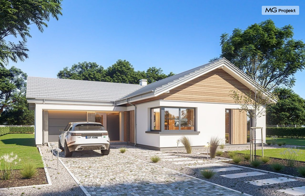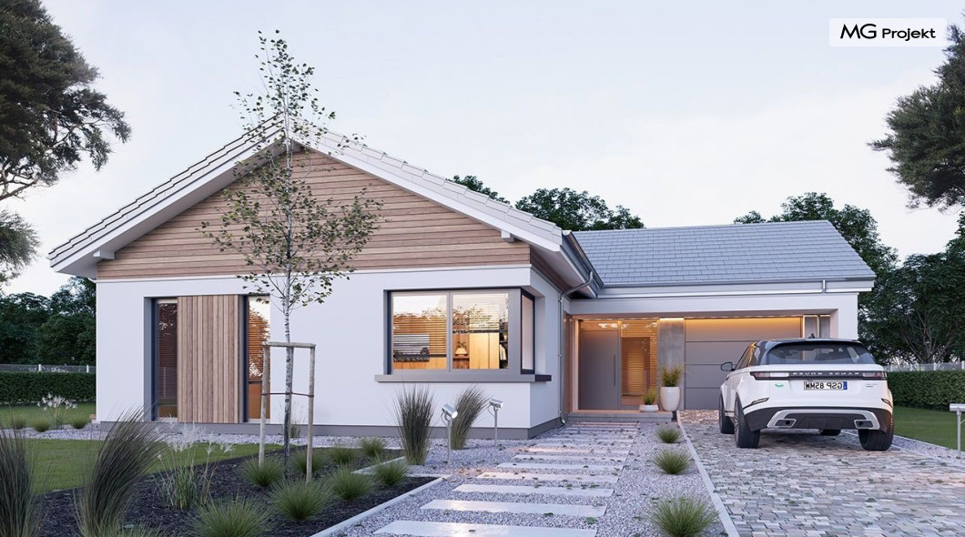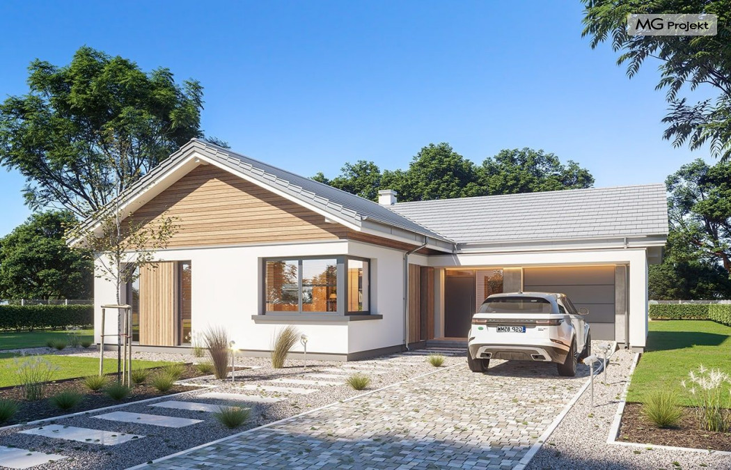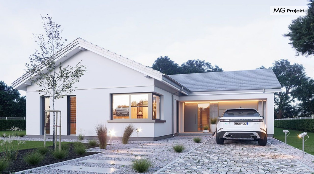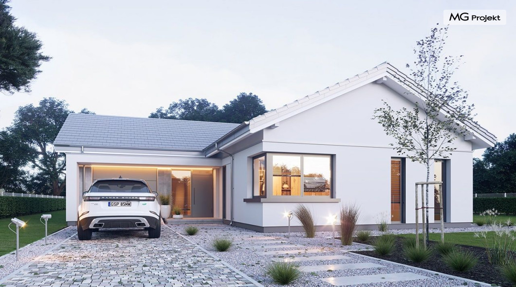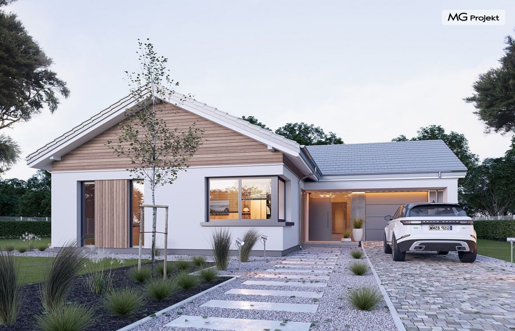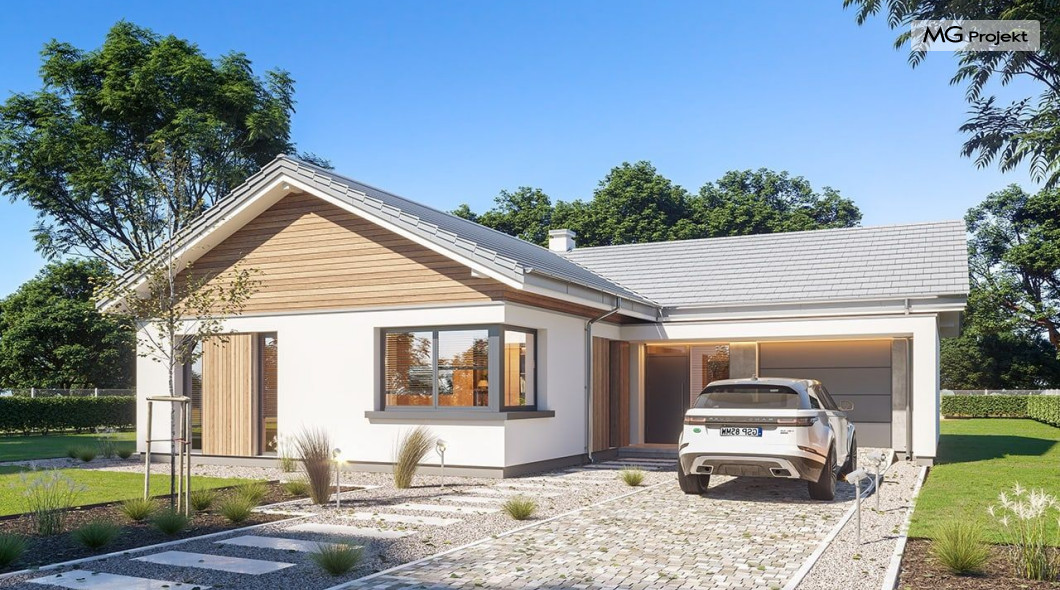 Projekt domu Sielanka 2 B jest kolejną wersją projektu z popularnej serii „Sielanek” z MG Projekt, czyli wersja węższa, z jednostanowiskowym garażem. Jest to projekt parterowego budynku, z bryłą w kształcie litery T, przykrytą dwuspadowymi dachami, z tworzącym długi frontowy podjazd cofniętym garażem z przedsionkiem wejściowym, oraz z elewacją ogrodową z przestronnym zadaszonym tarasem będącym przesłużeniem salonu.Budynek został zaprojektowany dla 3-5ciosobowej rodziny, chcącej wygodnie mieszkać na jednym poziomie, mającej bezpośredni kontakt z otaczającym ogrodem, bez chodzenia po schodach. Dom nadaje się na działkę z ogrodem z tyłu lub z boku budynku - zależnie od jego posadowienia i orientacji względem stron świata. Architektura jest nowoczesna i prosta, przypominająca skandynawskie czy północnoeuropejskie bungalowy. Front budynku urozmaicono narożnym oknem pokoju i reprezentacyjnymi drzwiami wejściowymi z naświetlem bocznym pod zadaszeniem podestu wejściowego. Zastosowane materiały i kolorystyka są udanym połączeniem nowoczesności z tradycją. Połączenie białych ścian, szarą lub grafitową dachówką, oraz kontrastowymi elementami wykończenia dają intersujący i wyróżniający dom efekt. Od strony ogrodu główną rolę odgrywają piękne przeszklenia pokoi, zadaszenie tarasu, oraz same tarasy w kształcie litery L. Dom ma minimalistyczną architekturę, ale to właśnie go wyróżnia i czyni wyjątkowym. Wnętrze budynku podzielono na strefy : w części środkowej mamy ogólną przestrzeń dzienną do życia, po lewej stronie część garażowo-gospodarczą, a z prawej strony - pokoje sypialne z zapleczem. Do domu wchodzimy z zadaszonego podestu wejściowego szerokimi doświetlonymi drzwiami do obszernego przedsionka z szatnią i następnie do holu połączonego przestrzennie z salonem i kuchnią. Kuchnia jest otwarta na salon, oraz na ogród. Salon z pustką nad sufitem aż do kalenicy dachu jest bardzo ładnym pomieszczeniem o dużej kubaturze. Z holu korytarzem przechodzimy do części prywatnej, gdzie znajdziemy 4 pokoje, wśród nich sypialnię master z podwójną garderobą. Całość tej części dopełnia duża łazienka, wc i pomieszczenie na pralkę, suszarkę i kosze do prania. W części gospodarczej znajdziemy duży dwustanowiskowy garaż, z magazynem, oraz kotłownię. Nad przeważającą częścią parteru zaprojektowano przestrzeń strychową - magazyn domowych rzeczy „nadprogramowych”, dostępną ze schodków drabinkowych z holu. Konstrukcyjne dom jest zaprojektowany bardzo prosto. Prace murarskie i betoniarskie kończą się na wieńcach nad ścianami parteru. Następnie pozostała konstrukcja to układ drewnianych wiązarów prefabrykowanych, tworzących strop nad parterem, oraz więźbę dachową. Takie rozwiązanie znakomicie upraszcza budowę, przyspiesza ją - i przede wszystkim obniża koszty. Dom zaprojektowano jako energooszczędny, z dobrymi izolacjami i nowoczesnymi instalacjami. Budynek jest łatwy i szybki w budowie i będzie niedrogi w późniejszej eksploatacji. To świetna propozycja dla Inwestorów szukających domu parterowego, wygodnego i ekonomicznego. Zapraszamy do zapoznania się ze wszystkimi projektami z serii Sielanka: https://www.mgprojekt.com.pl/sielanka, https://www.mgprojekt.com.pl/sielanka-2, https://www.mgprojekt.com.pl/sielanka-2-b, https://www.mgprojekt.com.pl/sielanka-3, https://www.mgprojekt.com.pl/sielanka-4.