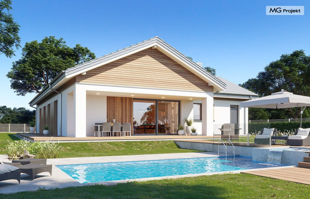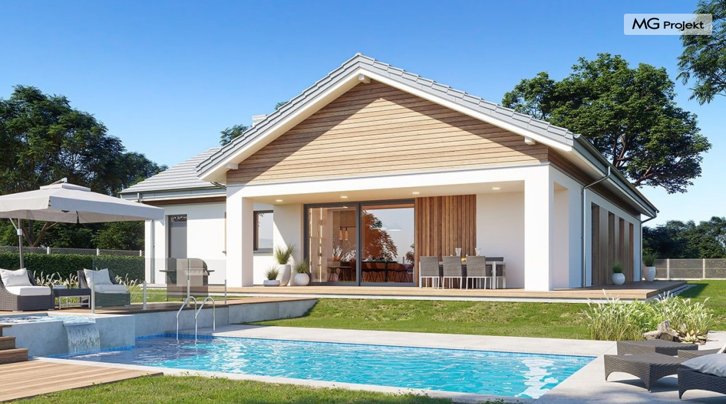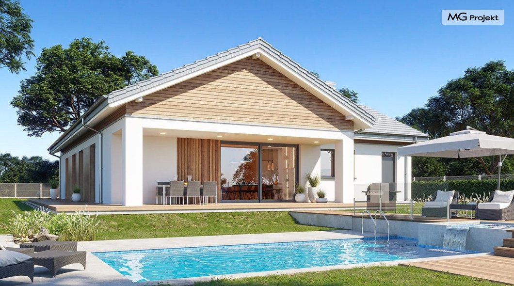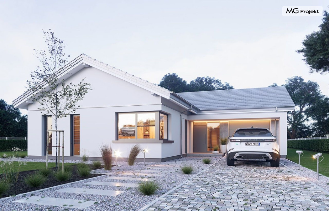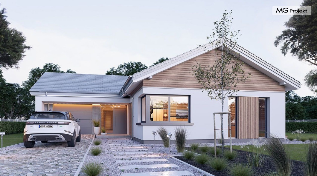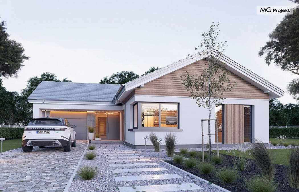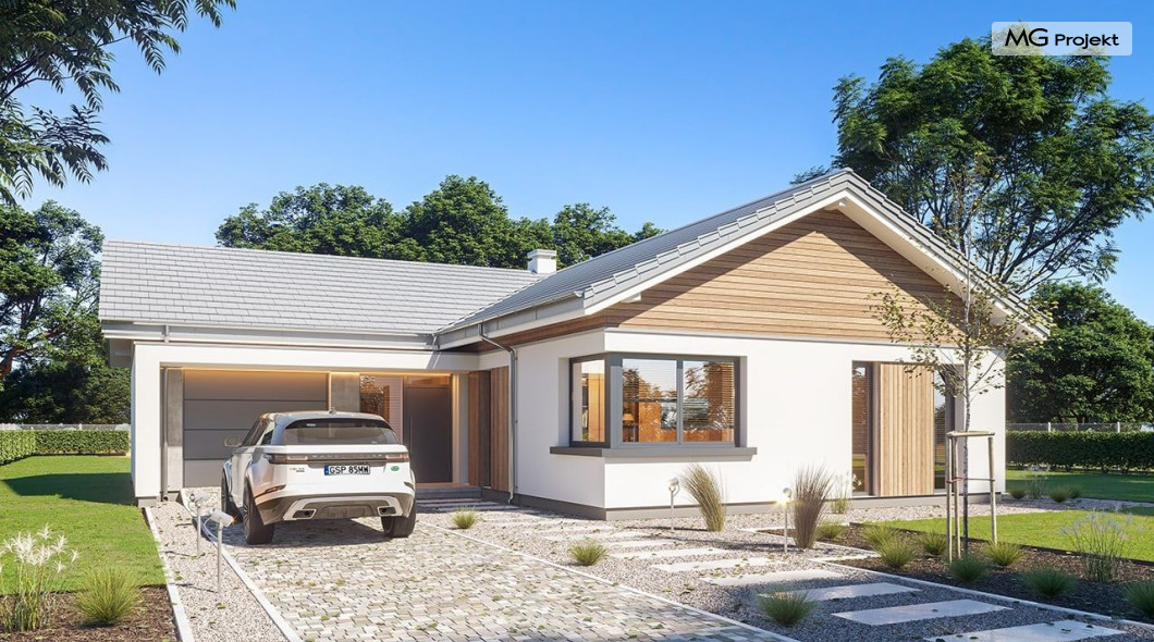 Projekt domu Sielanka 2 B jest kolejną wersją projektu z popularnej serii „Sielanek” z MG Projekt, czyli wersja węższa, z jednostanowiskowym garażem. Jest to projekt parterowego budynku, z bryłą w kształcie litery T, przykrytą dwuspadowymi dachami, z tworzącym długi frontowy podjazd cofniętym garażem z przedsionkiem wejściowym, oraz z elewacją ogrodową z przestronnym zadaszonym tarasem będącym przesłużeniem salonu.Budynek został zaprojektowany dla 3-5ciosobowej rodziny, chcącej wygodnie mieszkać na jednym poziomie, mającej bezpośredni kontakt z otaczającym ogrodem, bez chodzenia po schodach. Dom nadaje się na działkę z ogrodem z tyłu lub z boku budynku - zależnie od jego posadowienia i orientacji względem stron świata. Architektura jest nowoczesna i prosta, przypominająca skandynawskie czy północnoeuropejskie bungalowy. Front budynku urozmaicono narożnym oknem pokoju i reprezentacyjnymi drzwiami wejściowymi z naświetlem bocznym pod zadaszeniem podestu wejściowego. Zastosowane materiały i kolorystyka są udanym połączeniem nowoczesności z tradycją. Połączenie białych ścian, szarą lub grafitową dachówką, oraz kontrastowymi elementami wykończenia dają intersujący i wyróżniający dom efekt. Od strony ogrodu główną rolę odgrywają piękne przeszklenia pokoi, zadaszenie tarasu, oraz same tarasy w kształcie litery L. Dom ma minimalistyczną architekturę, ale to właśnie go wyróżnia i czyni wyjątkowym. Wnętrze budynku podzielono na strefy : w części środkowej mamy ogólną przestrzeń dzienną do życia, po lewej stronie część garażowo-gospodarczą, a z prawej strony - pokoje sypialne z zapleczem. Do domu wchodzimy z zadaszonego podestu wejściowego szerokimi doświetlonymi drzwiami do obszernego przedsionka z szatnią i następnie do holu połączonego przestrzennie z salonem i kuchnią. Kuchnia jest otwarta na salon, oraz na ogród. Salon z pustką nad sufitem aż do kalenicy dachu jest bardzo ładnym pomieszczeniem o dużej kubaturze. Z holu korytarzem przechodzimy do części prywatnej, gdzie znajdziemy 4 pokoje, wśród nich sypialnię master z podwójną garderobą. Całość tej części dopełnia duża łazienka, wc i pomieszczenie na pralkę, suszarkę i kosze do prania. W części gospodarczej znajdziemy duży dwustanowiskowy garaż, z magazynem, oraz kotłownię. Nad przeważającą częścią parteru zaprojektowano przestrzeń strychową - magazyn domowych rzeczy „nadprogramowych”, dostępną ze schodków drabinkowych z holu. Konstrukcyjne dom jest zaprojektowany bardzo prosto. Prace murarskie i betoniarskie kończą się na wieńcach nad ścianami parteru. Następnie pozostała konstrukcja to układ drewnianych wiązarów prefabrykowanych, tworzących strop nad parterem, oraz więźbę dachową. Takie rozwiązanie znakomicie upraszcza budowę, przyspiesza ją - i przede wszystkim obniża koszty. Dom zaprojektowano jako energooszczędny, z dobrymi izolacjami i nowoczesnymi instalacjami. Budynek jest łatwy i szybki w budowie i będzie niedrogi w późniejszej eksploatacji. To świetna propozycja dla Inwestorów szukających domu parterowego, wygodnego i ekonomicznego. Zapraszamy do zapoznania się ze wszystkimi projektami z serii Sielanka: https://www.mgprojekt.com.pl/sielanka, https://www.mgprojekt.com.pl/sielanka-2, https://www.mgprojekt.com.pl/sielanka-2-b, https://www.mgprojekt.com.pl/sielanka-3, https://www.mgprojekt.com.pl/sielanka-4.