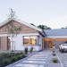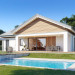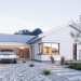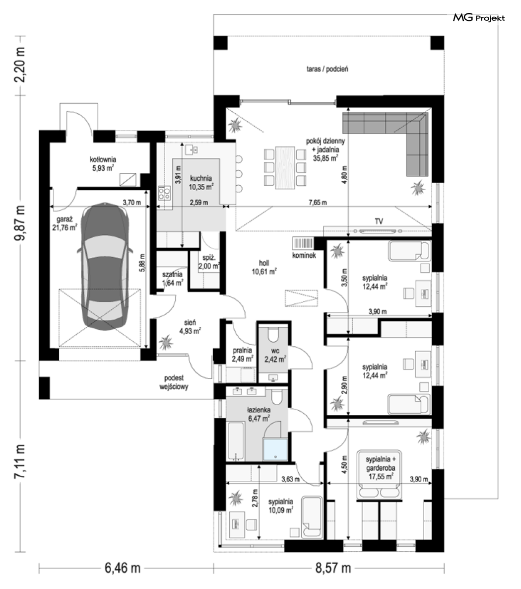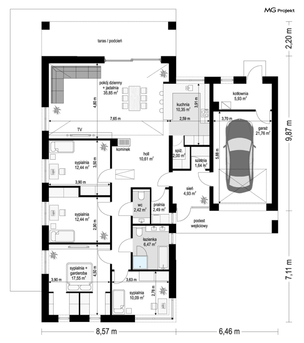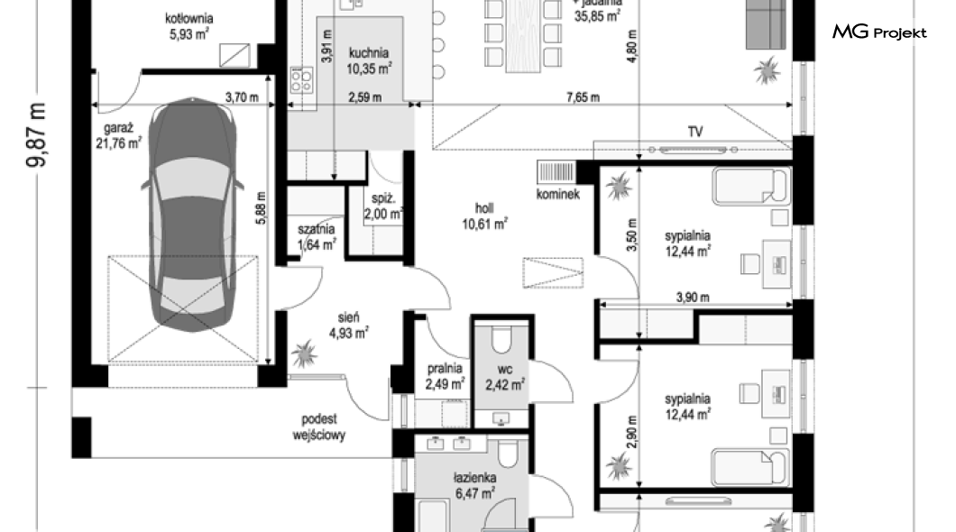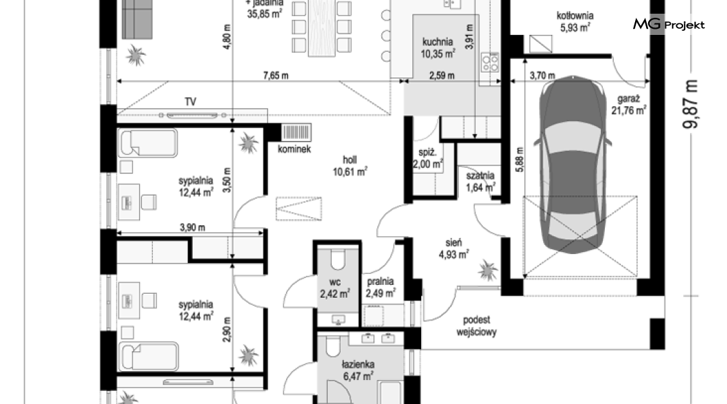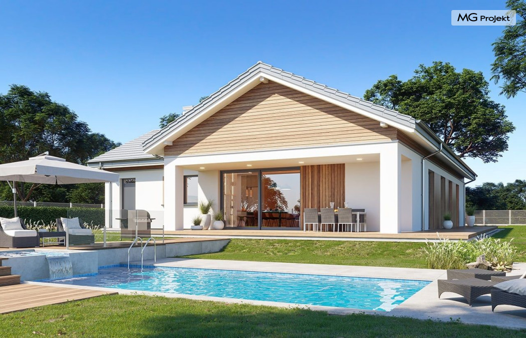 Projekt domu Sielanka 2 B jest kolejną wersją projektu z popularnej serii „Sielanek” z MG Projekt, czyli wersja węższa, z jednostanowiskowym garażem. Jest to projekt parterowego budynku, z bryłą w kształcie litery T, przykrytą dwuspadowymi dachami, z tworzącym długi frontowy podjazd cofniętym garażem z przedsionkiem wejściowym, oraz z elewacją ogrodową z przestronnym zadaszonym tarasem będącym przesłużeniem salonu.Budynek został zaprojektowany dla 3-5ciosobowej rodziny, chcącej wygodnie mieszkać na jednym poziomie, mającej bezpośredni kontakt z otaczającym ogrodem, bez chodzenia po schodach. Dom nadaje się na działkę z ogrodem z tyłu lub z boku budynku - zależnie od jego posadowienia i orientacji względem stron świata. Architektura jest nowoczesna i prosta, przypominająca skandynawskie czy północnoeuropejskie bungalowy. Front budynku urozmaicono narożnym oknem pokoju i reprezentacyjnymi drzwiami wejściowymi z naświetlem bocznym pod zadaszeniem podestu wejściowego. Zastosowane materiały i kolorystyka są udanym połączeniem nowoczesności z tradycją. Połączenie białych ścian, szarą lub grafitową dachówką, oraz kontrastowymi elementami wykończenia dają intersujący i wyróżniający dom efekt. Od strony ogrodu główną rolę odgrywają piękne przeszklenia pokoi, zadaszenie tarasu, oraz same tarasy w kształcie litery L. Dom ma minimalistyczną architekturę, ale to właśnie go wyróżnia i czyni wyjątkowym. Wnętrze budynku podzielono na strefy : w części środkowej mamy ogólną przestrzeń dzienną do życia, po lewej stronie część garażowo-gospodarczą, a z prawej strony - pokoje sypialne z zapleczem. Do domu wchodzimy z zadaszonego podestu wejściowego szerokimi doświetlonymi drzwiami do obszernego przedsionka z szatnią i następnie do holu połączonego przestrzennie z salonem i kuchnią. Kuchnia jest otwarta na salon, oraz na ogród. Salon z pustką nad sufitem aż do kalenicy dachu jest bardzo ładnym pomieszczeniem o dużej kubaturze. Z holu korytarzem przechodzimy do części prywatnej, gdzie znajdziemy 4 pokoje, wśród nich sypialnię master z podwójną garderobą. Całość tej części dopełnia duża łazienka, wc i pomieszczenie na pralkę, suszarkę i kosze do prania. W części gospodarczej znajdziemy duży dwustanowiskowy garaż, z magazynem, oraz kotłownię. Nad przeważającą częścią parteru zaprojektowano przestrzeń strychową - magazyn domowych rzeczy „nadprogramowych”, dostępną ze schodków drabinkowych z holu. Konstrukcyjne dom jest zaprojektowany bardzo prosto. Prace murarskie i betoniarskie kończą się na wieńcach nad ścianami parteru. Następnie pozostała konstrukcja to układ drewnianych wiązarów prefabrykowanych, tworzących strop nad parterem, oraz więźbę dachową. Takie rozwiązanie znakomicie upraszcza budowę, przyspiesza ją - i przede wszystkim obniża koszty. Dom zaprojektowano jako energooszczędny, z dobrymi izolacjami i nowoczesnymi instalacjami. Budynek jest łatwy i szybki w budowie i będzie niedrogi w późniejszej eksploatacji. To świetna propozycja dla Inwestorów szukających domu parterowego, wygodnego i ekonomicznego. Zapraszamy do zapoznania się ze wszystkimi projektami z serii Sielanka: https://www.mgprojekt.com.pl/sielanka, https://www.mgprojekt.com.pl/sielanka-2, https://www.mgprojekt.com.pl/sielanka-2-b, https://www.mgprojekt.com.pl/sielanka-3, https://www.mgprojekt.com.pl/sielanka-4.