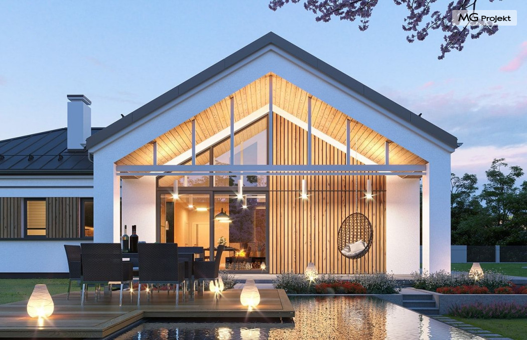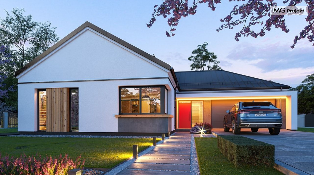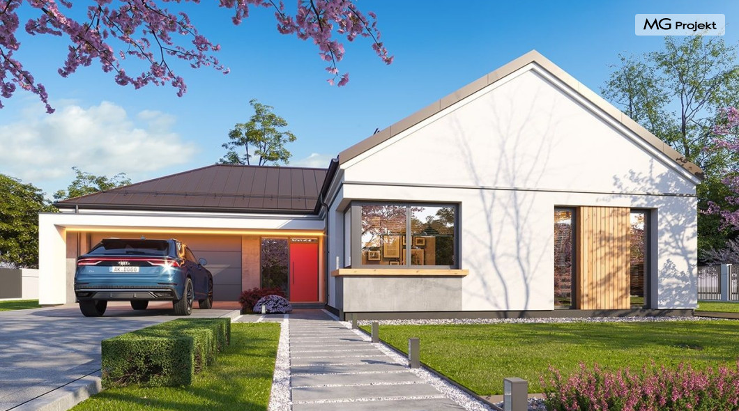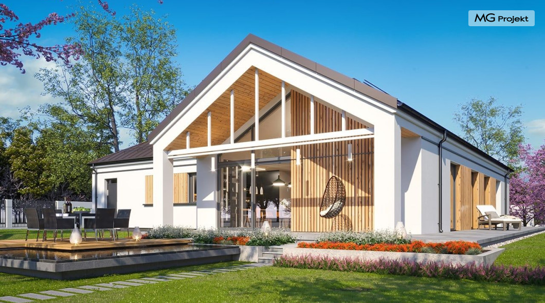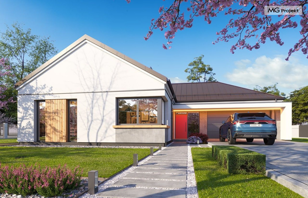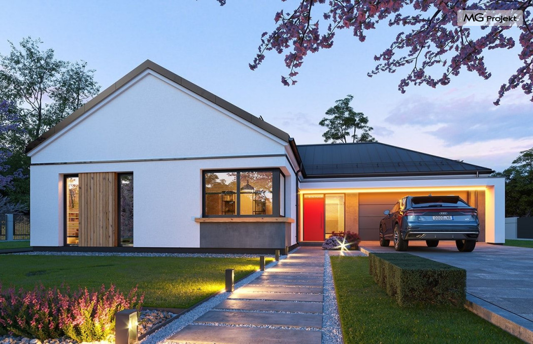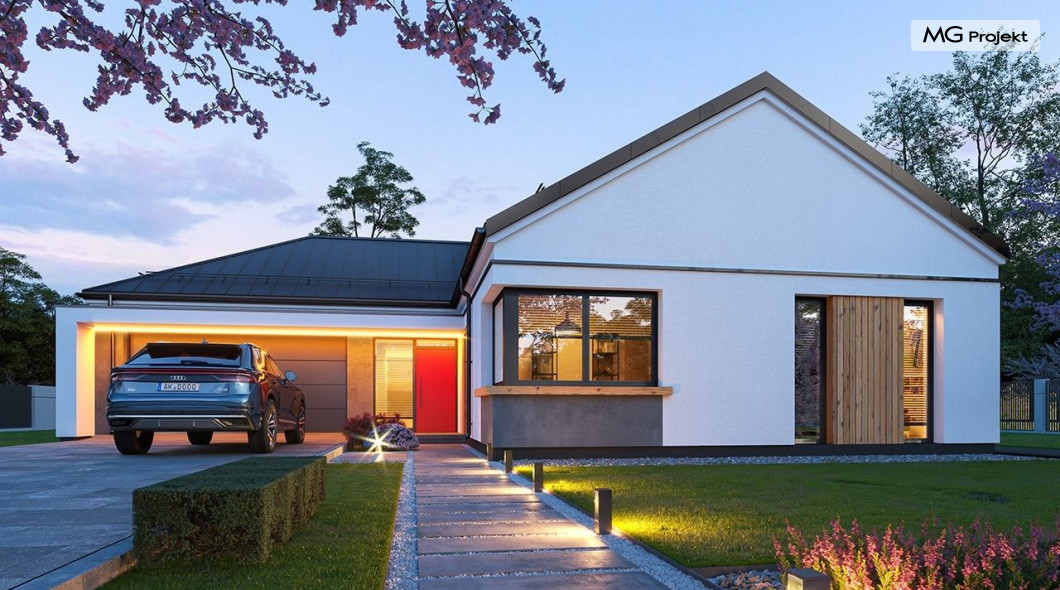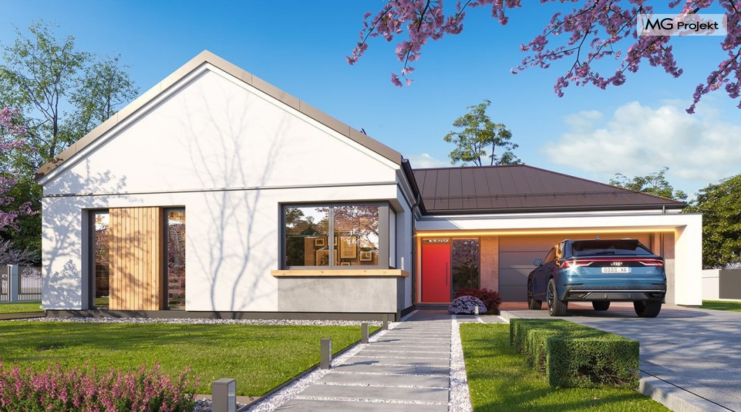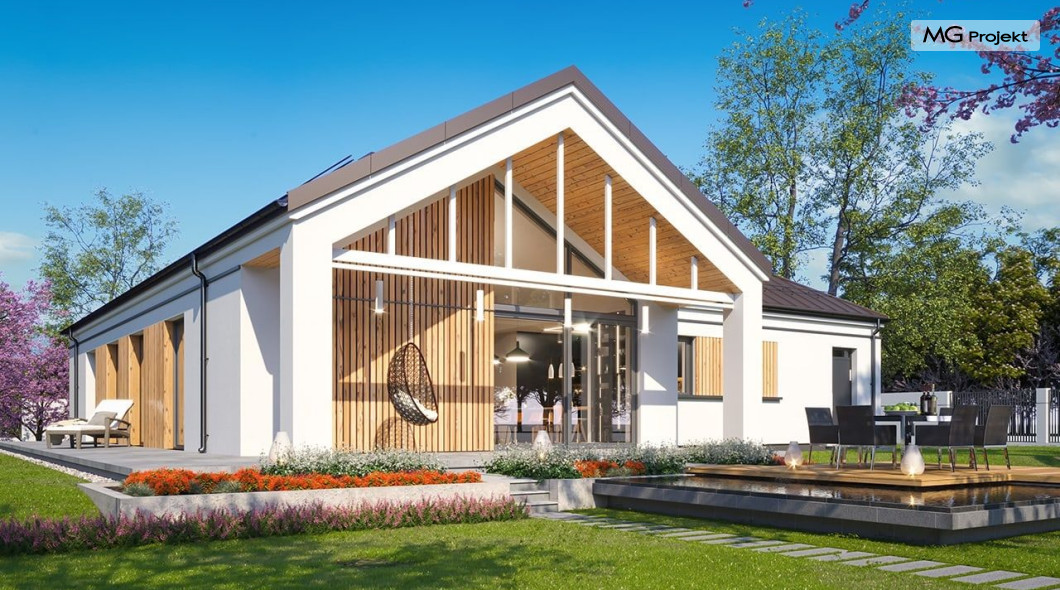 Projekt domu Sielanka 4 jest kolejną wersją projektu z popularnej serii „Sielanek” z MG Projekt. Jest to wersja w architekturze nowoczesnej, z dachami bez okapów, zbliżonej do stylistyki „domu-stodoły”. Sielanka 4 to projekt parterowego budynku, rzutem o kształcie litery T, z główną bryłą z dachem dwuspadowym i dobudowaną częścią garażową przykrytą wielospadowym dachem. Dom z cofniętym garażem i wejściem tworzącym duży placyk – podjazd frontowy. Z elewacją ogrodową z oryginalnym dużym zadaszonym tarasem -przesłużeniem salonu. Budynek zaprojektowano dla 4-5ciosobowej rodziny, chcącej komfortowo mieszkać w parterowym domu, bez biegania po schodach, z bezpośrednim dostępem do ogrodu z każdego pokoju. Dom nadaje się na działkę z ogrodem z tyłu lub z od strony bocznej - zależnie od jego posadowienia i orientacji względem stron świata. Architektura budynku jest nowoczesna, wykorzystująca modne materiały i zestawienia kolorystyczne, korzysta z modnego języka detali wykorzystywanego we współczesnych domach jednorodzinnych. Front budynku urozmaicono ciekawym podcieniem wejściowym z szerokimi drzwiami z naświetlem bocznym. Dodatkową ozdobą jest narożne okno i okna do podłogi rozdzielone drewnianą okładziną ściany. Od strony ogrodu najważniejszym elementem jest interesująco zaprojektowany podcień – zadaszenie tarasu, ozdobiony pięknymi przeszkleniami salonu i okładziną drewnianą. Całość domu przykryta jest dachem z blachy na rąbek stojący w grafitowym kolorze, badącym znakomitym kontrastem dla białych elewacji. Wnętrze budynku podzielono na strefy : w części środkowej mamy ogólną przestrzeń dzienną do życia, po lewej stronie część garażowo-gospodarczą, a z prawej strony - pokoje sypialne z łazienkami garderobami. Do domu wchodzimy z zadaszonego podestu szerokimi doświetlonymi drzwiami do przedsionka z szatnią i następnie do holu połączonego przestrzennie z salonem i kuchnią. Kuchnia jest tutaj otwarta na salon i na ogród. Pokój dzienny ma podniesiony sufit aż do kalenicy dachu, dzięki czemu jest w nim jeszcze więcej przestrzeni i powietrza. Z salonu rozpościera się piękny widok na ogród przez dwukondygnacyjne szerokie okno. Z holu korytarzem przechodzimy do części prywatnej, gdzie znajdziemy 4 pokoje, wśród nich sypialnię master z podwójną garderobą. Wnętrze dopełnia duża łazienka, wc i pomieszczenie na pralkę, suszarkę i kosze do prania. W części gospodarczej znajdziemy duży dwustanowiskowy garaż, z magazynem, oraz kotłownię. Nad częścią parteru zaprojektowano przestrzeń strychową - magazyn domowych rzeczy „nadprogramowych”.Konstrukcyjne dom jest zaprojektowany w bardzo prosty sposób. Prace murarskie i betoniarskie kończą się na wieńcach nad ścianami parteru. Pozostała konstrukcja budynku to układ drewnianych wiązarów prefabrykowanych, tworzących strop nad parterem, oraz więźbę dachową. Takie rozwiązanie znakomicie upraszcza budowę, przyspiesza ją - i przede wszystkim obniża koszty. Dom zaprojektowano jako energooszczędny, z dobrymi izolacjami i nowoczesnymi instalacjami. Budynek jest łatwy i szybki w budowie i będzie niedrogi w późniejszej eksploatacji. To świetna propozycja dla Inwestorów szukających domu parterowego, wygodnego i ekonomicznego, a zarazem na wskroś nowoczesnego i oryginalnego. Zapraszamy do zapoznania się ze wszystkimi projektami z serii Sielanka: https://www.mgprojekt.com.pl/sielanka, https://www.mgprojekt.com.pl/sielanka-2, https://www.mgprojekt.com.pl/sielanka-2-b, https://www.mgprojekt.com.pl/sielanka-3, https://www.mgprojekt.com.pl/sielanka-4.