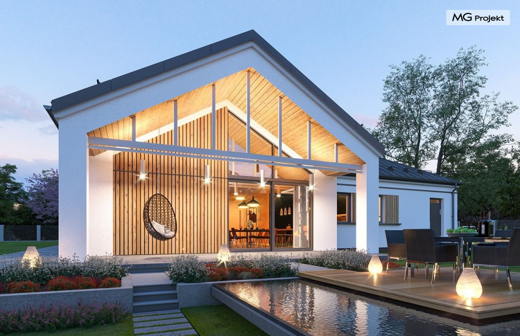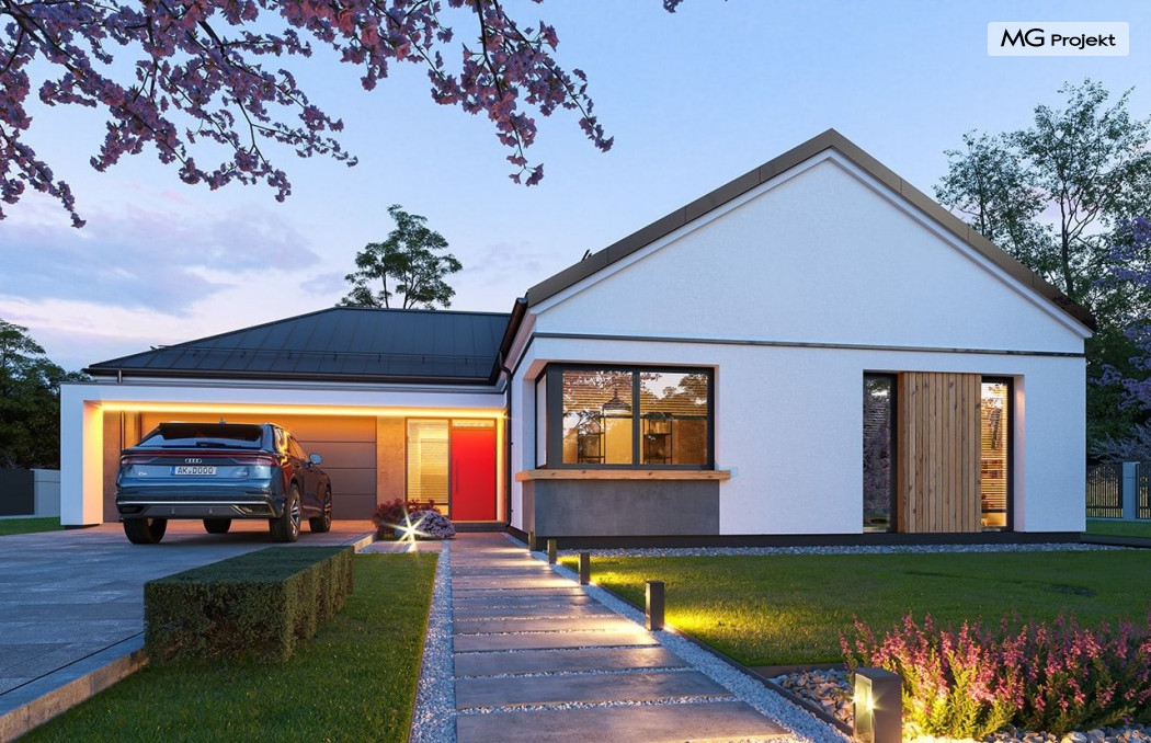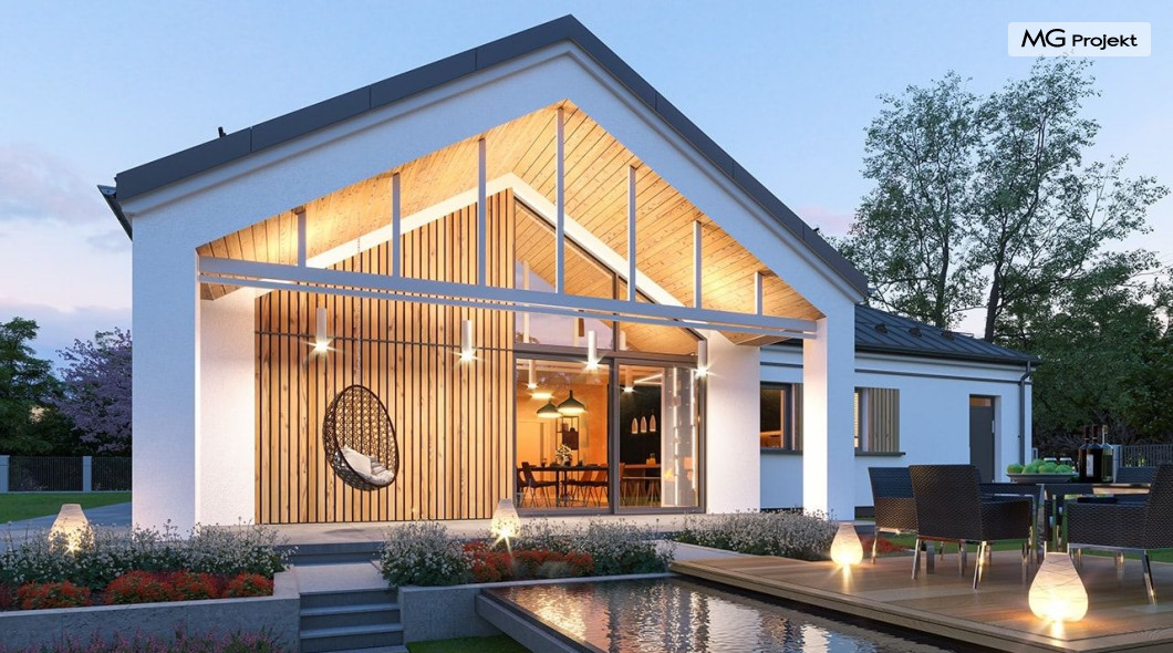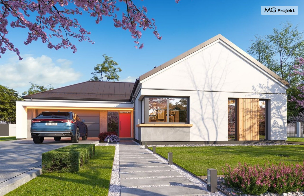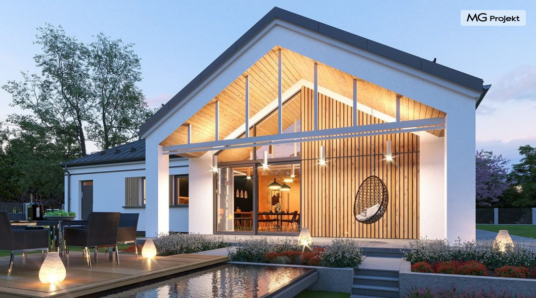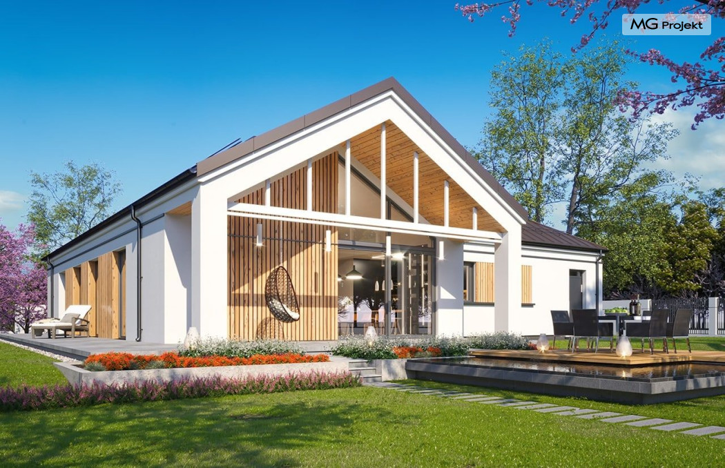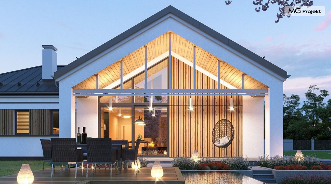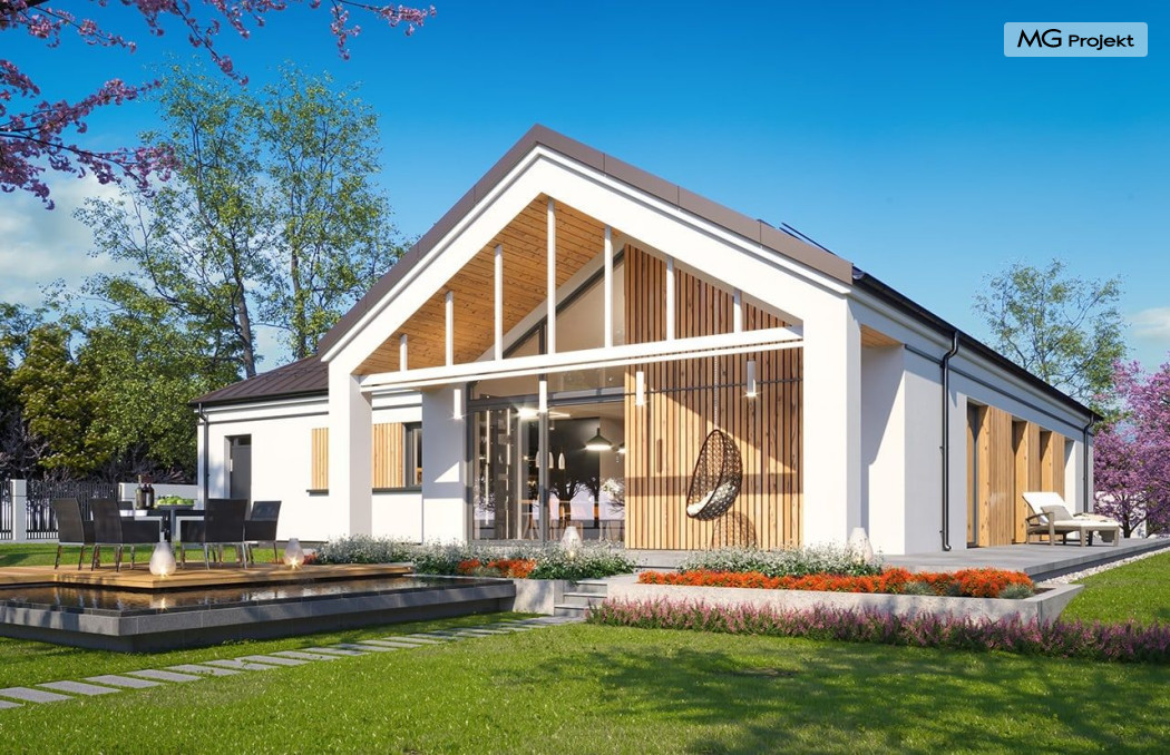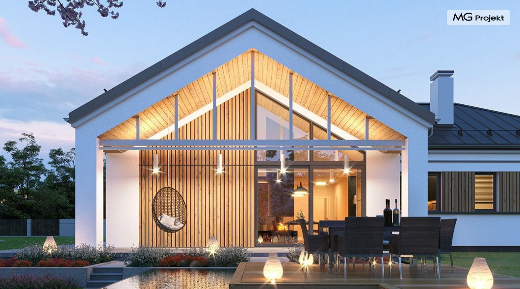 Projekt domu Sielanka 4 jest kolejną wersją projektu z popularnej serii „Sielanek” z MG Projekt. Jest to wersja w architekturze nowoczesnej, z dachami bez okapów, zbliżonej do stylistyki „domu-stodoły”. Sielanka 4 to projekt parterowego budynku, rzutem o kształcie litery T, z główną bryłą z dachem dwuspadowym i dobudowaną częścią garażową przykrytą wielospadowym dachem. Dom z cofniętym garażem i wejściem tworzącym duży placyk – podjazd frontowy. Z elewacją ogrodową z oryginalnym dużym zadaszonym tarasem -przesłużeniem salonu. Budynek zaprojektowano dla 4-5ciosobowej rodziny, chcącej komfortowo mieszkać w parterowym domu, bez biegania po schodach, z bezpośrednim dostępem do ogrodu z każdego pokoju. Dom nadaje się na działkę z ogrodem z tyłu lub z od strony bocznej - zależnie od jego posadowienia i orientacji względem stron świata. Architektura budynku jest nowoczesna, wykorzystująca modne materiały i zestawienia kolorystyczne, korzysta z modnego języka detali wykorzystywanego we współczesnych domach jednorodzinnych. Front budynku urozmaicono ciekawym podcieniem wejściowym z szerokimi drzwiami z naświetlem bocznym. Dodatkową ozdobą jest narożne okno i okna do podłogi rozdzielone drewnianą okładziną ściany. Od strony ogrodu najważniejszym elementem jest interesująco zaprojektowany podcień – zadaszenie tarasu, ozdobiony pięknymi przeszkleniami salonu i okładziną drewnianą. Całość domu przykryta jest dachem z blachy na rąbek stojący w grafitowym kolorze, badącym znakomitym kontrastem dla białych elewacji. Wnętrze budynku podzielono na strefy : w części środkowej mamy ogólną przestrzeń dzienną do życia, po lewej stronie część garażowo-gospodarczą, a z prawej strony - pokoje sypialne z łazienkami garderobami. Do domu wchodzimy z zadaszonego podestu szerokimi doświetlonymi drzwiami do przedsionka z szatnią i następnie do holu połączonego przestrzennie z salonem i kuchnią. Kuchnia jest tutaj otwarta na salon i na ogród. Pokój dzienny ma podniesiony sufit aż do kalenicy dachu, dzięki czemu jest w nim jeszcze więcej przestrzeni i powietrza. Z salonu rozpościera się piękny widok na ogród przez dwukondygnacyjne szerokie okno. Z holu korytarzem przechodzimy do części prywatnej, gdzie znajdziemy 4 pokoje, wśród nich sypialnię master z podwójną garderobą. Wnętrze dopełnia duża łazienka, wc i pomieszczenie na pralkę, suszarkę i kosze do prania. W części gospodarczej znajdziemy duży dwustanowiskowy garaż, z magazynem, oraz kotłownię. Nad częścią parteru zaprojektowano przestrzeń strychową - magazyn domowych rzeczy „nadprogramowych”.Konstrukcyjne dom jest zaprojektowany w bardzo prosty sposób. Prace murarskie i betoniarskie kończą się na wieńcach nad ścianami parteru. Pozostała konstrukcja budynku to układ drewnianych wiązarów prefabrykowanych, tworzących strop nad parterem, oraz więźbę dachową. Takie rozwiązanie znakomicie upraszcza budowę, przyspiesza ją - i przede wszystkim obniża koszty. Dom zaprojektowano jako energooszczędny, z dobrymi izolacjami i nowoczesnymi instalacjami. Budynek jest łatwy i szybki w budowie i będzie niedrogi w późniejszej eksploatacji. To świetna propozycja dla Inwestorów szukających domu parterowego, wygodnego i ekonomicznego, a zarazem na wskroś nowoczesnego i oryginalnego. Zapraszamy do zapoznania się ze wszystkimi projektami z serii Sielanka: https://www.mgprojekt.com.pl/sielanka, https://www.mgprojekt.com.pl/sielanka-2, https://www.mgprojekt.com.pl/sielanka-2-b, https://www.mgprojekt.com.pl/sielanka-3, https://www.mgprojekt.com.pl/sielanka-4.