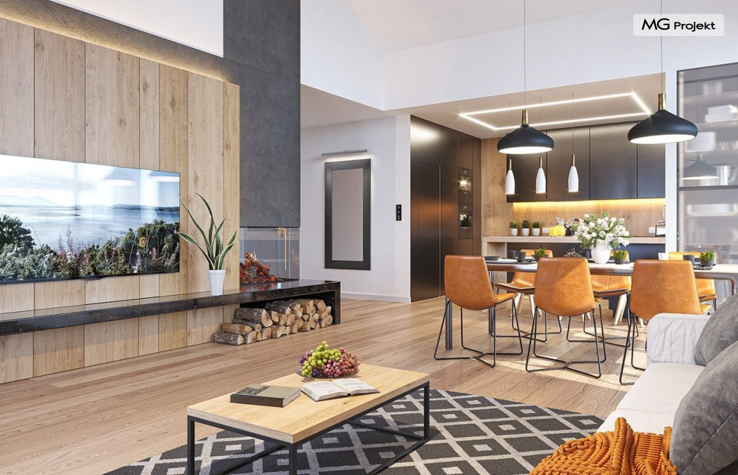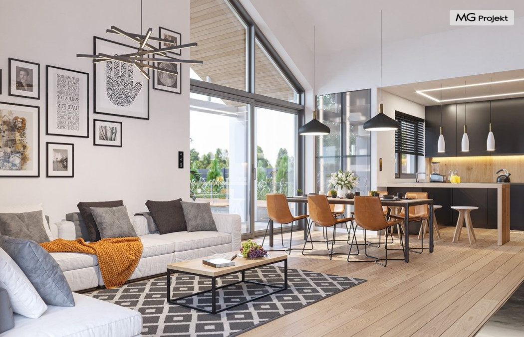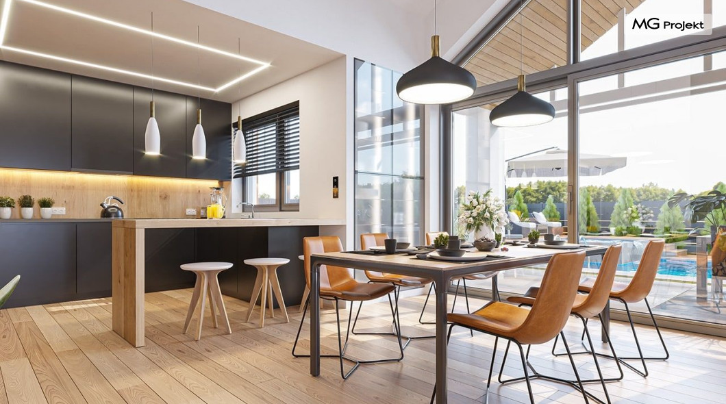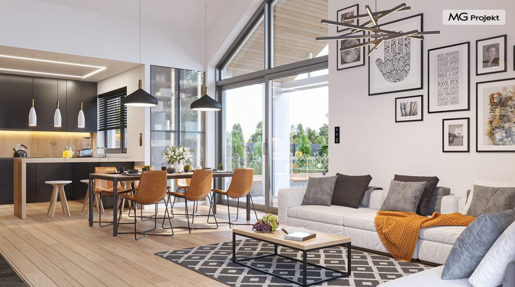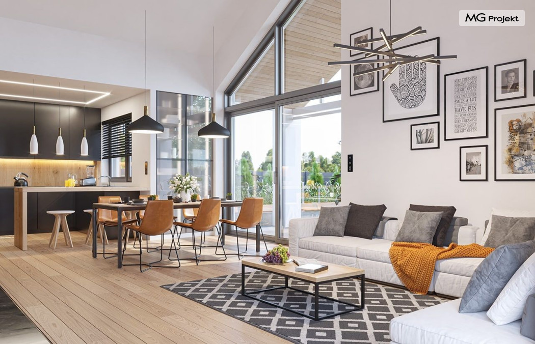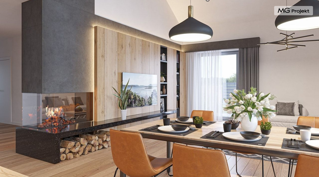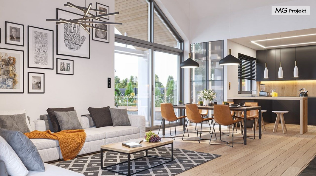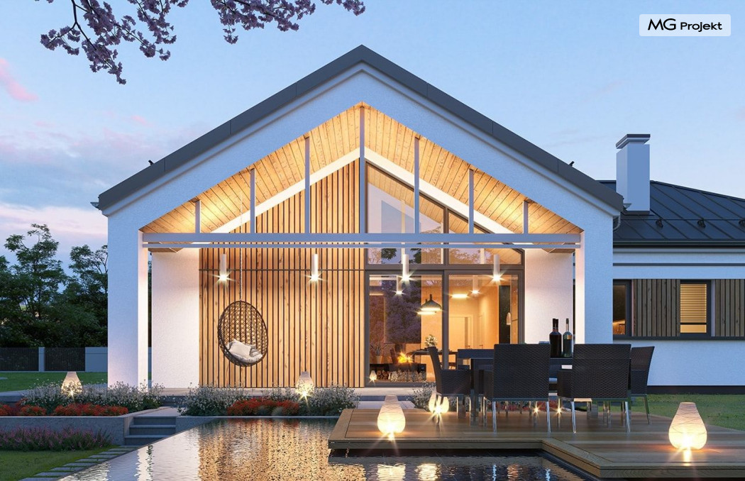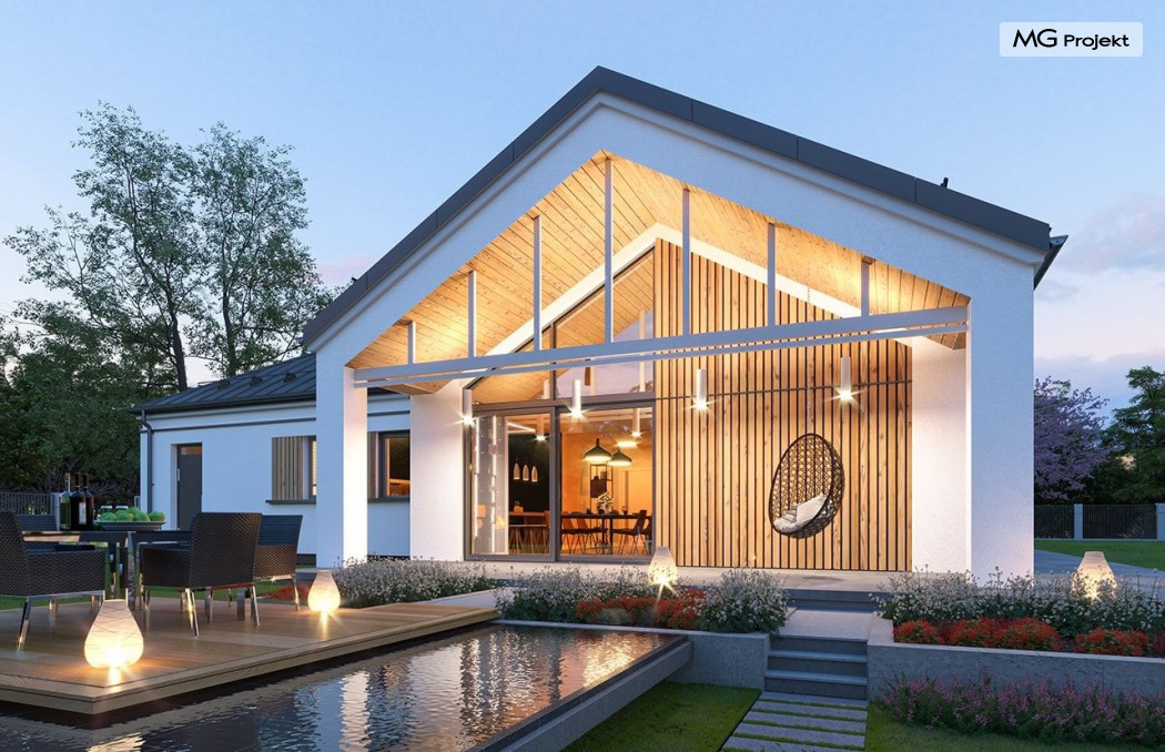 Projekt domu Sielanka 4 jest kolejną wersją projektu z popularnej serii „Sielanek” z MG Projekt. Jest to wersja w architekturze nowoczesnej, z dachami bez okapów, zbliżonej do stylistyki „domu-stodoły”. Sielanka 4 to projekt parterowego budynku, rzutem o kształcie litery T, z główną bryłą z dachem dwuspadowym i dobudowaną częścią garażową przykrytą wielospadowym dachem. Dom z cofniętym garażem i wejściem tworzącym duży placyk – podjazd frontowy. Z elewacją ogrodową z oryginalnym dużym zadaszonym tarasem -przesłużeniem salonu. Budynek zaprojektowano dla 4-5ciosobowej rodziny, chcącej komfortowo mieszkać w parterowym domu, bez biegania po schodach, z bezpośrednim dostępem do ogrodu z każdego pokoju. Dom nadaje się na działkę z ogrodem z tyłu lub z od strony bocznej - zależnie od jego posadowienia i orientacji względem stron świata. Architektura budynku jest nowoczesna, wykorzystująca modne materiały i zestawienia kolorystyczne, korzysta z modnego języka detali wykorzystywanego we współczesnych domach jednorodzinnych. Front budynku urozmaicono ciekawym podcieniem wejściowym z szerokimi drzwiami z naświetlem bocznym. Dodatkową ozdobą jest narożne okno i okna do podłogi rozdzielone drewnianą okładziną ściany. Od strony ogrodu najważniejszym elementem jest interesująco zaprojektowany podcień – zadaszenie tarasu, ozdobiony pięknymi przeszkleniami salonu i okładziną drewnianą. Całość domu przykryta jest dachem z blachy na rąbek stojący w grafitowym kolorze, badącym znakomitym kontrastem dla białych elewacji. Wnętrze budynku podzielono na strefy : w części środkowej mamy ogólną przestrzeń dzienną do życia, po lewej stronie część garażowo-gospodarczą, a z prawej strony - pokoje sypialne z łazienkami garderobami. Do domu wchodzimy z zadaszonego podestu szerokimi doświetlonymi drzwiami do przedsionka z szatnią i następnie do holu połączonego przestrzennie z salonem i kuchnią. Kuchnia jest tutaj otwarta na salon i na ogród. Pokój dzienny ma podniesiony sufit aż do kalenicy dachu, dzięki czemu jest w nim jeszcze więcej przestrzeni i powietrza. Z salonu rozpościera się piękny widok na ogród przez dwukondygnacyjne szerokie okno. Z holu korytarzem przechodzimy do części prywatnej, gdzie znajdziemy 4 pokoje, wśród nich sypialnię master z podwójną garderobą. Wnętrze dopełnia duża łazienka, wc i pomieszczenie na pralkę, suszarkę i kosze do prania. W części gospodarczej znajdziemy duży dwustanowiskowy garaż, z magazynem, oraz kotłownię. Nad częścią parteru zaprojektowano przestrzeń strychową - magazyn domowych rzeczy „nadprogramowych”.Konstrukcyjne dom jest zaprojektowany w bardzo prosty sposób. Prace murarskie i betoniarskie kończą się na wieńcach nad ścianami parteru. Pozostała konstrukcja budynku to układ drewnianych wiązarów prefabrykowanych, tworzących strop nad parterem, oraz więźbę dachową. Takie rozwiązanie znakomicie upraszcza budowę, przyspiesza ją - i przede wszystkim obniża koszty. Dom zaprojektowano jako energooszczędny, z dobrymi izolacjami i nowoczesnymi instalacjami. Budynek jest łatwy i szybki w budowie i będzie niedrogi w późniejszej eksploatacji. To świetna propozycja dla Inwestorów szukających domu parterowego, wygodnego i ekonomicznego, a zarazem na wskroś nowoczesnego i oryginalnego. Zapraszamy do zapoznania się ze wszystkimi projektami z serii Sielanka: https://www.mgprojekt.com.pl/sielanka, https://www.mgprojekt.com.pl/sielanka-2, https://www.mgprojekt.com.pl/sielanka-2-b, https://www.mgprojekt.com.pl/sielanka-3, https://www.mgprojekt.com.pl/sielanka-4.