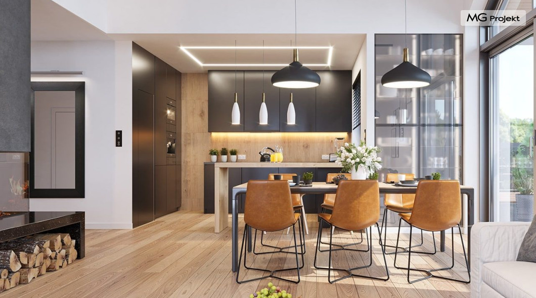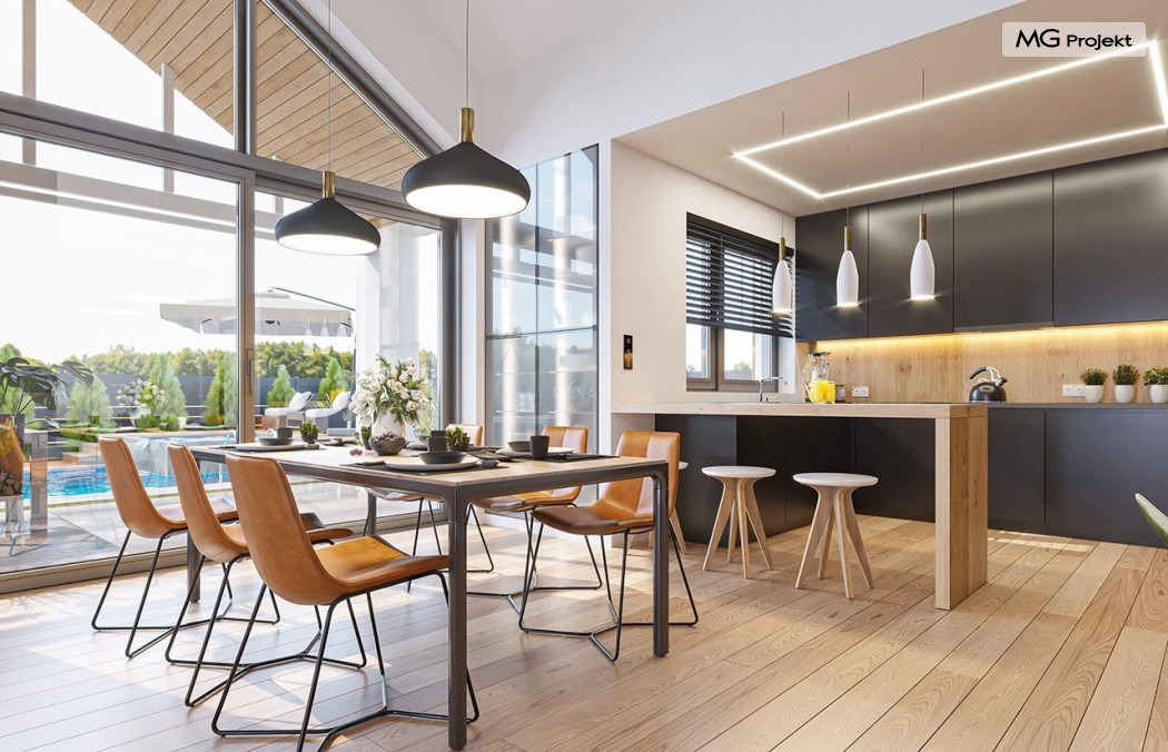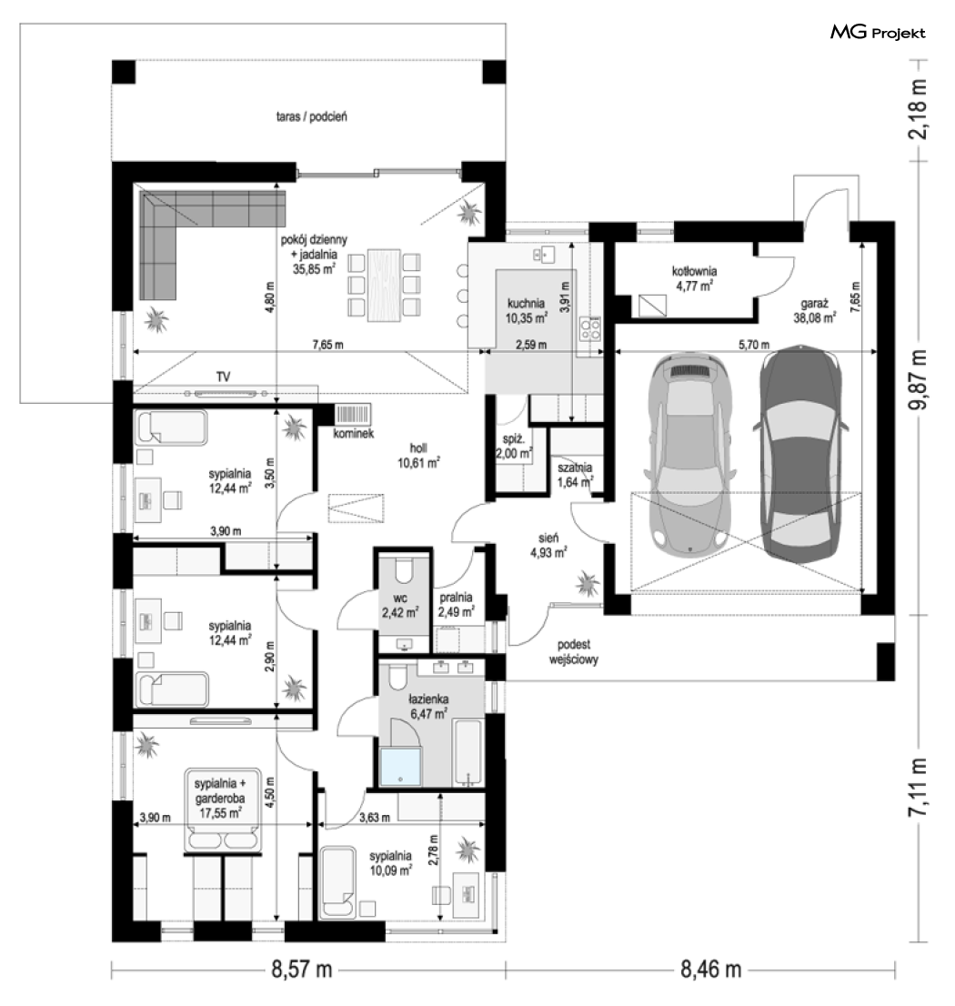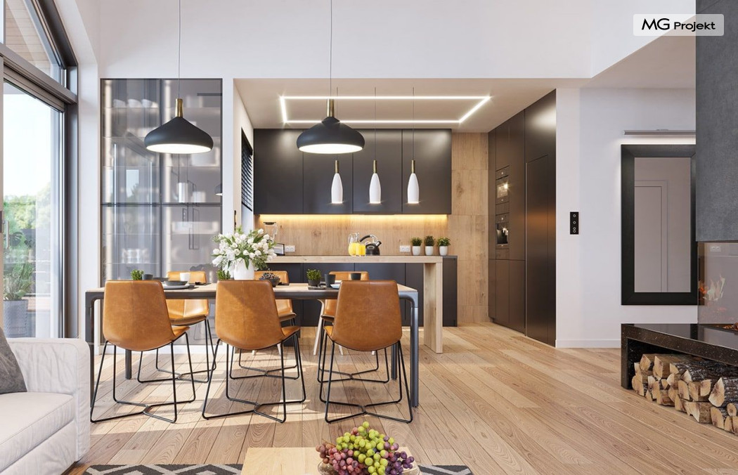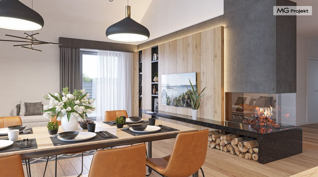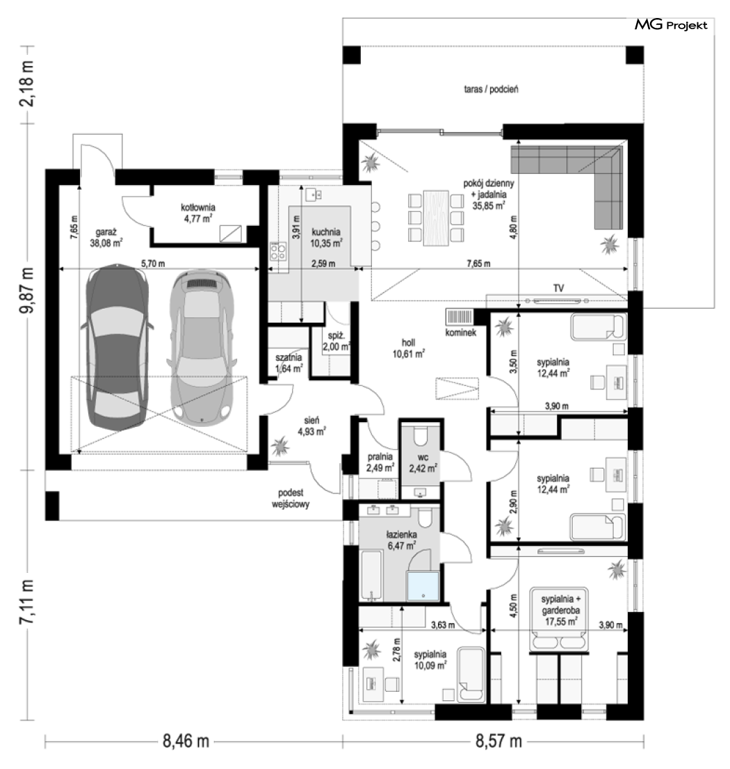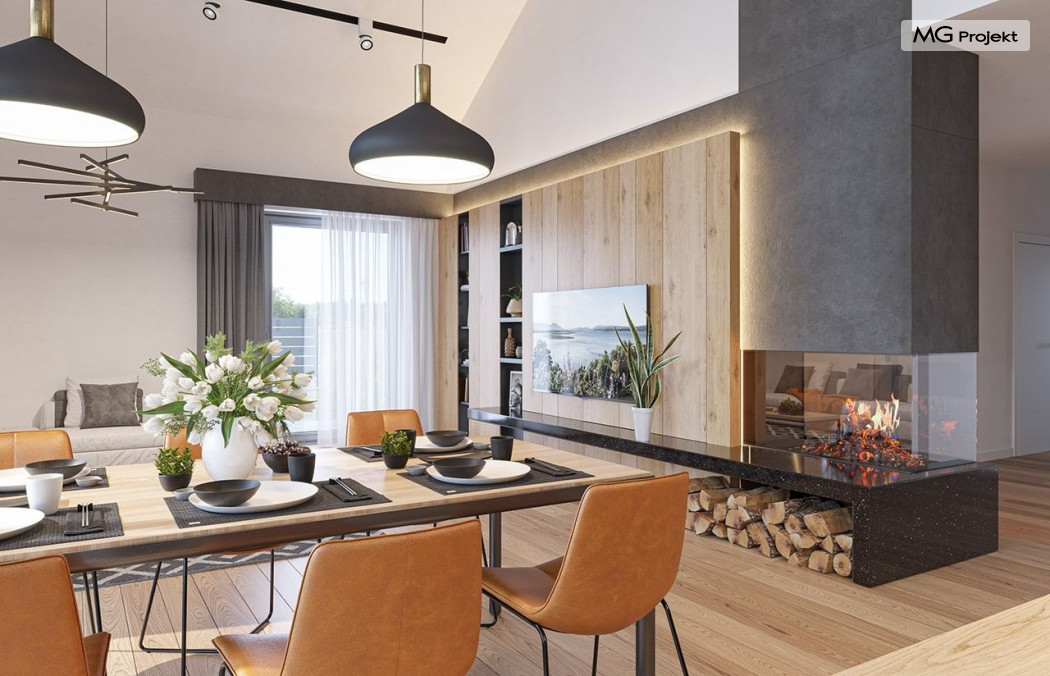 Projekt domu Sielanka 4 jest kolejną wersją projektu z popularnej serii „Sielanek” z MG Projekt. Jest to wersja w architekturze nowoczesnej, z dachami bez okapów, zbliżonej do stylistyki „domu-stodoły”. Sielanka 4 to projekt parterowego budynku, rzutem o kształcie litery T, z główną bryłą z dachem dwuspadowym i dobudowaną częścią garażową przykrytą wielospadowym dachem. Dom z cofniętym garażem i wejściem tworzącym duży placyk – podjazd frontowy. Z elewacją ogrodową z oryginalnym dużym zadaszonym tarasem -przesłużeniem salonu. Budynek zaprojektowano dla 4-5ciosobowej rodziny, chcącej komfortowo mieszkać w parterowym domu, bez biegania po schodach, z bezpośrednim dostępem do ogrodu z każdego pokoju. Dom nadaje się na działkę z ogrodem z tyłu lub z od strony bocznej - zależnie od jego posadowienia i orientacji względem stron świata. Architektura budynku jest nowoczesna, wykorzystująca modne materiały i zestawienia kolorystyczne, korzysta z modnego języka detali wykorzystywanego we współczesnych domach jednorodzinnych. Front budynku urozmaicono ciekawym podcieniem wejściowym z szerokimi drzwiami z naświetlem bocznym. Dodatkową ozdobą jest narożne okno i okna do podłogi rozdzielone drewnianą okładziną ściany. Od strony ogrodu najważniejszym elementem jest interesująco zaprojektowany podcień – zadaszenie tarasu, ozdobiony pięknymi przeszkleniami salonu i okładziną drewnianą. Całość domu przykryta jest dachem z blachy na rąbek stojący w grafitowym kolorze, badącym znakomitym kontrastem dla białych elewacji. Wnętrze budynku podzielono na strefy : w części środkowej mamy ogólną przestrzeń dzienną do życia, po lewej stronie część garażowo-gospodarczą, a z prawej strony - pokoje sypialne z łazienkami garderobami. Do domu wchodzimy z zadaszonego podestu szerokimi doświetlonymi drzwiami do przedsionka z szatnią i następnie do holu połączonego przestrzennie z salonem i kuchnią. Kuchnia jest tutaj otwarta na salon i na ogród. Pokój dzienny ma podniesiony sufit aż do kalenicy dachu, dzięki czemu jest w nim jeszcze więcej przestrzeni i powietrza. Z salonu rozpościera się piękny widok na ogród przez dwukondygnacyjne szerokie okno. Z holu korytarzem przechodzimy do części prywatnej, gdzie znajdziemy 4 pokoje, wśród nich sypialnię master z podwójną garderobą. Wnętrze dopełnia duża łazienka, wc i pomieszczenie na pralkę, suszarkę i kosze do prania. W części gospodarczej znajdziemy duży dwustanowiskowy garaż, z magazynem, oraz kotłownię. Nad częścią parteru zaprojektowano przestrzeń strychową - magazyn domowych rzeczy „nadprogramowych”.Konstrukcyjne dom jest zaprojektowany w bardzo prosty sposób. Prace murarskie i betoniarskie kończą się na wieńcach nad ścianami parteru. Pozostała konstrukcja budynku to układ drewnianych wiązarów prefabrykowanych, tworzących strop nad parterem, oraz więźbę dachową. Takie rozwiązanie znakomicie upraszcza budowę, przyspiesza ją - i przede wszystkim obniża koszty. Dom zaprojektowano jako energooszczędny, z dobrymi izolacjami i nowoczesnymi instalacjami. Budynek jest łatwy i szybki w budowie i będzie niedrogi w późniejszej eksploatacji. To świetna propozycja dla Inwestorów szukających domu parterowego, wygodnego i ekonomicznego, a zarazem na wskroś nowoczesnego i oryginalnego. Zapraszamy do zapoznania się ze wszystkimi projektami z serii Sielanka: https://www.mgprojekt.com.pl/sielanka, https://www.mgprojekt.com.pl/sielanka-2, https://www.mgprojekt.com.pl/sielanka-2-b, https://www.mgprojekt.com.pl/sielanka-3, https://www.mgprojekt.com.pl/sielanka-4.