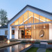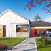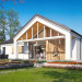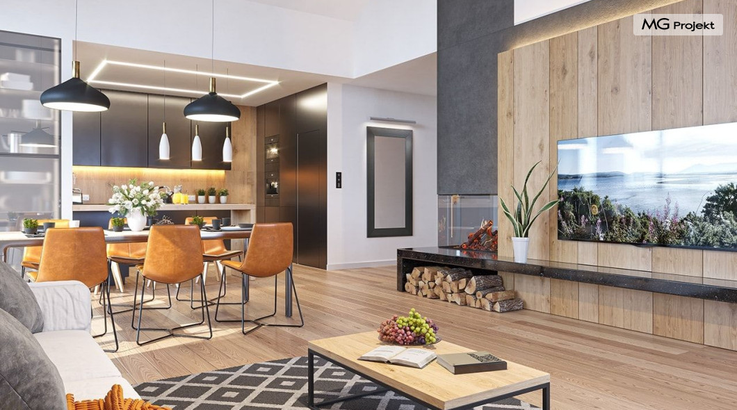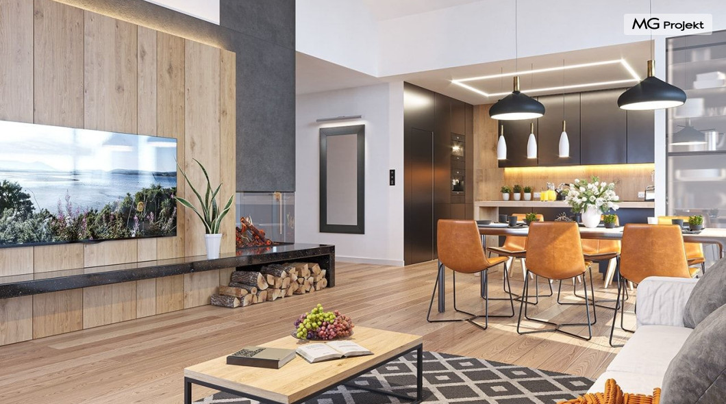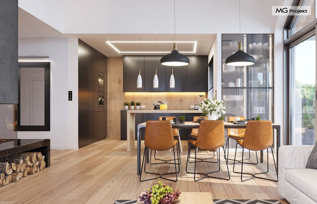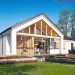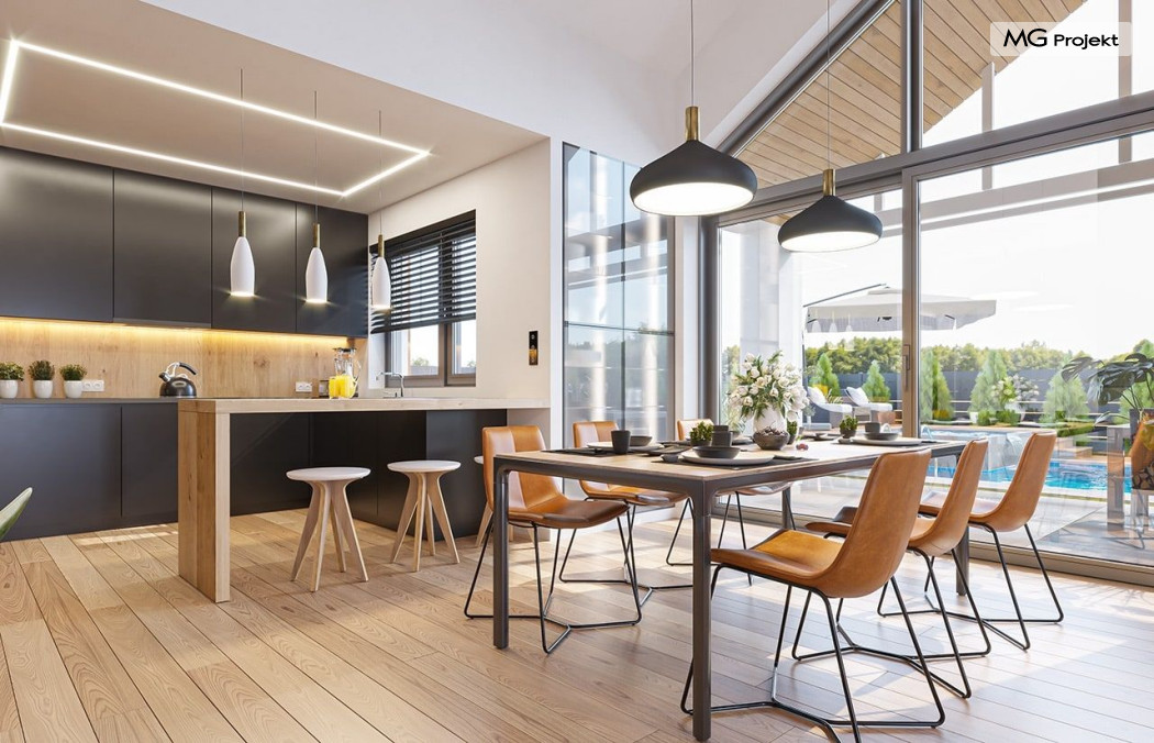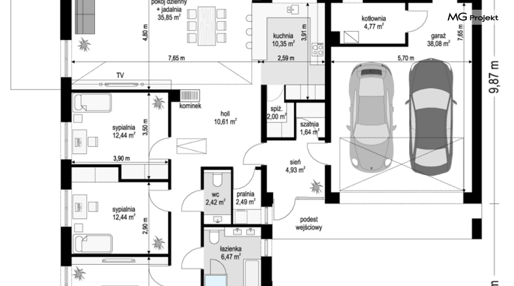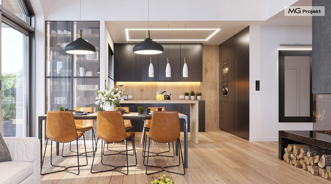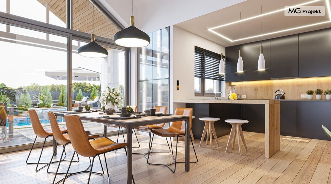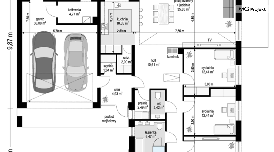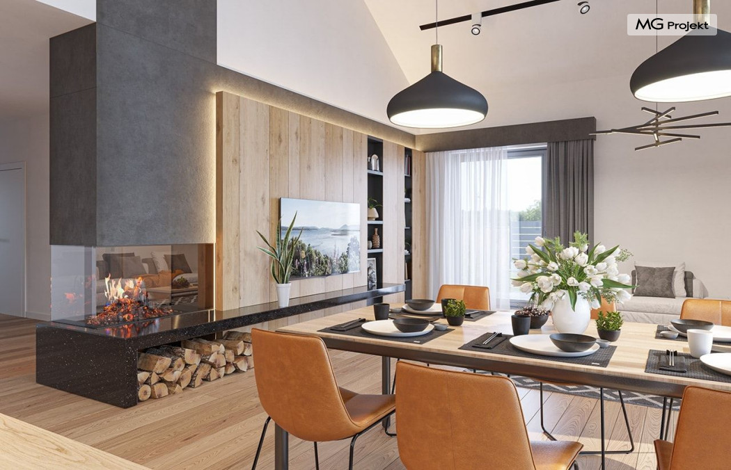 Projekt domu Sielanka 4 jest kolejną wersją projektu z popularnej serii „Sielanek” z MG Projekt. Jest to wersja w architekturze nowoczesnej, z dachami bez okapów, zbliżonej do stylistyki „domu-stodoły”. Sielanka 4 to projekt parterowego budynku, rzutem o kształcie litery T, z główną bryłą z dachem dwuspadowym i dobudowaną częścią garażową przykrytą wielospadowym dachem. Dom z cofniętym garażem i wejściem tworzącym duży placyk – podjazd frontowy. Z elewacją ogrodową z oryginalnym dużym zadaszonym tarasem -przesłużeniem salonu. Budynek zaprojektowano dla 4-5ciosobowej rodziny, chcącej komfortowo mieszkać w parterowym domu, bez biegania po schodach, z bezpośrednim dostępem do ogrodu z każdego pokoju. Dom nadaje się na działkę z ogrodem z tyłu lub z od strony bocznej - zależnie od jego posadowienia i orientacji względem stron świata. Architektura budynku jest nowoczesna, wykorzystująca modne materiały i zestawienia kolorystyczne, korzysta z modnego języka detali wykorzystywanego we współczesnych domach jednorodzinnych. Front budynku urozmaicono ciekawym podcieniem wejściowym z szerokimi drzwiami z naświetlem bocznym. Dodatkową ozdobą jest narożne okno i okna do podłogi rozdzielone drewnianą okładziną ściany. Od strony ogrodu najważniejszym elementem jest interesująco zaprojektowany podcień – zadaszenie tarasu, ozdobiony pięknymi przeszkleniami salonu i okładziną drewnianą. Całość domu przykryta jest dachem z blachy na rąbek stojący w grafitowym kolorze, badącym znakomitym kontrastem dla białych elewacji. Wnętrze budynku podzielono na strefy : w części środkowej mamy ogólną przestrzeń dzienną do życia, po lewej stronie część garażowo-gospodarczą, a z prawej strony - pokoje sypialne z łazienkami garderobami. Do domu wchodzimy z zadaszonego podestu szerokimi doświetlonymi drzwiami do przedsionka z szatnią i następnie do holu połączonego przestrzennie z salonem i kuchnią. Kuchnia jest tutaj otwarta na salon i na ogród. Pokój dzienny ma podniesiony sufit aż do kalenicy dachu, dzięki czemu jest w nim jeszcze więcej przestrzeni i powietrza. Z salonu rozpościera się piękny widok na ogród przez dwukondygnacyjne szerokie okno. Z holu korytarzem przechodzimy do części prywatnej, gdzie znajdziemy 4 pokoje, wśród nich sypialnię master z podwójną garderobą. Wnętrze dopełnia duża łazienka, wc i pomieszczenie na pralkę, suszarkę i kosze do prania. W części gospodarczej znajdziemy duży dwustanowiskowy garaż, z magazynem, oraz kotłownię. Nad częścią parteru zaprojektowano przestrzeń strychową - magazyn domowych rzeczy „nadprogramowych”.Konstrukcyjne dom jest zaprojektowany w bardzo prosty sposób. Prace murarskie i betoniarskie kończą się na wieńcach nad ścianami parteru. Pozostała konstrukcja budynku to układ drewnianych wiązarów prefabrykowanych, tworzących strop nad parterem, oraz więźbę dachową. Takie rozwiązanie znakomicie upraszcza budowę, przyspiesza ją - i przede wszystkim obniża koszty. Dom zaprojektowano jako energooszczędny, z dobrymi izolacjami i nowoczesnymi instalacjami. Budynek jest łatwy i szybki w budowie i będzie niedrogi w późniejszej eksploatacji. To świetna propozycja dla Inwestorów szukających domu parterowego, wygodnego i ekonomicznego, a zarazem na wskroś nowoczesnego i oryginalnego. Zapraszamy do zapoznania się ze wszystkimi projektami z serii Sielanka: https://www.mgprojekt.com.pl/sielanka, https://www.mgprojekt.com.pl/sielanka-2, https://www.mgprojekt.com.pl/sielanka-2-b, https://www.mgprojekt.com.pl/sielanka-3, https://www.mgprojekt.com.pl/sielanka-4.