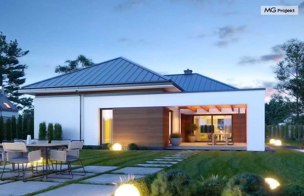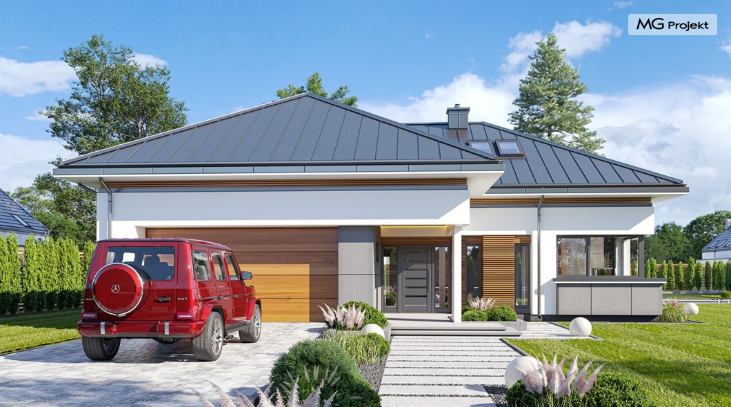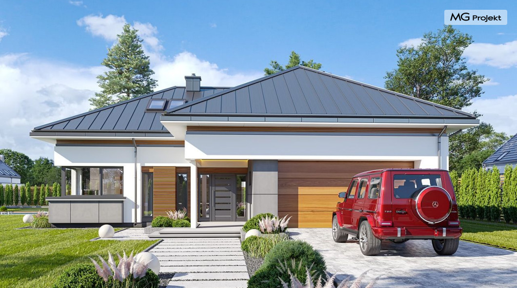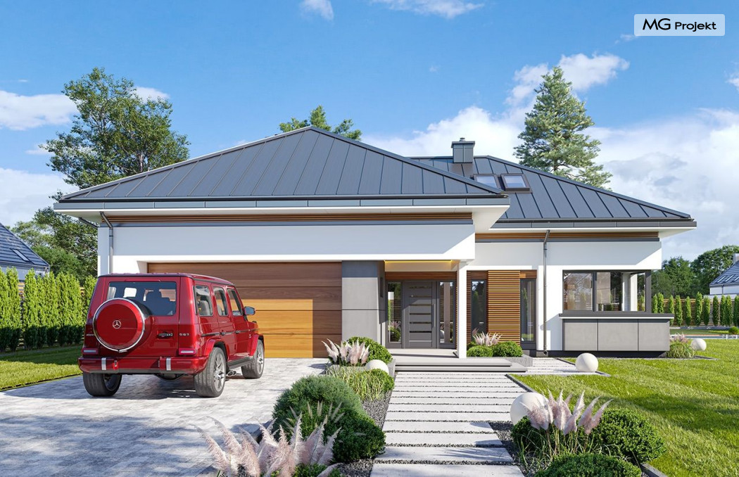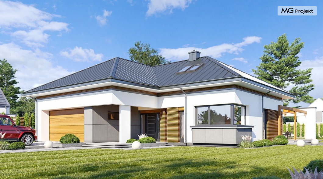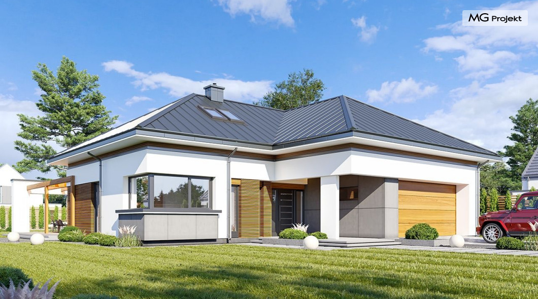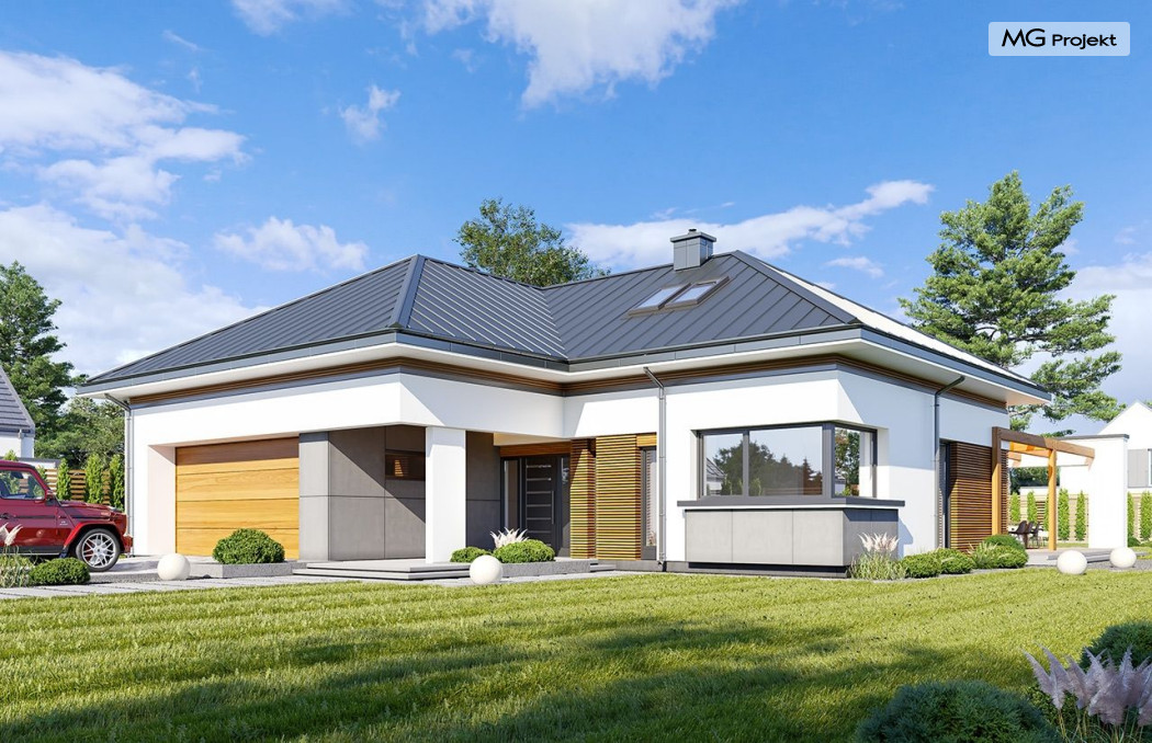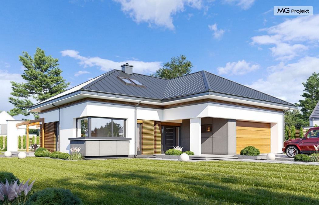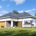 Projekt domu Hiacynt 5 jest wersją wariantową popularnego projektu Hiacynt 2 z popularnej serii „Hiacyntów” - tym razem dom trochę mniejszy, zwężony, mieszczący się na węższej parceli, z zadaszeniem bez fragmentów płaskich dachów. Dodatkowo jest to wersja domu zakładająca budowę stropu nad parterem i więźby dachowej z wiązarów prefabrykowanych, bez stropu żelbetowego, co znakomicie upraszcza, przyspiesza budowę i przede wszystkim obniża koszty realizacji domu. Hiacynt 5 zaprojektowano jako dom parterowy, z całym programem użytkowym na parterze, z dodatkową przestrzenią strychową do dowolnej adaptacji według potrzeby właściciela. Dom założono na rzucie w kształcie litery „T”, z wystającym od frontu garażem i wychodzącą wgłęb ogrodu częścią z sypialniami. Reprezentacyjne wejście z dużym podcieniem stanowi ozdobę elewacji frontowej. Narożny taras z piękną drewnianą pergolą ozdabia elewację tylną domu.Dom zaprojektowano tak aby pasował zarówno na działkę z ogrodem z tyłu, jak i na posesję z ogrodem z boku. Elewacje budynku zostały ozdobione fragmentami ścian wykończonymi betonem architektonicznym lub jego imitacją, oraz okładziną drewnianą. Na dachu przyjęto blachę na rąbek stojący, doskonale pasującą do nowoczesnego stylu budynku. Wnętrze domu podzielono na trzy części : dzienną z salonem i kuchnią, gospodarczo-garażową przy wejściu, oraz część z sypialniami domowników w głębi ogrodu. Do budynku wschodzimy przez wygodny przedsionek z szatnią, połączony z garażem, wprost do holu i dalej do pokoju dziennego. W salonie mieści się zestaw mebli wypoczynkowych naprzeciw ściany kominkowo – telewizyjnej, oraz duży stół jadalny. Częściowo otwarta kuchnia ze spiżarnią i narożnymi oknem dopełnia to wnętrze. Szerokie wyjście przesuwnymi drzwiami na taras dodatkowo powiększa przestrzennie salon. W części prywatnej domu mamy apartament państwa domu z garderobą i łazienką, dwie sypialnie dziecięce z łazienką i dodatkowy pokój – gabinet. Przy garażu przewidziano miejsce na kotłownię i pomieszczenie pralni. Nad parterem zaprojektowano strych do dowolnej aranżacji i wykorzystania przez mieszkańców. Można tam zmieścić dodatkowe dwa pokoje. Hiacynt 5 jest domem energooszczędnym, z bardzo dobrymi izolacjami i nowoczesnymi instalacjami. Technologia budowy domu jest znacznie uproszczona dzięki zastosowaniu wiązarów. Prace murarskie kończą się na wieńcach nad ścianami parteru - pozostała część budynku wykonana jest z prefabrykowanych wiązarów. Hiacynt 5 to doskonała propozycja dla Inwestorów marzących o wygodnym parterowym domu o nowoczesnej architekturze, pozwalającym się cieszyć z mieszkania na jednej kondygnacji blisko ogrodu. Zapraszamy do zapoznania się z innymi projektami: projekt domu Hiacynt, projekt domu Hiacynt 2, projekt domu Hiacynt 3, projekt domu Hiacynt 4, projekt domu Hiacynt 6., projekt domu Hiacynt 7, projekt domu Hiacynt 7 B, projekt domu Hiacynt 8. Projekty dostępne są w odbiciu lustrzanym.