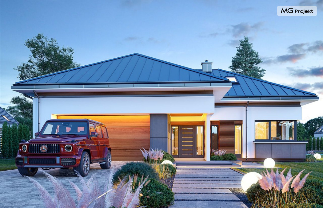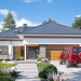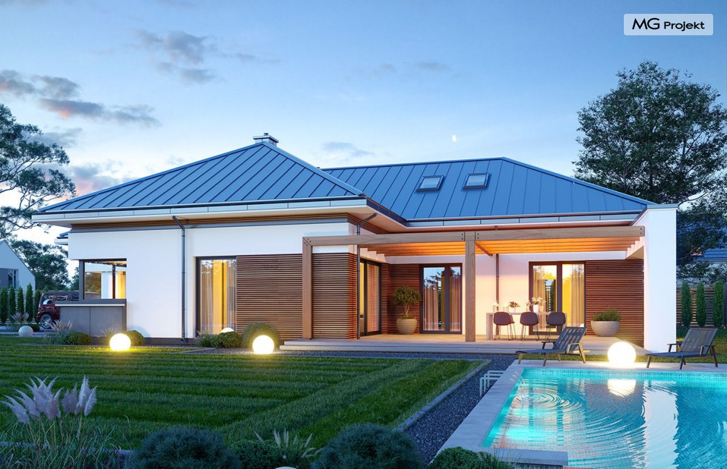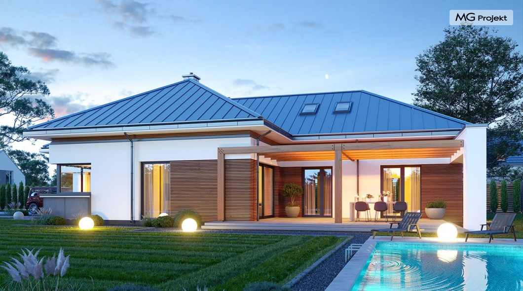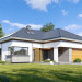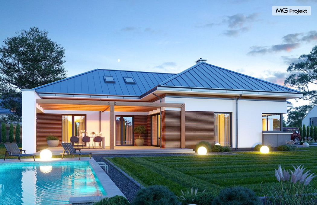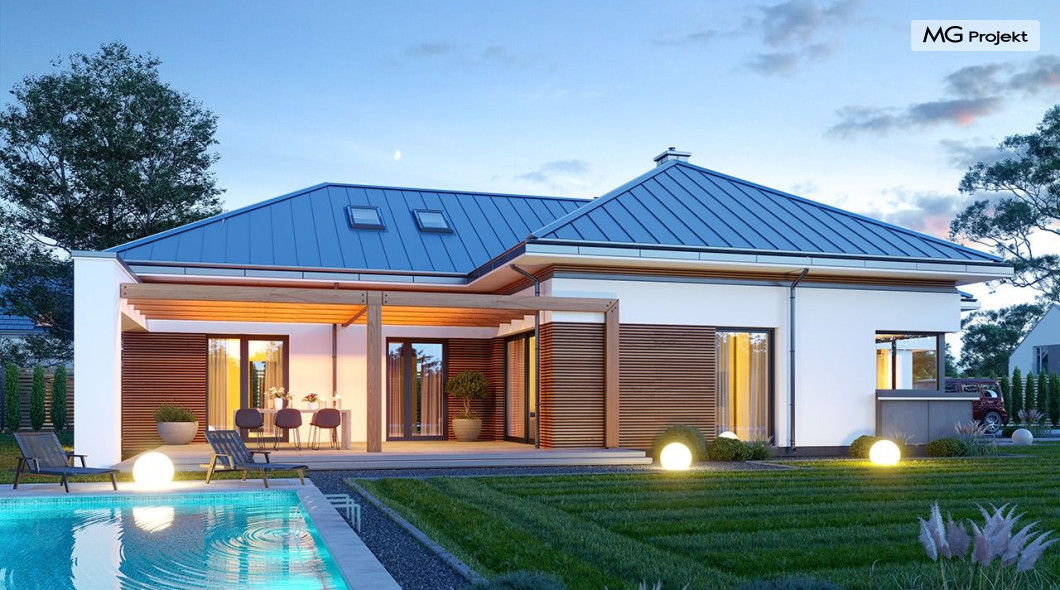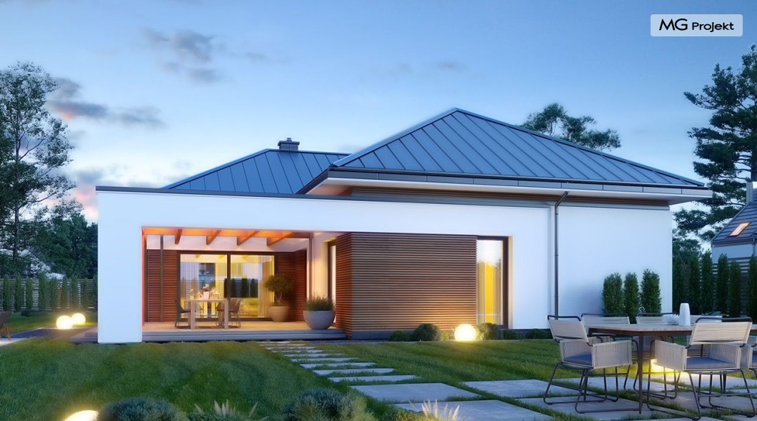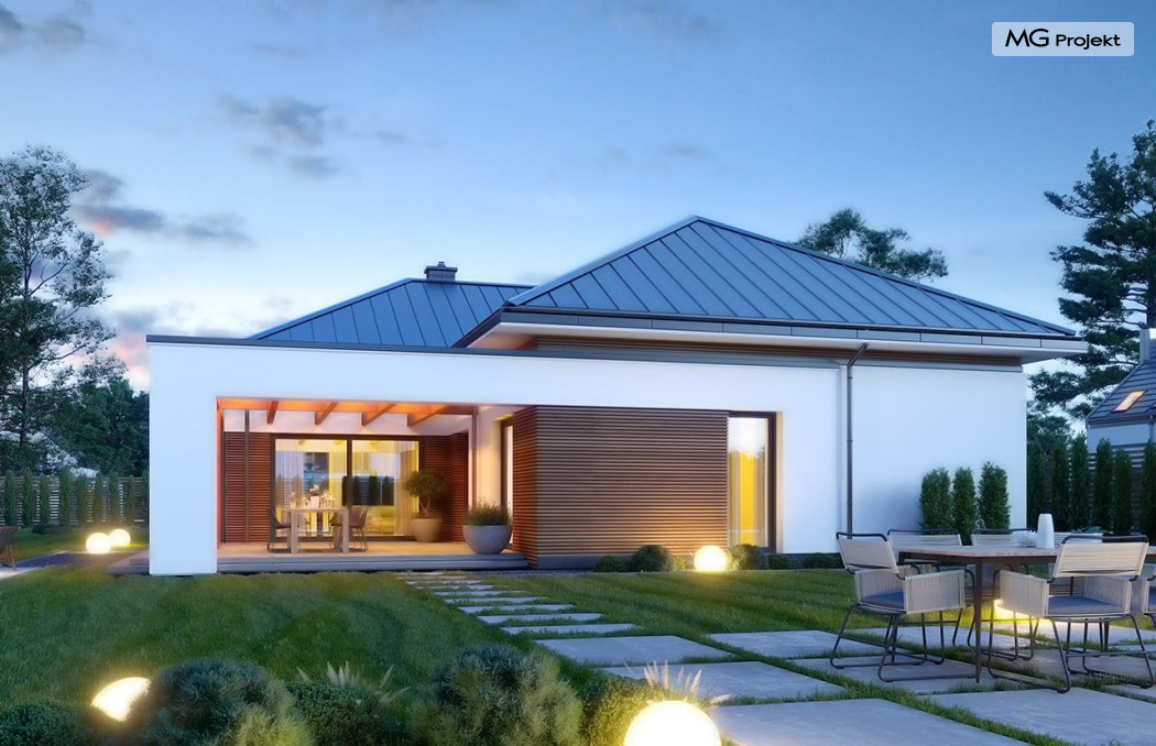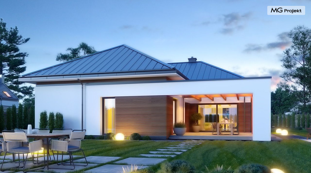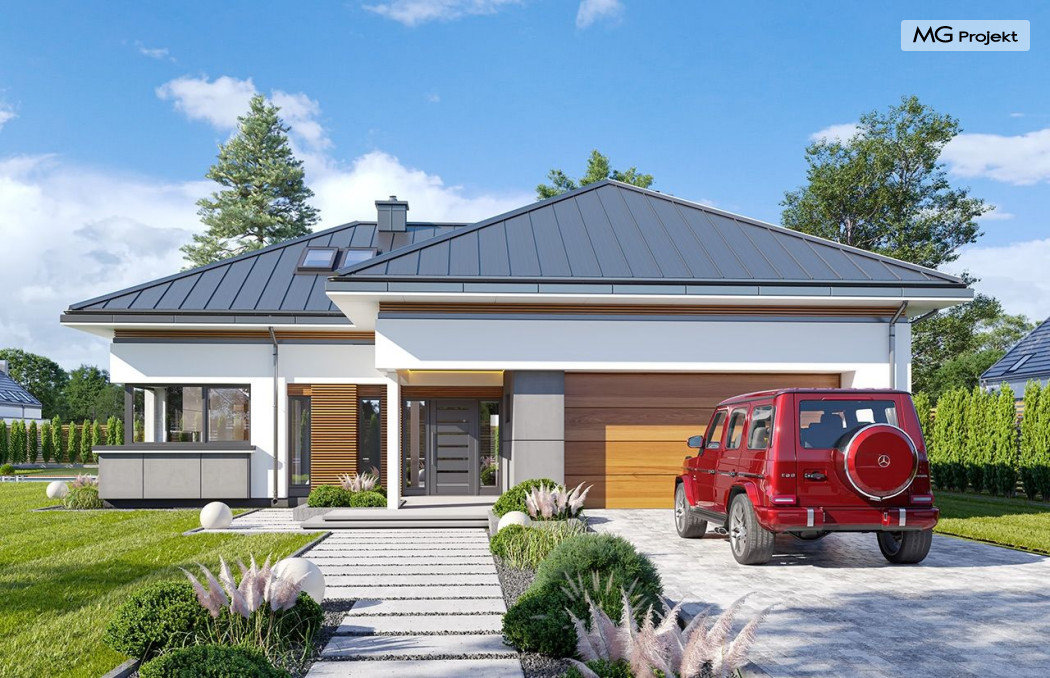 Projekt domu Hiacynt 5 jest wersją wariantową popularnego projektu Hiacynt 2 z popularnej serii „Hiacyntów” - tym razem dom trochę mniejszy, zwężony, mieszczący się na węższej parceli, z zadaszeniem bez fragmentów płaskich dachów. Dodatkowo jest to wersja domu zakładająca budowę stropu nad parterem i więźby dachowej z wiązarów prefabrykowanych, bez stropu żelbetowego, co znakomicie upraszcza, przyspiesza budowę i przede wszystkim obniża koszty realizacji domu. Hiacynt 5 zaprojektowano jako dom parterowy, z całym programem użytkowym na parterze, z dodatkową przestrzenią strychową do dowolnej adaptacji według potrzeby właściciela. Dom założono na rzucie w kształcie litery „T”, z wystającym od frontu garażem i wychodzącą wgłęb ogrodu częścią z sypialniami. Reprezentacyjne wejście z dużym podcieniem stanowi ozdobę elewacji frontowej. Narożny taras z piękną drewnianą pergolą ozdabia elewację tylną domu.Dom zaprojektowano tak aby pasował zarówno na działkę z ogrodem z tyłu, jak i na posesję z ogrodem z boku. Elewacje budynku zostały ozdobione fragmentami ścian wykończonymi betonem architektonicznym lub jego imitacją, oraz okładziną drewnianą. Na dachu przyjęto blachę na rąbek stojący, doskonale pasującą do nowoczesnego stylu budynku. Wnętrze domu podzielono na trzy części : dzienną z salonem i kuchnią, gospodarczo-garażową przy wejściu, oraz część z sypialniami domowników w głębi ogrodu. Do budynku wschodzimy przez wygodny przedsionek z szatnią, połączony z garażem, wprost do holu i dalej do pokoju dziennego. W salonie mieści się zestaw mebli wypoczynkowych naprzeciw ściany kominkowo – telewizyjnej, oraz duży stół jadalny. Częściowo otwarta kuchnia ze spiżarnią i narożnymi oknem dopełnia to wnętrze. Szerokie wyjście przesuwnymi drzwiami na taras dodatkowo powiększa przestrzennie salon. W części prywatnej domu mamy apartament państwa domu z garderobą i łazienką, dwie sypialnie dziecięce z łazienką i dodatkowy pokój – gabinet. Przy garażu przewidziano miejsce na kotłownię i pomieszczenie pralni. Nad parterem zaprojektowano strych do dowolnej aranżacji i wykorzystania przez mieszkańców. Można tam zmieścić dodatkowe dwa pokoje. Hiacynt 5 jest domem energooszczędnym, z bardzo dobrymi izolacjami i nowoczesnymi instalacjami. Technologia budowy domu jest znacznie uproszczona dzięki zastosowaniu wiązarów. Prace murarskie kończą się na wieńcach nad ścianami parteru - pozostała część budynku wykonana jest z prefabrykowanych wiązarów. Hiacynt 5 to doskonała propozycja dla Inwestorów marzących o wygodnym parterowym domu o nowoczesnej architekturze, pozwalającym się cieszyć z mieszkania na jednej kondygnacji blisko ogrodu. Zapraszamy do zapoznania się z innymi projektami: projekt domu Hiacynt, projekt domu Hiacynt 2, projekt domu Hiacynt 3, projekt domu Hiacynt 4, projekt domu Hiacynt 6., projekt domu Hiacynt 7, projekt domu Hiacynt 7 B, projekt domu Hiacynt 8. Projekty dostępne są w odbiciu lustrzanym.