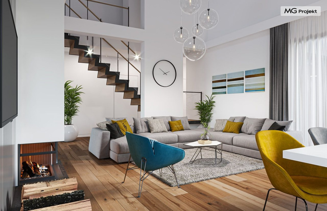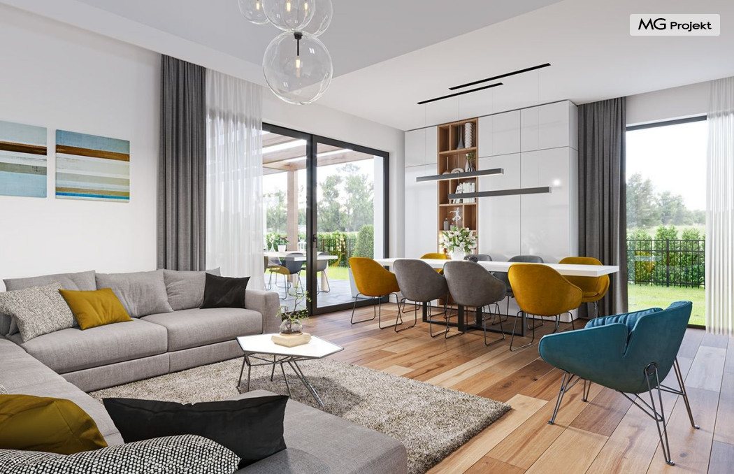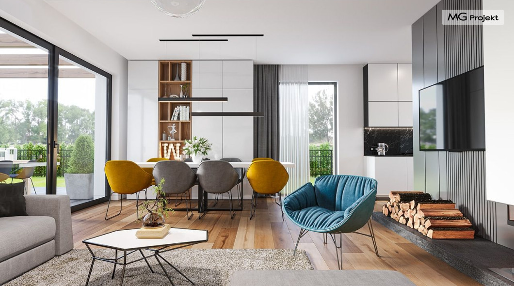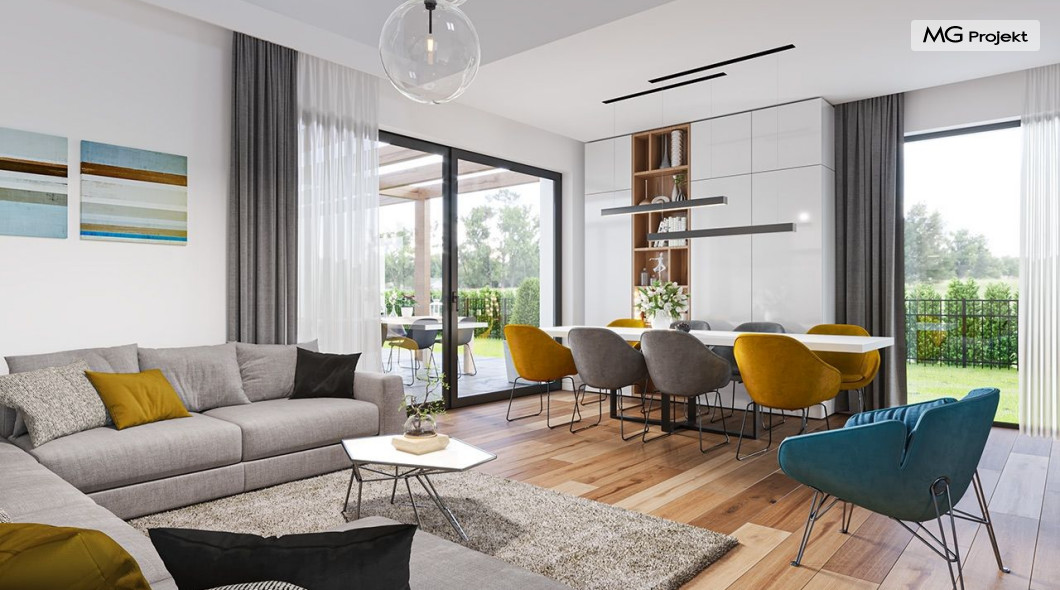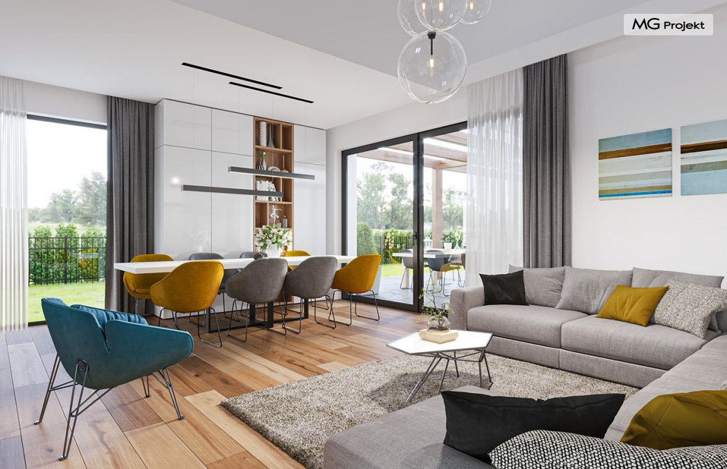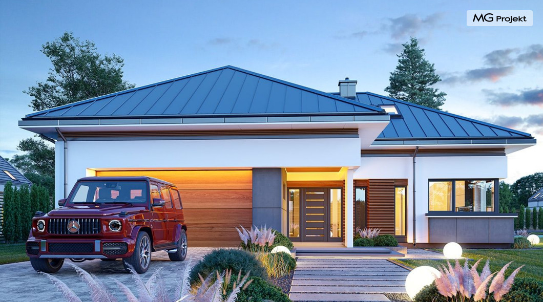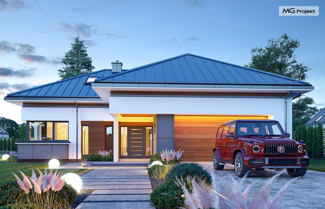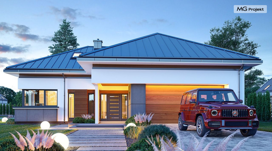 Projekt domu Hiacynt 5 jest wersją wariantową popularnego projektu Hiacynt 2 z popularnej serii „Hiacyntów” - tym razem dom trochę mniejszy, zwężony, mieszczący się na węższej parceli, z zadaszeniem bez fragmentów płaskich dachów. Dodatkowo jest to wersja domu zakładająca budowę stropu nad parterem i więźby dachowej z wiązarów prefabrykowanych, bez stropu żelbetowego, co znakomicie upraszcza, przyspiesza budowę i przede wszystkim obniża koszty realizacji domu. Hiacynt 5 zaprojektowano jako dom parterowy, z całym programem użytkowym na parterze, z dodatkową przestrzenią strychową do dowolnej adaptacji według potrzeby właściciela. Dom założono na rzucie w kształcie litery „T”, z wystającym od frontu garażem i wychodzącą wgłęb ogrodu częścią z sypialniami. Reprezentacyjne wejście z dużym podcieniem stanowi ozdobę elewacji frontowej. Narożny taras z piękną drewnianą pergolą ozdabia elewację tylną domu.Dom zaprojektowano tak aby pasował zarówno na działkę z ogrodem z tyłu, jak i na posesję z ogrodem z boku. Elewacje budynku zostały ozdobione fragmentami ścian wykończonymi betonem architektonicznym lub jego imitacją, oraz okładziną drewnianą. Na dachu przyjęto blachę na rąbek stojący, doskonale pasującą do nowoczesnego stylu budynku. Wnętrze domu podzielono na trzy części : dzienną z salonem i kuchnią, gospodarczo-garażową przy wejściu, oraz część z sypialniami domowników w głębi ogrodu. Do budynku wschodzimy przez wygodny przedsionek z szatnią, połączony z garażem, wprost do holu i dalej do pokoju dziennego. W salonie mieści się zestaw mebli wypoczynkowych naprzeciw ściany kominkowo – telewizyjnej, oraz duży stół jadalny. Częściowo otwarta kuchnia ze spiżarnią i narożnymi oknem dopełnia to wnętrze. Szerokie wyjście przesuwnymi drzwiami na taras dodatkowo powiększa przestrzennie salon. W części prywatnej domu mamy apartament państwa domu z garderobą i łazienką, dwie sypialnie dziecięce z łazienką i dodatkowy pokój – gabinet. Przy garażu przewidziano miejsce na kotłownię i pomieszczenie pralni. Nad parterem zaprojektowano strych do dowolnej aranżacji i wykorzystania przez mieszkańców. Można tam zmieścić dodatkowe dwa pokoje. Hiacynt 5 jest domem energooszczędnym, z bardzo dobrymi izolacjami i nowoczesnymi instalacjami. Technologia budowy domu jest znacznie uproszczona dzięki zastosowaniu wiązarów. Prace murarskie kończą się na wieńcach nad ścianami parteru - pozostała część budynku wykonana jest z prefabrykowanych wiązarów. Hiacynt 5 to doskonała propozycja dla Inwestorów marzących o wygodnym parterowym domu o nowoczesnej architekturze, pozwalającym się cieszyć z mieszkania na jednej kondygnacji blisko ogrodu. Zapraszamy do zapoznania się z innymi projektami: projekt domu Hiacynt, projekt domu Hiacynt 2, projekt domu Hiacynt 3, projekt domu Hiacynt 4, projekt domu Hiacynt 6., projekt domu Hiacynt 7, projekt domu Hiacynt 7 B, projekt domu Hiacynt 8. Projekty dostępne są w odbiciu lustrzanym.