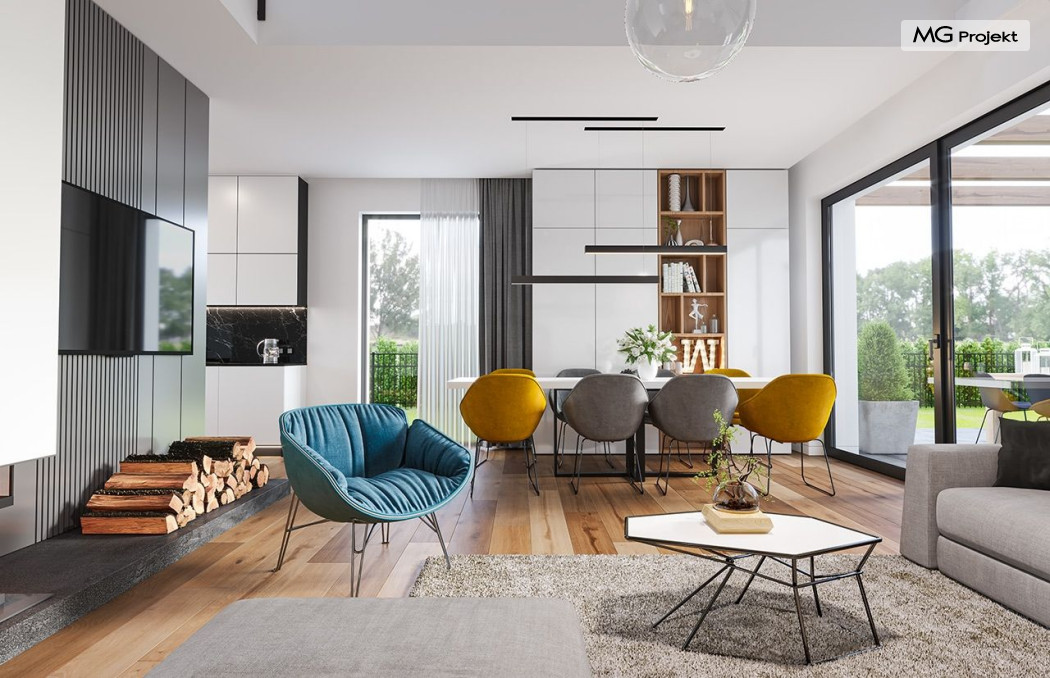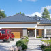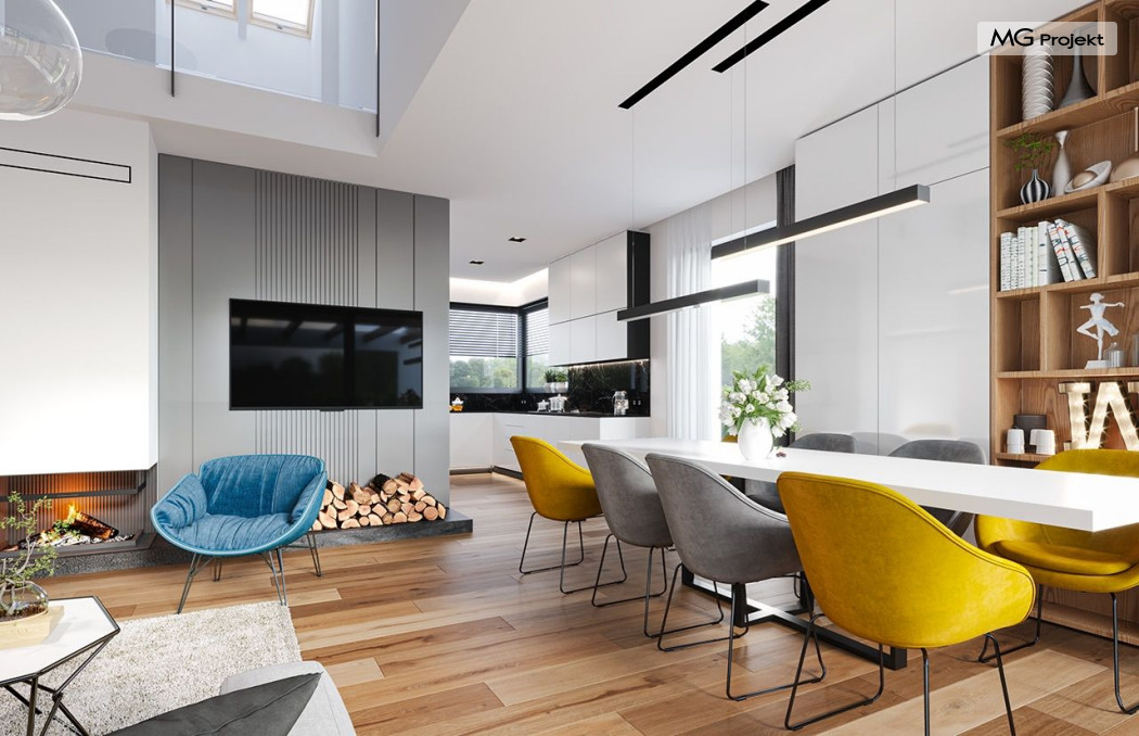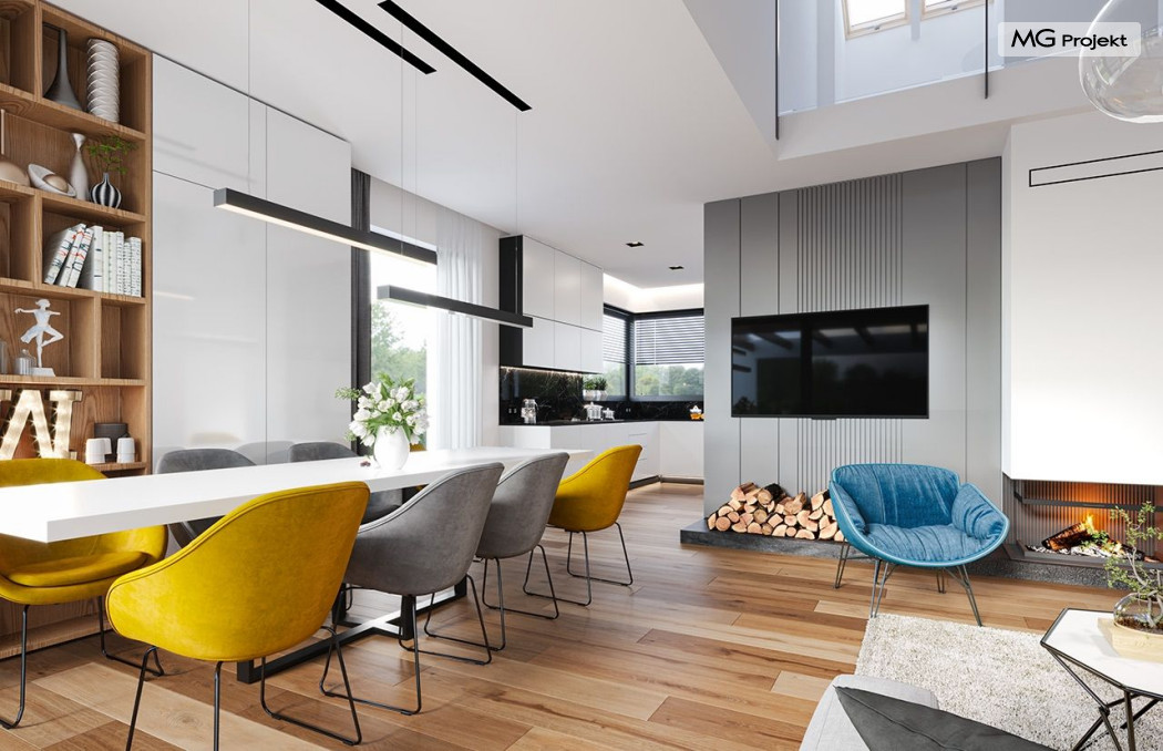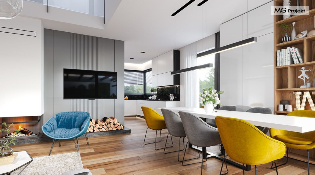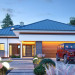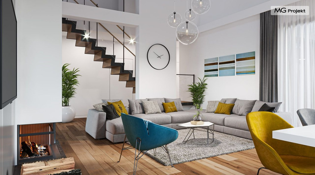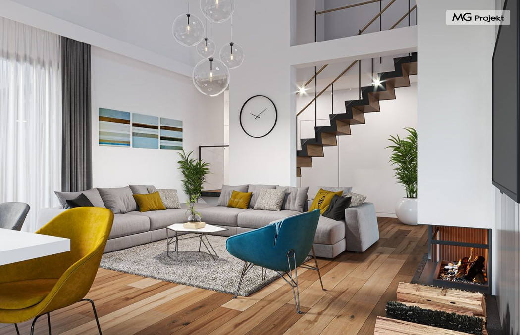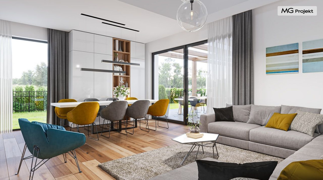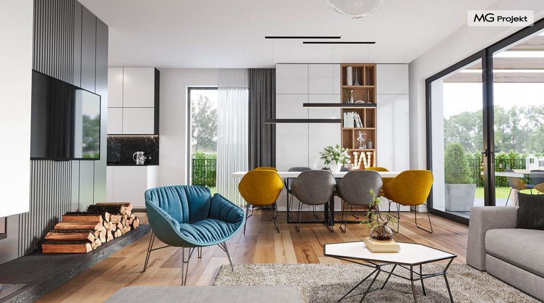 Projekt domu Hiacynt 5 jest wersją wariantową popularnego projektu Hiacynt 2 z popularnej serii „Hiacyntów” - tym razem dom trochę mniejszy, zwężony, mieszczący się na węższej parceli, z zadaszeniem bez fragmentów płaskich dachów. Dodatkowo jest to wersja domu zakładająca budowę stropu nad parterem i więźby dachowej z wiązarów prefabrykowanych, bez stropu żelbetowego, co znakomicie upraszcza, przyspiesza budowę i przede wszystkim obniża koszty realizacji domu. Hiacynt 5 zaprojektowano jako dom parterowy, z całym programem użytkowym na parterze, z dodatkową przestrzenią strychową do dowolnej adaptacji według potrzeby właściciela. Dom założono na rzucie w kształcie litery „T”, z wystającym od frontu garażem i wychodzącą wgłęb ogrodu częścią z sypialniami. Reprezentacyjne wejście z dużym podcieniem stanowi ozdobę elewacji frontowej. Narożny taras z piękną drewnianą pergolą ozdabia elewację tylną domu.Dom zaprojektowano tak aby pasował zarówno na działkę z ogrodem z tyłu, jak i na posesję z ogrodem z boku. Elewacje budynku zostały ozdobione fragmentami ścian wykończonymi betonem architektonicznym lub jego imitacją, oraz okładziną drewnianą. Na dachu przyjęto blachę na rąbek stojący, doskonale pasującą do nowoczesnego stylu budynku. Wnętrze domu podzielono na trzy części : dzienną z salonem i kuchnią, gospodarczo-garażową przy wejściu, oraz część z sypialniami domowników w głębi ogrodu. Do budynku wschodzimy przez wygodny przedsionek z szatnią, połączony z garażem, wprost do holu i dalej do pokoju dziennego. W salonie mieści się zestaw mebli wypoczynkowych naprzeciw ściany kominkowo – telewizyjnej, oraz duży stół jadalny. Częściowo otwarta kuchnia ze spiżarnią i narożnymi oknem dopełnia to wnętrze. Szerokie wyjście przesuwnymi drzwiami na taras dodatkowo powiększa przestrzennie salon. W części prywatnej domu mamy apartament państwa domu z garderobą i łazienką, dwie sypialnie dziecięce z łazienką i dodatkowy pokój – gabinet. Przy garażu przewidziano miejsce na kotłownię i pomieszczenie pralni. Nad parterem zaprojektowano strych do dowolnej aranżacji i wykorzystania przez mieszkańców. Można tam zmieścić dodatkowe dwa pokoje. Hiacynt 5 jest domem energooszczędnym, z bardzo dobrymi izolacjami i nowoczesnymi instalacjami. Technologia budowy domu jest znacznie uproszczona dzięki zastosowaniu wiązarów. Prace murarskie kończą się na wieńcach nad ścianami parteru - pozostała część budynku wykonana jest z prefabrykowanych wiązarów. Hiacynt 5 to doskonała propozycja dla Inwestorów marzących o wygodnym parterowym domu o nowoczesnej architekturze, pozwalającym się cieszyć z mieszkania na jednej kondygnacji blisko ogrodu. Zapraszamy do zapoznania się z innymi projektami: projekt domu Hiacynt, projekt domu Hiacynt 2, projekt domu Hiacynt 3, projekt domu Hiacynt 4, projekt domu Hiacynt 6., projekt domu Hiacynt 7, projekt domu Hiacynt 7 B, projekt domu Hiacynt 8. Projekty dostępne są w odbiciu lustrzanym.