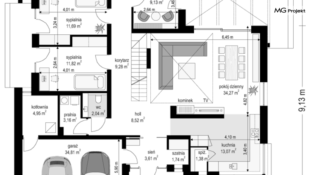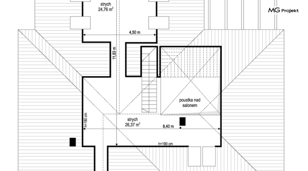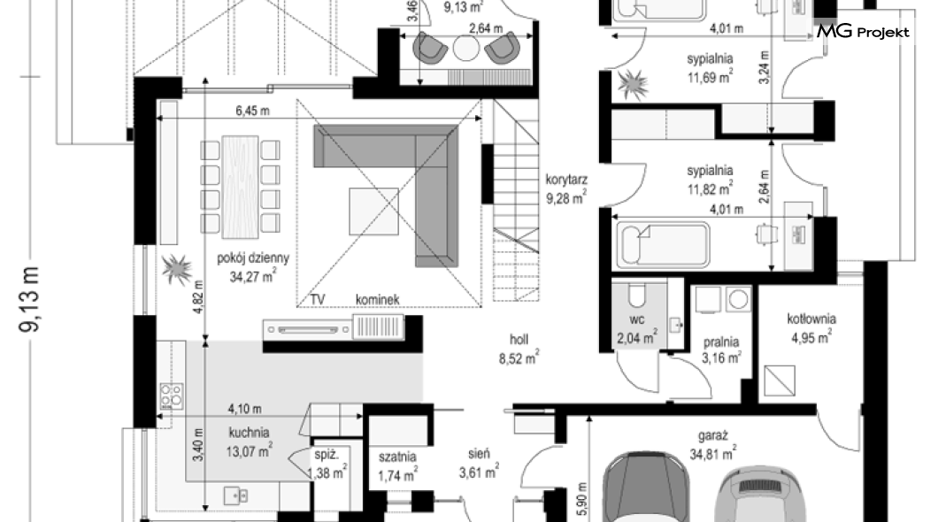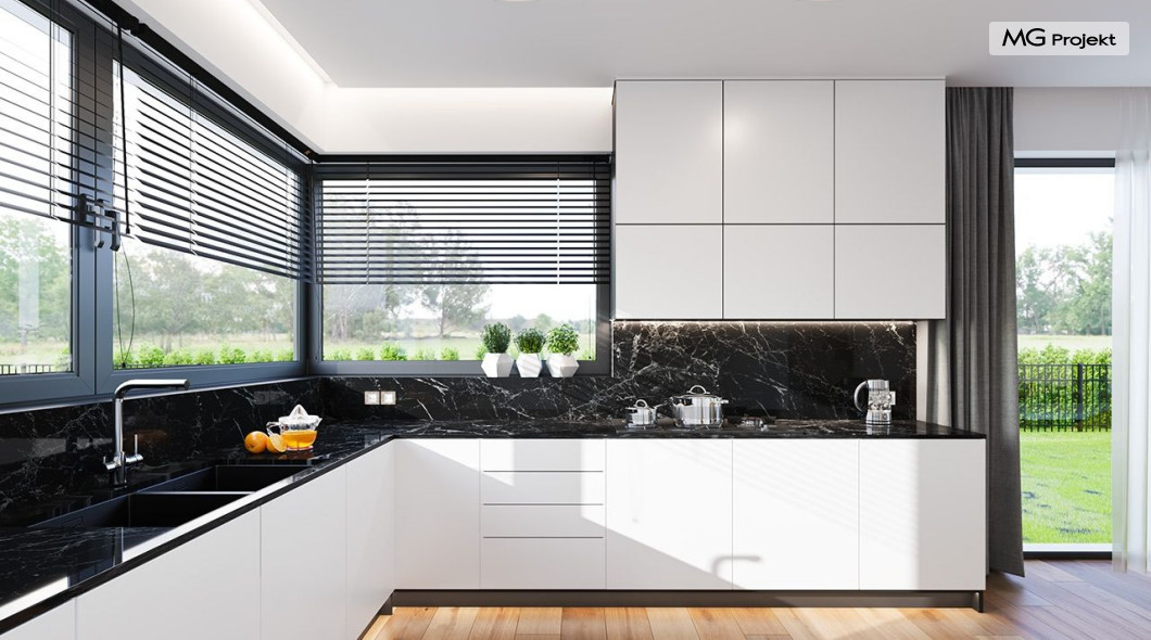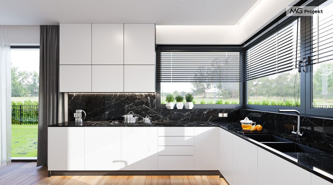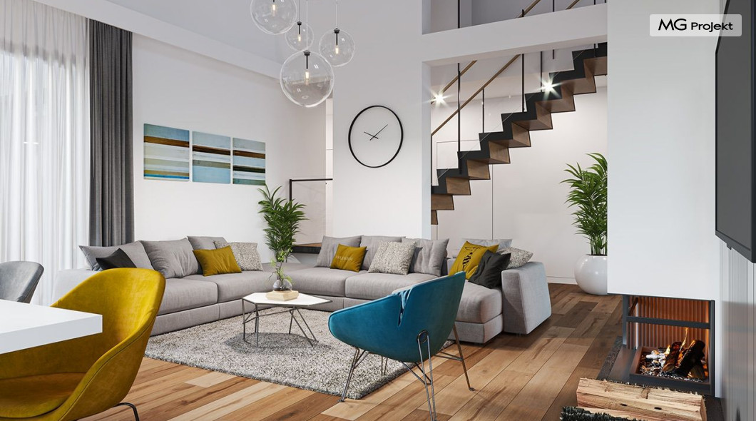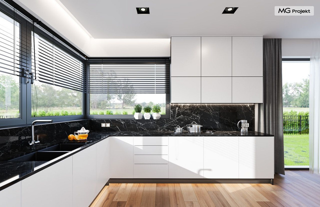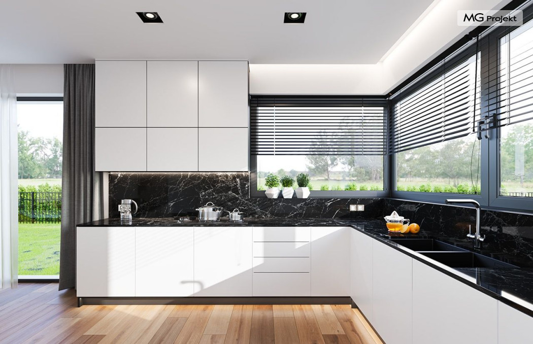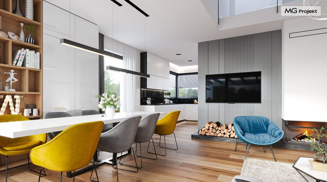 Projekt domu Hiacynt 5 jest wersją wariantową popularnego projektu Hiacynt 2 z popularnej serii „Hiacyntów” - tym razem dom trochę mniejszy, zwężony, mieszczący się na węższej parceli, z zadaszeniem bez fragmentów płaskich dachów. Dodatkowo jest to wersja domu zakładająca budowę stropu nad parterem i więźby dachowej z wiązarów prefabrykowanych, bez stropu żelbetowego, co znakomicie upraszcza, przyspiesza budowę i przede wszystkim obniża koszty realizacji domu. Hiacynt 5 zaprojektowano jako dom parterowy, z całym programem użytkowym na parterze, z dodatkową przestrzenią strychową do dowolnej adaptacji według potrzeby właściciela. Dom założono na rzucie w kształcie litery „T”, z wystającym od frontu garażem i wychodzącą wgłęb ogrodu częścią z sypialniami. Reprezentacyjne wejście z dużym podcieniem stanowi ozdobę elewacji frontowej. Narożny taras z piękną drewnianą pergolą ozdabia elewację tylną domu.Dom zaprojektowano tak aby pasował zarówno na działkę z ogrodem z tyłu, jak i na posesję z ogrodem z boku. Elewacje budynku zostały ozdobione fragmentami ścian wykończonymi betonem architektonicznym lub jego imitacją, oraz okładziną drewnianą. Na dachu przyjęto blachę na rąbek stojący, doskonale pasującą do nowoczesnego stylu budynku. Wnętrze domu podzielono na trzy części : dzienną z salonem i kuchnią, gospodarczo-garażową przy wejściu, oraz część z sypialniami domowników w głębi ogrodu. Do budynku wschodzimy przez wygodny przedsionek z szatnią, połączony z garażem, wprost do holu i dalej do pokoju dziennego. W salonie mieści się zestaw mebli wypoczynkowych naprzeciw ściany kominkowo – telewizyjnej, oraz duży stół jadalny. Częściowo otwarta kuchnia ze spiżarnią i narożnymi oknem dopełnia to wnętrze. Szerokie wyjście przesuwnymi drzwiami na taras dodatkowo powiększa przestrzennie salon. W części prywatnej domu mamy apartament państwa domu z garderobą i łazienką, dwie sypialnie dziecięce z łazienką i dodatkowy pokój – gabinet. Przy garażu przewidziano miejsce na kotłownię i pomieszczenie pralni. Nad parterem zaprojektowano strych do dowolnej aranżacji i wykorzystania przez mieszkańców. Można tam zmieścić dodatkowe dwa pokoje. Hiacynt 5 jest domem energooszczędnym, z bardzo dobrymi izolacjami i nowoczesnymi instalacjami. Technologia budowy domu jest znacznie uproszczona dzięki zastosowaniu wiązarów. Prace murarskie kończą się na wieńcach nad ścianami parteru - pozostała część budynku wykonana jest z prefabrykowanych wiązarów. Hiacynt 5 to doskonała propozycja dla Inwestorów marzących o wygodnym parterowym domu o nowoczesnej architekturze, pozwalającym się cieszyć z mieszkania na jednej kondygnacji blisko ogrodu. Zapraszamy do zapoznania się z innymi projektami: projekt domu Hiacynt, projekt domu Hiacynt 2, projekt domu Hiacynt 3, projekt domu Hiacynt 4, projekt domu Hiacynt 6., projekt domu Hiacynt 7, projekt domu Hiacynt 7 B, projekt domu Hiacynt 8. Projekty dostępne są w odbiciu lustrzanym.