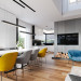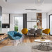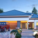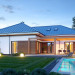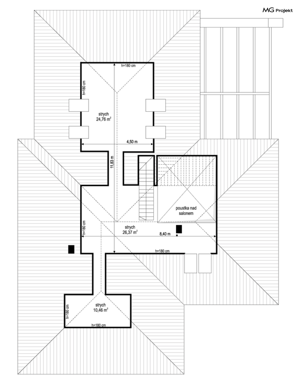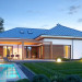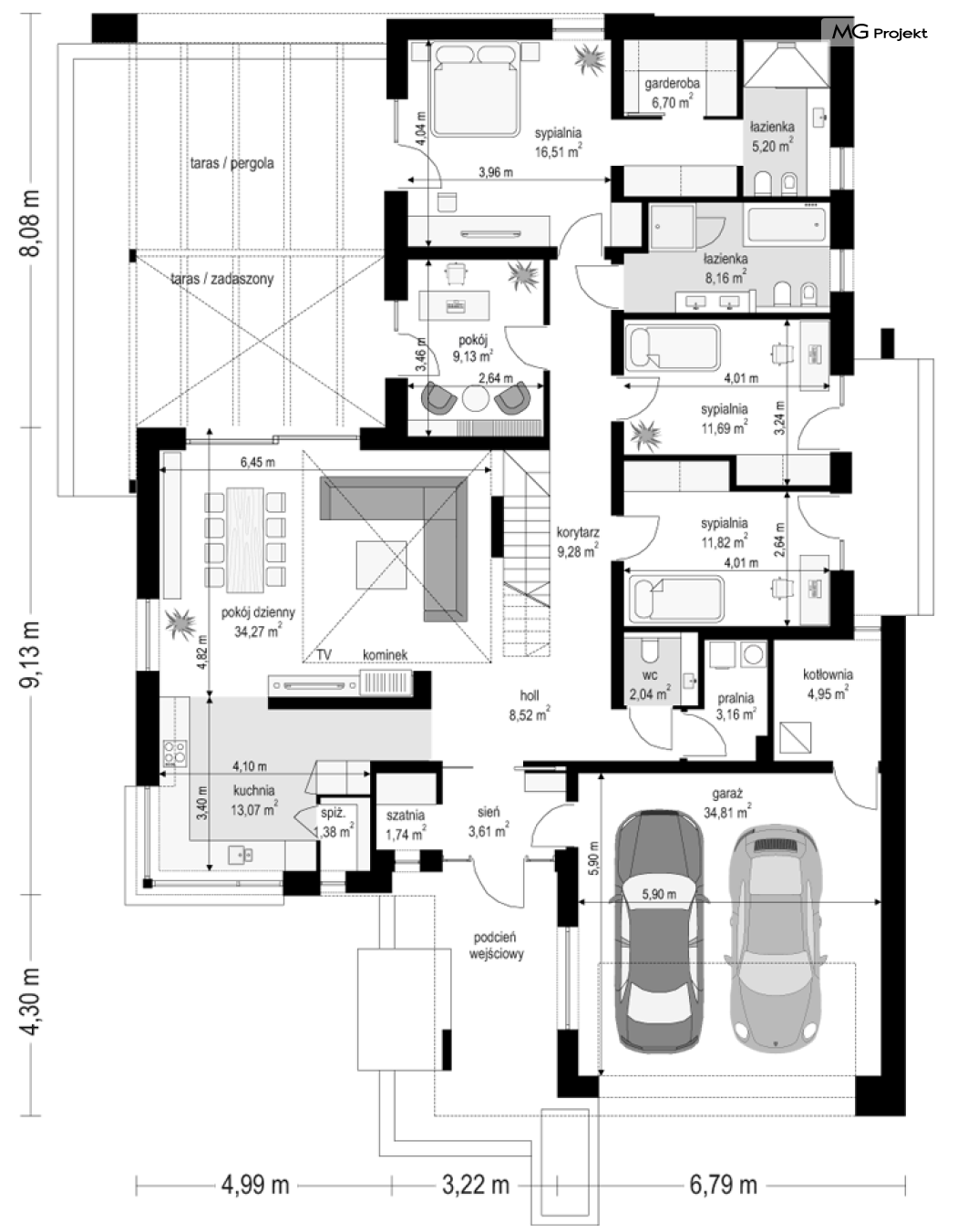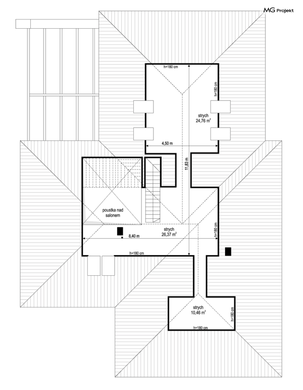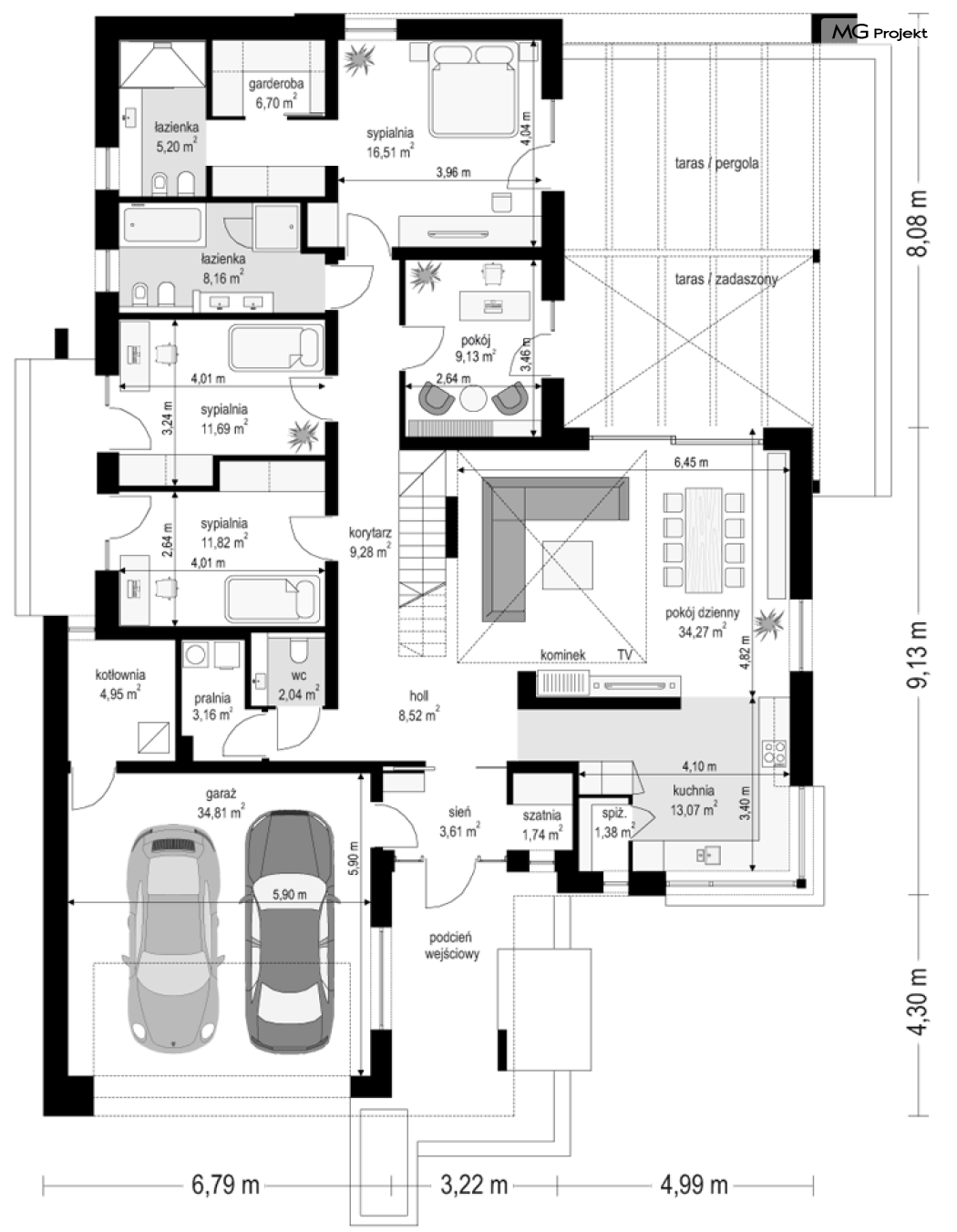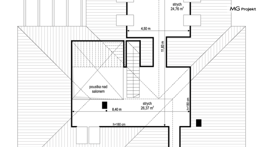 Projekt domu Hiacynt 5 jest wersją wariantową popularnego projektu Hiacynt 2 z popularnej serii „Hiacyntów” - tym razem dom trochę mniejszy, zwężony, mieszczący się na węższej parceli, z zadaszeniem bez fragmentów płaskich dachów. Dodatkowo jest to wersja domu zakładająca budowę stropu nad parterem i więźby dachowej z wiązarów prefabrykowanych, bez stropu żelbetowego, co znakomicie upraszcza, przyspiesza budowę i przede wszystkim obniża koszty realizacji domu. Hiacynt 5 zaprojektowano jako dom parterowy, z całym programem użytkowym na parterze, z dodatkową przestrzenią strychową do dowolnej adaptacji według potrzeby właściciela. Dom założono na rzucie w kształcie litery „T”, z wystającym od frontu garażem i wychodzącą wgłęb ogrodu częścią z sypialniami. Reprezentacyjne wejście z dużym podcieniem stanowi ozdobę elewacji frontowej. Narożny taras z piękną drewnianą pergolą ozdabia elewację tylną domu.Dom zaprojektowano tak aby pasował zarówno na działkę z ogrodem z tyłu, jak i na posesję z ogrodem z boku. Elewacje budynku zostały ozdobione fragmentami ścian wykończonymi betonem architektonicznym lub jego imitacją, oraz okładziną drewnianą. Na dachu przyjęto blachę na rąbek stojący, doskonale pasującą do nowoczesnego stylu budynku. Wnętrze domu podzielono na trzy części : dzienną z salonem i kuchnią, gospodarczo-garażową przy wejściu, oraz część z sypialniami domowników w głębi ogrodu. Do budynku wschodzimy przez wygodny przedsionek z szatnią, połączony z garażem, wprost do holu i dalej do pokoju dziennego. W salonie mieści się zestaw mebli wypoczynkowych naprzeciw ściany kominkowo – telewizyjnej, oraz duży stół jadalny. Częściowo otwarta kuchnia ze spiżarnią i narożnymi oknem dopełnia to wnętrze. Szerokie wyjście przesuwnymi drzwiami na taras dodatkowo powiększa przestrzennie salon. W części prywatnej domu mamy apartament państwa domu z garderobą i łazienką, dwie sypialnie dziecięce z łazienką i dodatkowy pokój – gabinet. Przy garażu przewidziano miejsce na kotłownię i pomieszczenie pralni. Nad parterem zaprojektowano strych do dowolnej aranżacji i wykorzystania przez mieszkańców. Można tam zmieścić dodatkowe dwa pokoje. Hiacynt 5 jest domem energooszczędnym, z bardzo dobrymi izolacjami i nowoczesnymi instalacjami. Technologia budowy domu jest znacznie uproszczona dzięki zastosowaniu wiązarów. Prace murarskie kończą się na wieńcach nad ścianami parteru - pozostała część budynku wykonana jest z prefabrykowanych wiązarów. Hiacynt 5 to doskonała propozycja dla Inwestorów marzących o wygodnym parterowym domu o nowoczesnej architekturze, pozwalającym się cieszyć z mieszkania na jednej kondygnacji blisko ogrodu. Zapraszamy do zapoznania się z innymi projektami: projekt domu Hiacynt, projekt domu Hiacynt 2, projekt domu Hiacynt 3, projekt domu Hiacynt 4, projekt domu Hiacynt 6., projekt domu Hiacynt 7, projekt domu Hiacynt 7 B, projekt domu Hiacynt 8. Projekty dostępne są w odbiciu lustrzanym.