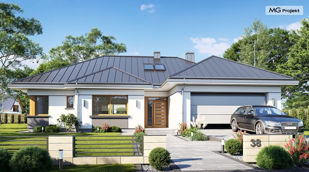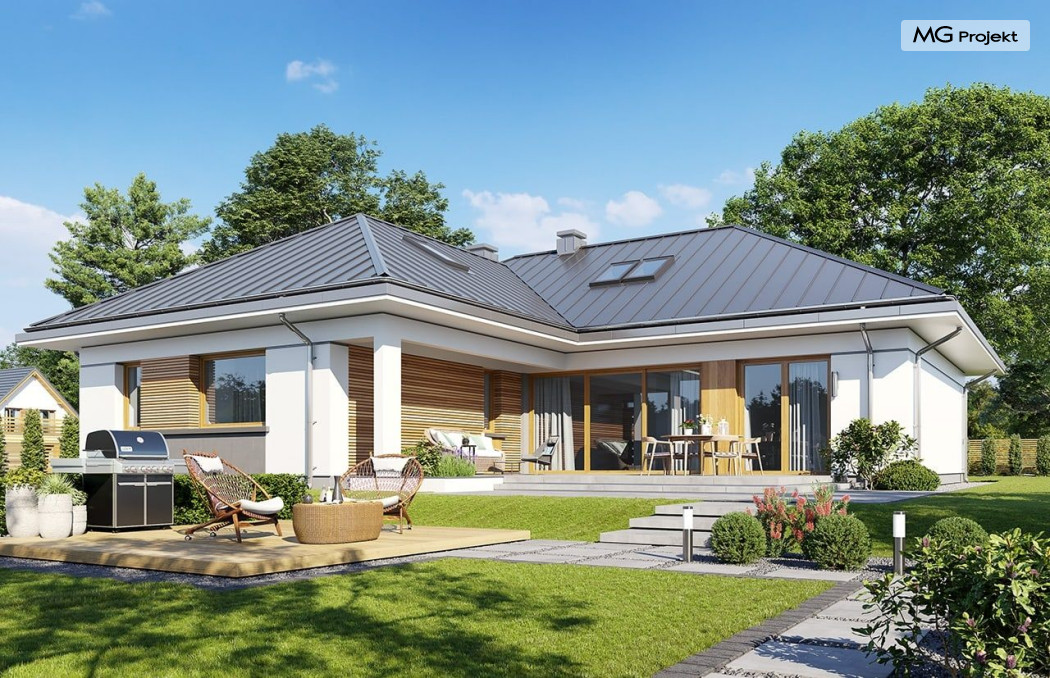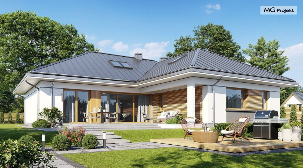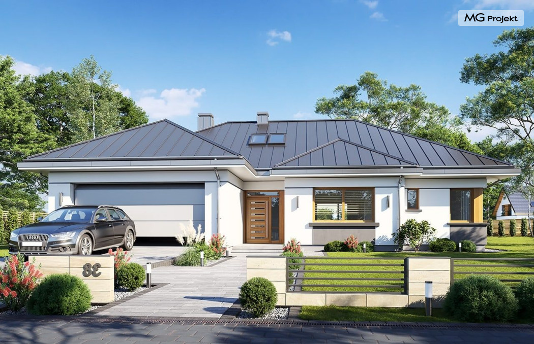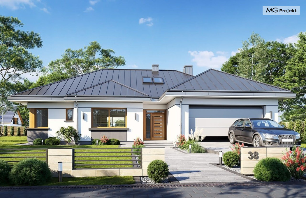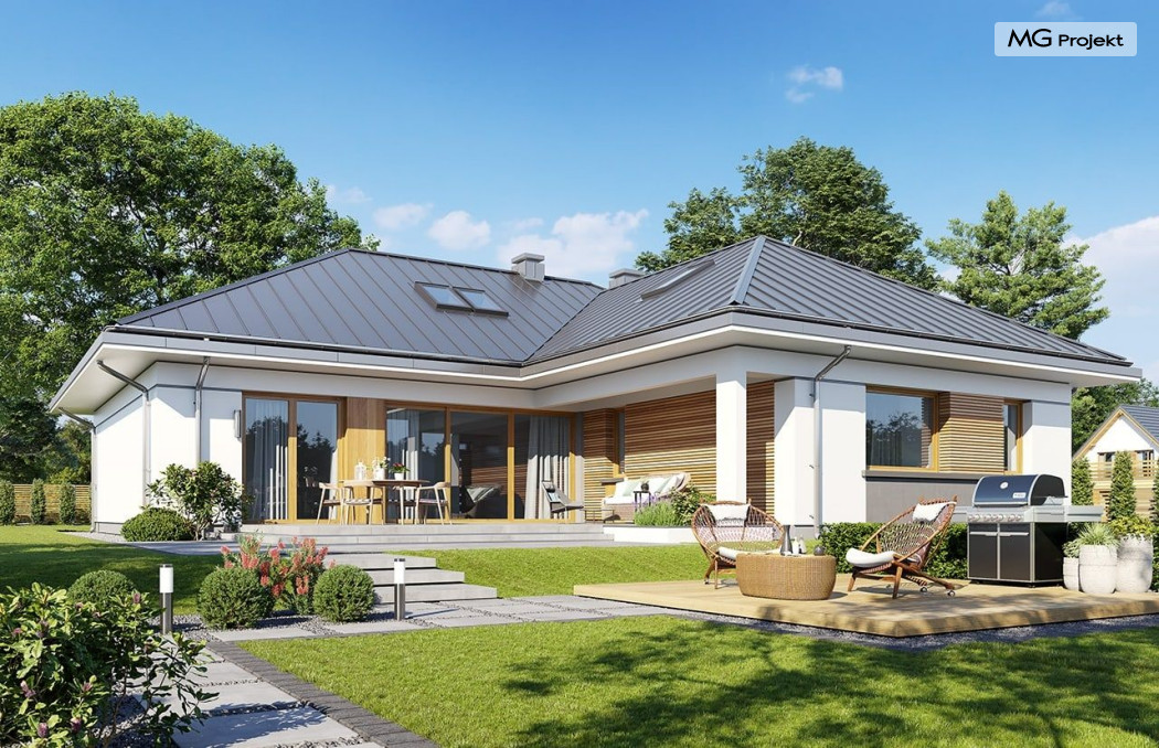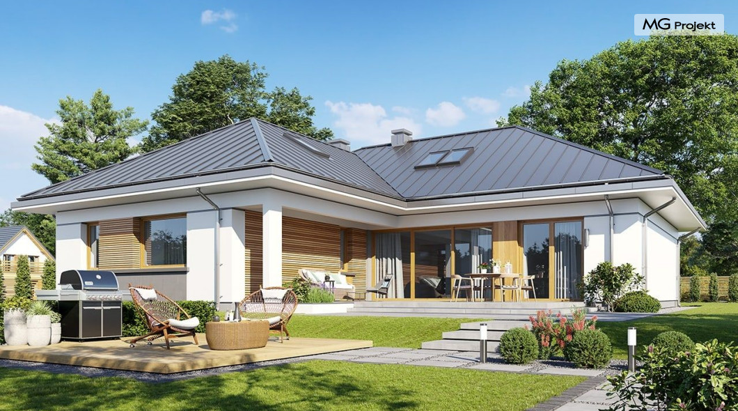 Projekt domu Willa parterowa 4 jest kolejną wersją wariantową domu z cieszącej się dużą popularnością serii projektów „ Willa parterowa”. Dom ma trochę większą powierzchnię użytkową, przy jednocześnie zwężonej bryle, dzięki czemu zmieści się na węższej działce. Bryła budynku jest parterowa z rzutem w kształcie litery „T”, przykryta wielospadowym dachem. W budynku może zamieszkać 5cioosobowa rodzina. Architektura domu jest nowoczesna. Wykorzystano tutaj modne materiały wykończeniowe i kolorystykę. Dach przykryty jest grafitową blachą na rąbek stojący, ramy dużych przeszkleń okiennych zakomponowano w jasnych odcieniach drewna, a ściany urozmaicono kontrastującymi fragmentami w kolorze betonu. Reprezentacyjny front budynku podkreślają piękne drzwi wejściowe z naświetlami, oraz szerokie okno kuchenne. Od strony ogrodowej prym wiodą szerokie przeszklenia z salonu na taras ogrodowy, oraz okładziny drewniane fragmentów ścian. Budynek ma sznyt i klasę, ma dobrze zachowane proporcje i ciekawe detale wykończeniowe. Nie jest przesadzony - niczego tu nie ma na pokaz, a jednak wygląda świetnie. Wnętrze domu podzielono na centralną cześć dzienną z salonem i kuchnią, dwie oddzielone od siebie części prywatne - jedną z apartamentem państwa domu i drugą z sypialniami dzieci, oraz część gospodarczo-garażową dostępną z przedsionka wejściowego. Do domy wchodzimy reprezentacyjnymi szerokimi drzwiami przez przedsionek do holu i salonu. W salonie przewidziano miejsce dla mebli wypoczynkowych, oraz wygodnego stołu jadalnego. Za ścianą kominkowo-telewizyjną ukryto schody na strych / poddasze, a nad połową salonu otwarto sufit aż do skosu dachu i zaprojektowano antresolę z balustradą łączącą pokój dzienny z dodatkowym pomieszczeniem u góry. Całość wnętrza dziennego domyka ładna kuchnia z wyspą i spiżarnią, z szerokim oknem otwierającym widok na front działki. Z salonu szerokimi przesuwnymi drzwiami balkonowymi wychodzimy na częściowo zadaszony taras osłonięty dyskretnie ścianami domu. Część rodziców ma sypialnię z wyjściem bezpośrednio na taras, oraz garderobę i łazienkę. W część nocnej dzieci znajdziemy trzy pokoje sypialne, łazienkę i pralnię. Całe wnętrze parteru dopełniają dwustanowiskowy garaż kotłownia. Nad parterem zaprojektowano przestrzeń strychową, którą z łatwością można zaadaptować na poddasze - wedle życzenia i inwencji właściciela. Budynek ma prostą konstrukcję, a brak żelbetowego stropu płytowego nad parterem zdecydowanie uprości, przyspieszy i obniży koszt budowy. W projekcie zastosowano bardzo dobre izolacje termiczne i nowoczesne instalacje, dzięki czemu dom będzie niedrogi w późniejszej eksploatacji. Willa Parterowa 4 jest doskonałą propozycją dla Inwestorów planujących budowę nowoczesnego, komfortowego parterowego domu, marzących o mieszkaniu na jednej kondygnacji, blisko otaczającego dom ogrodu. Zapraszamy do zapoznania się z pełną ofertą pracowni MG Projekt: https://www.mgprojekt.com.pl/willa-parterowa, https://www.mgprojekt.com.pl/willa-parterowa-2, https://www.mgprojekt.com.pl/willa-parterowa-2-wariant-b, https://www.mgprojekt.com.pl/willa-parterowa-2-wariant-c, https://www.mgprojekt.com.pl/willa-parterowa-2-wariant-d, https://www.mgprojekt.com.pl/willa-parterowa-3, https://www.mgprojekt.com.pl/willa-parterowa-3-wariant-b, https://www.mgprojekt.com.pl/willa-parterowa-4, https://www.mgprojekt.com.pl/willa-parterowa-4-wariant-b, https://www.mgprojekt.com.pl/willa-parterowa-wariant-b, https://www.mgprojekt.com.pl/willa-parterowa-wariant-c, https://www.mgprojekt.com.pl/willa-parterowa-wariant-d, https://www.mgprojekt.com.pl/willa-parterowa-wariant-e.