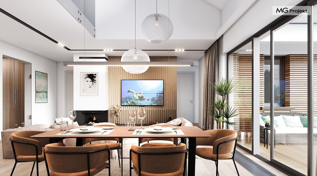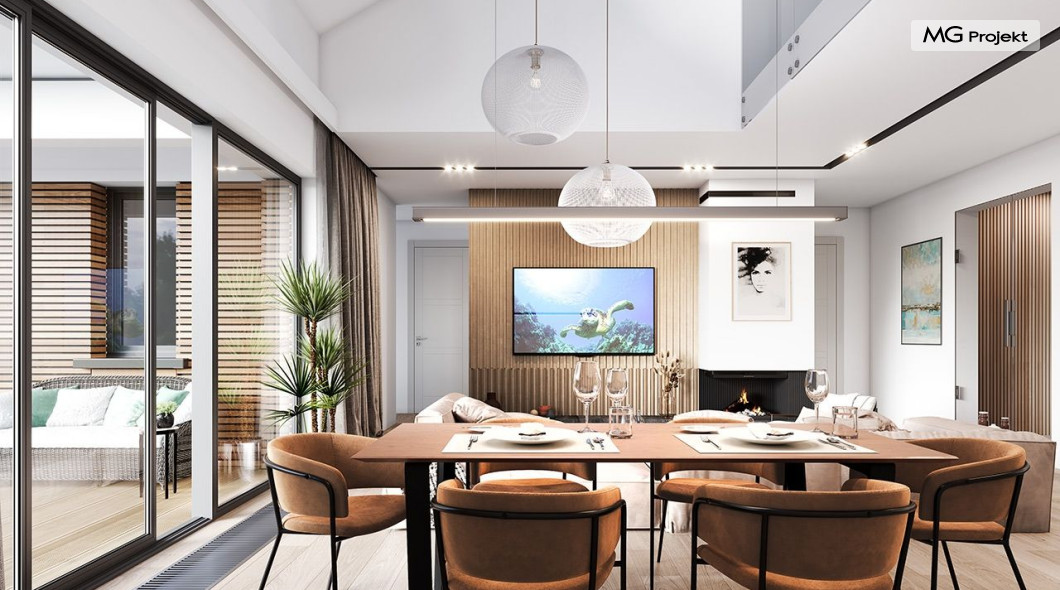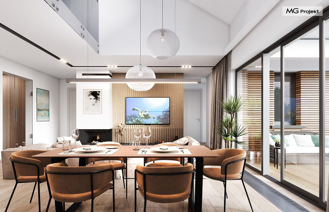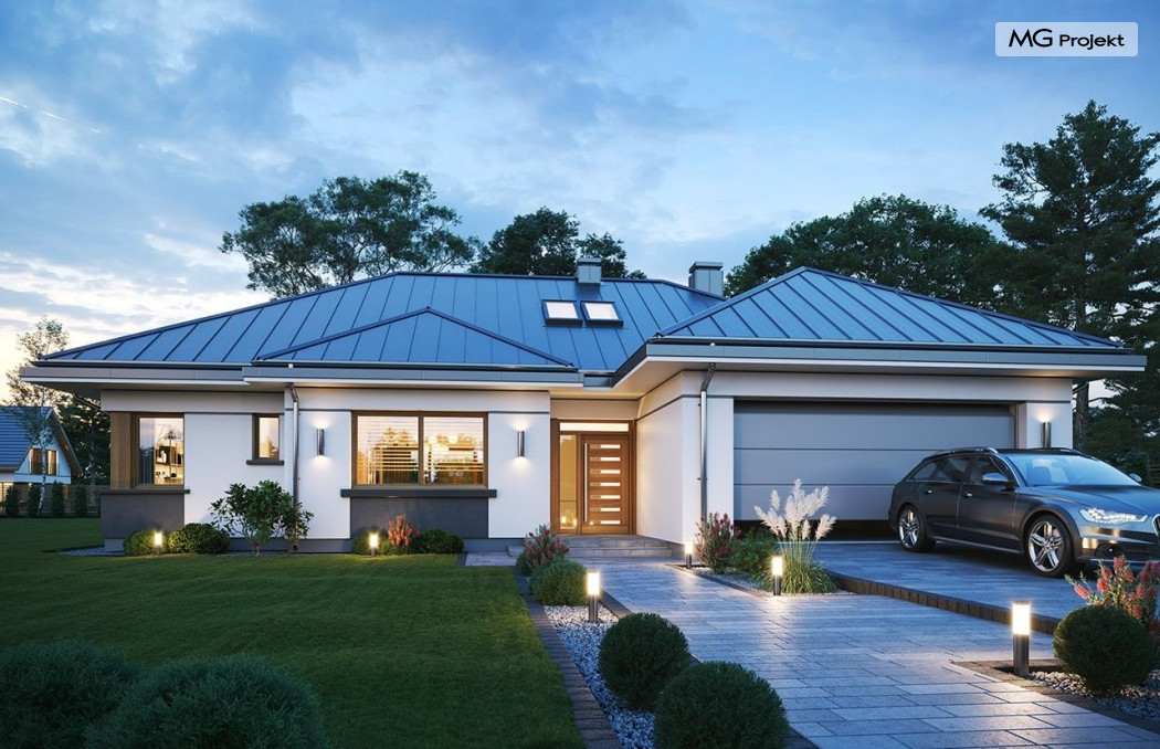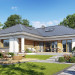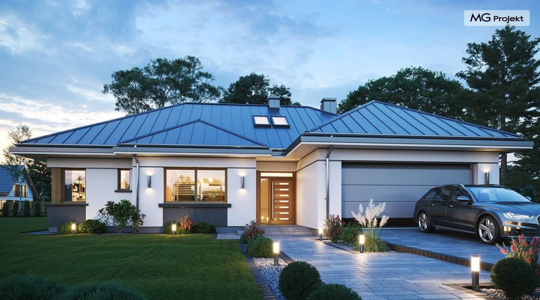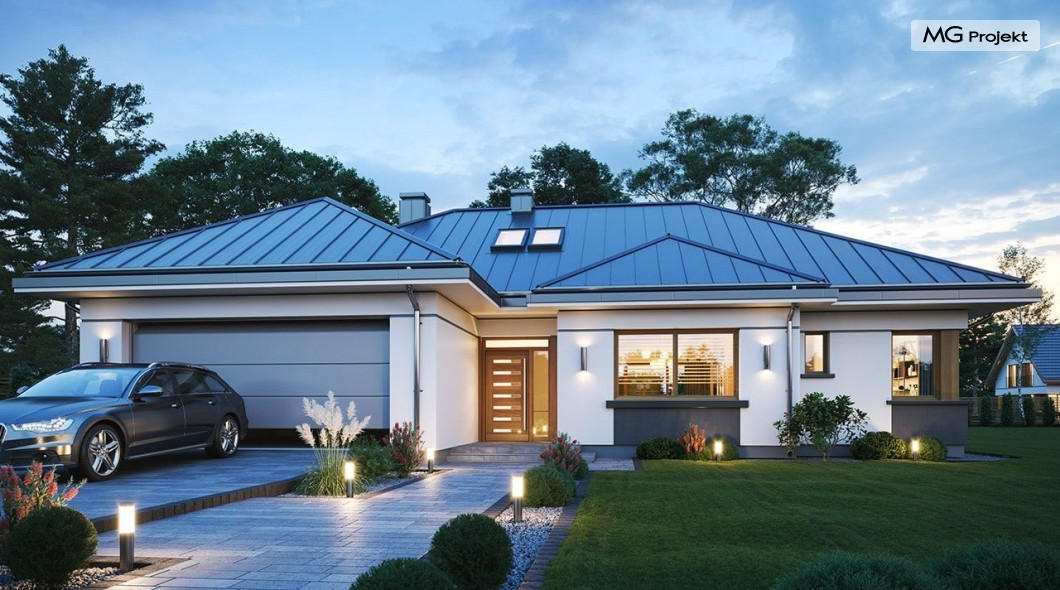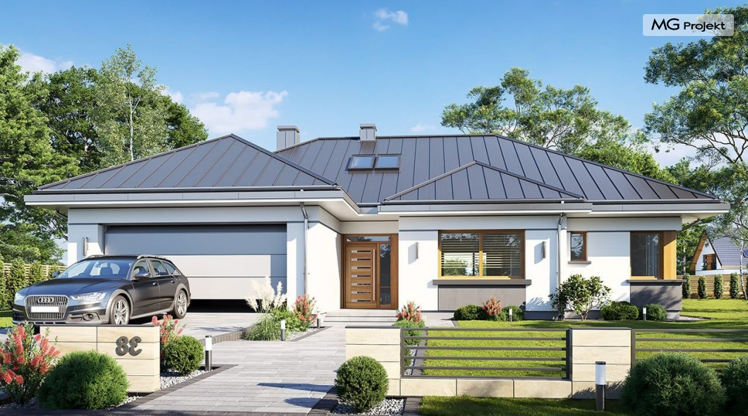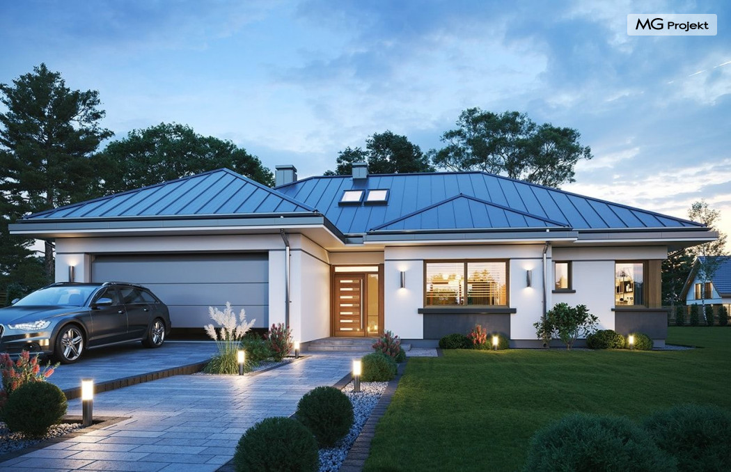 Projekt domu Willa parterowa 4 jest kolejną wersją wariantową domu z cieszącej się dużą popularnością serii projektów „ Willa parterowa”. Dom ma trochę większą powierzchnię użytkową, przy jednocześnie zwężonej bryle, dzięki czemu zmieści się na węższej działce. Bryła budynku jest parterowa z rzutem w kształcie litery „T”, przykryta wielospadowym dachem. W budynku może zamieszkać 5cioosobowa rodzina. Architektura domu jest nowoczesna. Wykorzystano tutaj modne materiały wykończeniowe i kolorystykę. Dach przykryty jest grafitową blachą na rąbek stojący, ramy dużych przeszkleń okiennych zakomponowano w jasnych odcieniach drewna, a ściany urozmaicono kontrastującymi fragmentami w kolorze betonu. Reprezentacyjny front budynku podkreślają piękne drzwi wejściowe z naświetlami, oraz szerokie okno kuchenne. Od strony ogrodowej prym wiodą szerokie przeszklenia z salonu na taras ogrodowy, oraz okładziny drewniane fragmentów ścian. Budynek ma sznyt i klasę, ma dobrze zachowane proporcje i ciekawe detale wykończeniowe. Nie jest przesadzony - niczego tu nie ma na pokaz, a jednak wygląda świetnie. Wnętrze domu podzielono na centralną cześć dzienną z salonem i kuchnią, dwie oddzielone od siebie części prywatne - jedną z apartamentem państwa domu i drugą z sypialniami dzieci, oraz część gospodarczo-garażową dostępną z przedsionka wejściowego. Do domy wchodzimy reprezentacyjnymi szerokimi drzwiami przez przedsionek do holu i salonu. W salonie przewidziano miejsce dla mebli wypoczynkowych, oraz wygodnego stołu jadalnego. Za ścianą kominkowo-telewizyjną ukryto schody na strych / poddasze, a nad połową salonu otwarto sufit aż do skosu dachu i zaprojektowano antresolę z balustradą łączącą pokój dzienny z dodatkowym pomieszczeniem u góry. Całość wnętrza dziennego domyka ładna kuchnia z wyspą i spiżarnią, z szerokim oknem otwierającym widok na front działki. Z salonu szerokimi przesuwnymi drzwiami balkonowymi wychodzimy na częściowo zadaszony taras osłonięty dyskretnie ścianami domu. Część rodziców ma sypialnię z wyjściem bezpośrednio na taras, oraz garderobę i łazienkę. W część nocnej dzieci znajdziemy trzy pokoje sypialne, łazienkę i pralnię. Całe wnętrze parteru dopełniają dwustanowiskowy garaż kotłownia. Nad parterem zaprojektowano przestrzeń strychową, którą z łatwością można zaadaptować na poddasze - wedle życzenia i inwencji właściciela. Budynek ma prostą konstrukcję, a brak żelbetowego stropu płytowego nad parterem zdecydowanie uprości, przyspieszy i obniży koszt budowy. W projekcie zastosowano bardzo dobre izolacje termiczne i nowoczesne instalacje, dzięki czemu dom będzie niedrogi w późniejszej eksploatacji. Willa Parterowa 4 jest doskonałą propozycją dla Inwestorów planujących budowę nowoczesnego, komfortowego parterowego domu, marzących o mieszkaniu na jednej kondygnacji, blisko otaczającego dom ogrodu. Zapraszamy do zapoznania się z pełną ofertą pracowni MG Projekt: https://www.mgprojekt.com.pl/willa-parterowa, https://www.mgprojekt.com.pl/willa-parterowa-2, https://www.mgprojekt.com.pl/willa-parterowa-2-wariant-b, https://www.mgprojekt.com.pl/willa-parterowa-2-wariant-c, https://www.mgprojekt.com.pl/willa-parterowa-2-wariant-d, https://www.mgprojekt.com.pl/willa-parterowa-3, https://www.mgprojekt.com.pl/willa-parterowa-3-wariant-b, https://www.mgprojekt.com.pl/willa-parterowa-4, https://www.mgprojekt.com.pl/willa-parterowa-4-wariant-b, https://www.mgprojekt.com.pl/willa-parterowa-wariant-b, https://www.mgprojekt.com.pl/willa-parterowa-wariant-c, https://www.mgprojekt.com.pl/willa-parterowa-wariant-d, https://www.mgprojekt.com.pl/willa-parterowa-wariant-e.