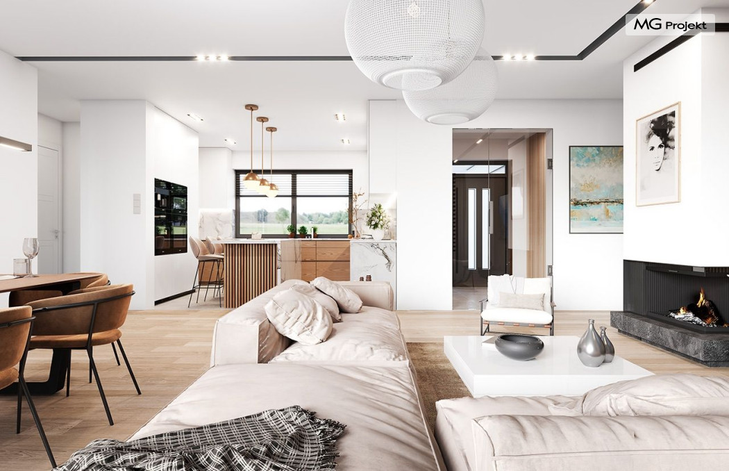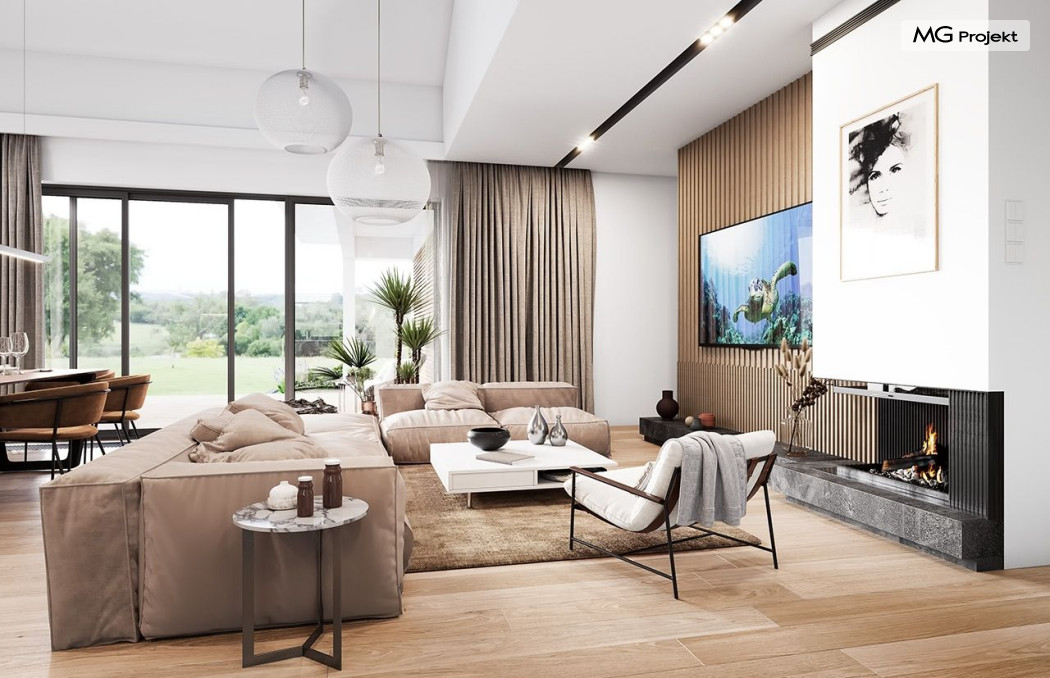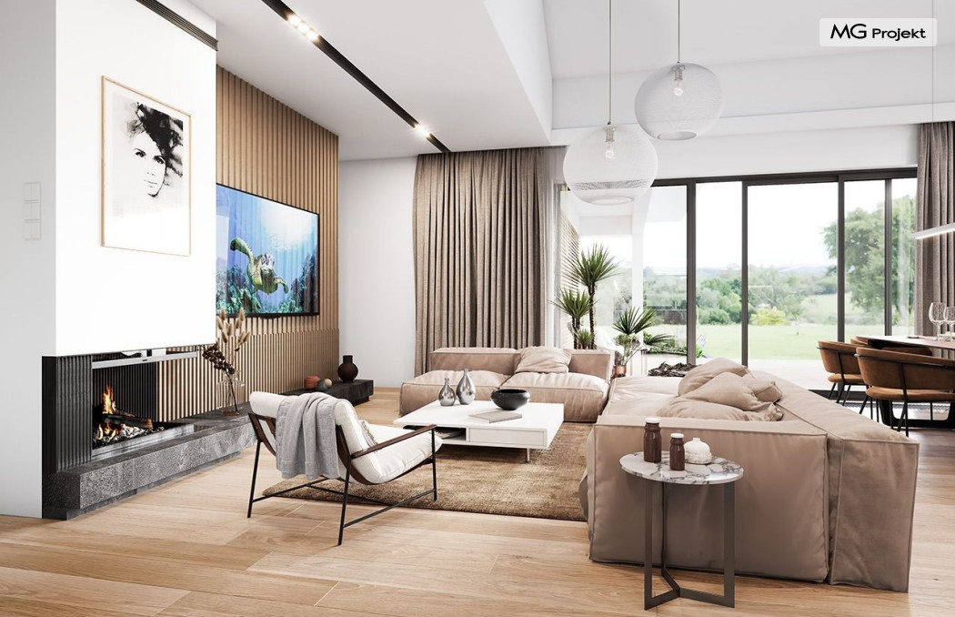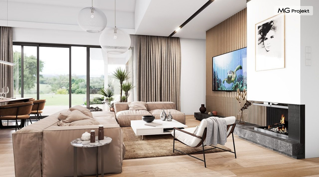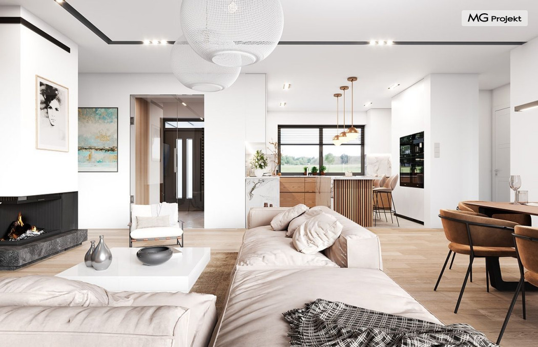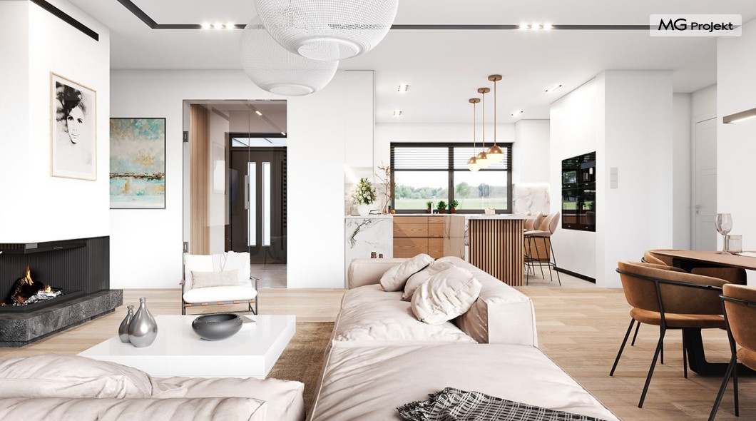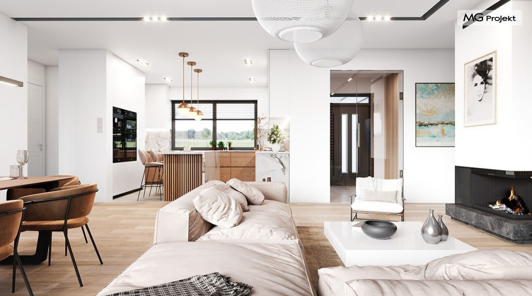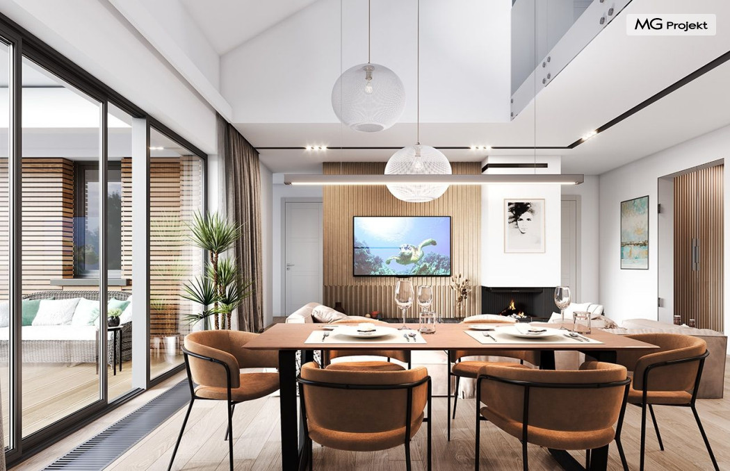 Projekt domu Willa parterowa 4 jest kolejną wersją wariantową domu z cieszącej się dużą popularnością serii projektów „ Willa parterowa”. Dom ma trochę większą powierzchnię użytkową, przy jednocześnie zwężonej bryle, dzięki czemu zmieści się na węższej działce. Bryła budynku jest parterowa z rzutem w kształcie litery „T”, przykryta wielospadowym dachem. W budynku może zamieszkać 5cioosobowa rodzina. Architektura domu jest nowoczesna. Wykorzystano tutaj modne materiały wykończeniowe i kolorystykę. Dach przykryty jest grafitową blachą na rąbek stojący, ramy dużych przeszkleń okiennych zakomponowano w jasnych odcieniach drewna, a ściany urozmaicono kontrastującymi fragmentami w kolorze betonu. Reprezentacyjny front budynku podkreślają piękne drzwi wejściowe z naświetlami, oraz szerokie okno kuchenne. Od strony ogrodowej prym wiodą szerokie przeszklenia z salonu na taras ogrodowy, oraz okładziny drewniane fragmentów ścian. Budynek ma sznyt i klasę, ma dobrze zachowane proporcje i ciekawe detale wykończeniowe. Nie jest przesadzony - niczego tu nie ma na pokaz, a jednak wygląda świetnie. Wnętrze domu podzielono na centralną cześć dzienną z salonem i kuchnią, dwie oddzielone od siebie części prywatne - jedną z apartamentem państwa domu i drugą z sypialniami dzieci, oraz część gospodarczo-garażową dostępną z przedsionka wejściowego. Do domy wchodzimy reprezentacyjnymi szerokimi drzwiami przez przedsionek do holu i salonu. W salonie przewidziano miejsce dla mebli wypoczynkowych, oraz wygodnego stołu jadalnego. Za ścianą kominkowo-telewizyjną ukryto schody na strych / poddasze, a nad połową salonu otwarto sufit aż do skosu dachu i zaprojektowano antresolę z balustradą łączącą pokój dzienny z dodatkowym pomieszczeniem u góry. Całość wnętrza dziennego domyka ładna kuchnia z wyspą i spiżarnią, z szerokim oknem otwierającym widok na front działki. Z salonu szerokimi przesuwnymi drzwiami balkonowymi wychodzimy na częściowo zadaszony taras osłonięty dyskretnie ścianami domu. Część rodziców ma sypialnię z wyjściem bezpośrednio na taras, oraz garderobę i łazienkę. W część nocnej dzieci znajdziemy trzy pokoje sypialne, łazienkę i pralnię. Całe wnętrze parteru dopełniają dwustanowiskowy garaż kotłownia. Nad parterem zaprojektowano przestrzeń strychową, którą z łatwością można zaadaptować na poddasze - wedle życzenia i inwencji właściciela. Budynek ma prostą konstrukcję, a brak żelbetowego stropu płytowego nad parterem zdecydowanie uprości, przyspieszy i obniży koszt budowy. W projekcie zastosowano bardzo dobre izolacje termiczne i nowoczesne instalacje, dzięki czemu dom będzie niedrogi w późniejszej eksploatacji. Willa Parterowa 4 jest doskonałą propozycją dla Inwestorów planujących budowę nowoczesnego, komfortowego parterowego domu, marzących o mieszkaniu na jednej kondygnacji, blisko otaczającego dom ogrodu. Zapraszamy do zapoznania się z pełną ofertą pracowni MG Projekt: https://www.mgprojekt.com.pl/willa-parterowa, https://www.mgprojekt.com.pl/willa-parterowa-2, https://www.mgprojekt.com.pl/willa-parterowa-2-wariant-b, https://www.mgprojekt.com.pl/willa-parterowa-2-wariant-c, https://www.mgprojekt.com.pl/willa-parterowa-2-wariant-d, https://www.mgprojekt.com.pl/willa-parterowa-3, https://www.mgprojekt.com.pl/willa-parterowa-3-wariant-b, https://www.mgprojekt.com.pl/willa-parterowa-4, https://www.mgprojekt.com.pl/willa-parterowa-4-wariant-b, https://www.mgprojekt.com.pl/willa-parterowa-wariant-b, https://www.mgprojekt.com.pl/willa-parterowa-wariant-c, https://www.mgprojekt.com.pl/willa-parterowa-wariant-d, https://www.mgprojekt.com.pl/willa-parterowa-wariant-e.