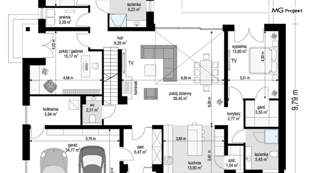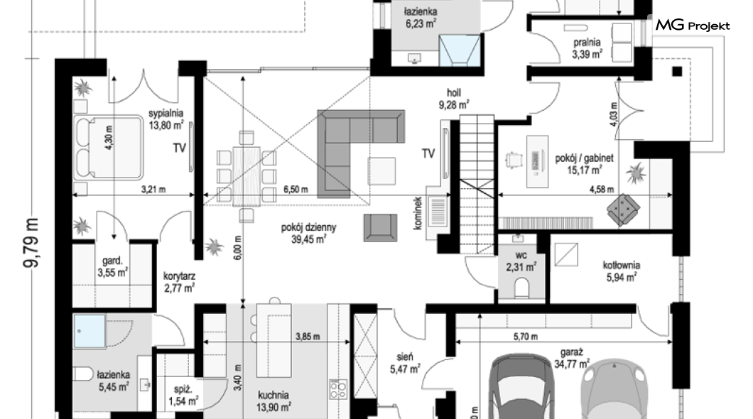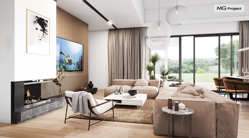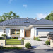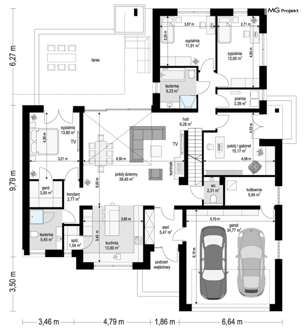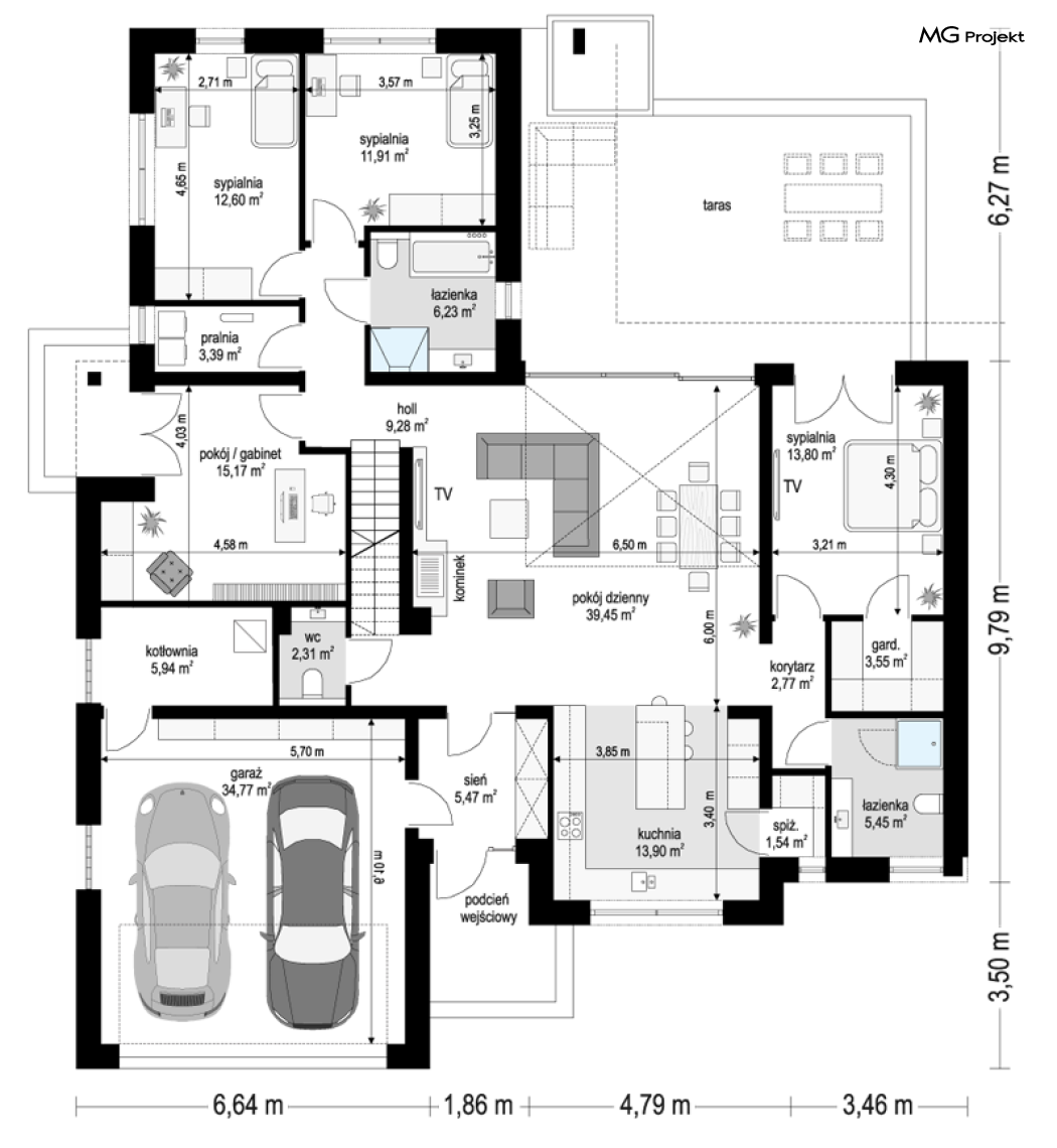 Projekt domu Willa parterowa 4 jest kolejną wersją wariantową domu z cieszącej się dużą popularnością serii projektów „ Willa parterowa”. Dom ma trochę większą powierzchnię użytkową, przy jednocześnie zwężonej bryle, dzięki czemu zmieści się na węższej działce. Bryła budynku jest parterowa z rzutem w kształcie litery „T”, przykryta wielospadowym dachem. W budynku może zamieszkać 5cioosobowa rodzina. Architektura domu jest nowoczesna. Wykorzystano tutaj modne materiały wykończeniowe i kolorystykę. Dach przykryty jest grafitową blachą na rąbek stojący, ramy dużych przeszkleń okiennych zakomponowano w jasnych odcieniach drewna, a ściany urozmaicono kontrastującymi fragmentami w kolorze betonu. Reprezentacyjny front budynku podkreślają piękne drzwi wejściowe z naświetlami, oraz szerokie okno kuchenne. Od strony ogrodowej prym wiodą szerokie przeszklenia z salonu na taras ogrodowy, oraz okładziny drewniane fragmentów ścian. Budynek ma sznyt i klasę, ma dobrze zachowane proporcje i ciekawe detale wykończeniowe. Nie jest przesadzony - niczego tu nie ma na pokaz, a jednak wygląda świetnie. Wnętrze domu podzielono na centralną cześć dzienną z salonem i kuchnią, dwie oddzielone od siebie części prywatne - jedną z apartamentem państwa domu i drugą z sypialniami dzieci, oraz część gospodarczo-garażową dostępną z przedsionka wejściowego. Do domy wchodzimy reprezentacyjnymi szerokimi drzwiami przez przedsionek do holu i salonu. W salonie przewidziano miejsce dla mebli wypoczynkowych, oraz wygodnego stołu jadalnego. Za ścianą kominkowo-telewizyjną ukryto schody na strych / poddasze, a nad połową salonu otwarto sufit aż do skosu dachu i zaprojektowano antresolę z balustradą łączącą pokój dzienny z dodatkowym pomieszczeniem u góry. Całość wnętrza dziennego domyka ładna kuchnia z wyspą i spiżarnią, z szerokim oknem otwierającym widok na front działki. Z salonu szerokimi przesuwnymi drzwiami balkonowymi wychodzimy na częściowo zadaszony taras osłonięty dyskretnie ścianami domu. Część rodziców ma sypialnię z wyjściem bezpośrednio na taras, oraz garderobę i łazienkę. W część nocnej dzieci znajdziemy trzy pokoje sypialne, łazienkę i pralnię. Całe wnętrze parteru dopełniają dwustanowiskowy garaż kotłownia. Nad parterem zaprojektowano przestrzeń strychową, którą z łatwością można zaadaptować na poddasze - wedle życzenia i inwencji właściciela. Budynek ma prostą konstrukcję, a brak żelbetowego stropu płytowego nad parterem zdecydowanie uprości, przyspieszy i obniży koszt budowy. W projekcie zastosowano bardzo dobre izolacje termiczne i nowoczesne instalacje, dzięki czemu dom będzie niedrogi w późniejszej eksploatacji. Willa Parterowa 4 jest doskonałą propozycją dla Inwestorów planujących budowę nowoczesnego, komfortowego parterowego domu, marzących o mieszkaniu na jednej kondygnacji, blisko otaczającego dom ogrodu. Zapraszamy do zapoznania się z pełną ofertą pracowni MG Projekt: https://www.mgprojekt.com.pl/willa-parterowa, https://www.mgprojekt.com.pl/willa-parterowa-2, https://www.mgprojekt.com.pl/willa-parterowa-2-wariant-b, https://www.mgprojekt.com.pl/willa-parterowa-2-wariant-c, https://www.mgprojekt.com.pl/willa-parterowa-2-wariant-d, https://www.mgprojekt.com.pl/willa-parterowa-3, https://www.mgprojekt.com.pl/willa-parterowa-3-wariant-b, https://www.mgprojekt.com.pl/willa-parterowa-4, https://www.mgprojekt.com.pl/willa-parterowa-4-wariant-b, https://www.mgprojekt.com.pl/willa-parterowa-wariant-b, https://www.mgprojekt.com.pl/willa-parterowa-wariant-c, https://www.mgprojekt.com.pl/willa-parterowa-wariant-d, https://www.mgprojekt.com.pl/willa-parterowa-wariant-e.