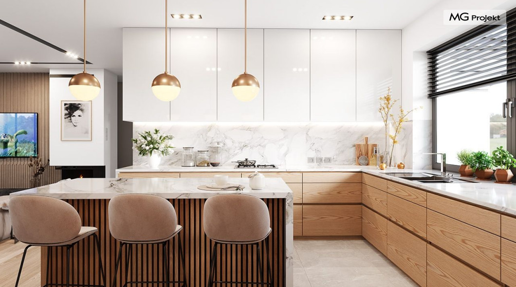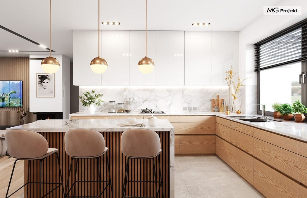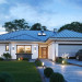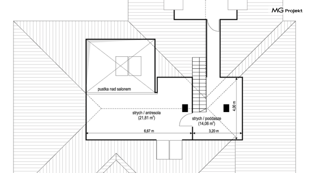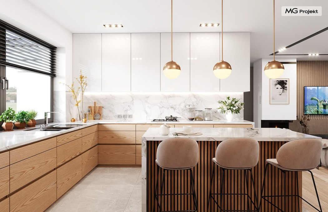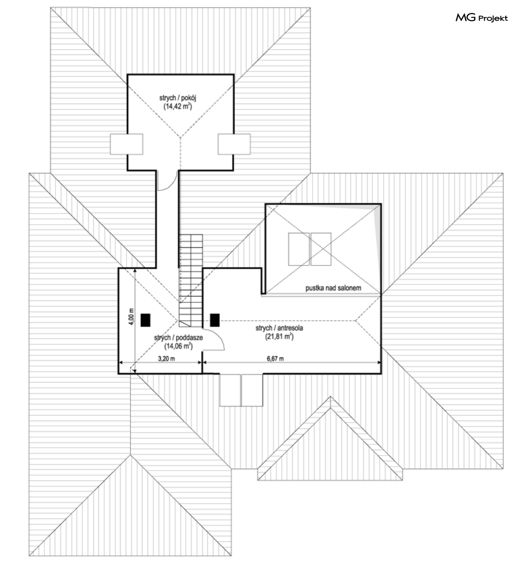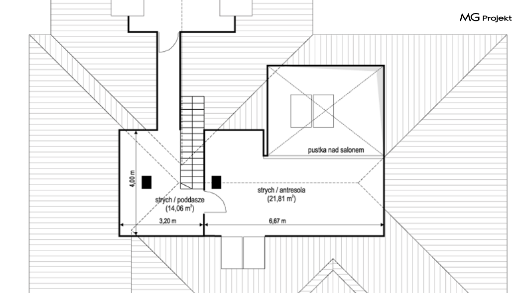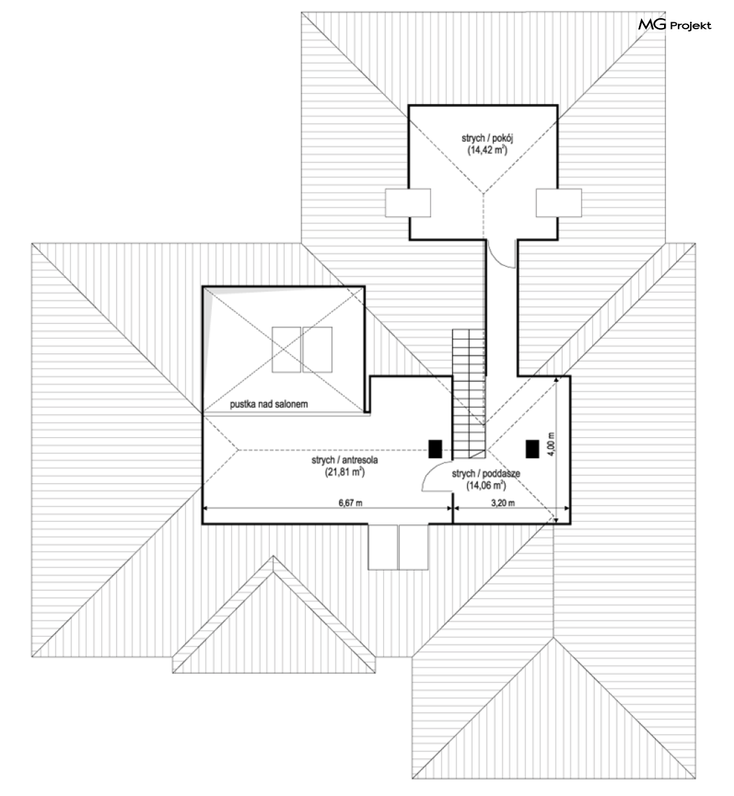Projekt domu Willa parterowa 4 jest kolejną wersją wariantową domu z cieszącej się dużą popularnością serii projektów „ Willa parterowa”. Dom ma trochę większą powierzchnię użytkową, przy jednocześnie zwężonej bryle, dzięki czemu zmieści się na węższej działce. Bryła budynku jest parterowa z rzutem w kształcie litery „T”, przykryta wielospadowym dachem. W budynku może zamieszkać 5cioosobowa rodzina. Architektura domu jest nowoczesna. Wykorzystano tutaj modne materiały wykończeniowe i kolorystykę. Dach przykryty jest grafitową blachą na rąbek stojący, ramy dużych przeszkleń okiennych zakomponowano w jasnych odcieniach drewna, a ściany urozmaicono kontrastującymi fragmentami w kolorze betonu. Reprezentacyjny front budynku podkreślają piękne drzwi wejściowe z naświetlami, oraz szerokie okno kuchenne. Od strony ogrodowej prym wiodą szerokie przeszklenia z salonu na taras ogrodowy, oraz okładziny drewniane fragmentów ścian. Budynek ma sznyt i klasę, ma dobrze zachowane proporcje i ciekawe detale wykończeniowe. Nie jest przesadzony - niczego tu nie ma na pokaz, a jednak wygląda świetnie. Wnętrze domu podzielono na centralną cześć dzienną z salonem i kuchnią, dwie oddzielone od siebie części prywatne - jedną z apartamentem państwa domu i drugą z sypialniami dzieci, oraz część gospodarczo-garażową dostępną z przedsionka wejściowego. Do domy wchodzimy reprezentacyjnymi szerokimi drzwiami przez przedsionek do holu i salonu. W salonie przewidziano miejsce dla mebli wypoczynkowych, oraz wygodnego stołu jadalnego. Za ścianą kominkowo-telewizyjną ukryto schody na strych / poddasze, a nad połową salonu otwarto sufit aż do skosu dachu i zaprojektowano antresolę z balustradą łączącą pokój dzienny z dodatkowym pomieszczeniem u góry. Całość wnętrza dziennego domyka ładna kuchnia z wyspą i spiżarnią, z szerokim oknem otwierającym widok na front działki. Z salonu szerokimi przesuwnymi drzwiami balkonowymi wychodzimy na częściowo zadaszony taras osłonięty dyskretnie ścianami domu. Część rodziców ma sypialnię z wyjściem bezpośrednio na taras, oraz garderobę i łazienkę. W część nocnej dzieci znajdziemy trzy pokoje sypialne, łazienkę i pralnię. Całe wnętrze parteru dopełniają dwustanowiskowy garaż kotłownia. Nad parterem zaprojektowano przestrzeń strychową, którą z łatwością można zaadaptować na poddasze - wedle życzenia i inwencji właściciela. Budynek ma prostą konstrukcję, a brak żelbetowego stropu płytowego nad parterem zdecydowanie uprości, przyspieszy i obniży koszt budowy. W projekcie zastosowano bardzo dobre izolacje termiczne i nowoczesne instalacje, dzięki czemu dom będzie niedrogi w późniejszej eksploatacji. Willa Parterowa 4 jest doskonałą propozycją dla Inwestorów planujących budowę nowoczesnego, komfortowego parterowego domu, marzących o mieszkaniu na jednej kondygnacji, blisko otaczającego dom ogrodu. Zapraszamy do zapoznania się z pełną ofertą pracowni MG Projekt: https://www.mgprojekt.com.pl/willa-parterowa, https://www.mgprojekt.com.pl/willa-parterowa-2, https://www.mgprojekt.com.pl/willa-parterowa-2-wariant-b, https://www.mgprojekt.com.pl/willa-parterowa-2-wariant-c, https://www.mgprojekt.com.pl/willa-parterowa-2-wariant-d, https://www.mgprojekt.com.pl/willa-parterowa-3, https://www.mgprojekt.com.pl/willa-parterowa-3-wariant-b, https://www.mgprojekt.com.pl/willa-parterowa-4, https://www.mgprojekt.com.pl/willa-parterowa-4-wariant-b, https://www.mgprojekt.com.pl/willa-parterowa-wariant-b, https://www.mgprojekt.com.pl/willa-parterowa-wariant-c, https://www.mgprojekt.com.pl/willa-parterowa-wariant-d, https://www.mgprojekt.com.pl/willa-parterowa-wariant-e.